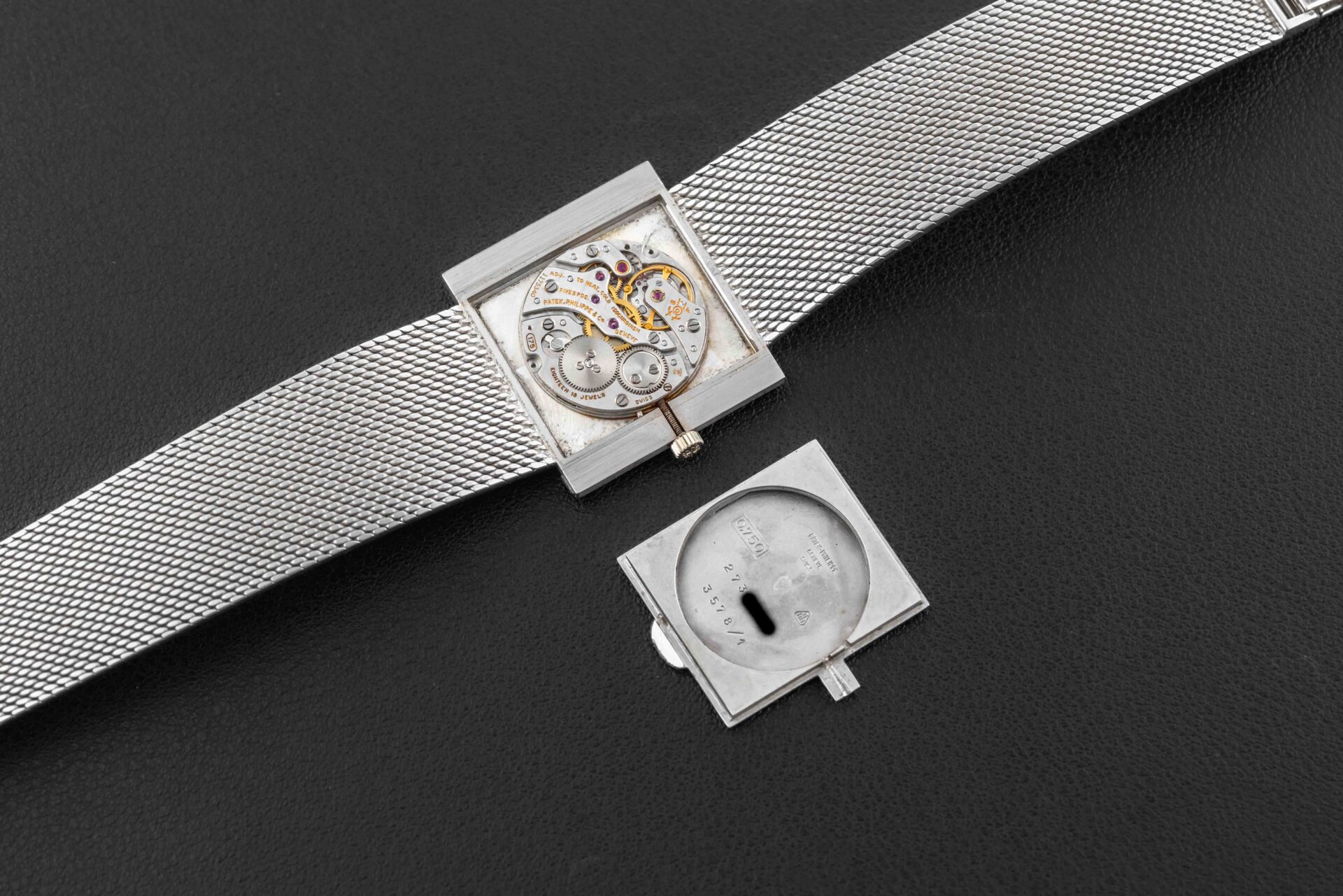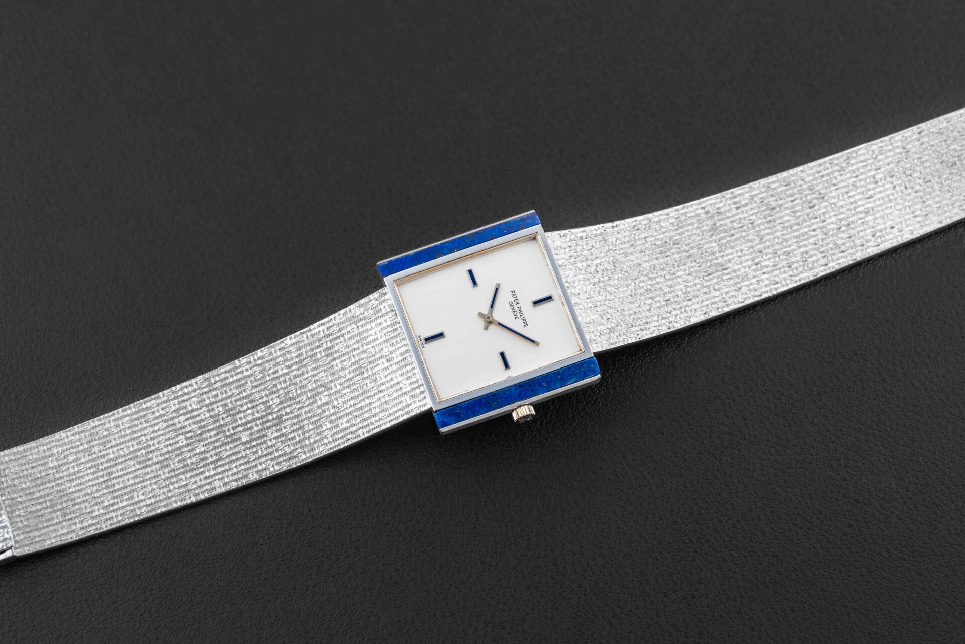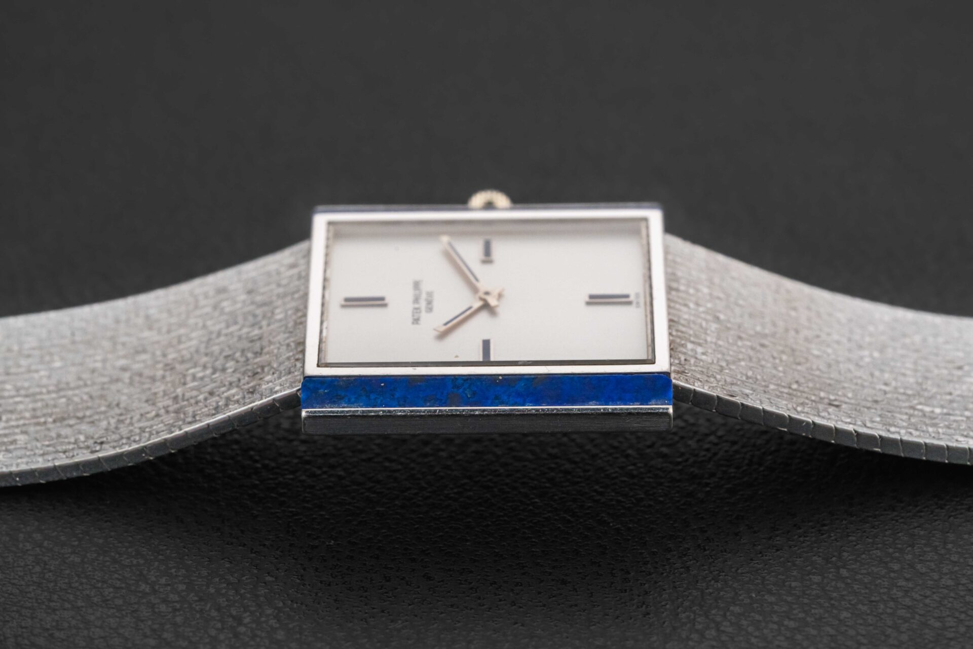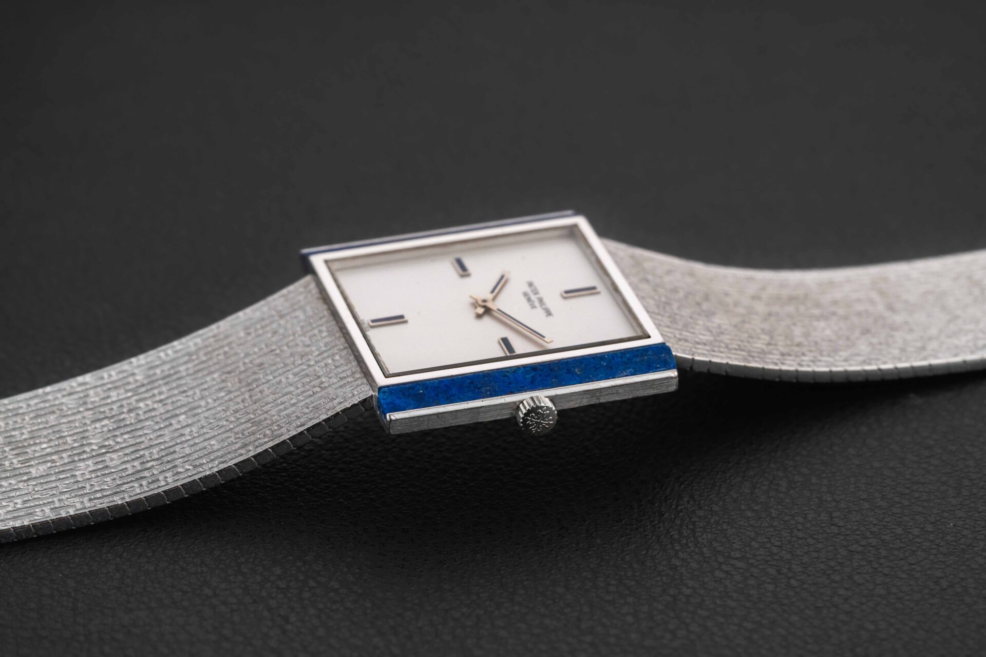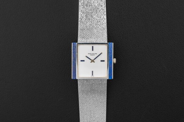Up for grabs is a funky and cool 1970s Patek Philippe in 18kt white gold, given the reference 3578/1. This integrated bracelet square wristwatch stands out for Patek’s use of Lapis Lazuli on the sides of the case and for the hour markers. The condition of this quirky Patek is excellent, virtually unused, and seemingly with an uncut bracelet. Please Note: an Extract of the Archives has been ordered, and will be provided upon receipt.