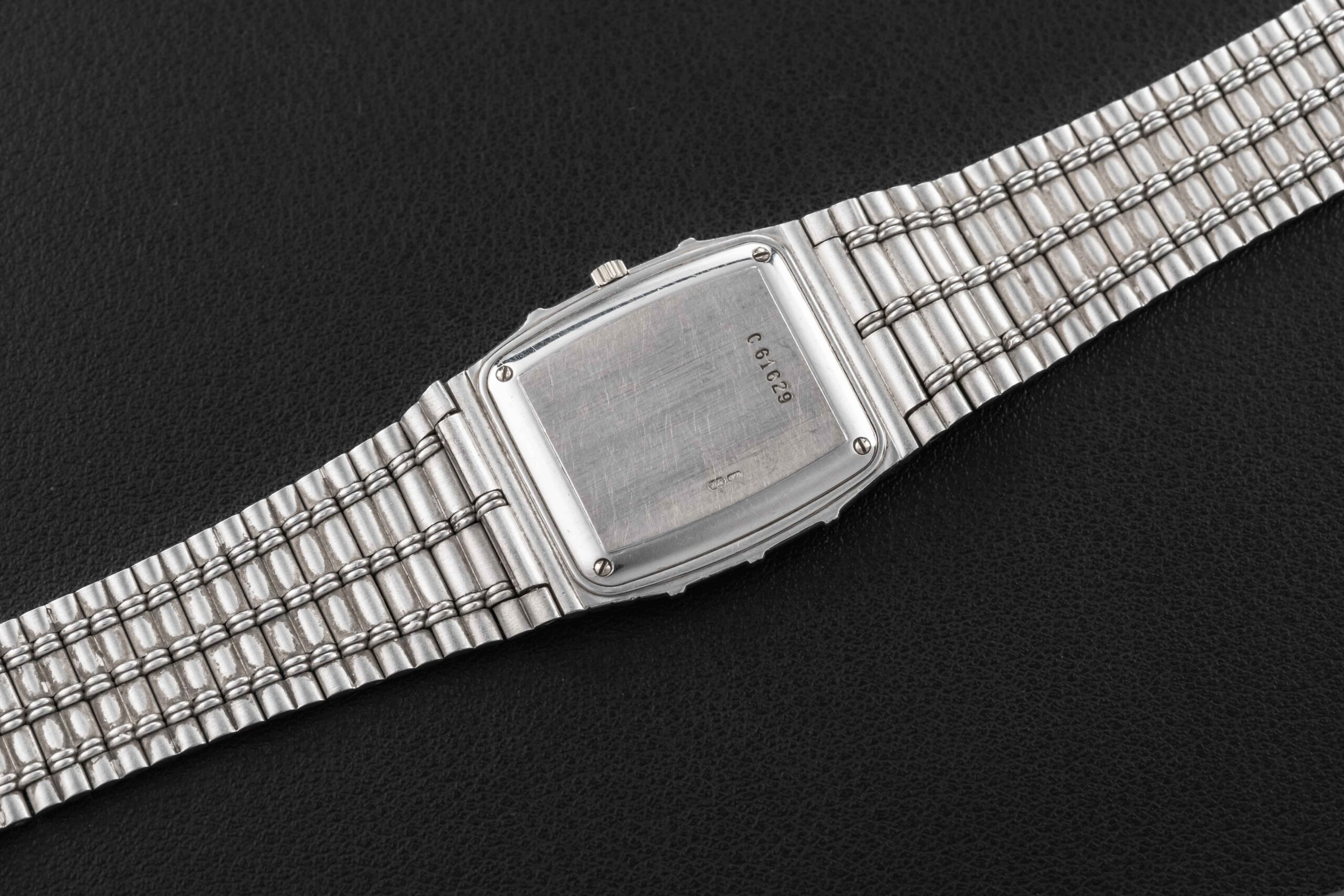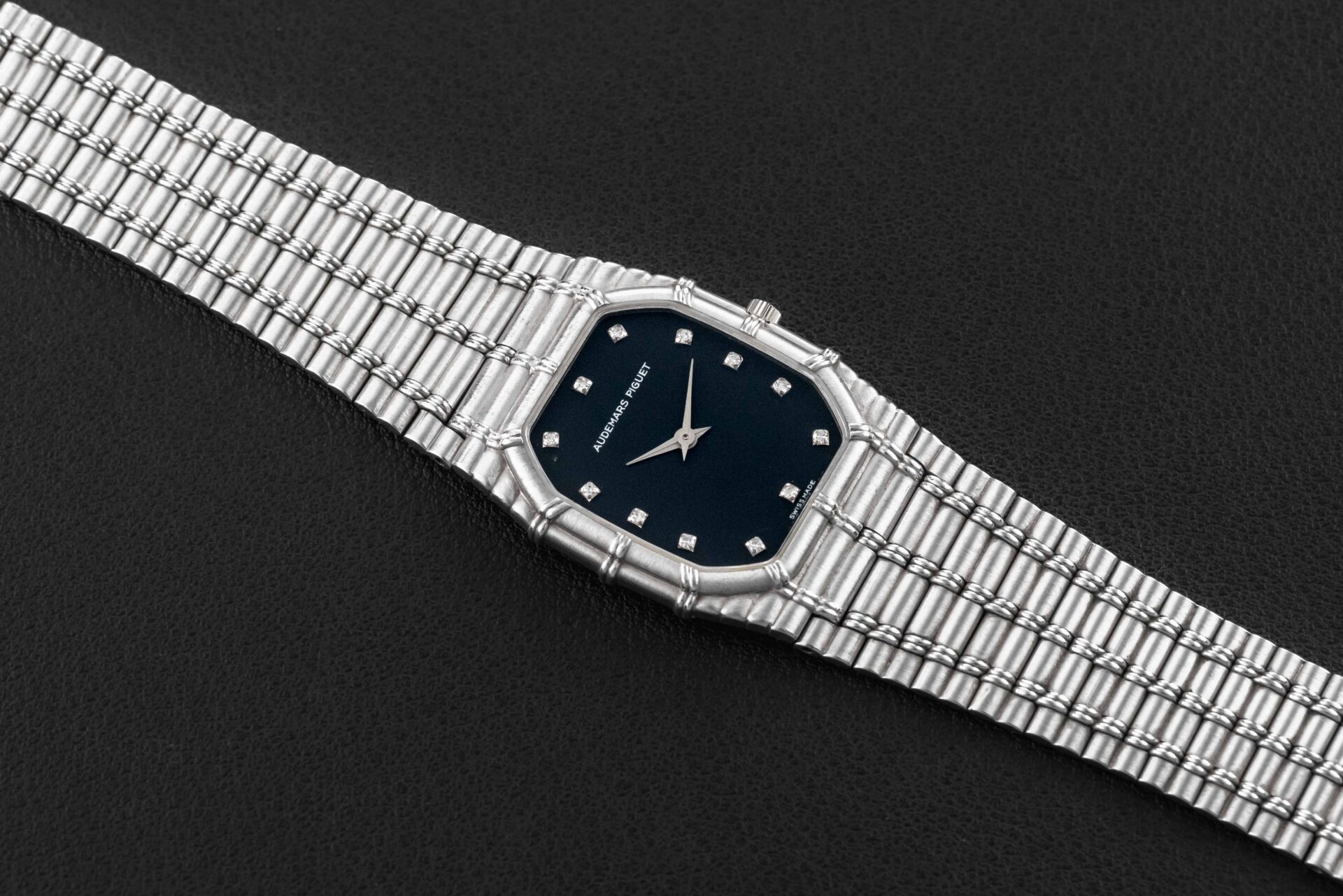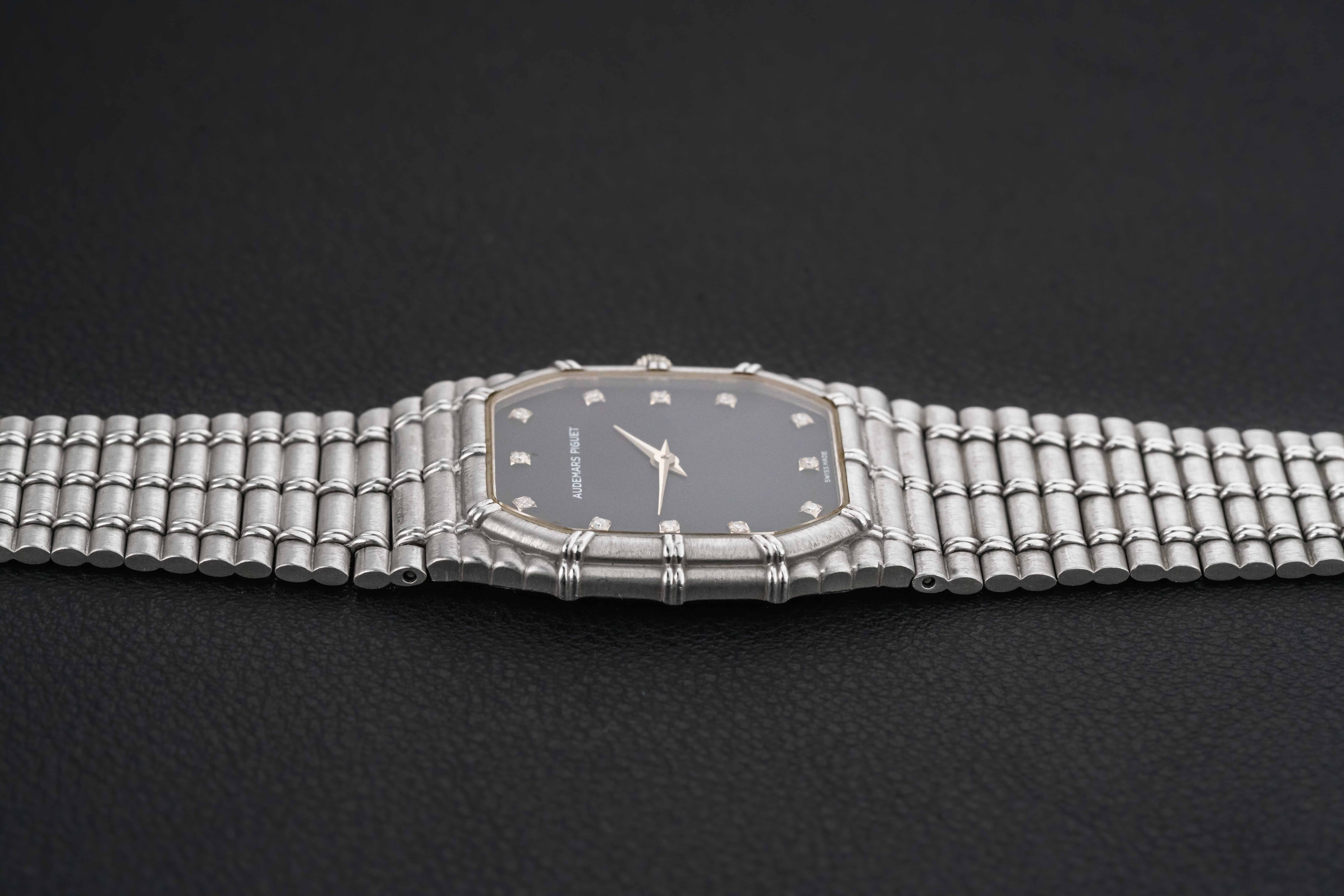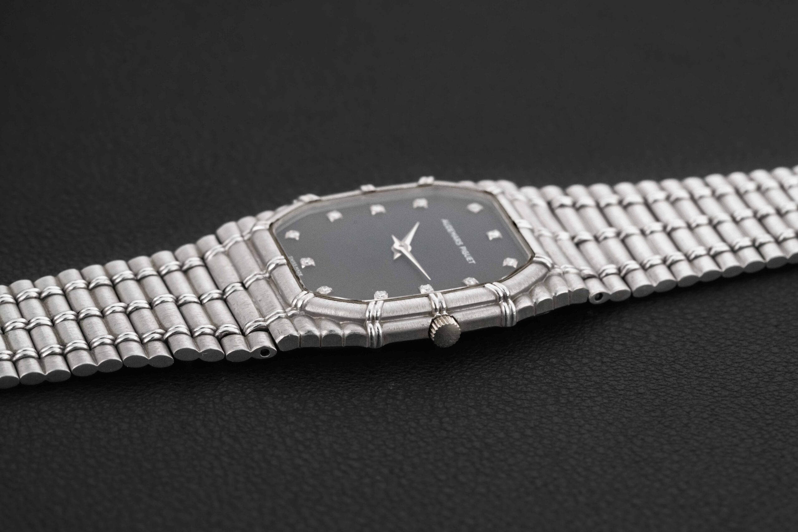 Up for grabs is one of the hottest watches on the planet right now – the 1980s Audemars Piguet Bamboo. This particular Audemars Piguet Bamboo is housed in white gold, powered by a manual-wind movement (most were produced with Quartz movements), and further fit with a black dial accented by diamond markers. The condition of this Audemars Piguet Bamboo is excellent, seemingly unpolished and with no wear to the dial; the bracelet has been sized in the past and will fit an approximate 7-7.2″ wrist.