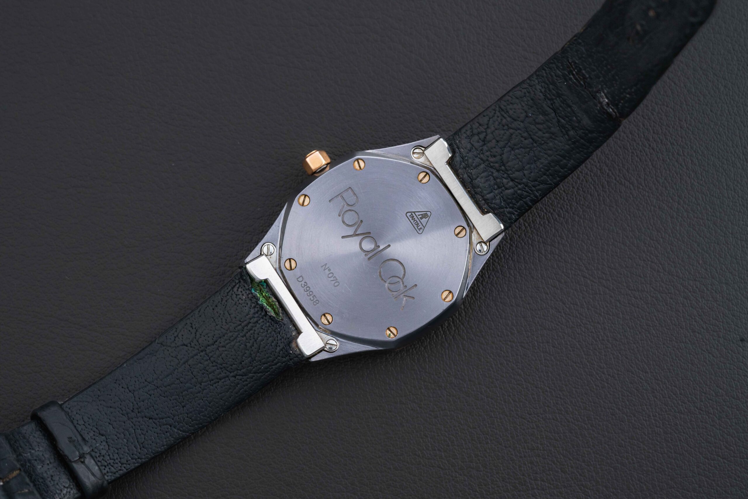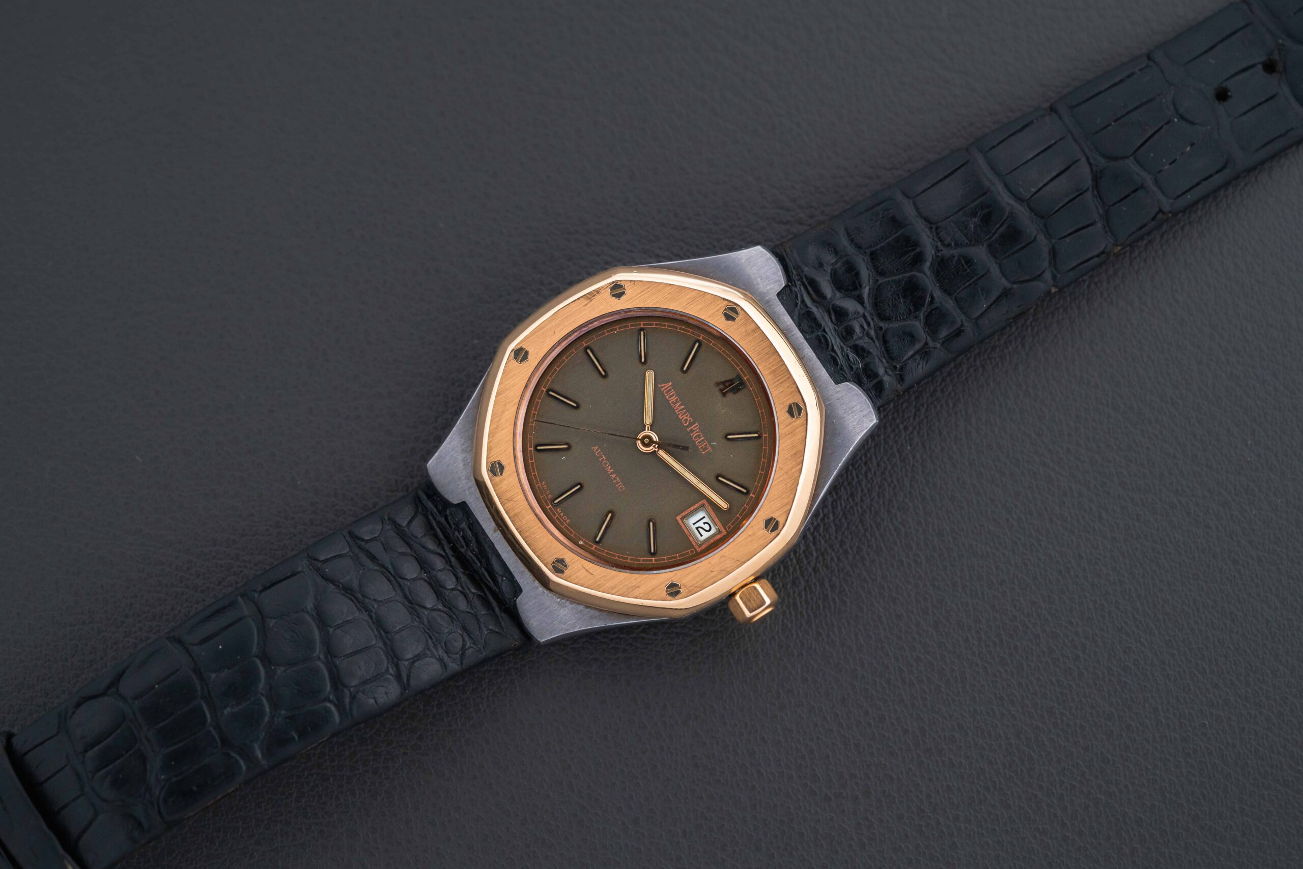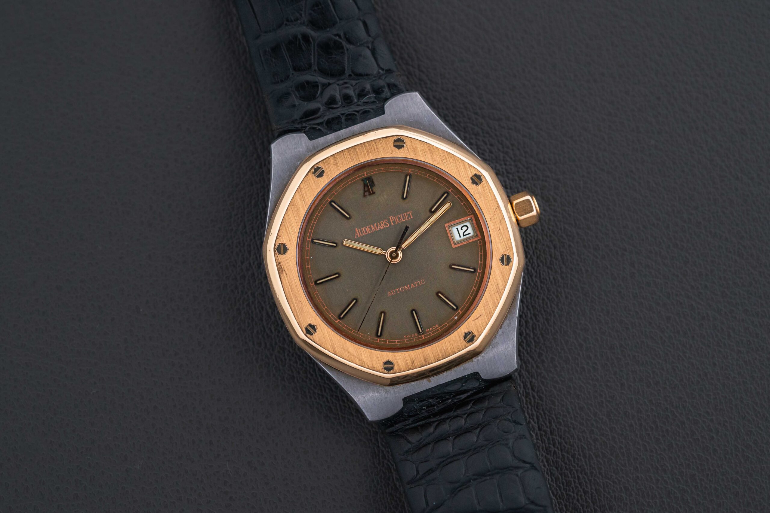 Offered here is an interesting Audemars Piguet Royal Oak, reference 14800TR, circa 1990s. Housed in a 36mm steel case, this Royal Oak features a lovely combination of tantalum (case middle) and rose gold (bezel, crown), and a grey dial aged to a lovely olive color. This Royal Oak is in good vintage condition, with no polish to the case middle, and a light polish in the past to the bezel; as mentioned, the dial has aged to a lovely olive color, showing light patina. The watch remains with its original Audemars Piguet buckle (the leather strap is presumed aftermarket).