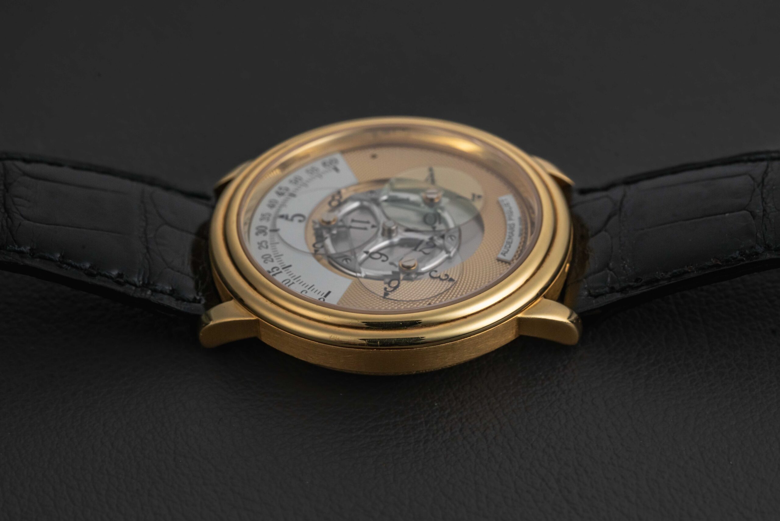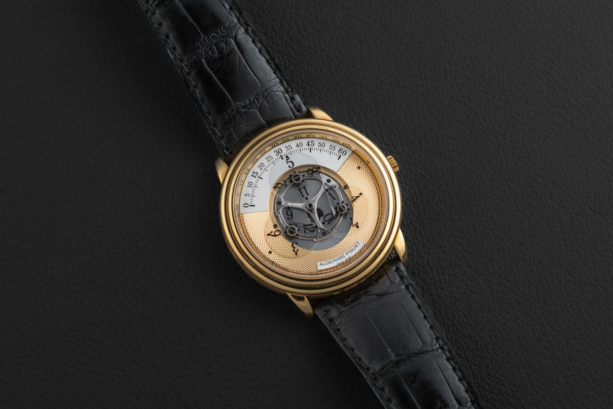 Up for grabs is a highly popular and unique design from the maker Audemars Piguet, circa 1990s. Taking a design cue from the wandering hours complication which dates back to the 17th century, the Star Wheel displays the time by using three sapphire disks that rotate along the top of the dial. This particular Star Wheel is a reference 25720BA, housed in 18kt yellow gold, and fitted with the more popular non-engraved, guilloche dial. The condition on this Audemars Piguet Star Wheel is excellent, with a sharp (seemingly unpolished) case and hallmarks, and perfect dial. Further, the watch is fit on its original black leather Audemars Piguet strap and matching yellow gold AP buckle.