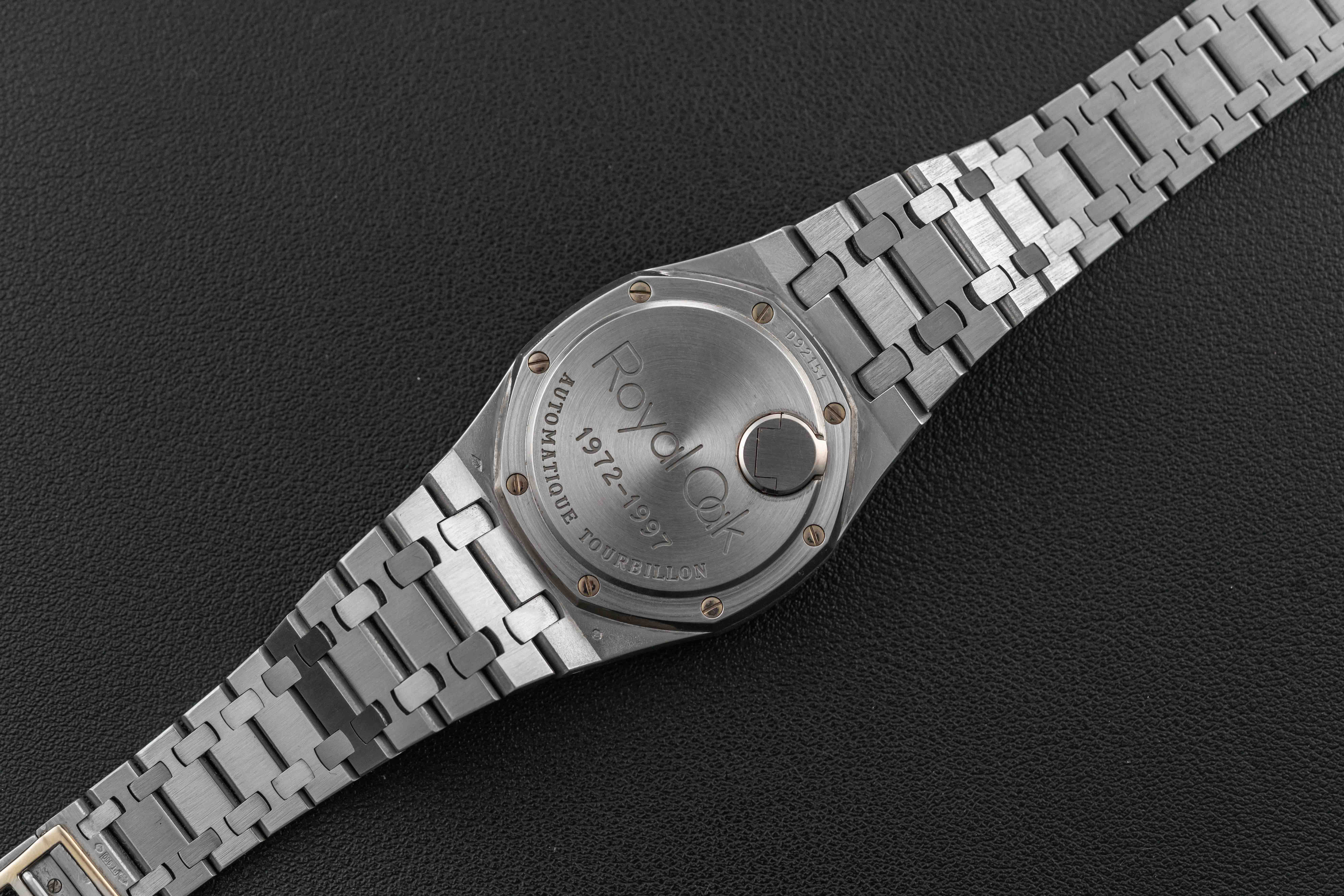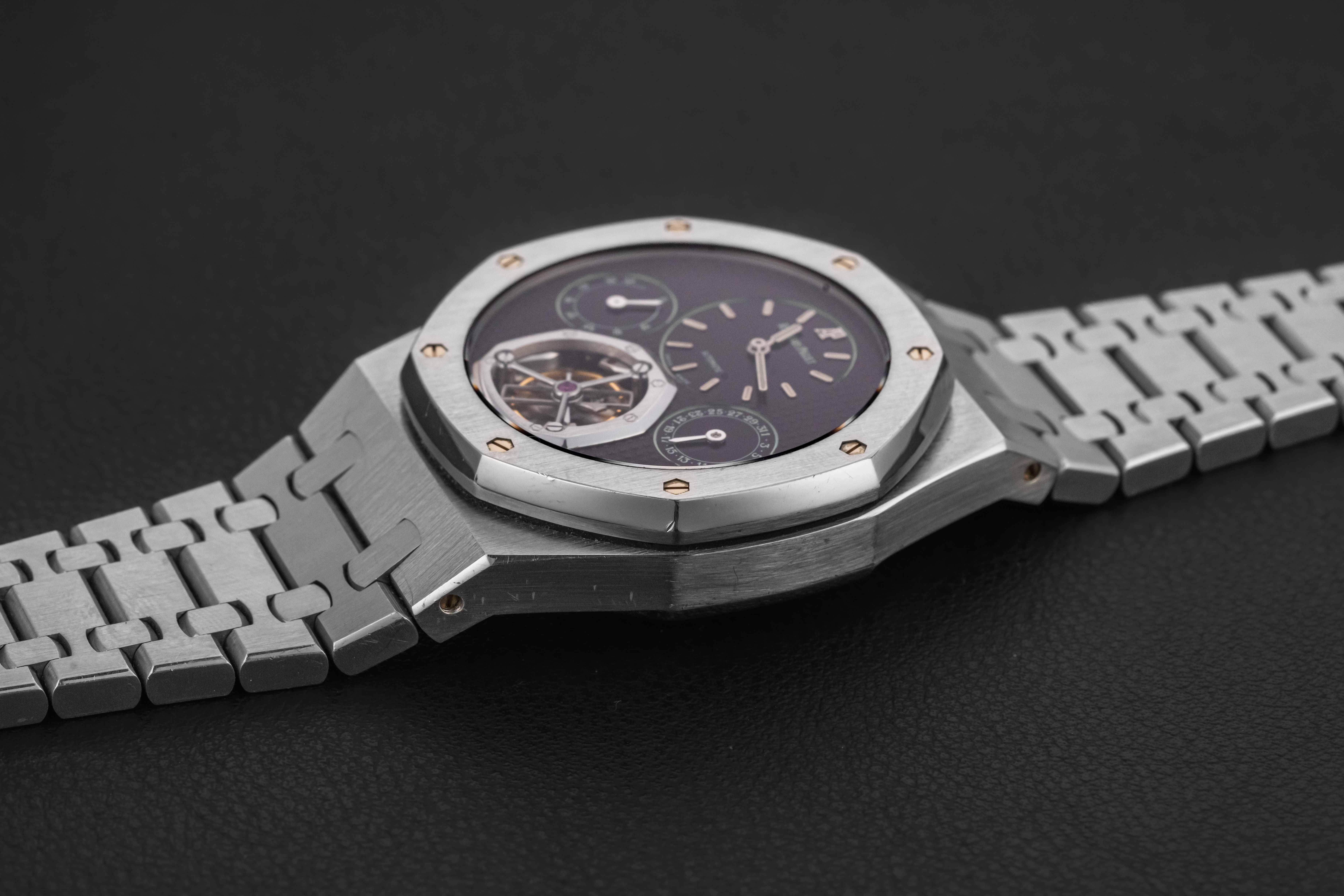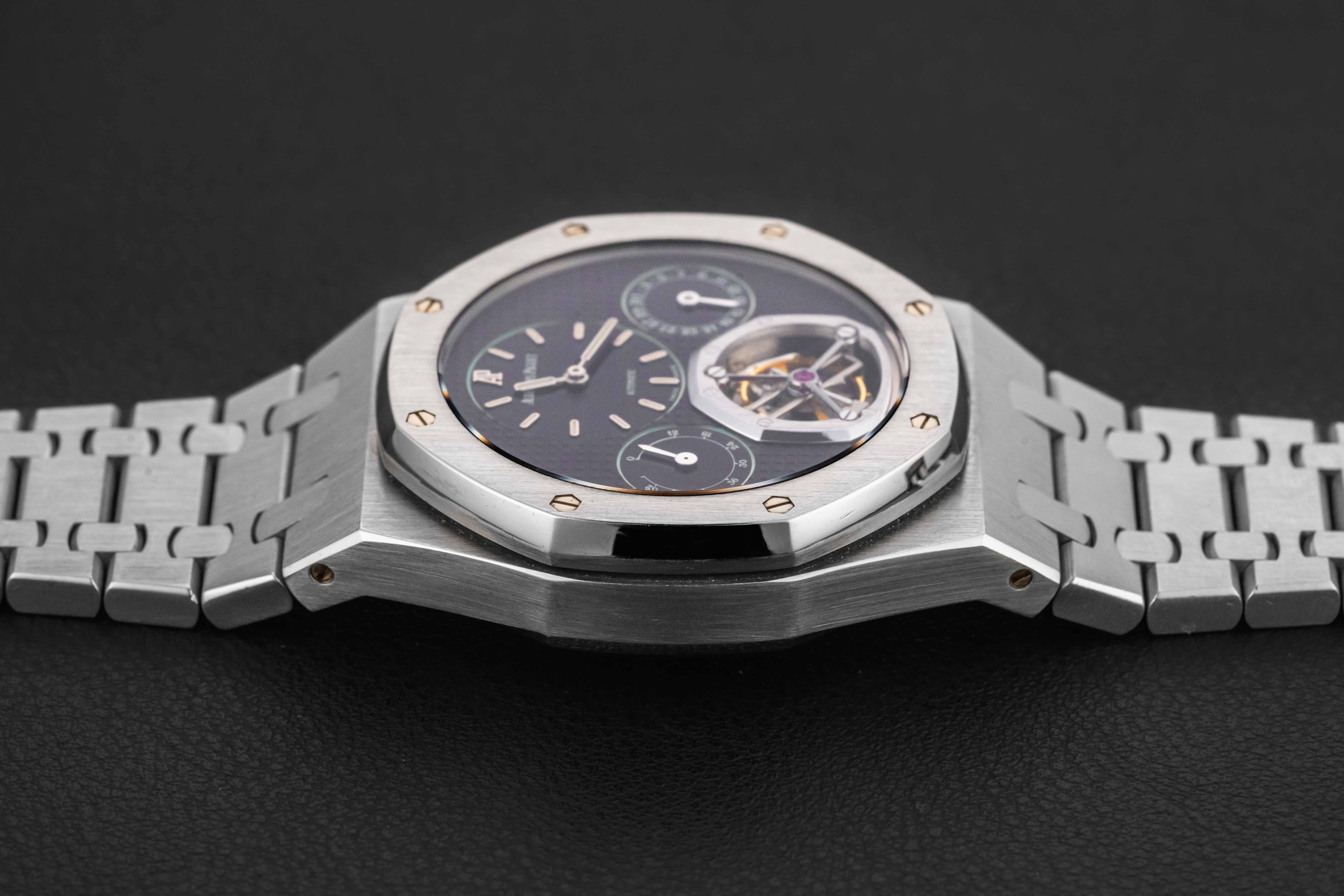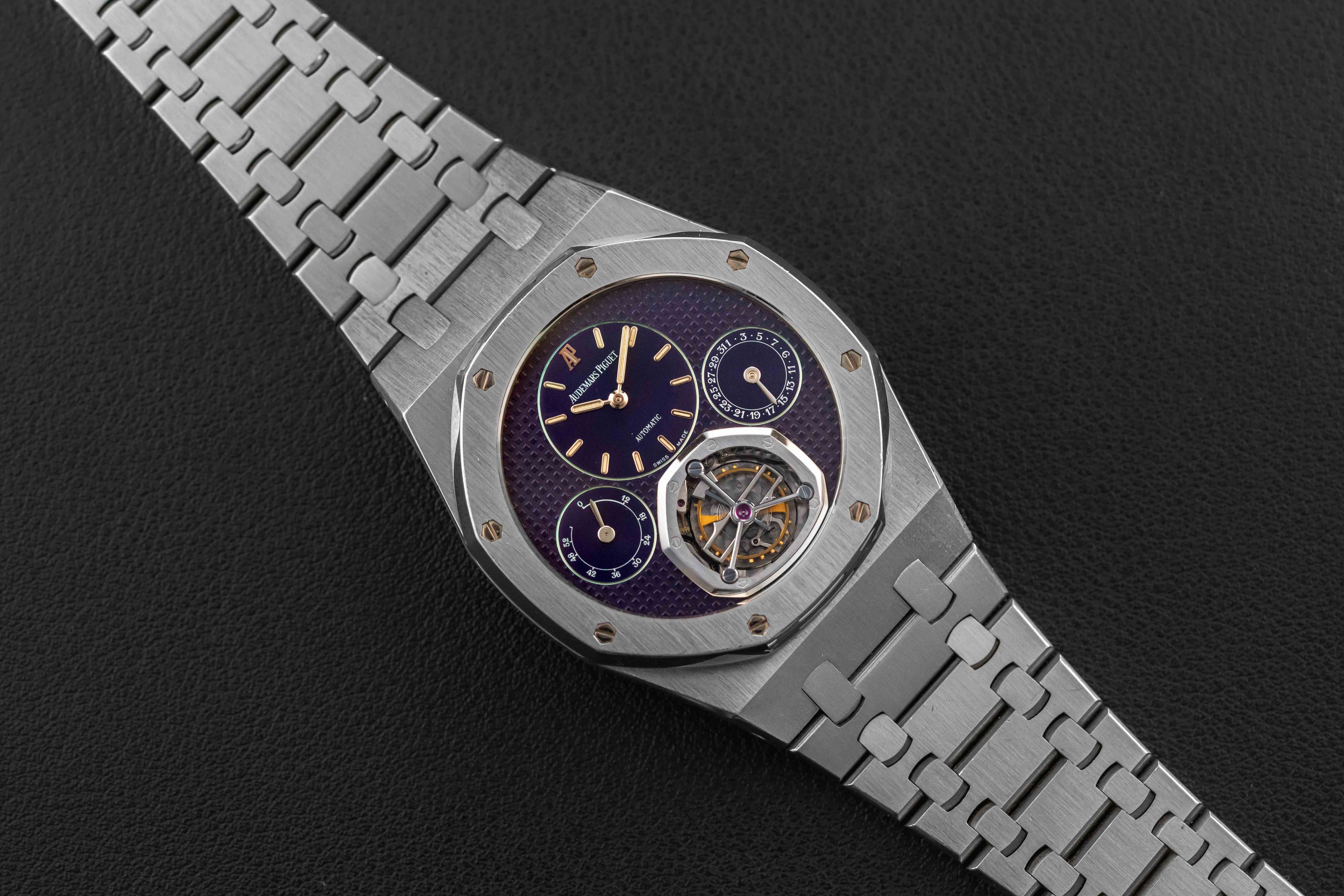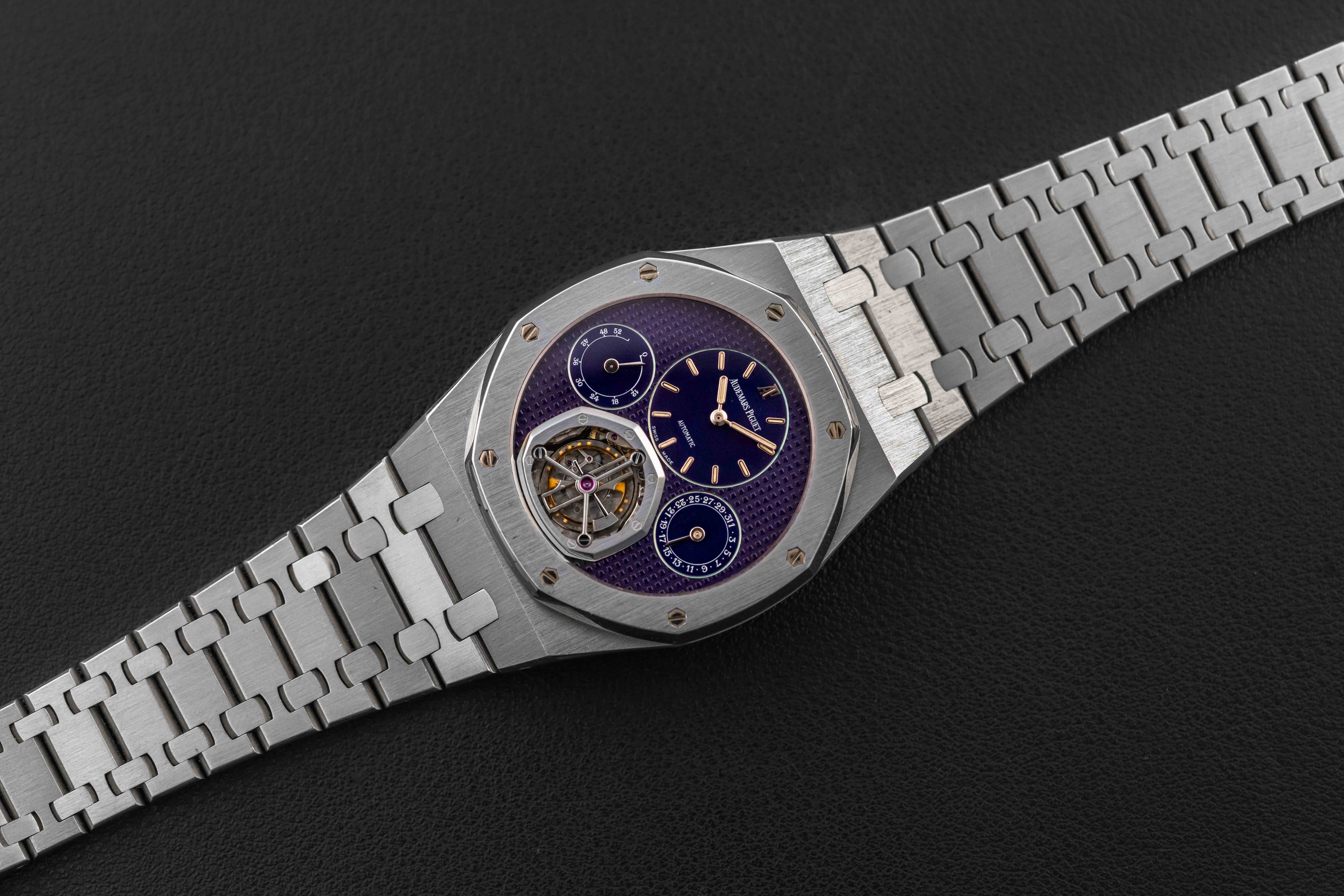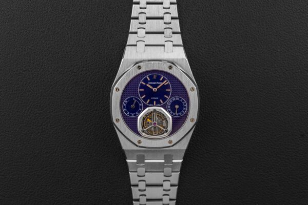 Offered here is an exceedingly rare Audemars Piguet Royal Oak, reference 25831PT, produced circa 1997, to commemorate the 25th anniversary of the Royal Oak. According to Audemars Piguet, only 5 of these were made in platinum, making this one of the lowest production Royal Oaks made. This model was housed in a 40mm platinum case, and fit with a Caliber 2875 movement, featuring tourbillon, power reserve, and day of the month complications. Further, the watch is fit with a guilloche blue dial, which has aged to a striking purple color. This watch is accompanied by a digital Extract of the Archives.