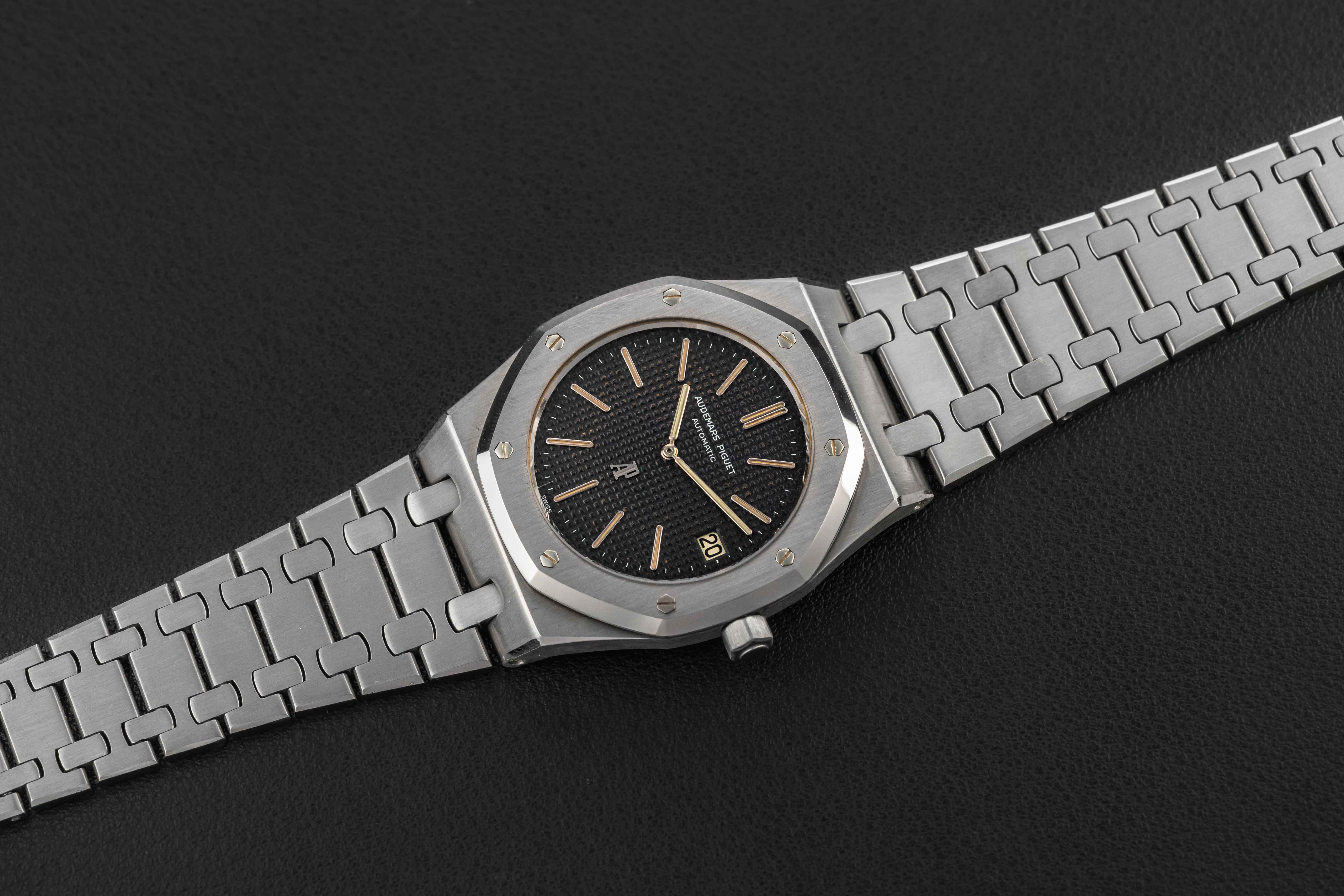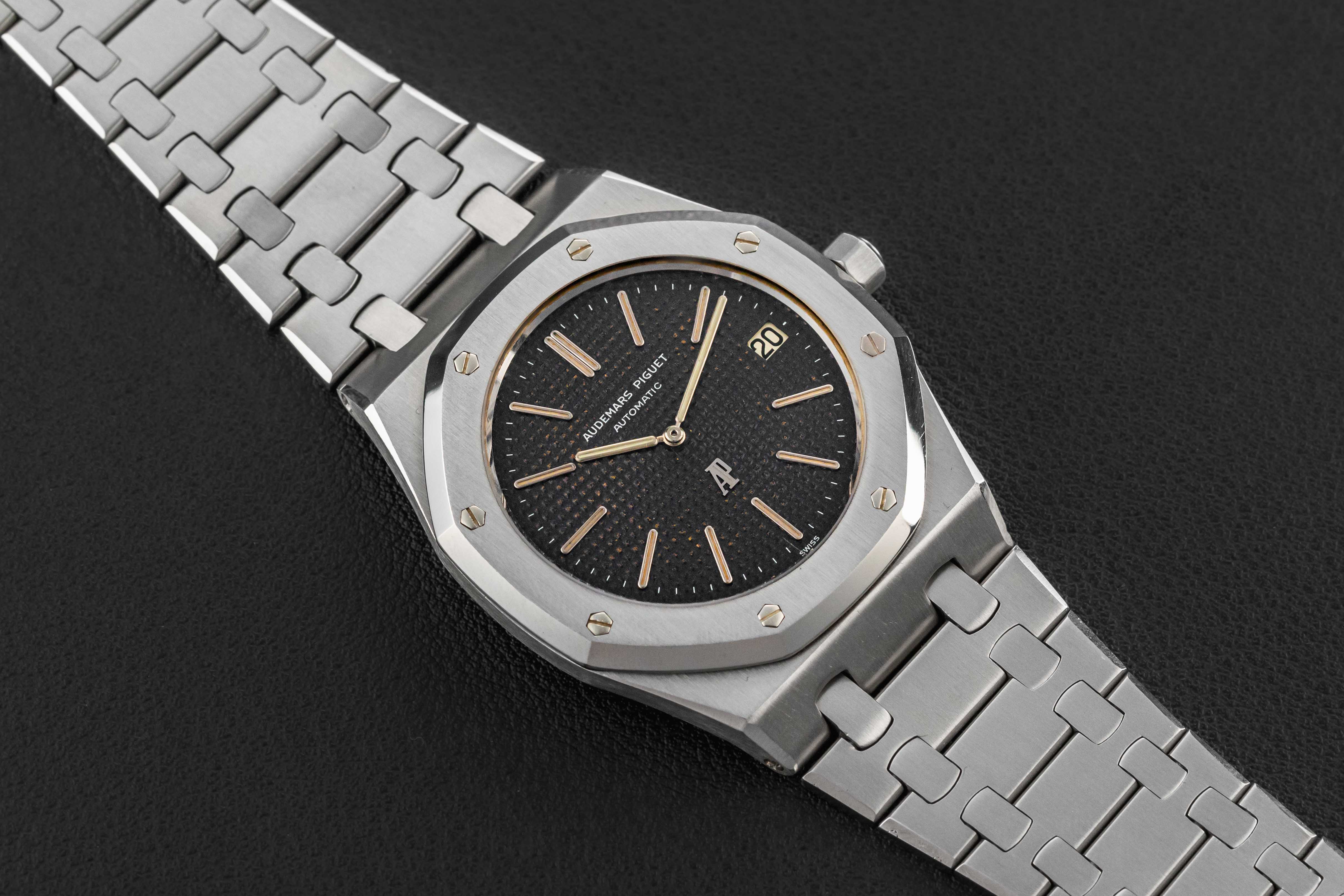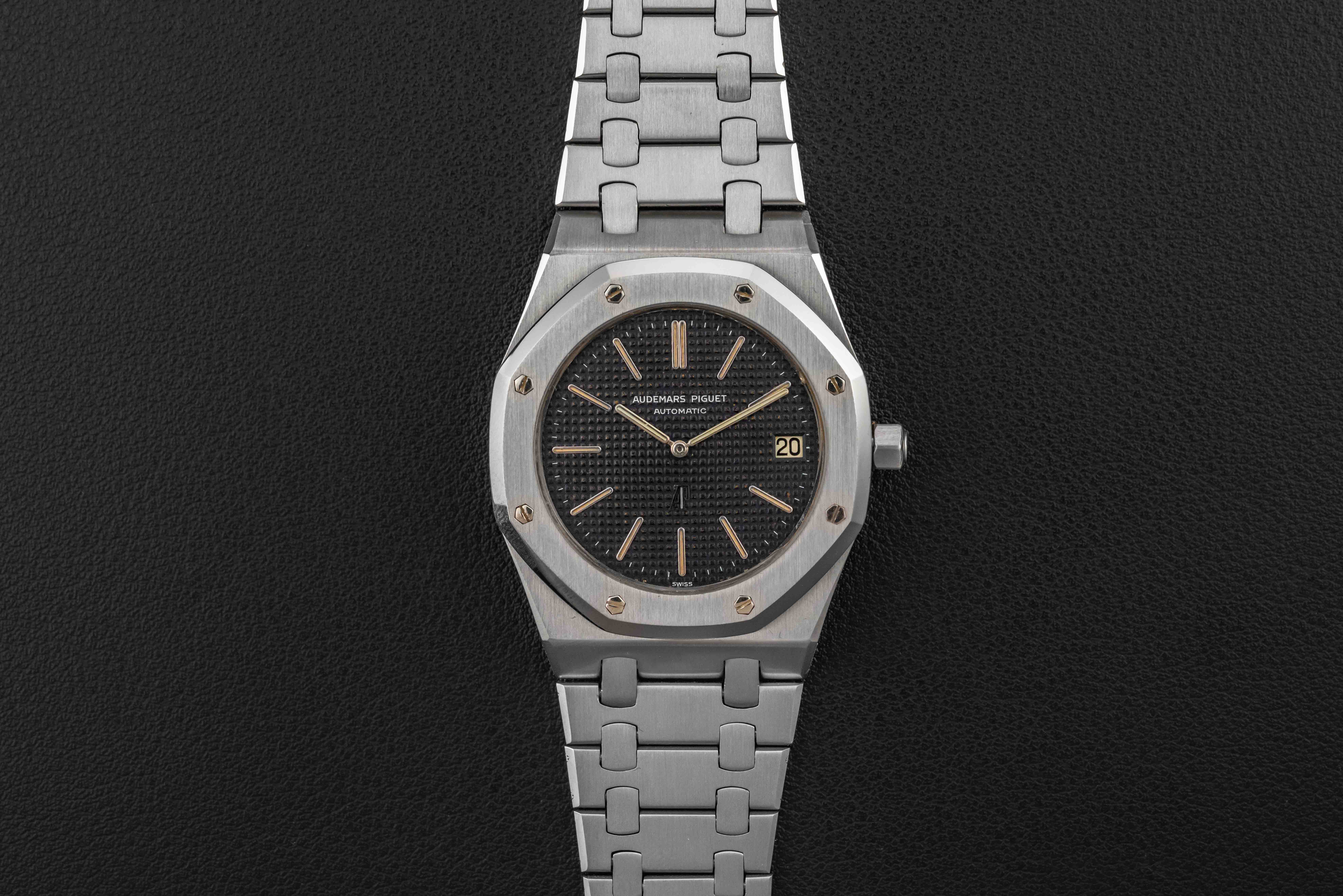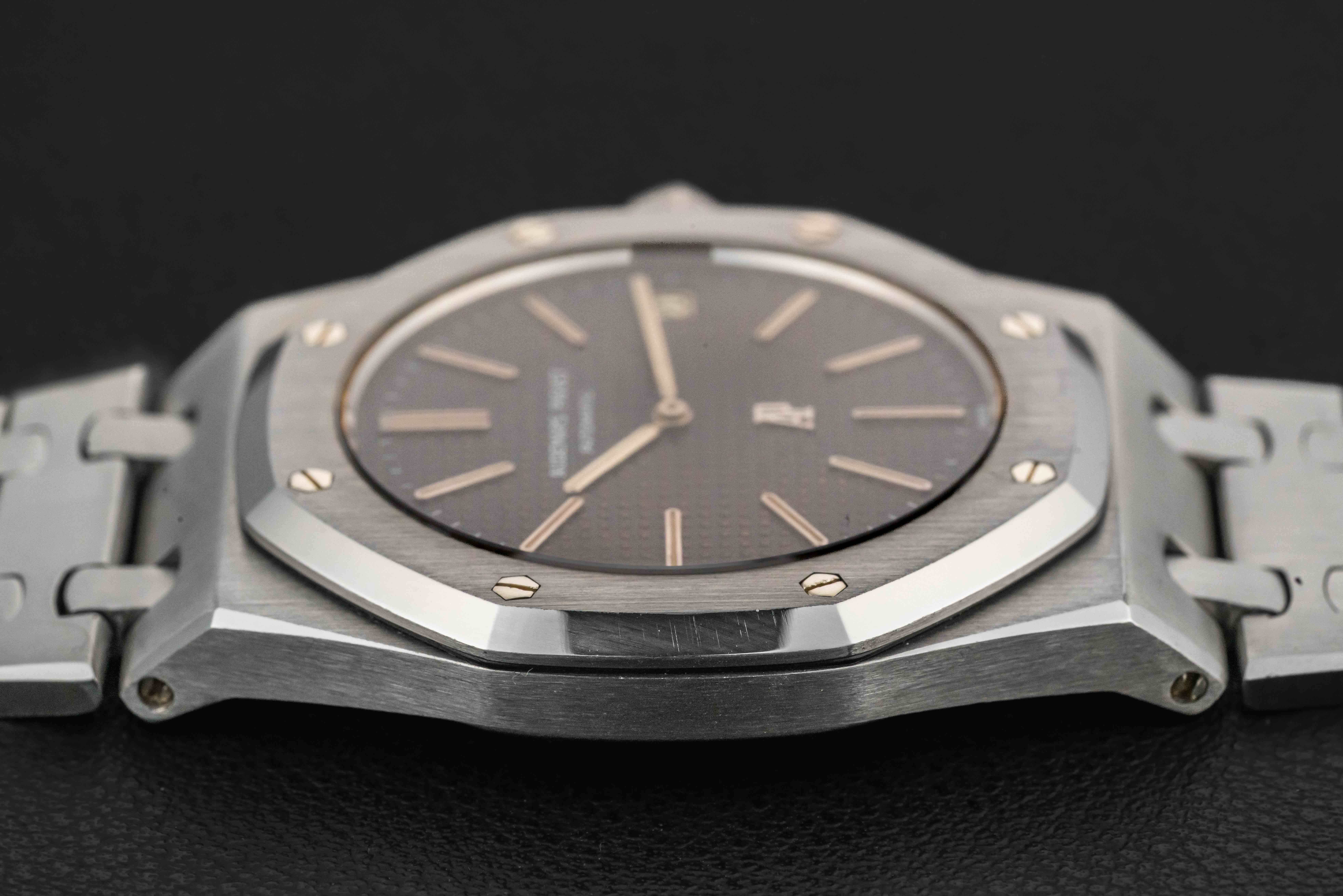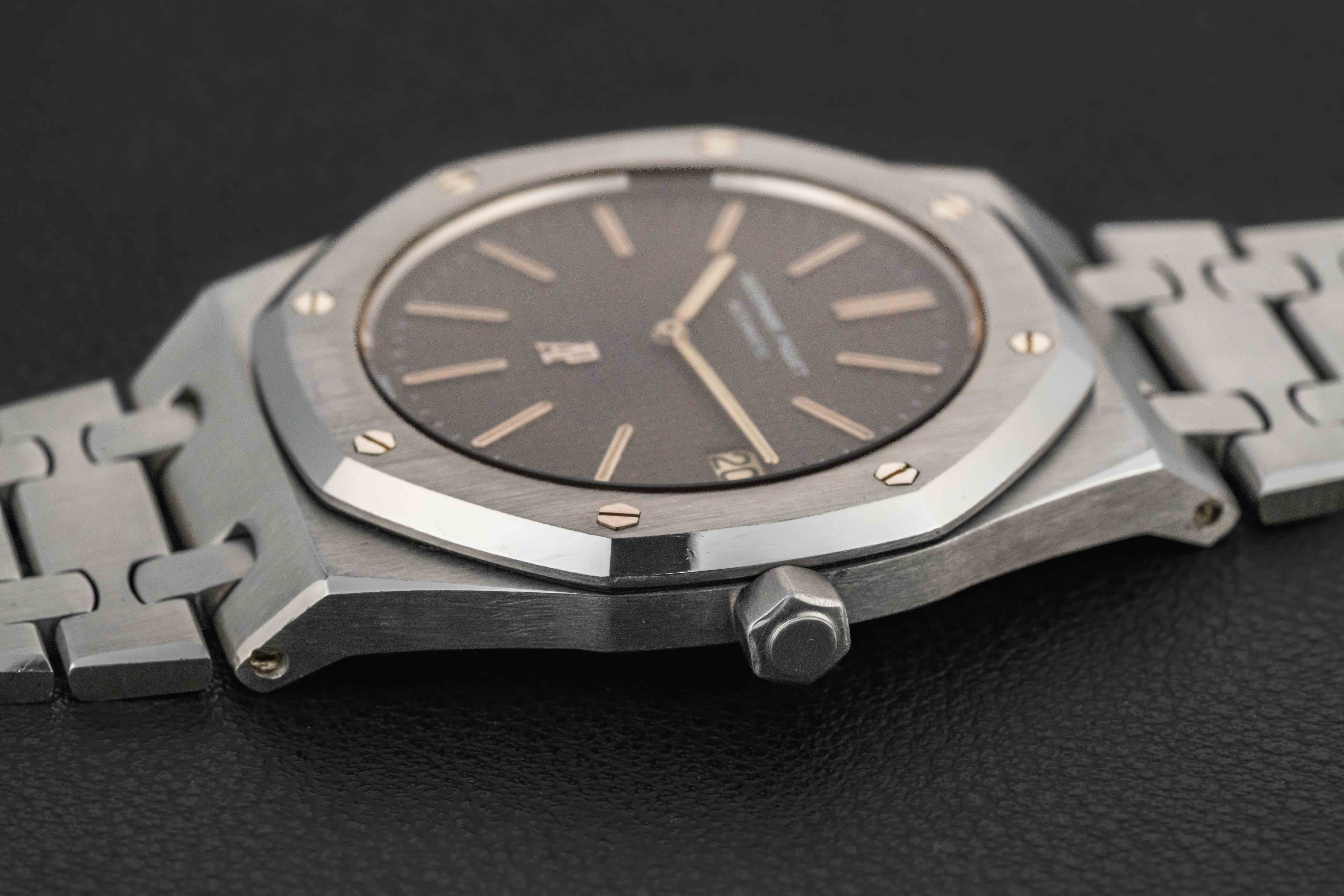 The Audemars Piguet Royal Oak offered here is in great vintage condition. The case is sharp, with correct finish and bevels, professionally detailed by an expert on the Royal Oak case. The dial is beautiful, with a warm blue color, and no major peeling throughout. The original tritium lume is still present in both dial and hands, aged to a nice yellow color. The bracelet is shows light stretch, and appears fully-linked, fitting a large wrist.