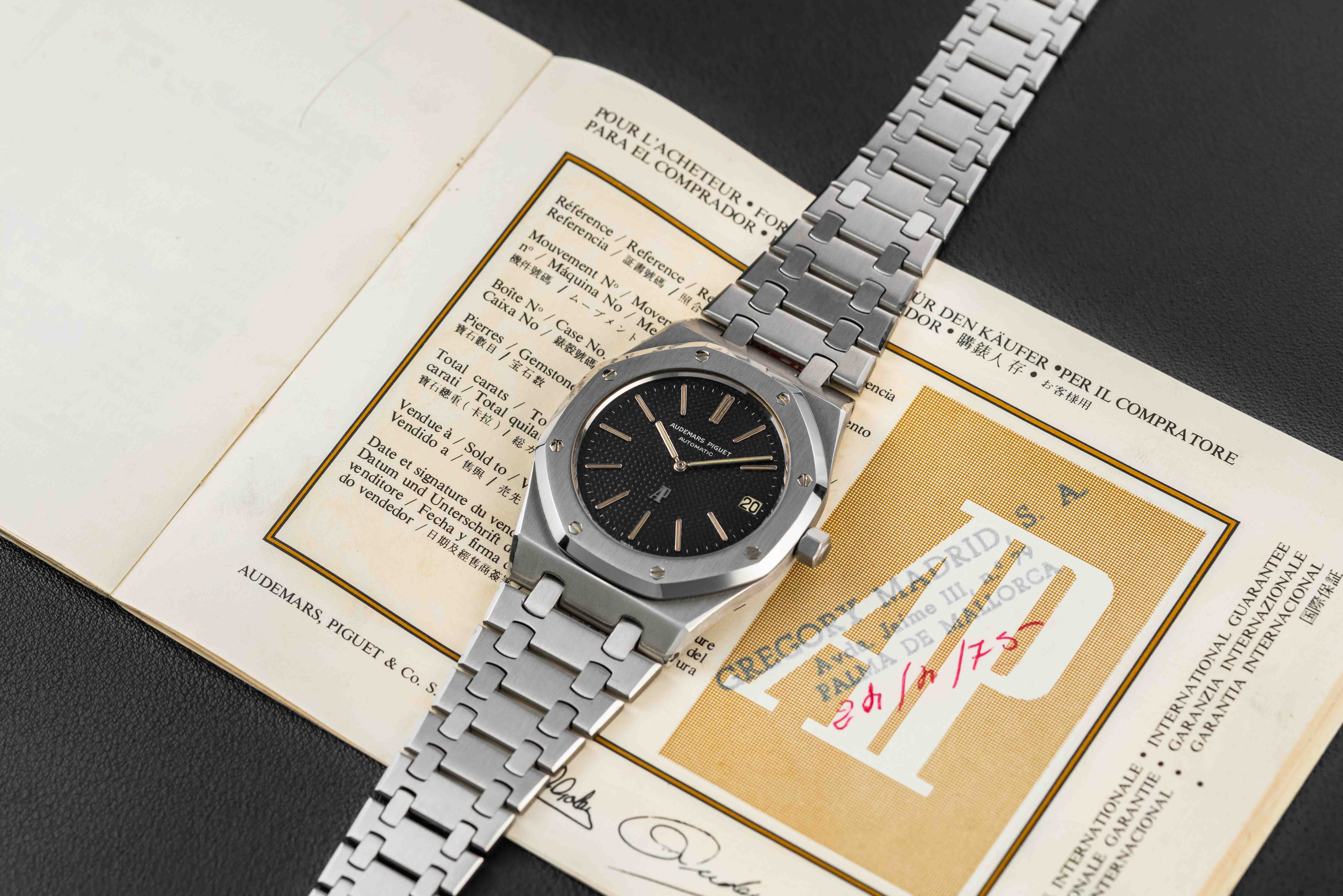 Offered here is an attractive example of the rare and insanely popular Audemars Piguet Royal Oak, Reference 5402, circa 1973. Designed by Gerald Genta, the Royal Oak is the focal point and main attraction for the legendary watchmaker, and these first execution models have soared in popularity – finding a nice example has become harder and harder. This particular example is an “A”-series (1st batch of production), and comes with its original Audemars Piguet Guarantee Certificate (originally sold in February of 1975).