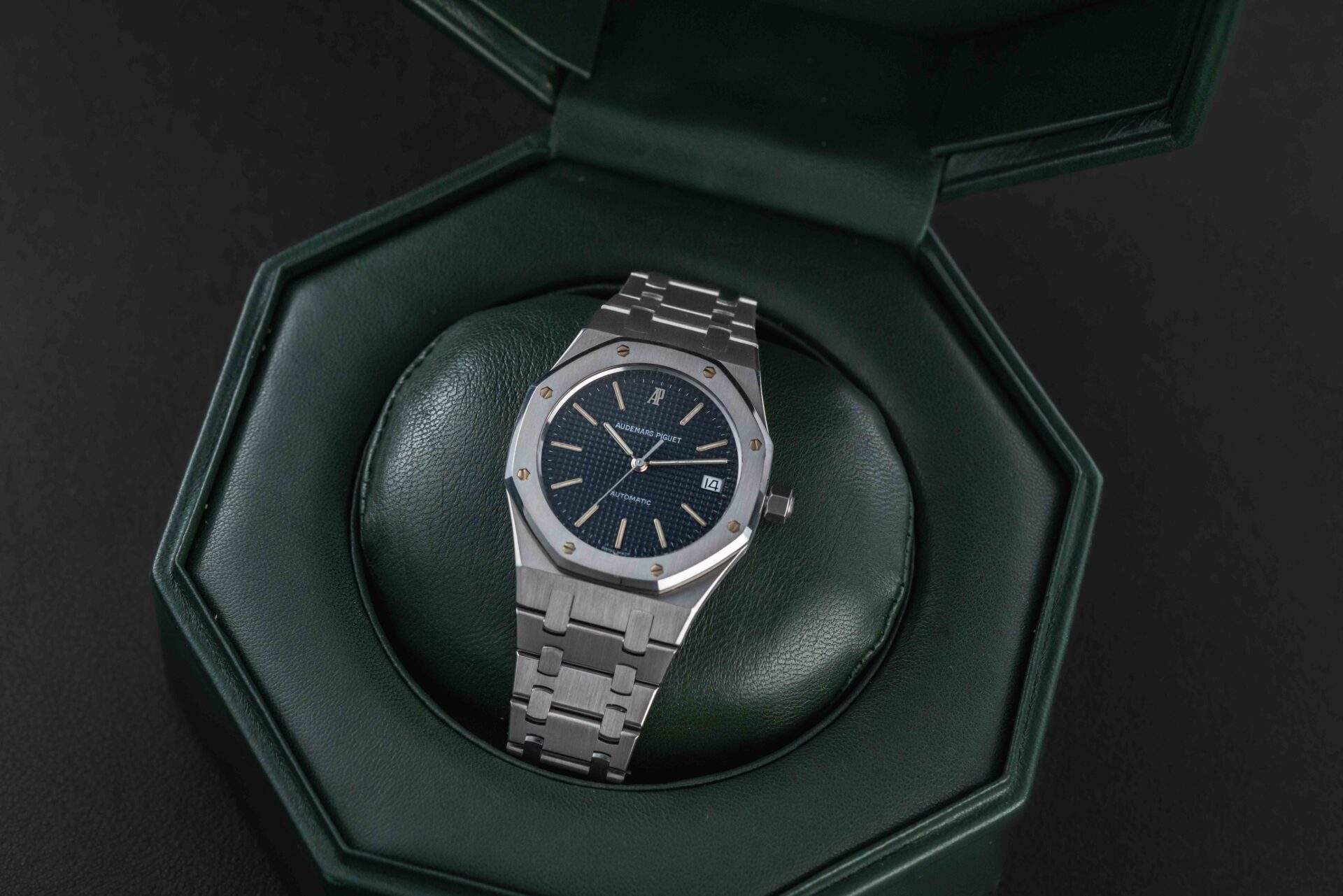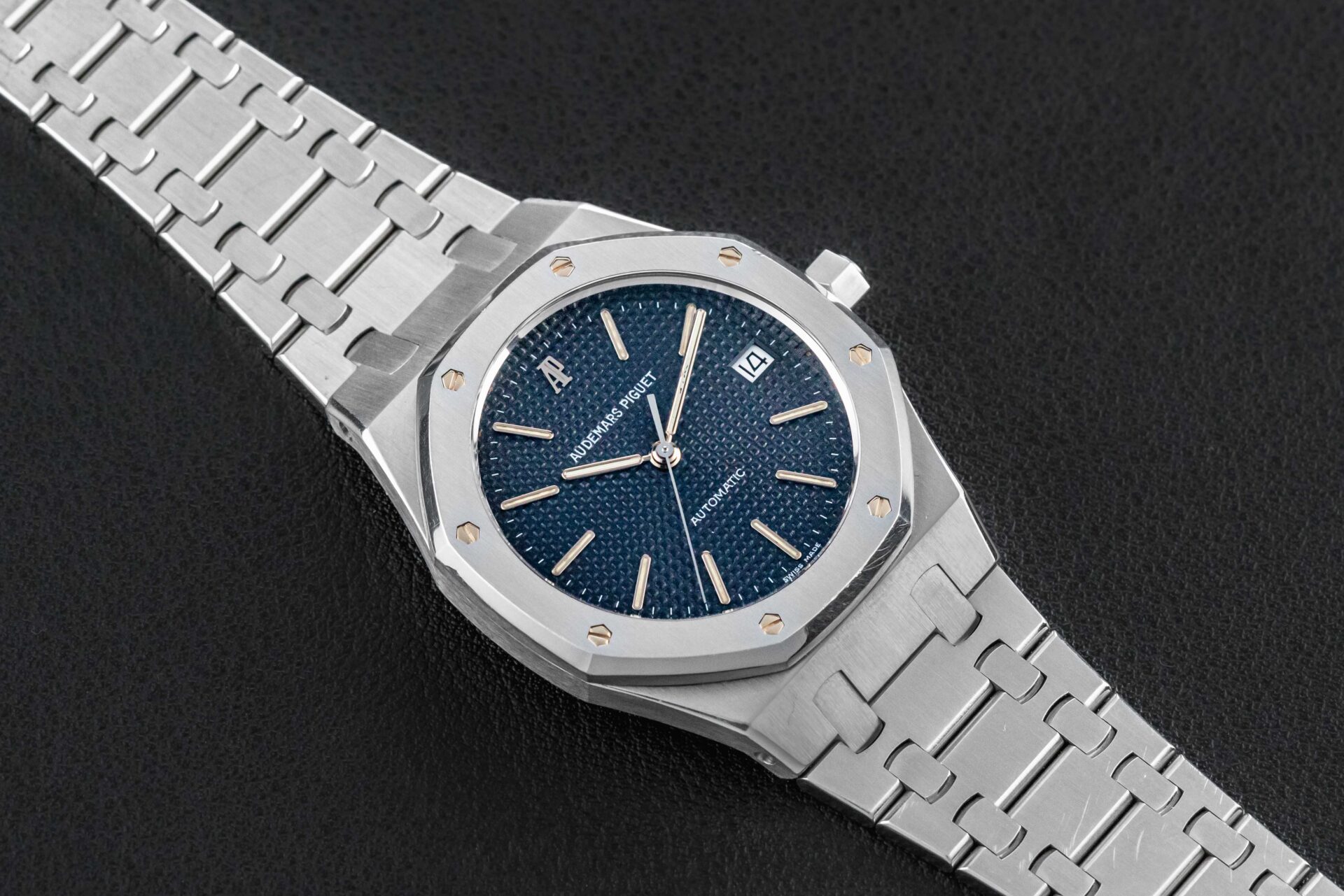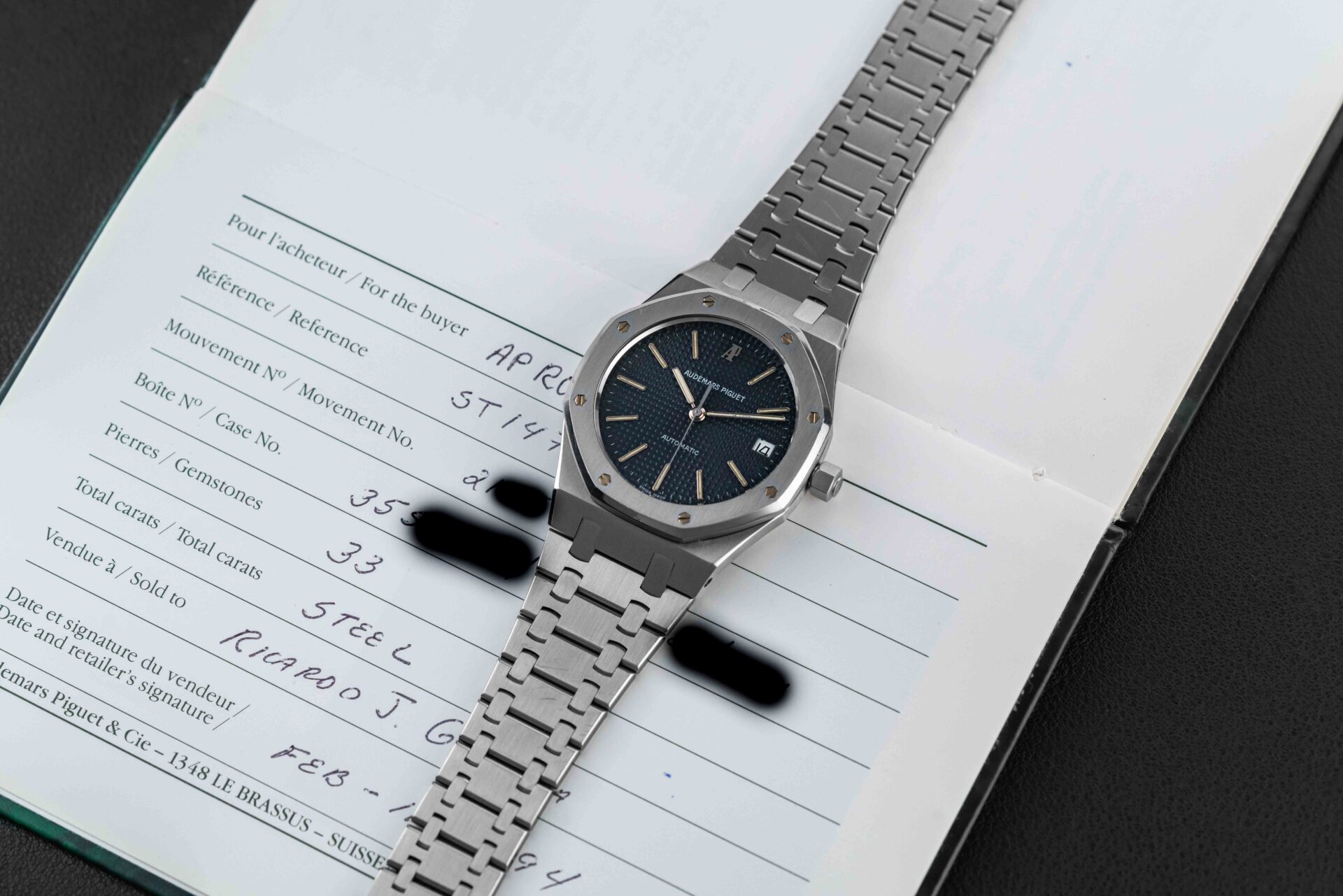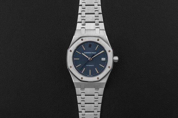 Offered here is an very rare and crisp Audemars Piguet Royal Oak in stainless steel, circa 1990s. This Royal Oak, reference 14700ST, is a rare and transitional reference, produced in much smaller quantities than the smaller-sized 4100 and the later 14790. This particular example is fitted with a blue dial, and was originally sold in 1994. The watch itself is in excellent condition, with a sharp case, perfect dial, and all-present and original tritium lume on both dial and hands. The bracelet shows no stretch, and will fit an approximate 7.5″ wrist, seemingly fully-linked. This example comes with its original inner and outer Audemars Piguet Royal Oak box, and Certificate of Origin booklet.