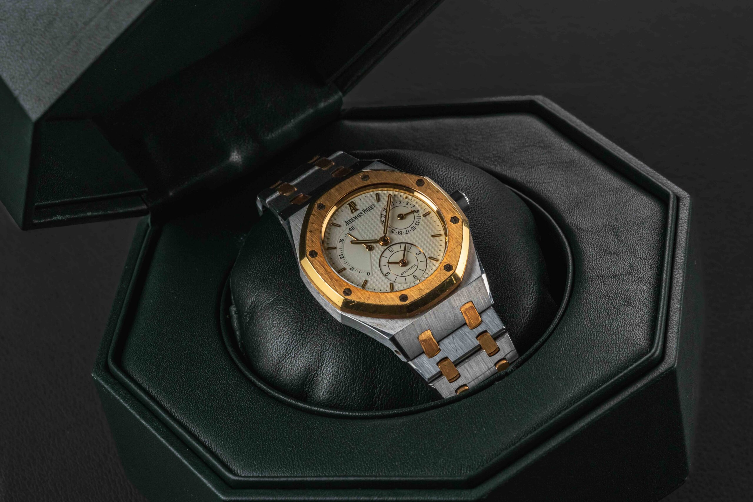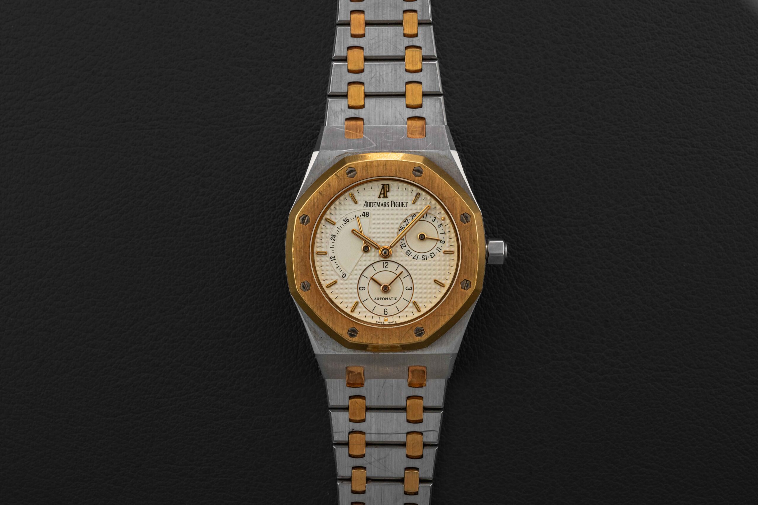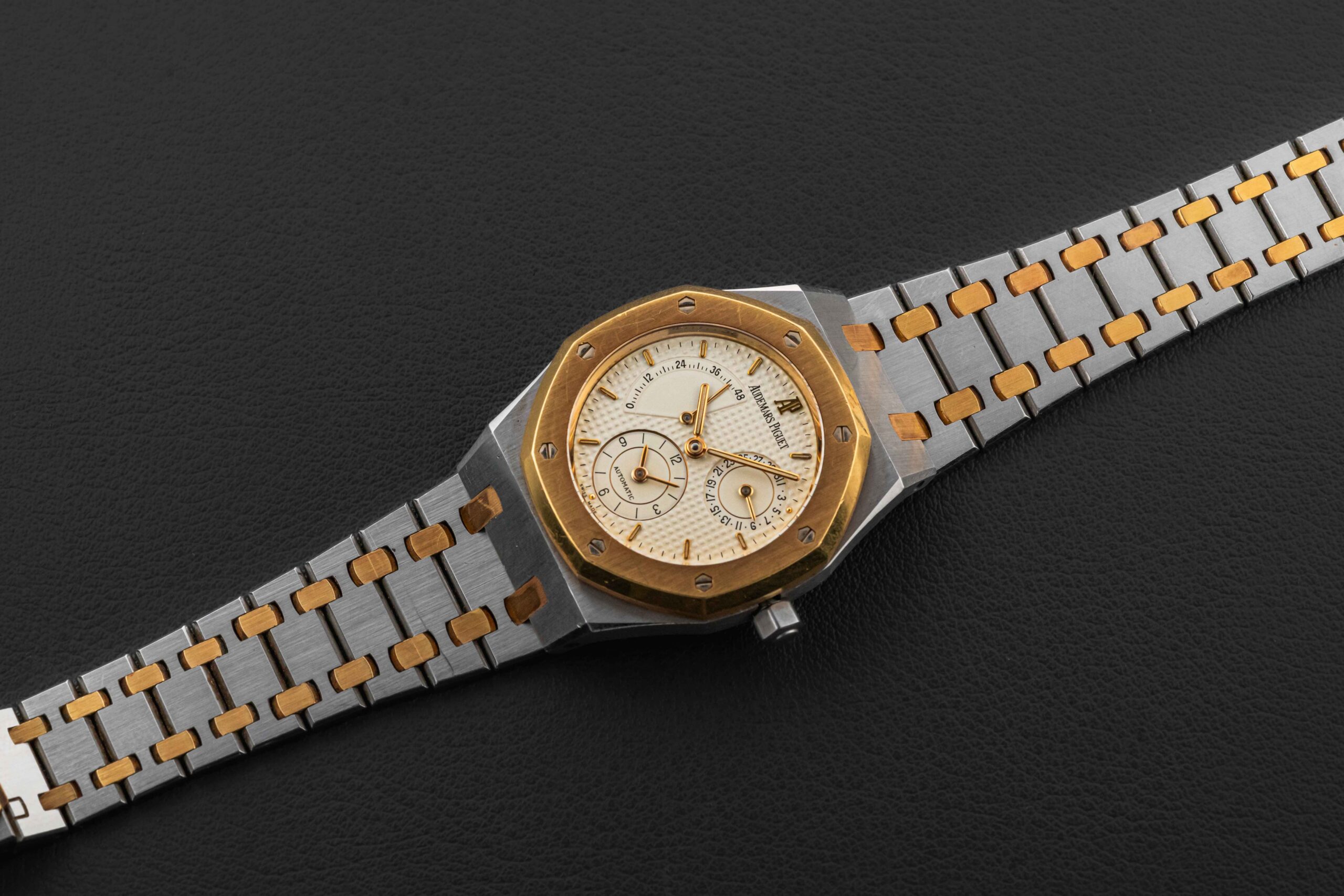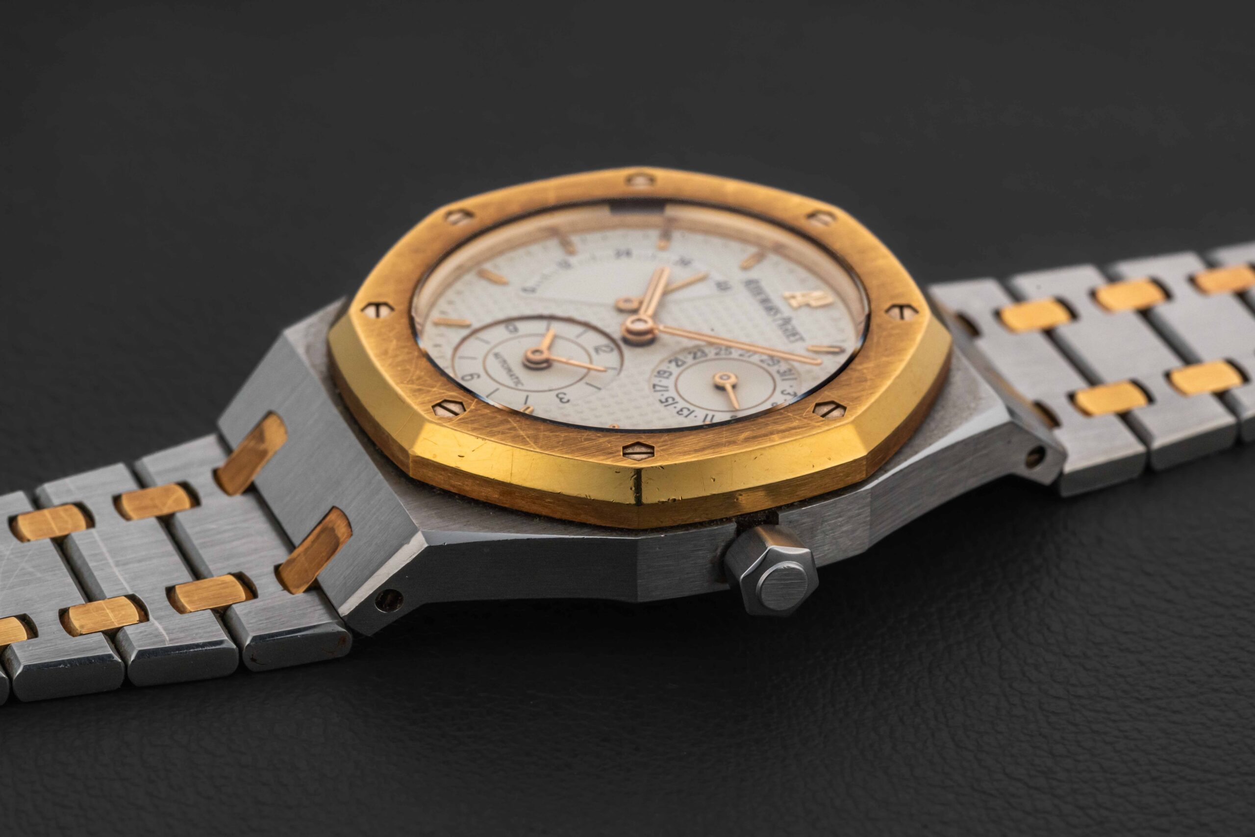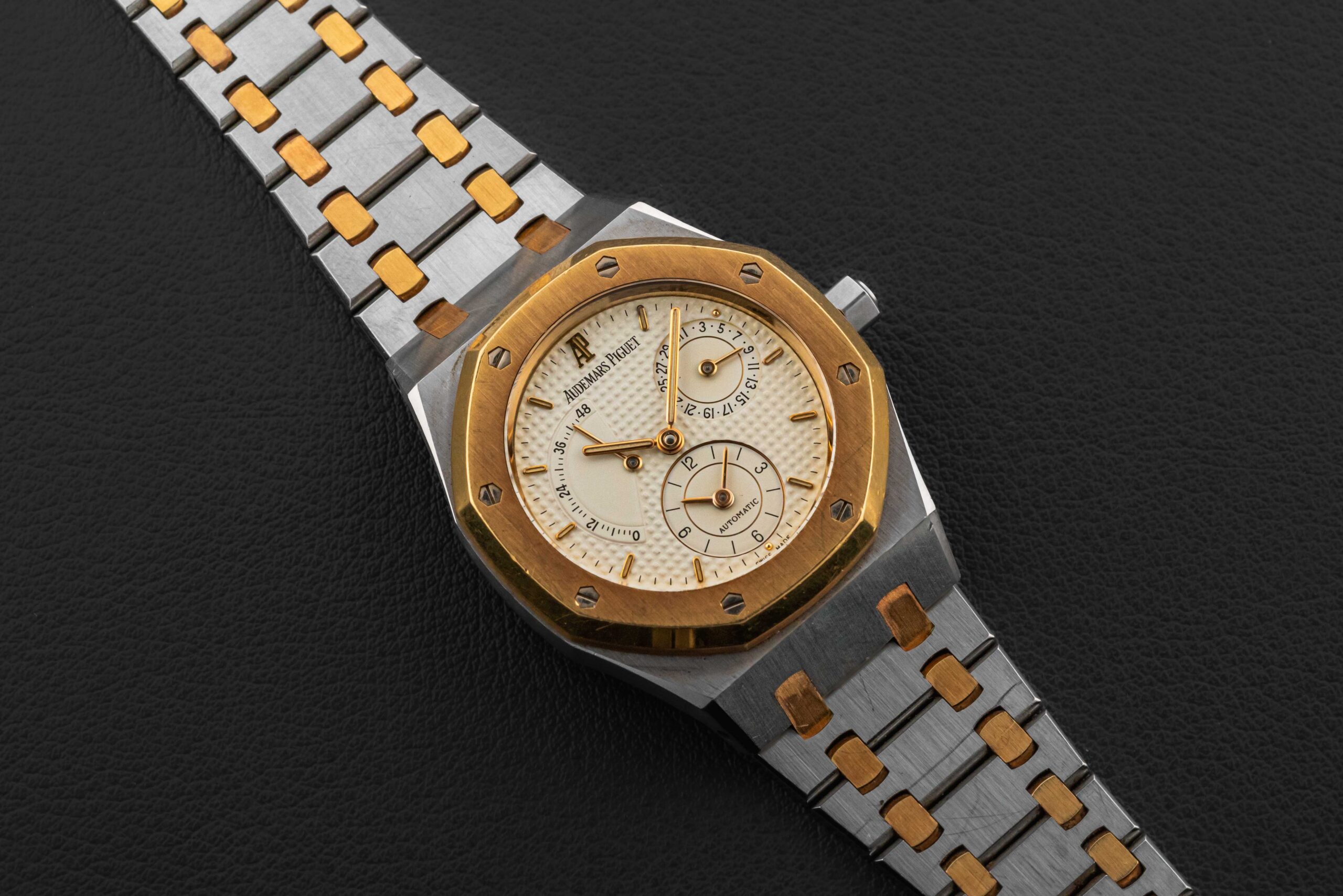 Offered here is a lovely example of a 1990s Audemars Piguet Royal Oak “Dual Time”, reference 25730SA, in two-tone stainless steel and yellow gold. The Dual Time model allows the wearer to set two independent times via the main hour and minute hands, and the register at 6 o’clock; additionally, the watch features a power reserve and date complication. This particular example comes very complete, with its original Audemars Piguet box, Certificate of Origin, and Dual Time booklets.