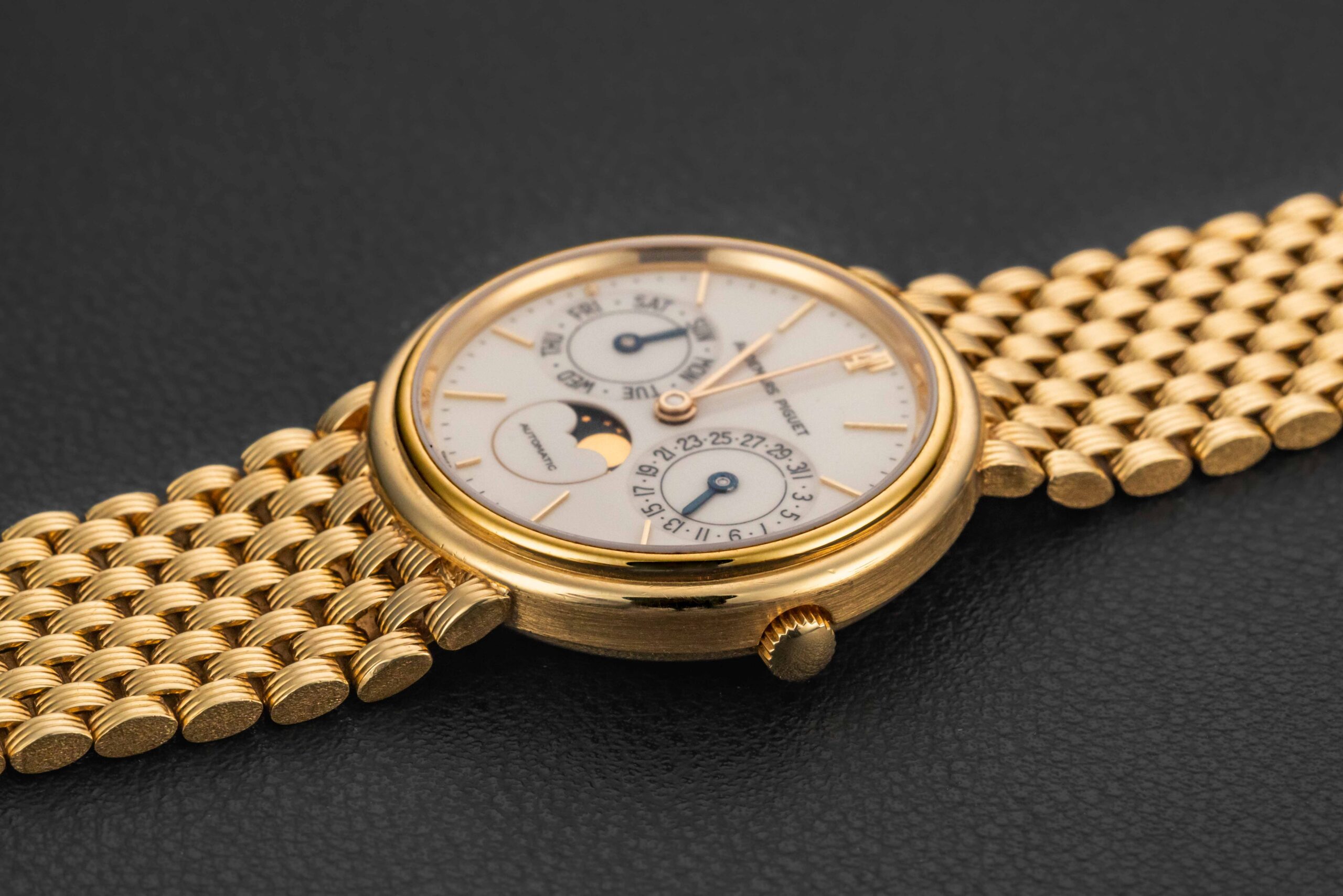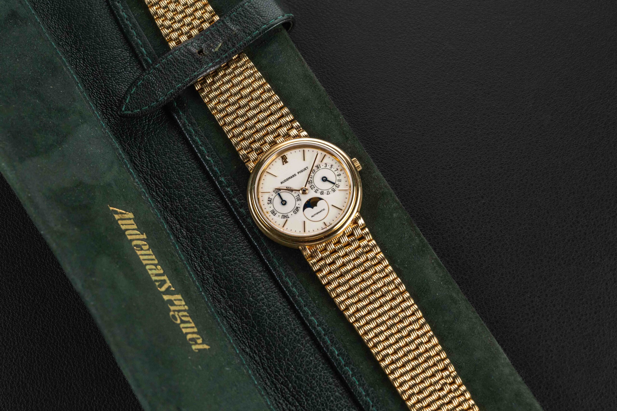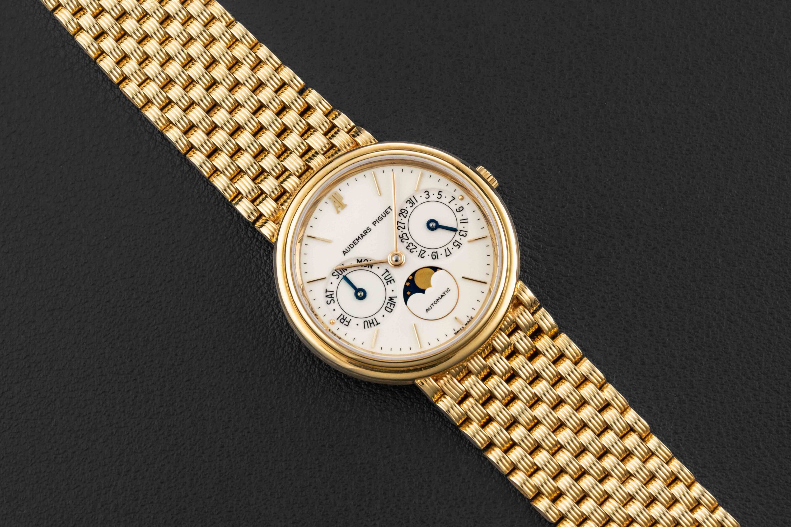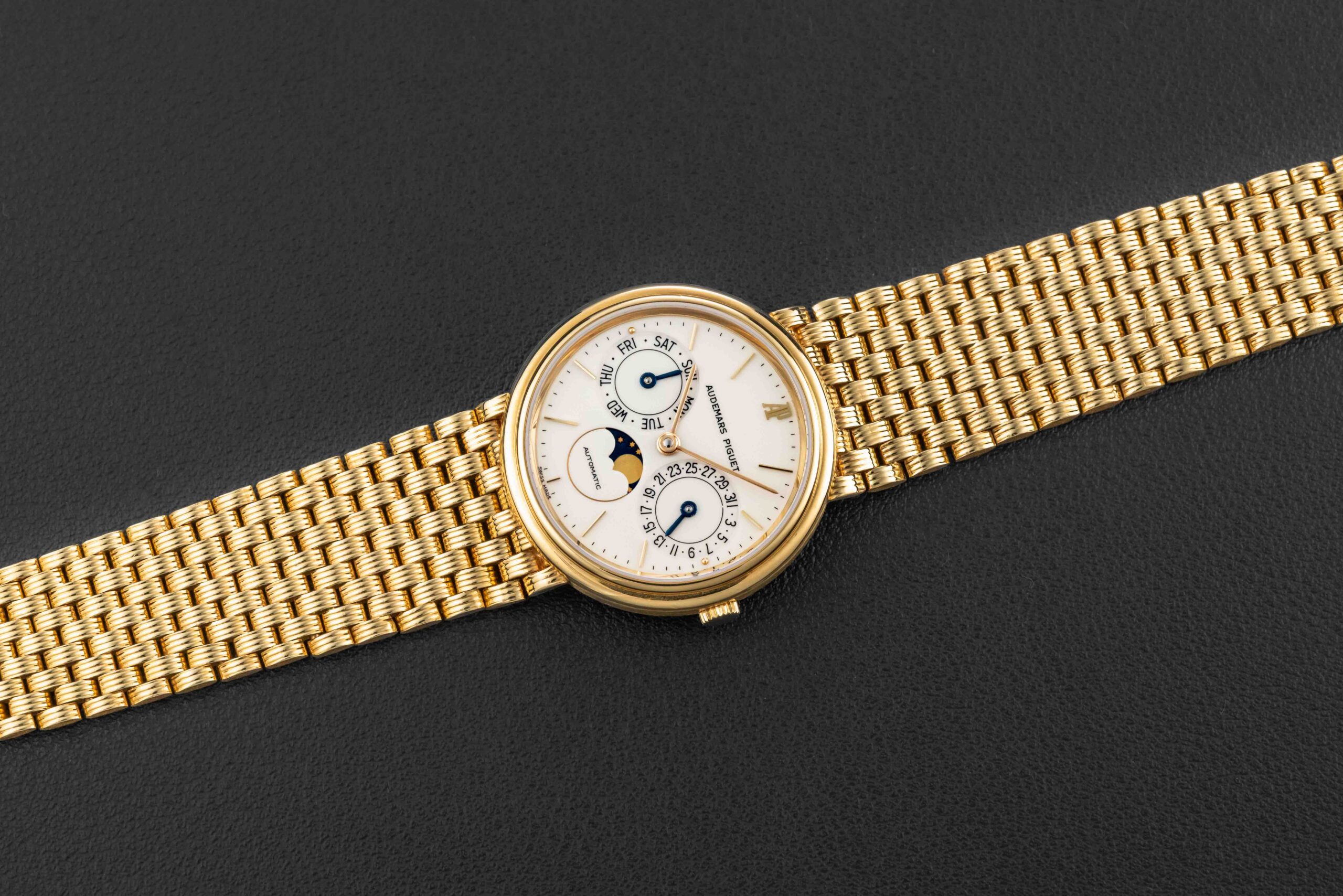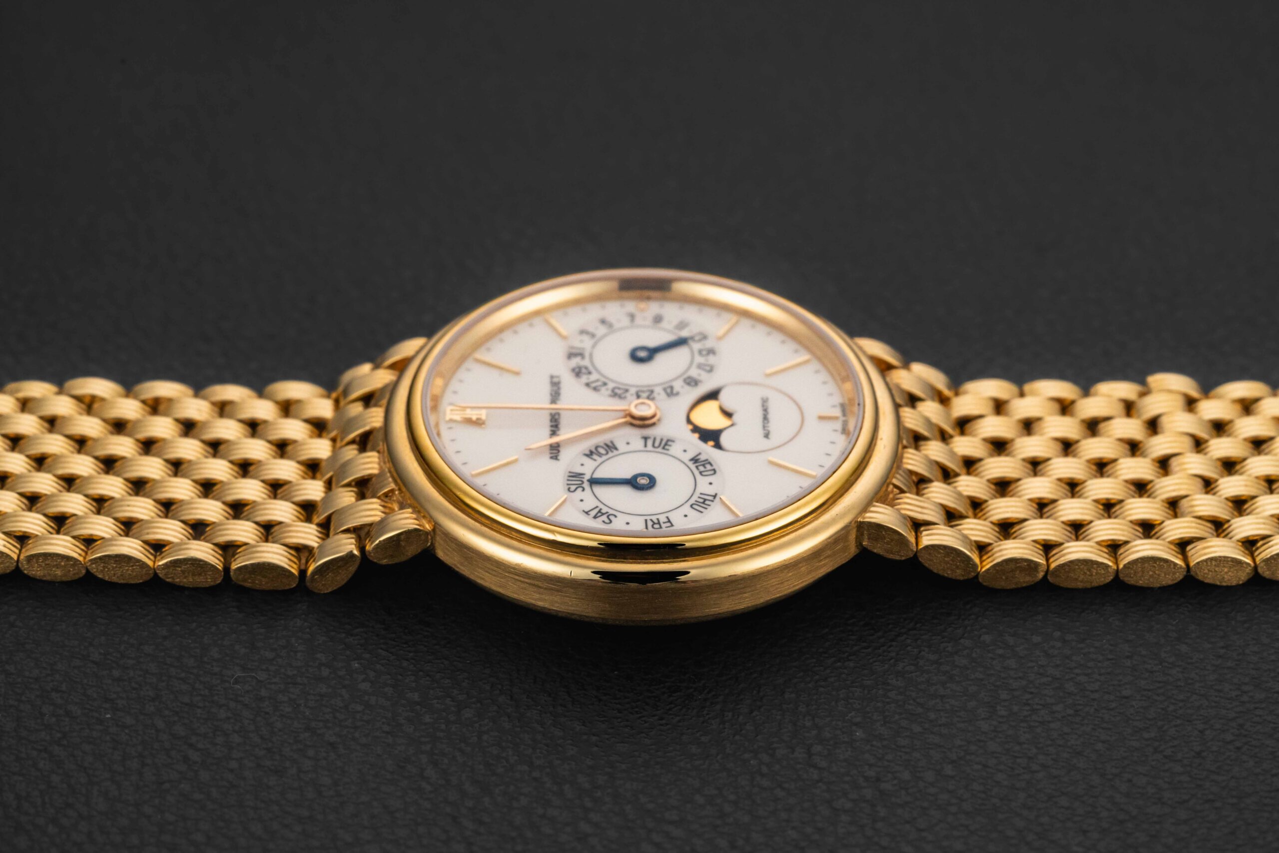 The condition of this Audemars Piguet is excellent, unpolished with minimal wear from us. Further, the original enamel dial shows no cracks, remaining very well-preserved. Finally, the bracelet appears uncut as it left the factory.