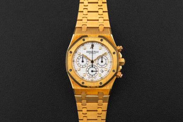 Up for grabs is a beautiful Audemars Piguet Royal Oak chronograph, circa 2004, with the reference 25960BA (Yellow Gold), and fitted with a white dial. This watch has been nicknamed the “Kasparov” due to the famous chess Grandmaster Garry Kasparov, who would wear this model during his professional games, and would always remove it from his wrist prior to his last, winning moves. This Audemars Piguet Royal Oak chronograph remains in excellent vintage condition, remaining unpolished and sharp, and seemingly fully-linked. Finally, the watch remains complete with its original Audemars Piguet box, Certificate of Origin booklet, and original hang-tag, and other booklets.
