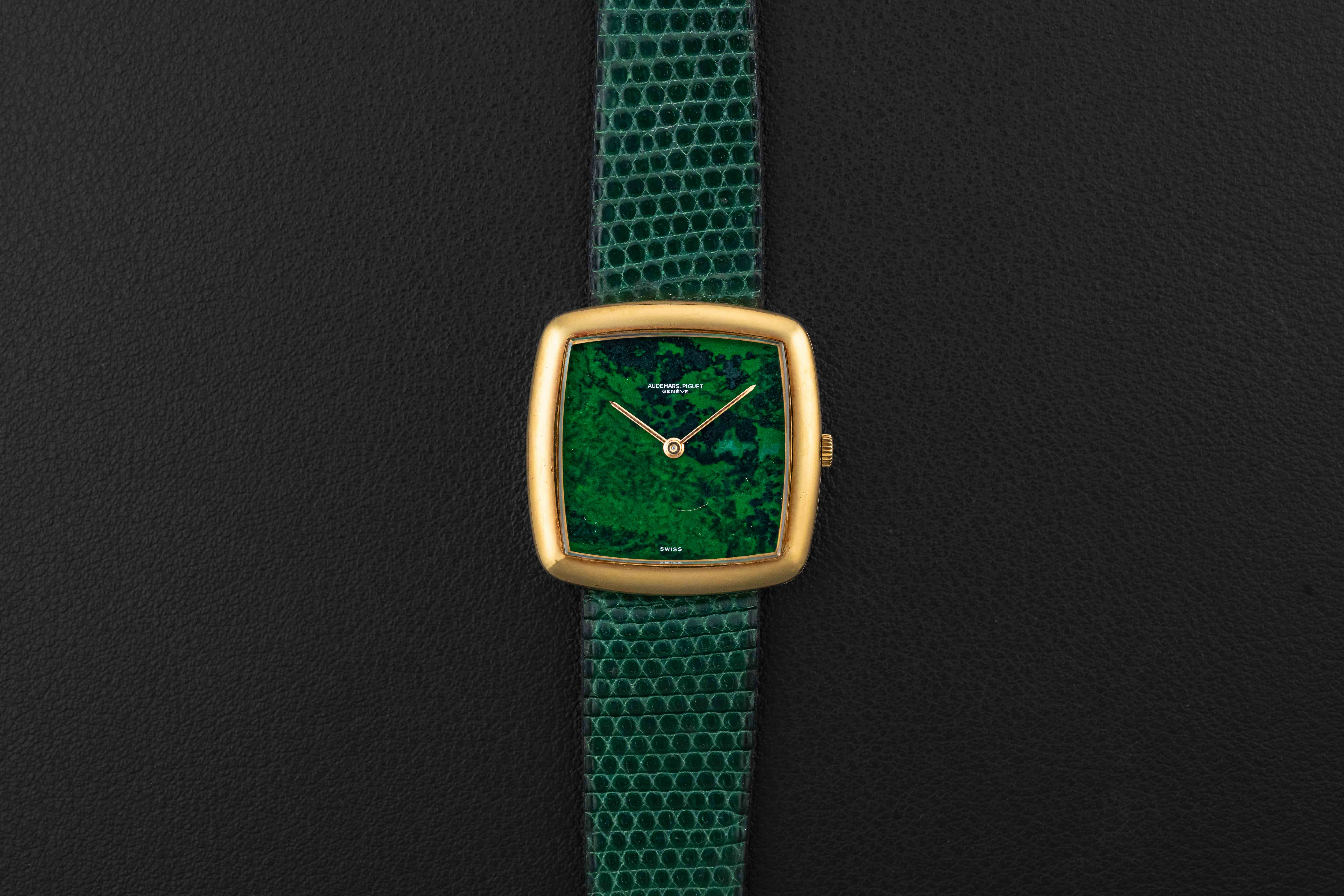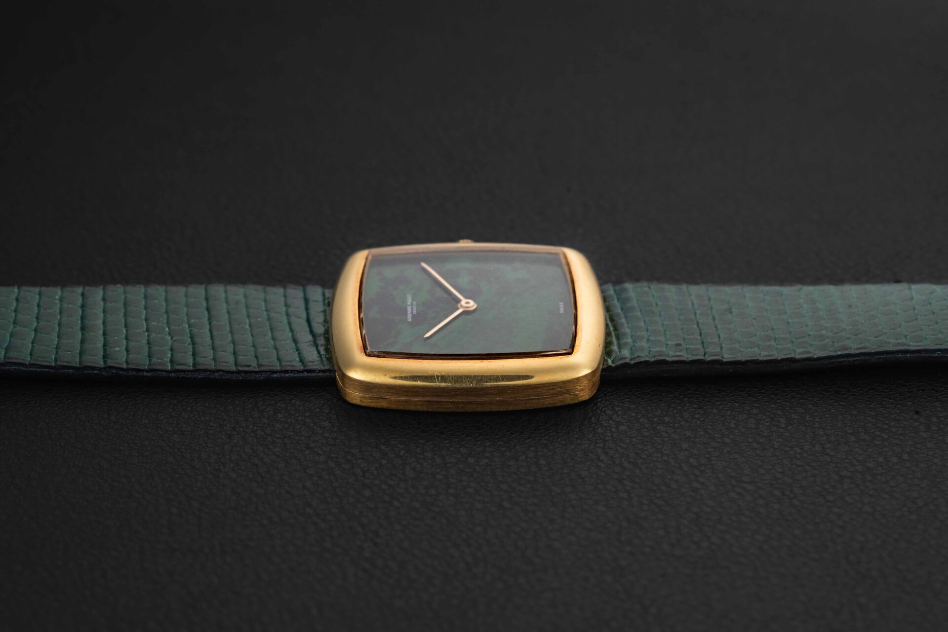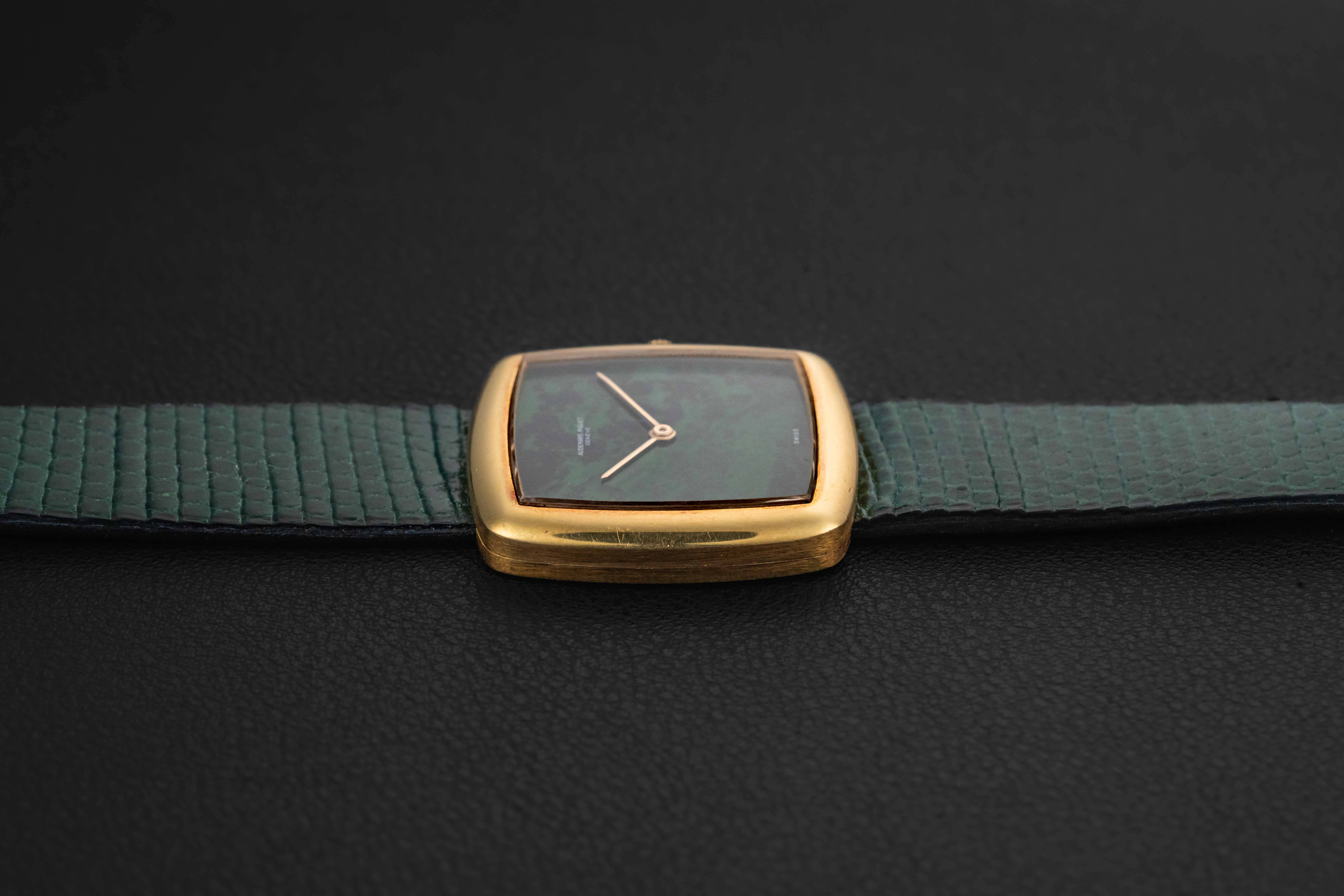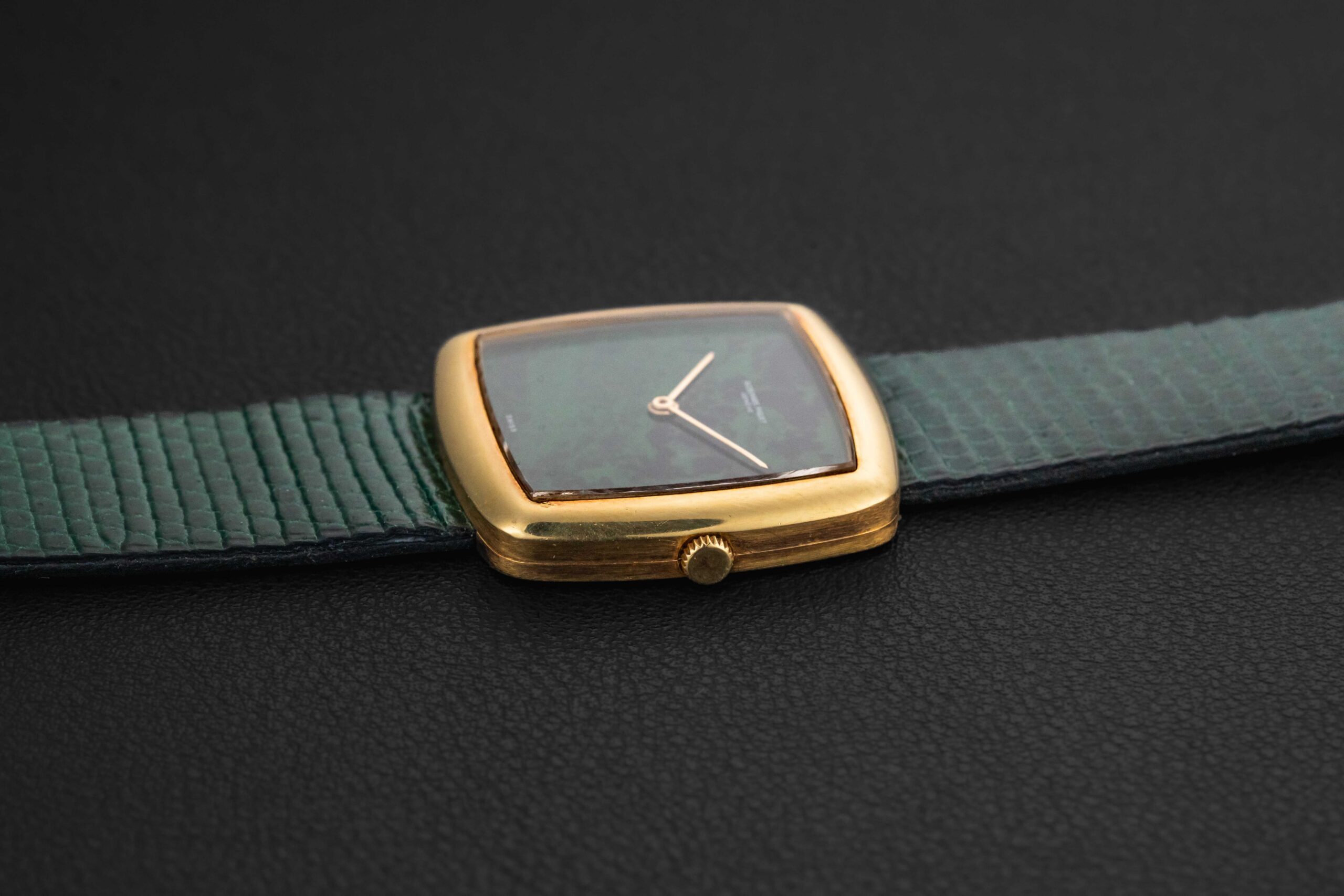 Up for grabs is an exceedingly rare 1970s Audemars Piguet watch in 18kt yellow gold; to date, we can only find one other example the same as ours. This particular watch was fit with a very uncommon “Maw Sit Sit” stone dial, which is a green gemstone found in northern Burma, often confused with Jade. Further, this crazy rare Audemars Piguet remains in excellent vintage condition, remaining unpolished with sharp engravings, and a perfect, crack-free stone dial.