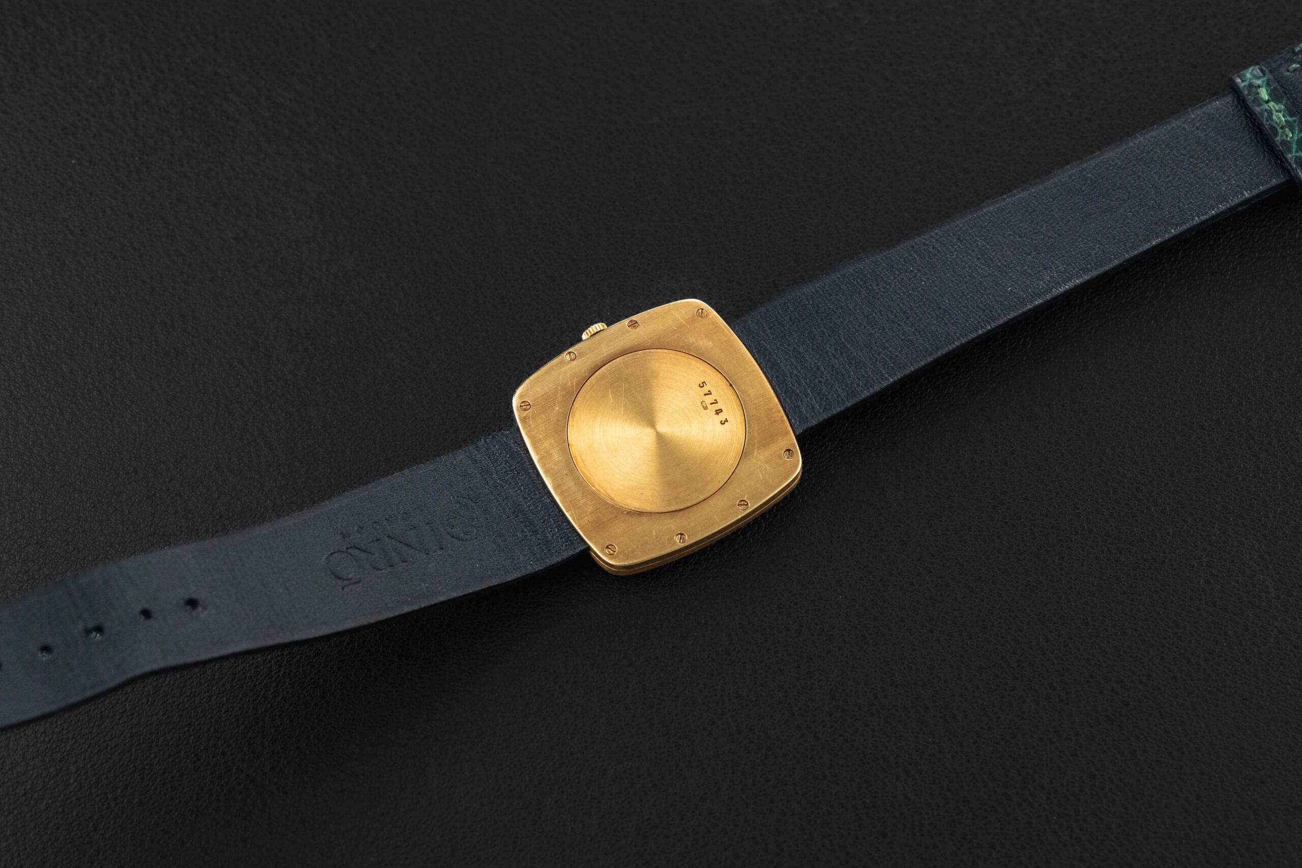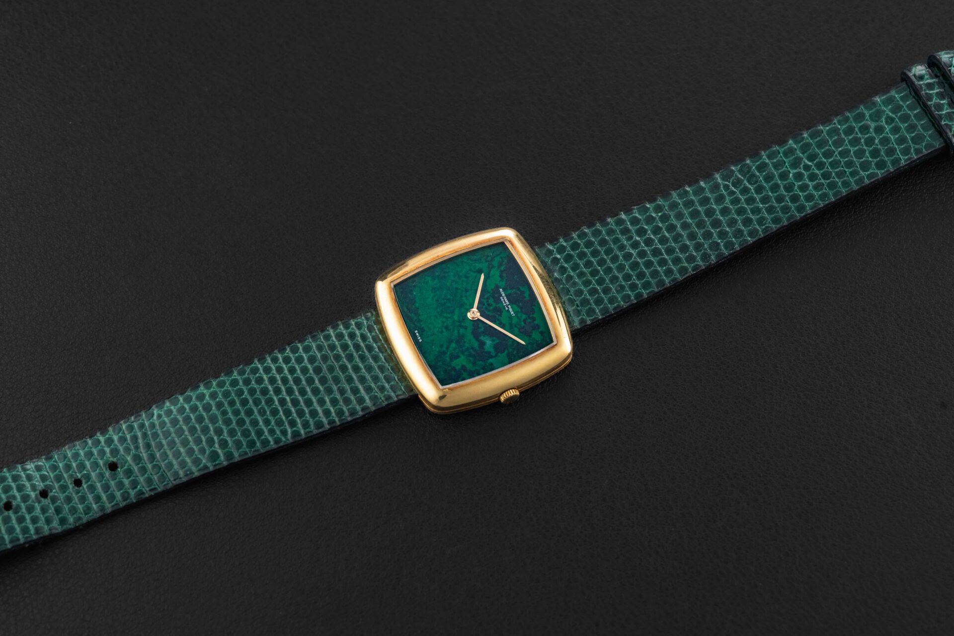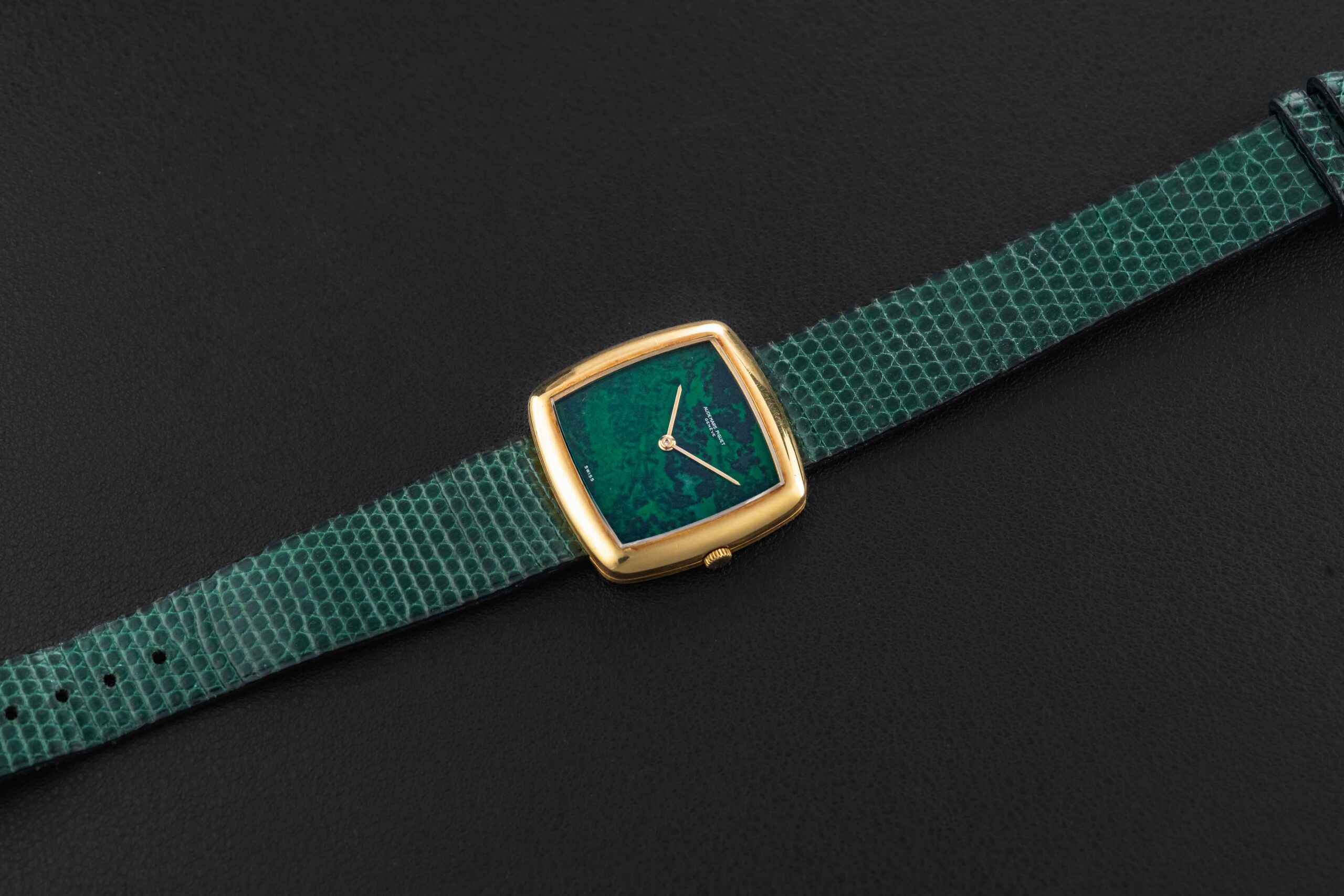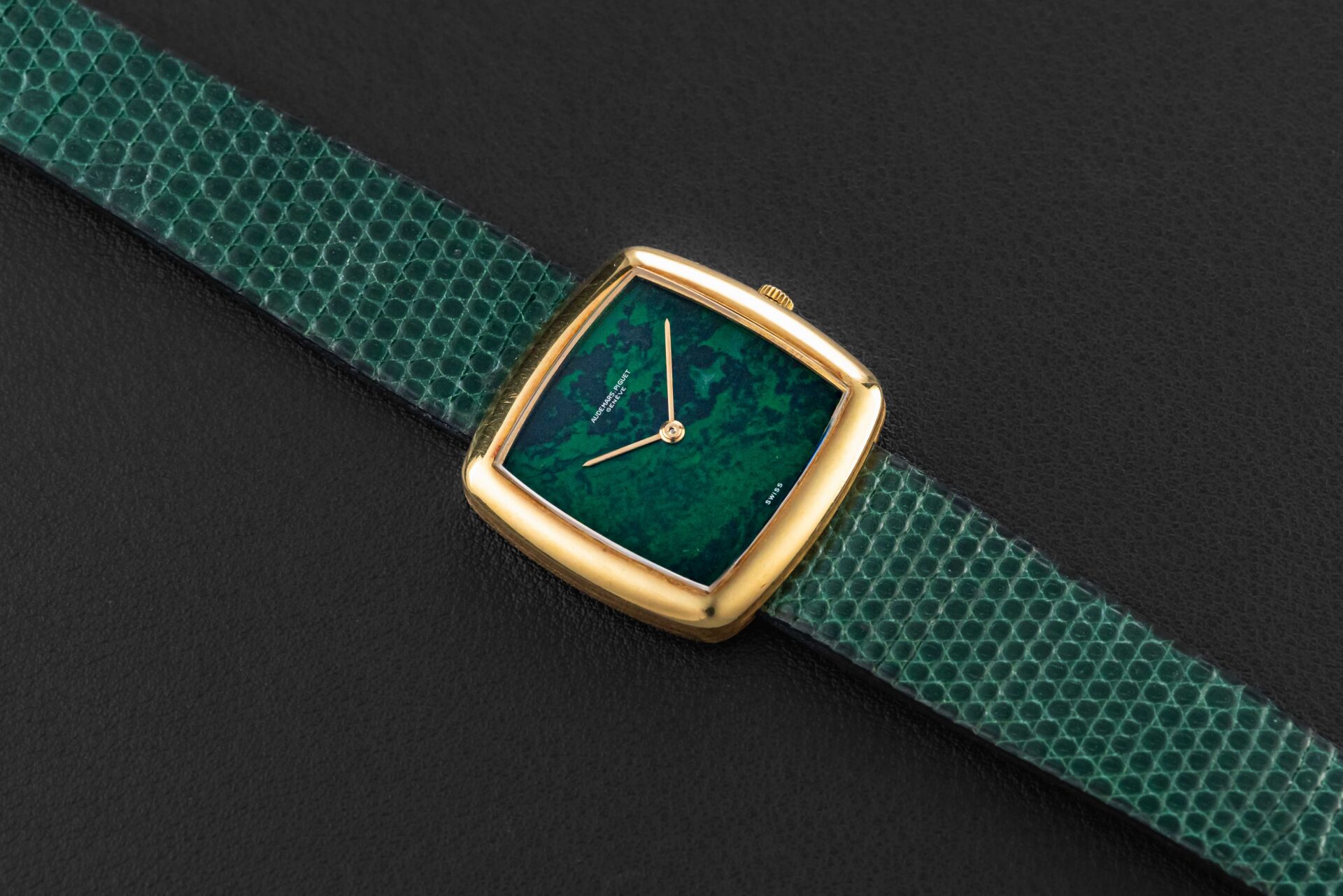 Up for grabs is an exceedingly rare 1970s Audemars Piguet watch in 18kt yellow gold; to date, we can only find one other example the same as ours. This particular watch was fit with a very uncommon “Maw Sit Sit” stone dial, which is a green gemstone found in northern Burma, often confused with Jade. Further, this crazy rare Audemars Piguet remains in excellent vintage condition, remaining unpolished with sharp engravings, and a perfect, crack-free stone dial.