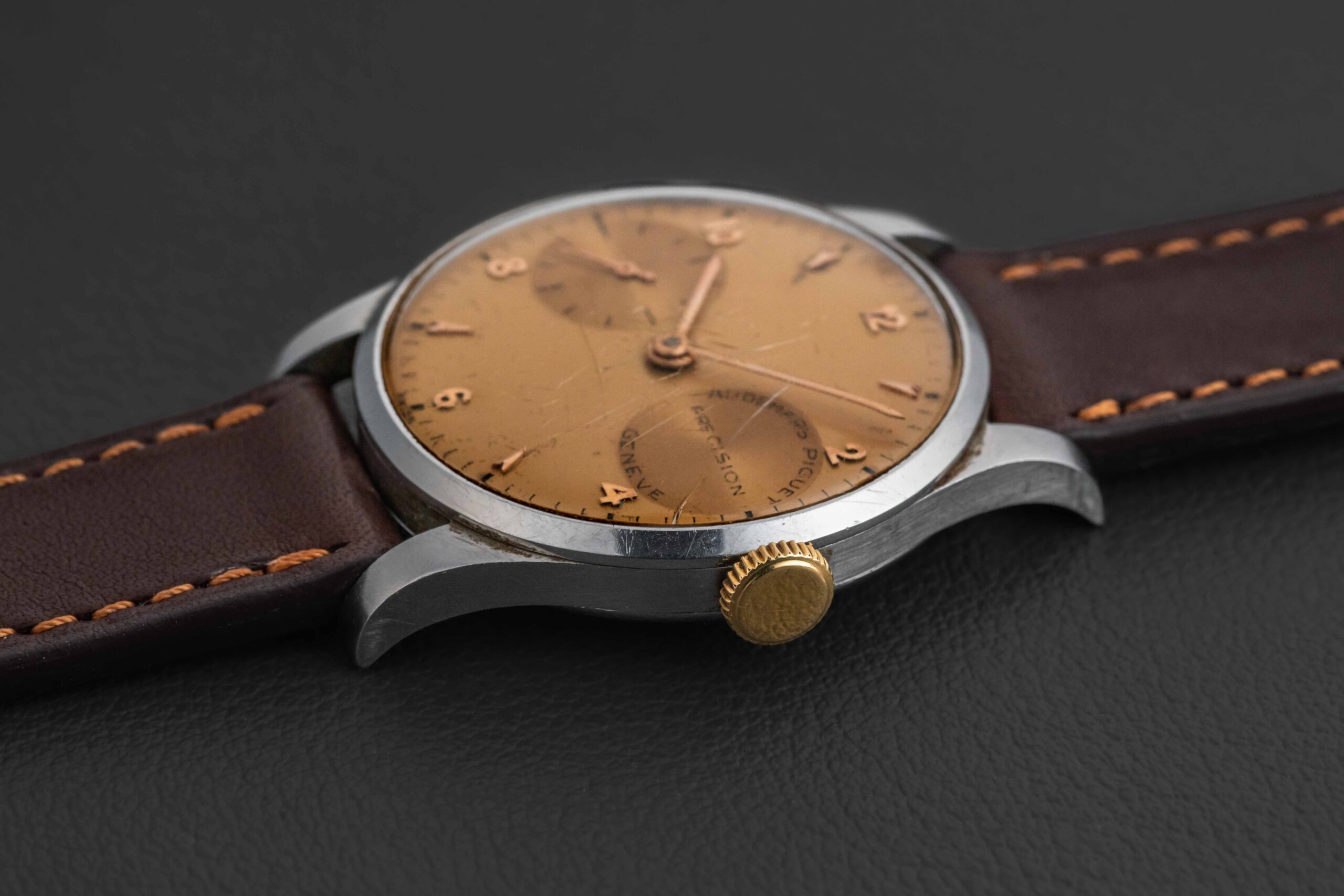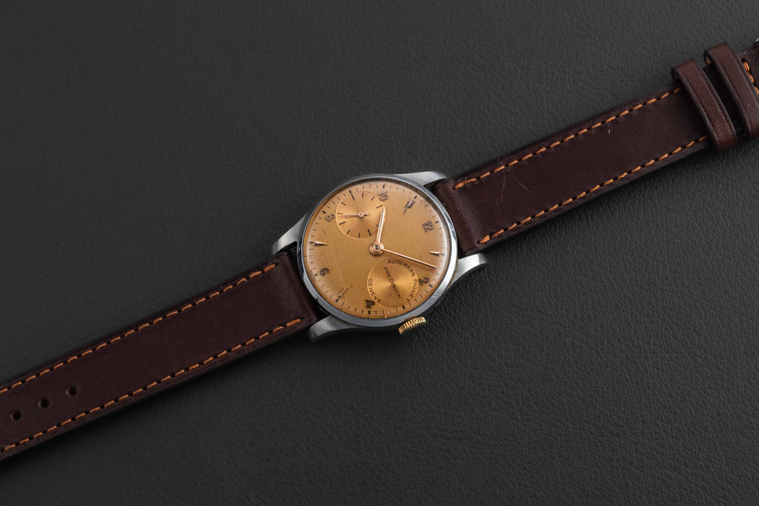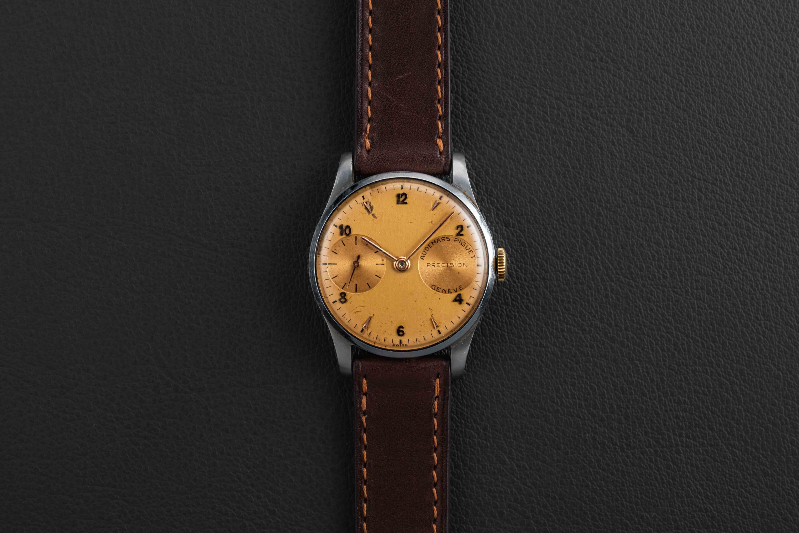 Up for grabs is a very special and exceedingly rare Audemars Piguet Precision, circa 1948. Vintage Audemars Piguet are some of the most sought-after and collectible watches in all of vintage collecting, due to their rarity (low production numbers), and high-grade movements (for the era), such as the caliber 13VZAS found in the present watch. Only a handful of these “observatory”-style Precisions are known to exist; this particular example is housed in a 32mm steel case, fit with a champagne dial and matching gold crown.