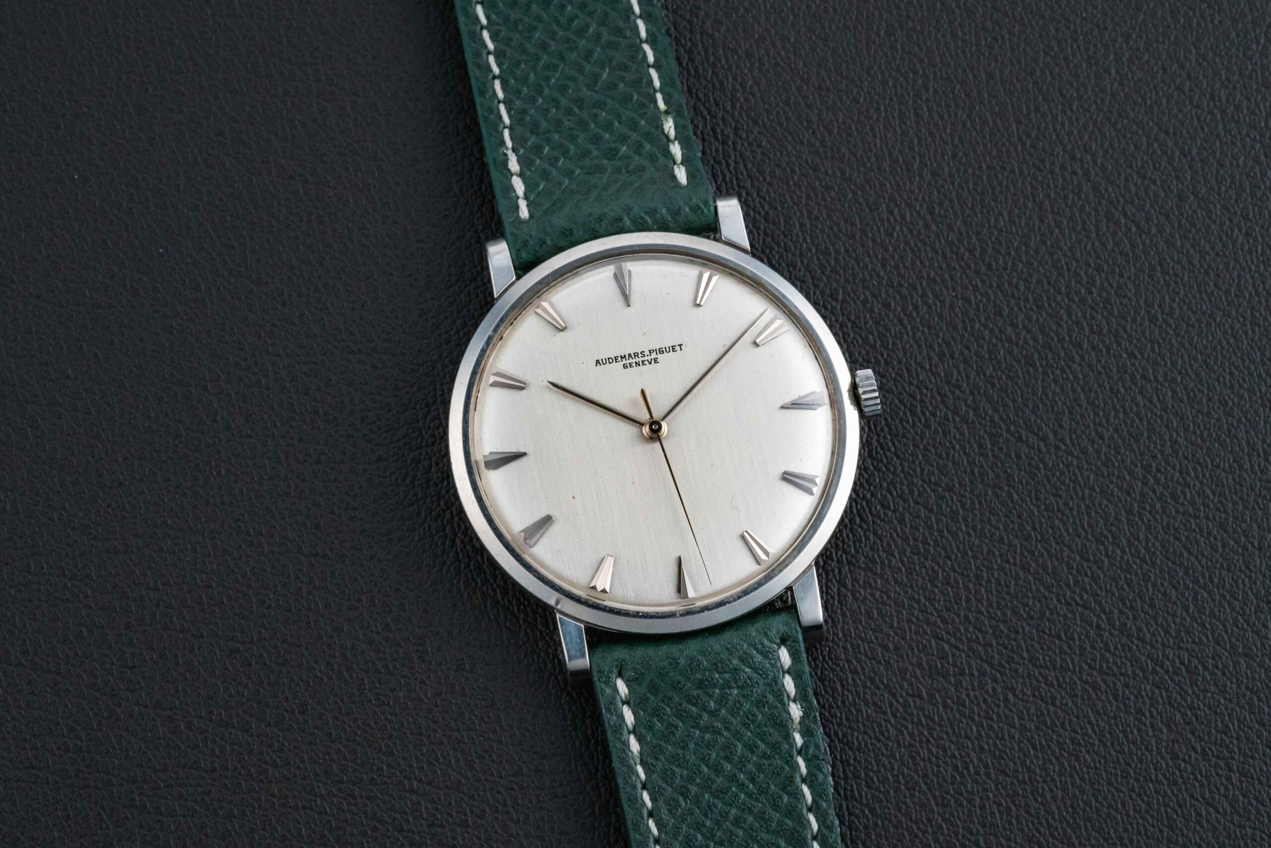 This rare Audemars Piguet Ultra-Thin is in great vintage condition. The contract platinum case is in excellent condition, remaining unpolished with light wear from use, and retains its original serial (noted in the AP Certificate), and hallmarks visible inside the caseback. Further, the original silver dial with applied indices remains very well-preserved, with minimal aging.