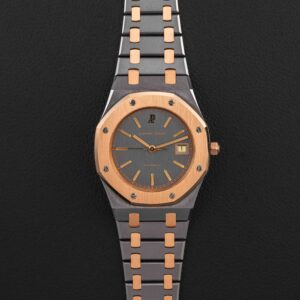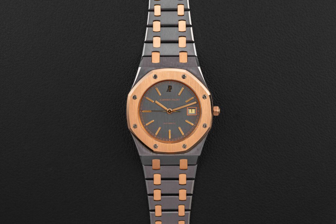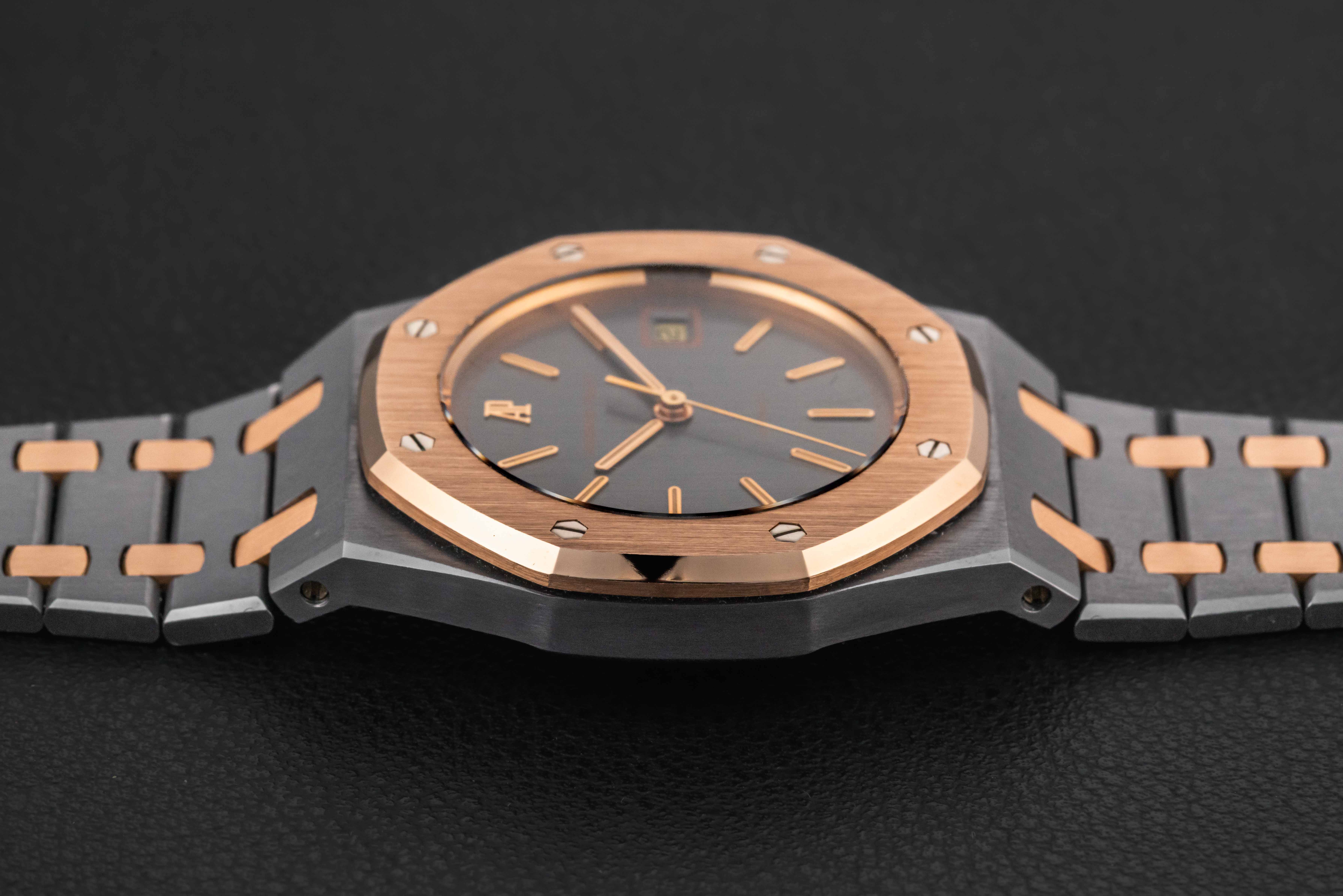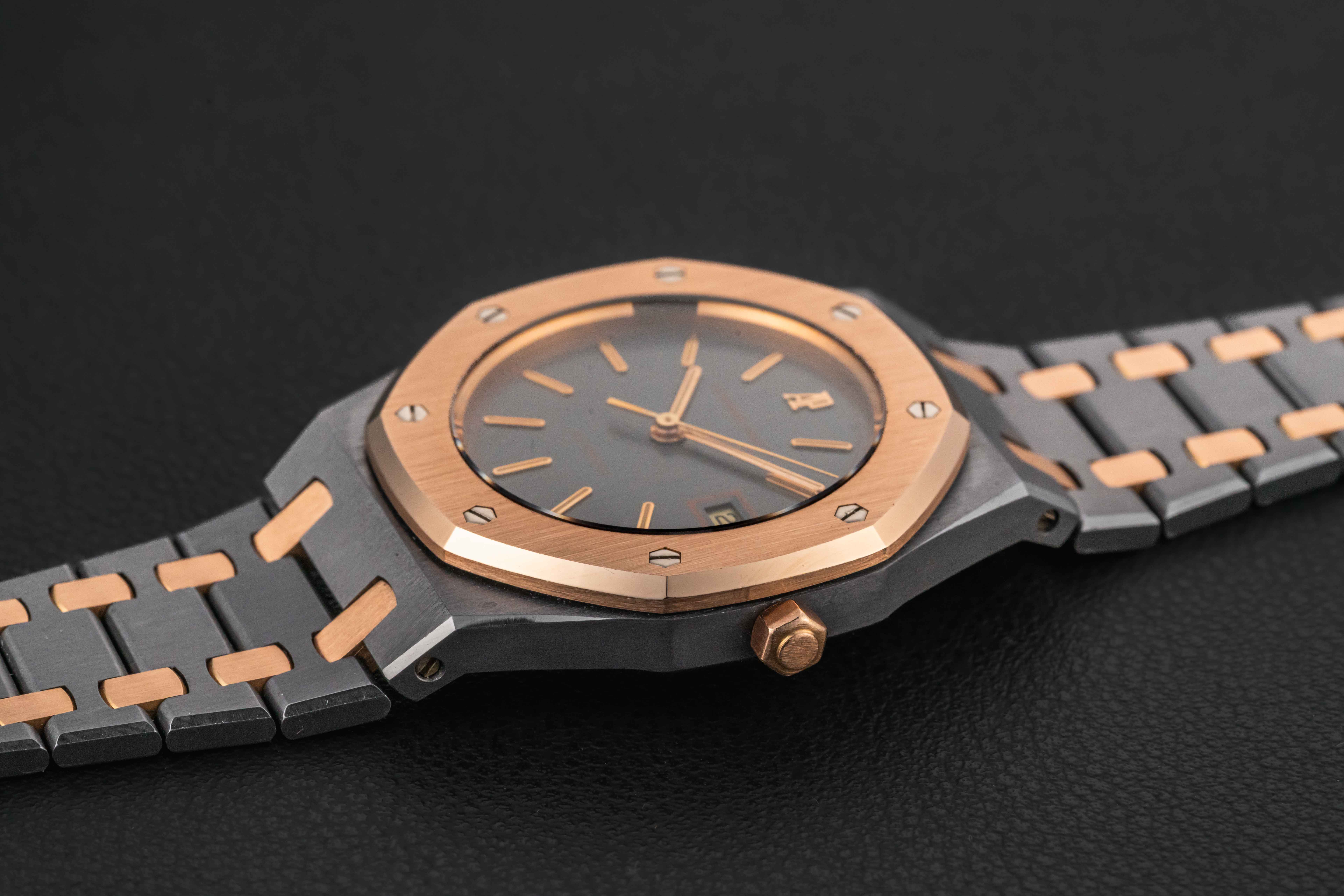 Up for grabs is a very rare and transitional Audemars Piguet Royal Oak, Reference 14486TR, produced for a very short time in the 1980s. This reference is transitional between the reference 4100 and the 14790, and retains the vintage look and fonts of the 4100, but with an upgraded movement that would carry over in to the reference 14790. Further, this particular example was housed in one of our favorite (and rarest) metal combinations: tantalum and rose gold!
