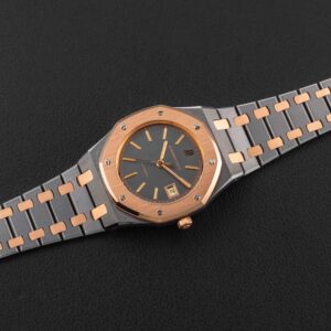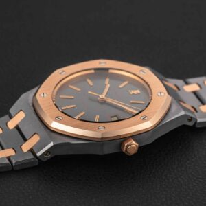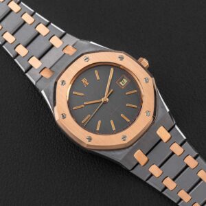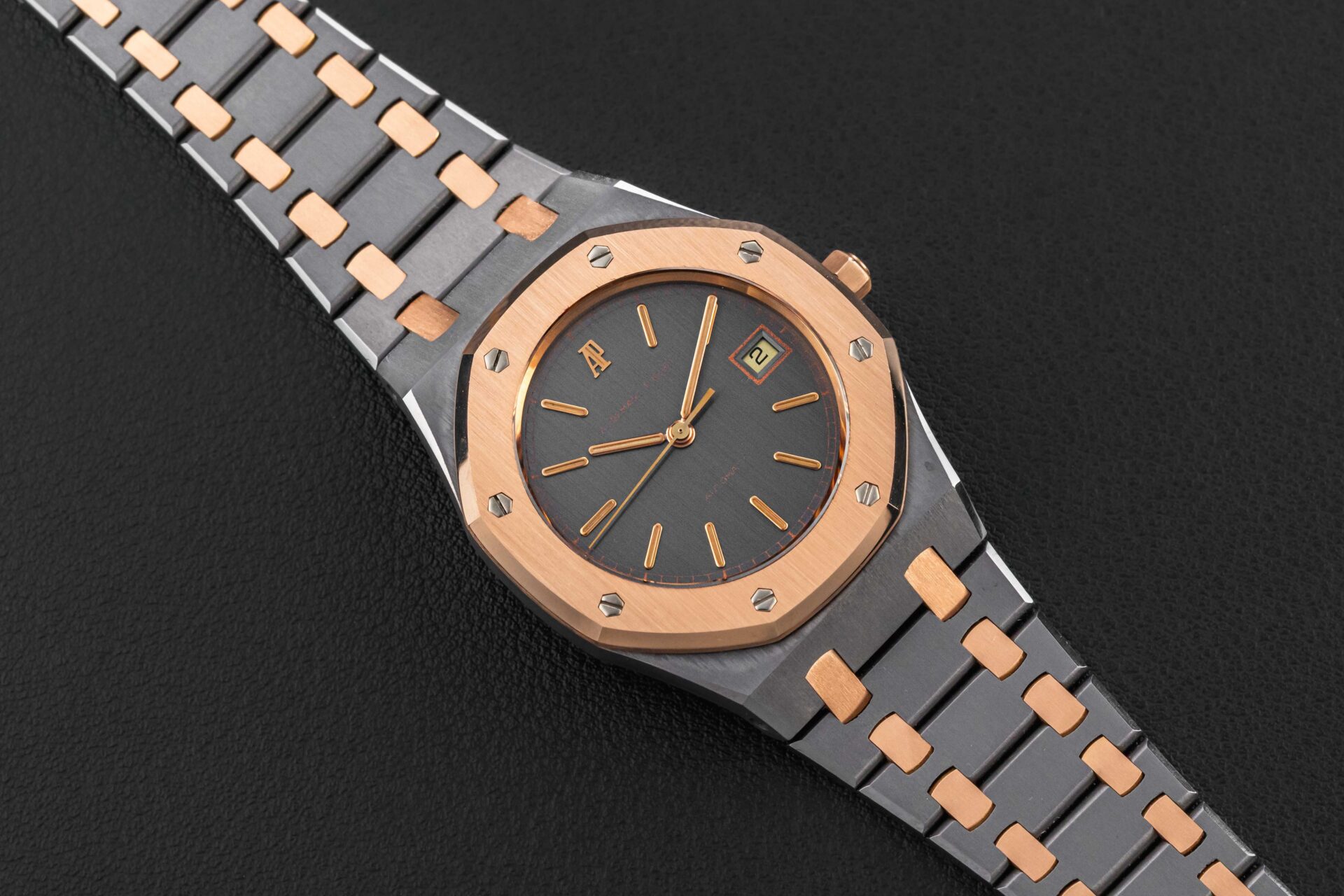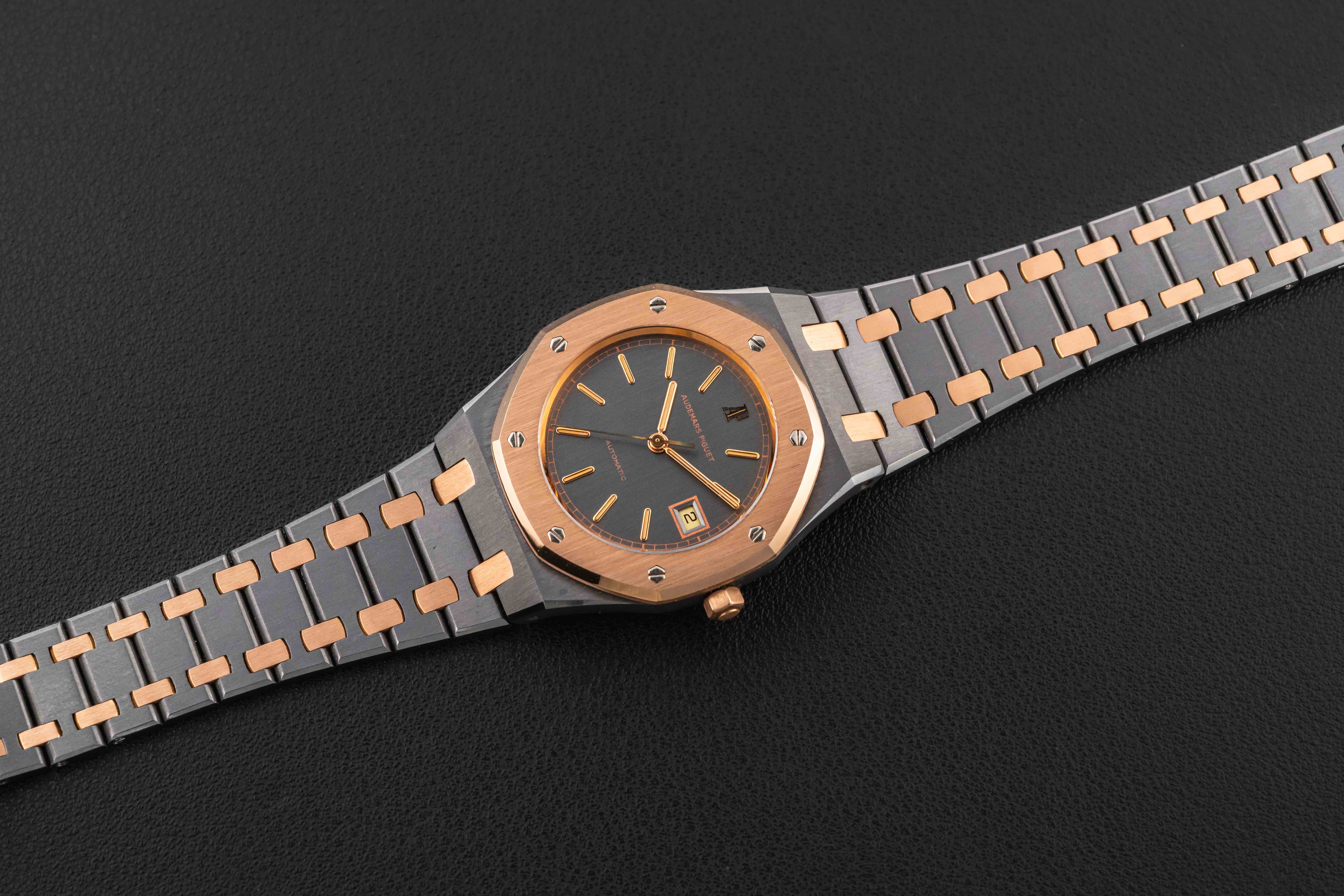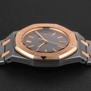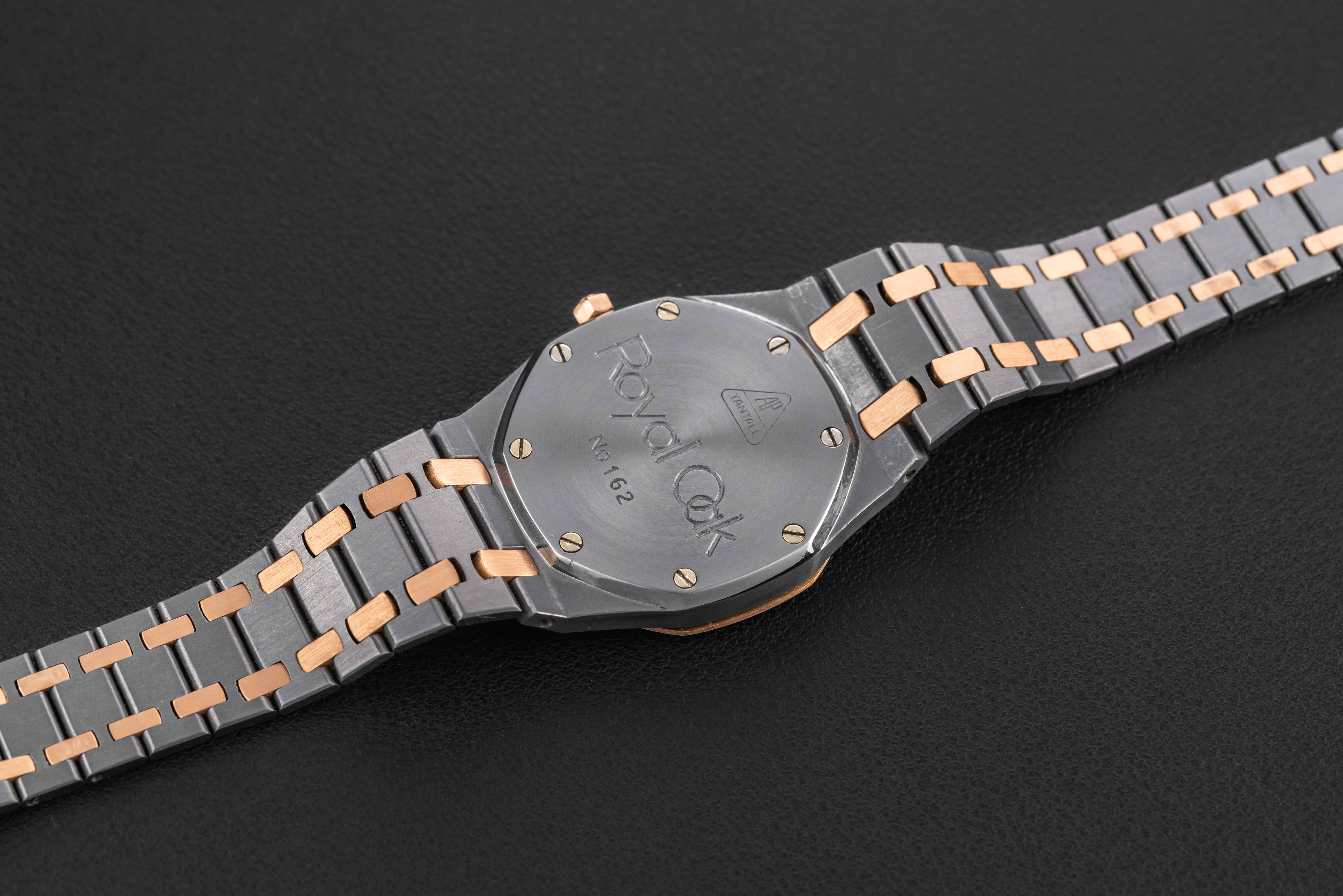 Up for grabs is a very rare and transitional Audemars Piguet Royal Oak, Reference 14486TR, produced for a very short time in the 1980s. This reference is transitional between the reference 4100 and the 14790, and retains the vintage look and fonts of the 4100, but with an upgraded movement that would carry over in to the reference 14790. Further, this particular example was housed in one of our favorite (and rarest) metal combinations: tantalum and rose gold!