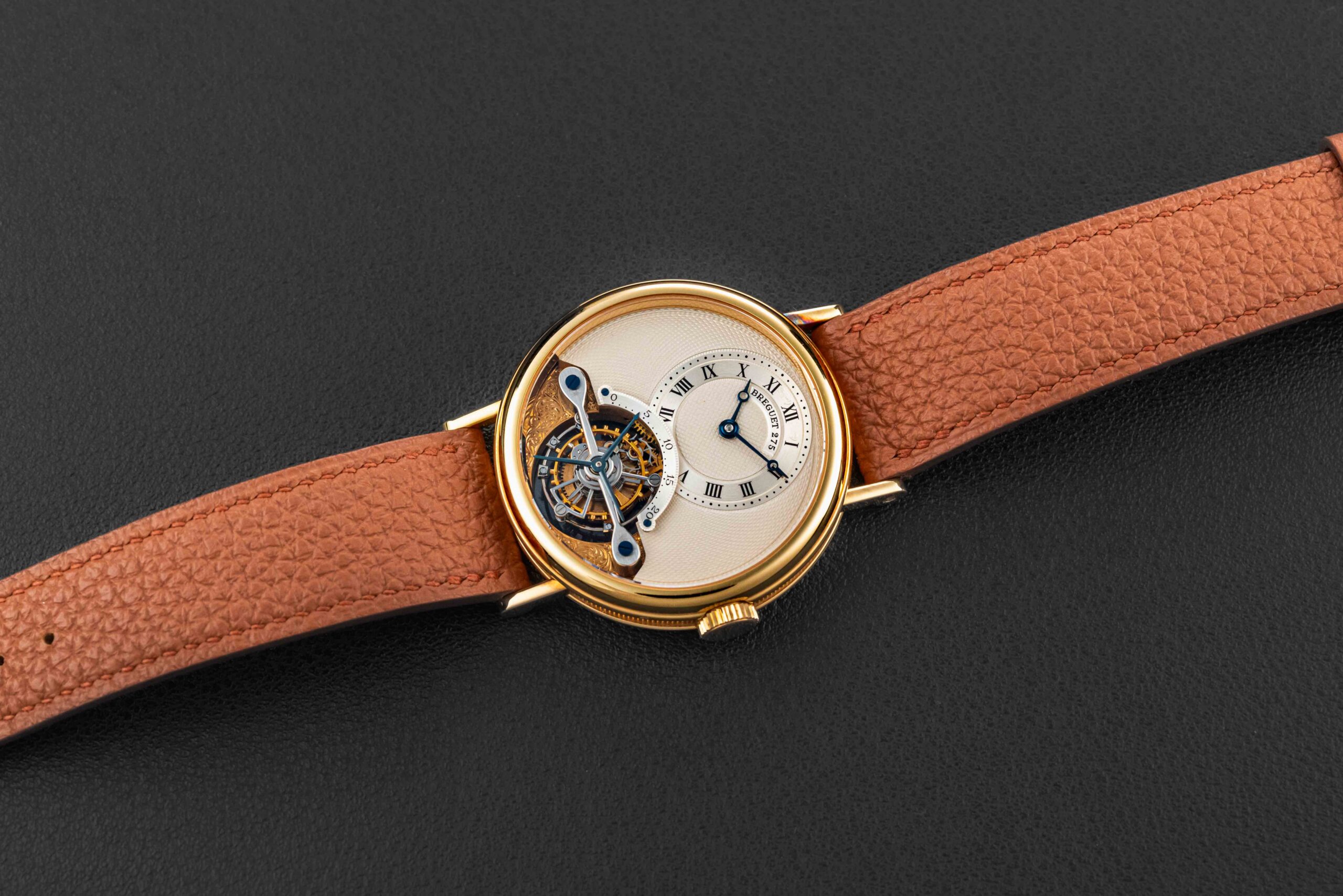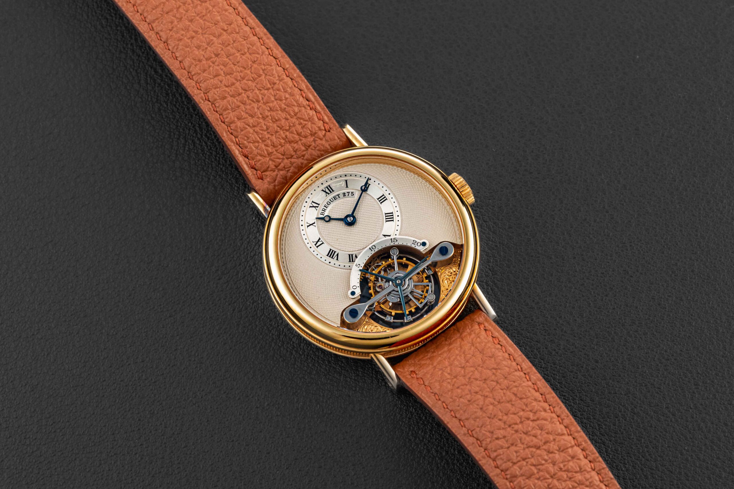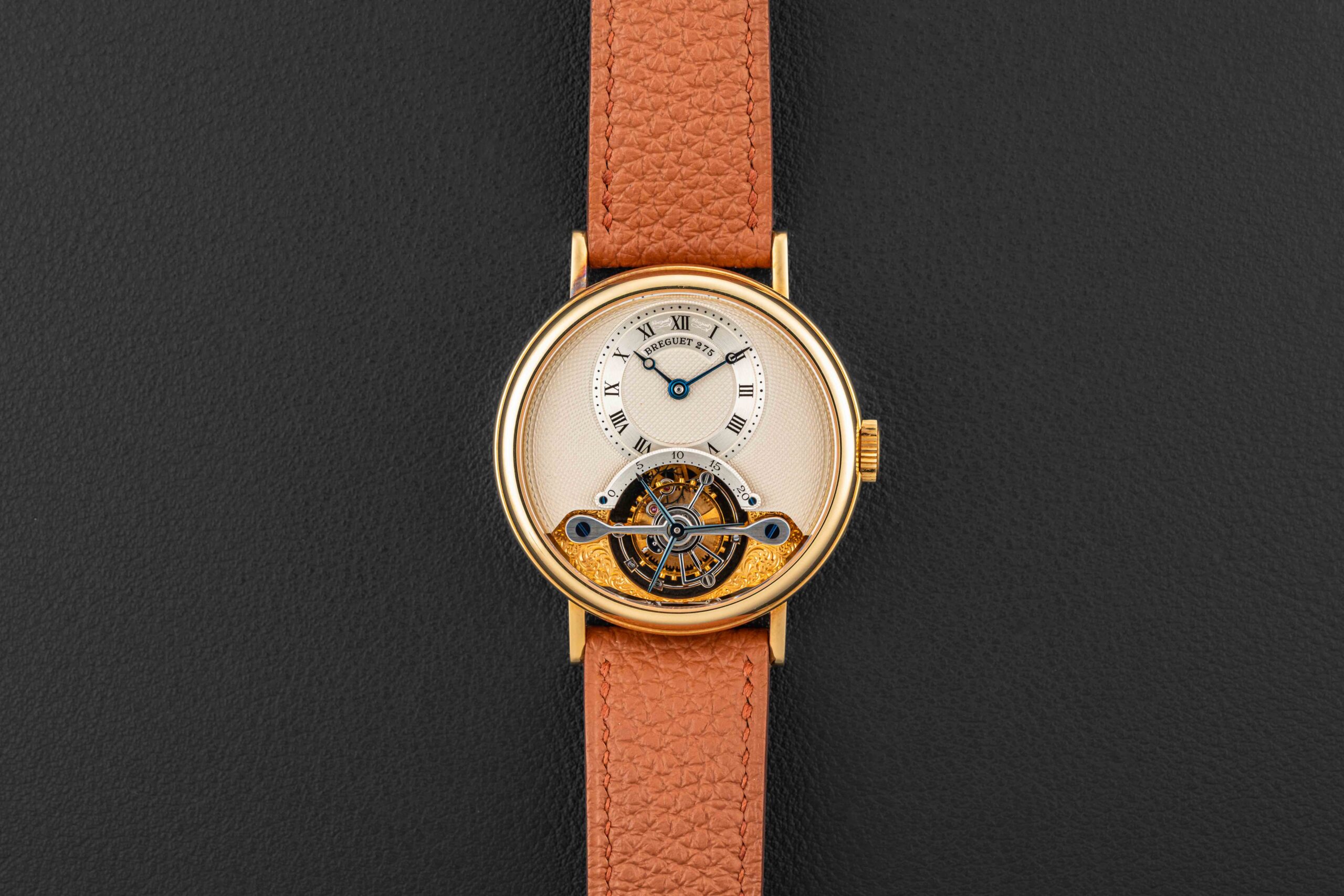 The condition of this Breguet Classique Tourbillon is excellent, with an unpolished case, devoid of any major wear. The dial is likewise absent any flaws. Further, the watch retains its original gold Breguet tang buckle.