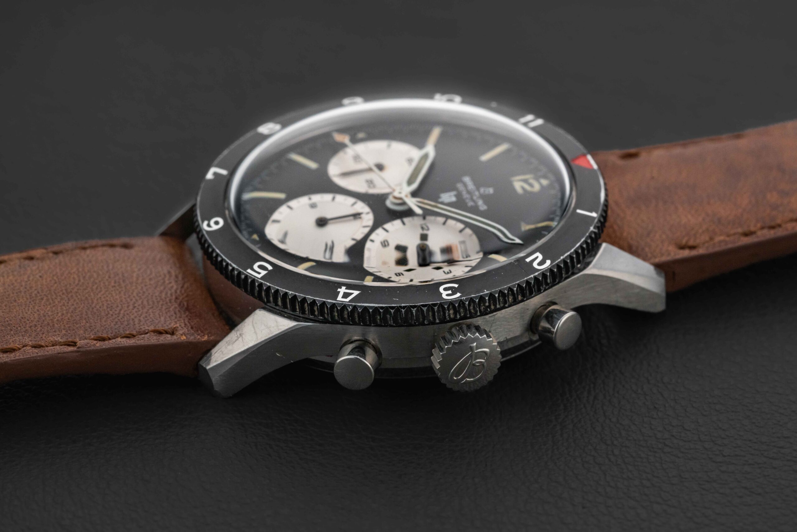 This Breitling Co-Pilot is in excellent vintage condition. The case is unpolished and very sharp, with original beveled edges. The dial is in perfect condition, with no wear or damage. Likewise, the original tritium lume is present on both dial and hands, aged to a light yellow hue on the dial, and a darker color in the hands.