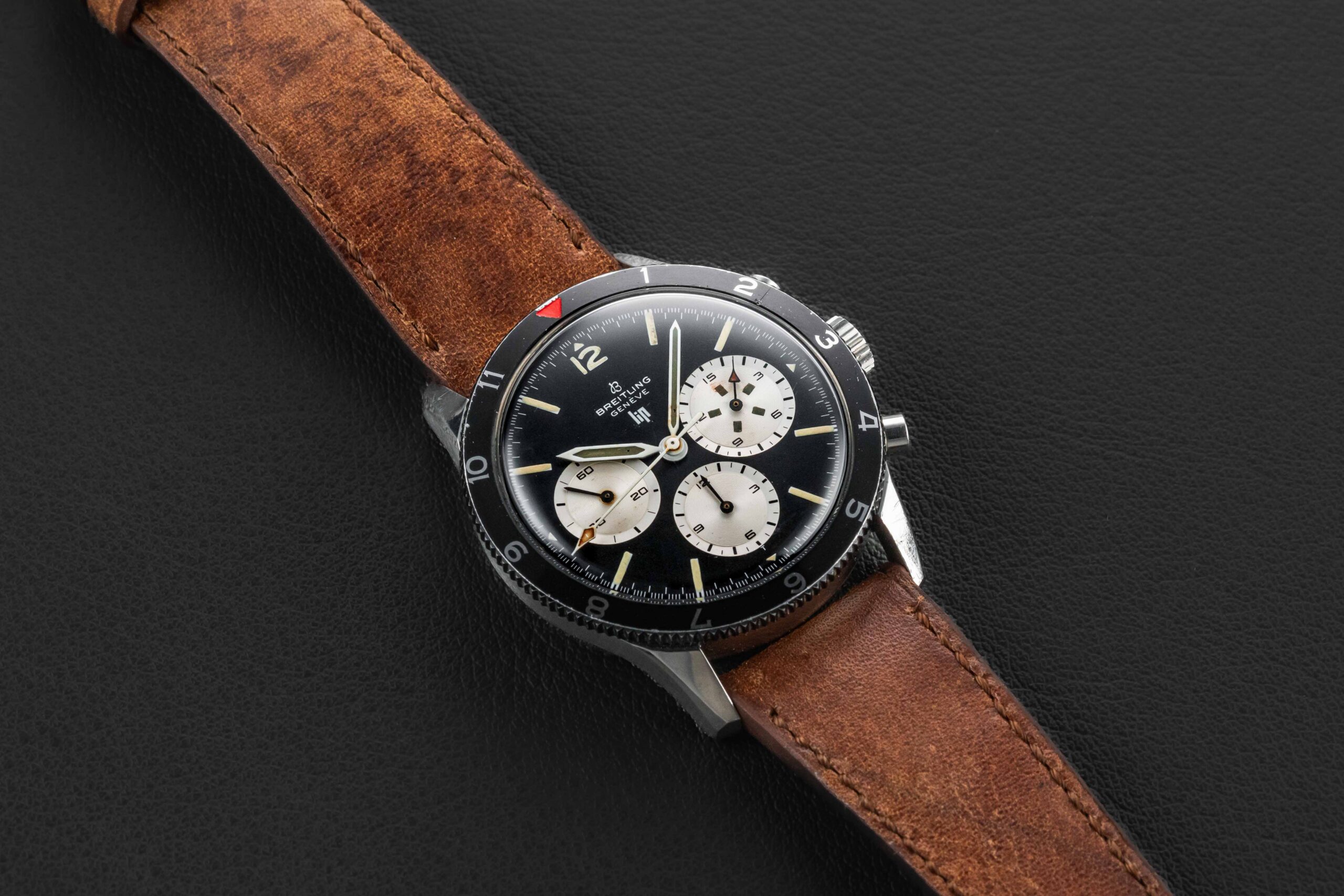 Offered here is a rare Breitling Co-Pilot chronograph, nicknamed the “Jean Claude Killy”, as the famous skiier was known to where this exact model when he won the gold in all three Alpine skiing events at the 1968 Olympics in Grenoble. These watches, intended for use by pilots, were considered extremely large for the era, and have become a staple in the Breitling collector’s arsenal. Additionally, the present example stands out due to the fact that it has been co-signed by the French manufacturer, LIP, for retail specifically by them in the 1960s.