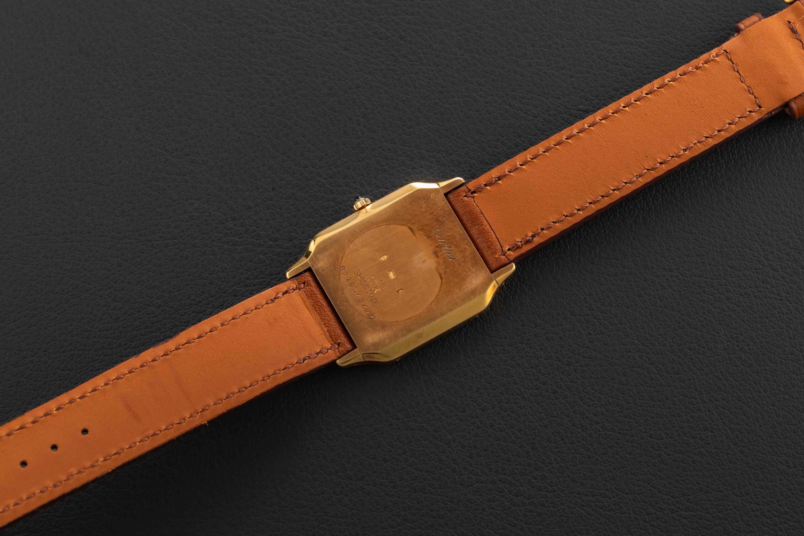 This Cartier Santos Dumont is in great vintage condition. The case does not appear polished, albeit worn from use, with clearly defined bevels. The dial is perfect, with no flaws. The watch is fitted on a an aftermarket brown leather strap, but the original Cartier black leather strap and matching gold Cartier tang buckle is included.