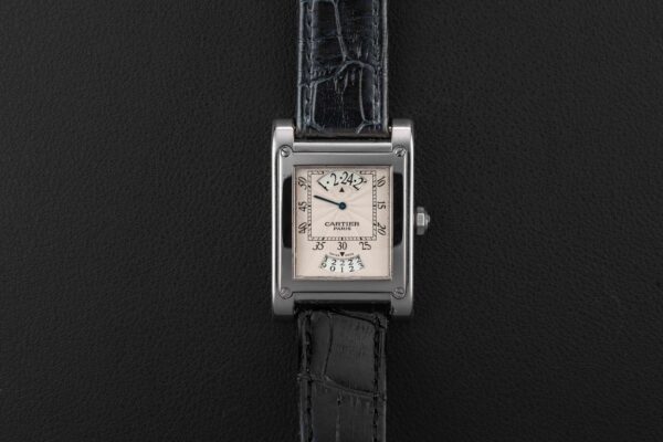 Offered here is a rare Cartier “Tank a Vis” from their CPCP Collection Privee line, given the moniker of the “Wandering Hour” due to its jump-hour complication. This particular example was given the reference number 2554, and produced in 18kt white gold. Produced circa 2000, this limited watch has a very unique layout, with the hour of day displayed through a window at the top, and minute hand rotating around the guilloche dial; at the bottom of the dial is a date window. This Cartier Tank a Vis is in good pre-owned condition, with no major wear or marks to the case; the leather strap is generic, but remains with its original Cartier deployant buckle.