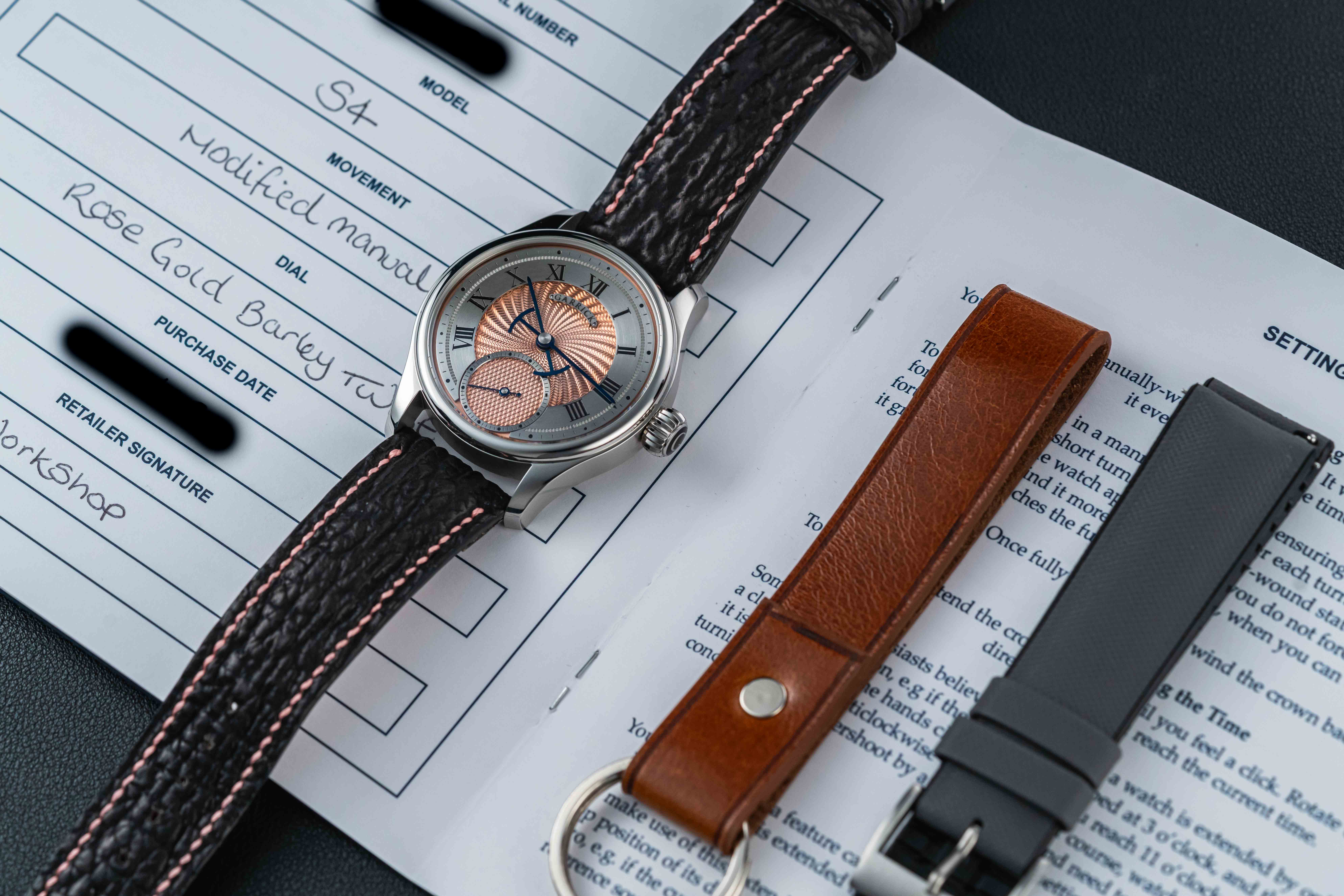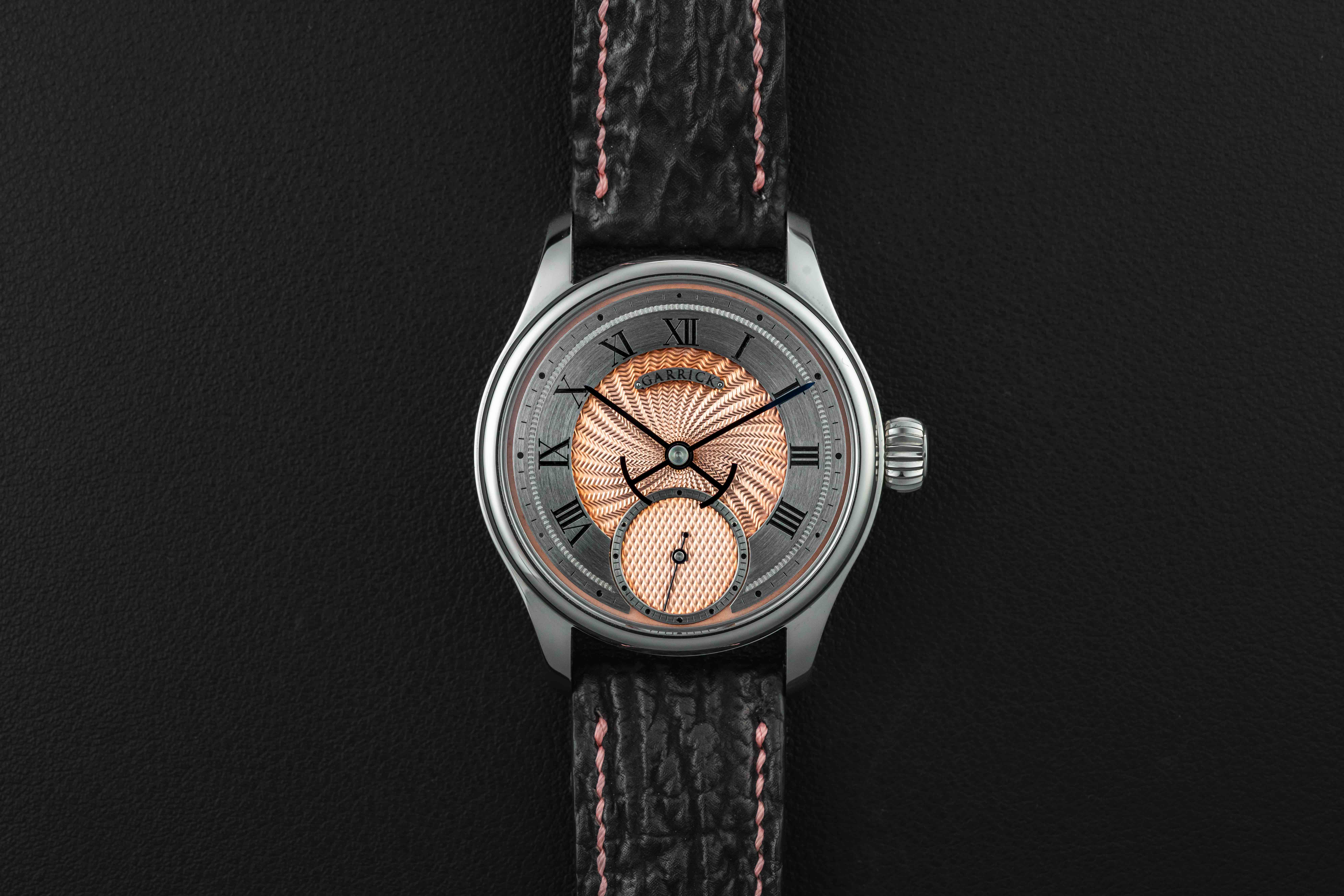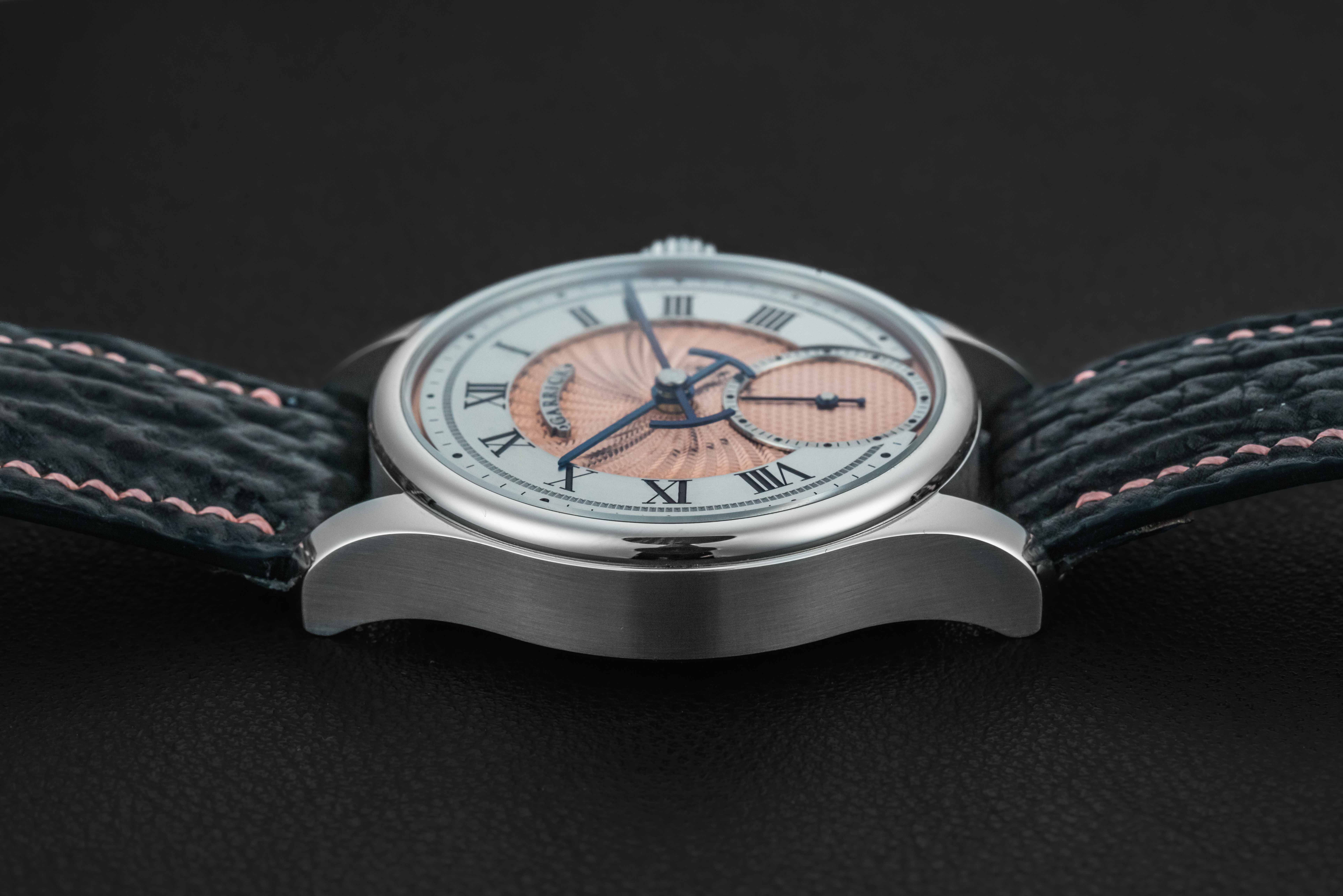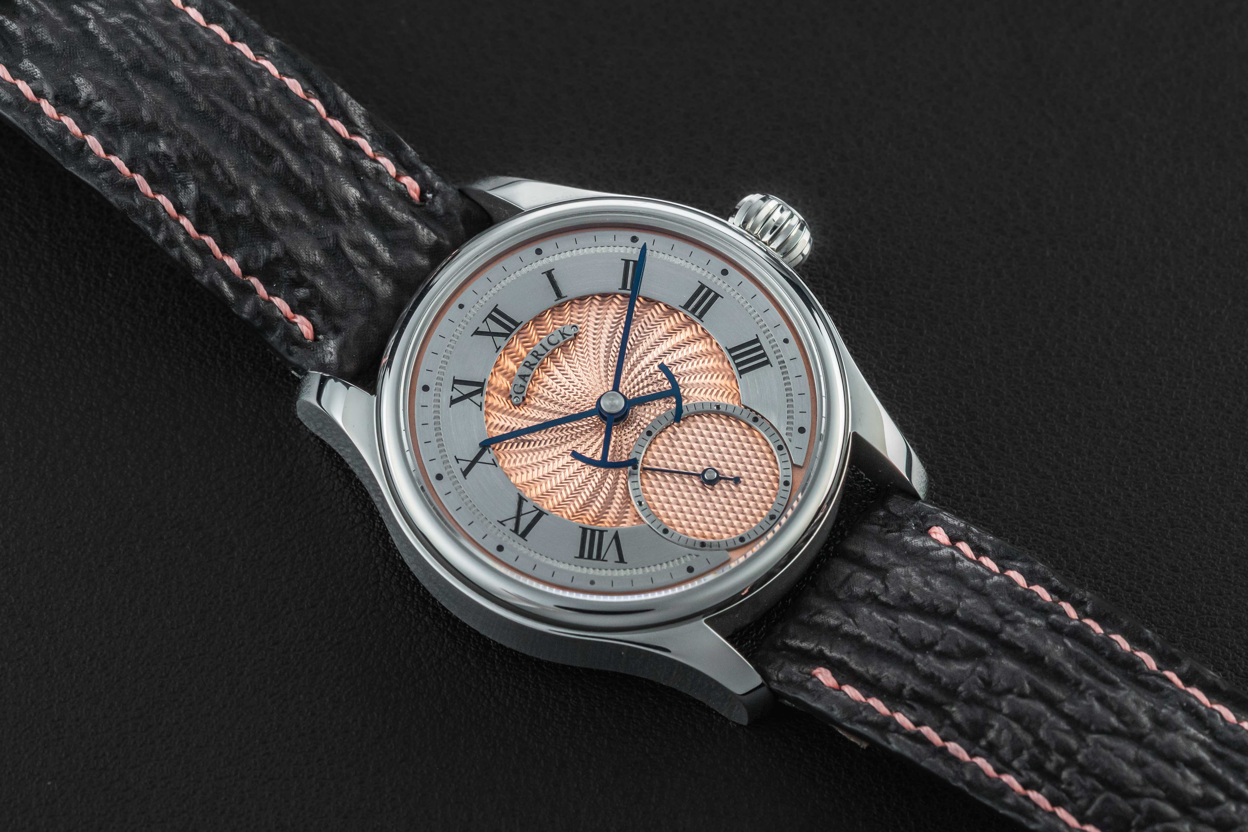 Offered here is a very rare and beautiful watch from the British independent outfit, Garrick. The S4 is a continuation in the S line, beautifully hand-crafted with a stunning engine-turned guilloche salmon dial. These watches are extremely desirable, and sell out upon release; and the S4 line is now discontinued. The watch is sold in like new condition, and complete with its original box and all accompanying paperwork/warranty card.