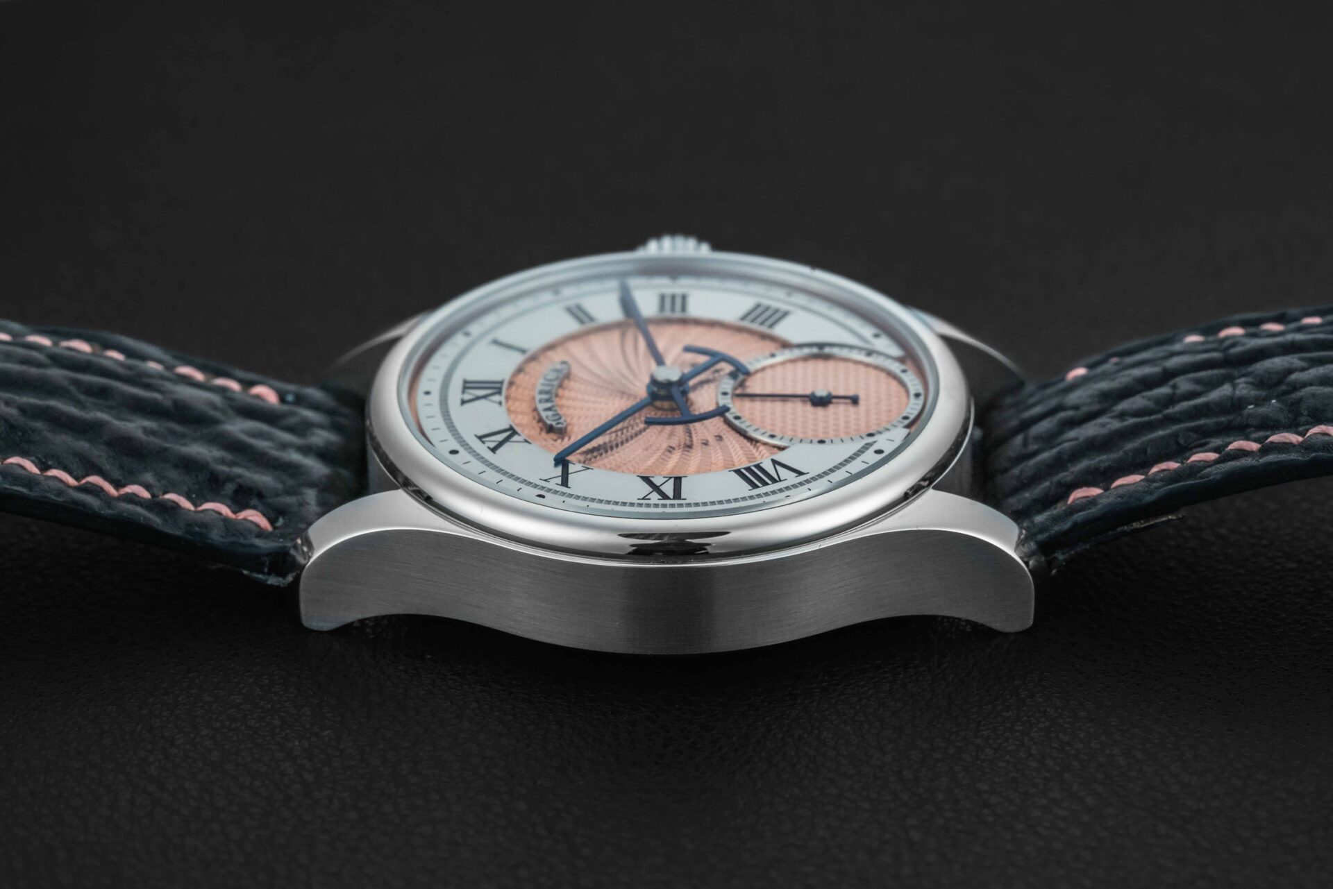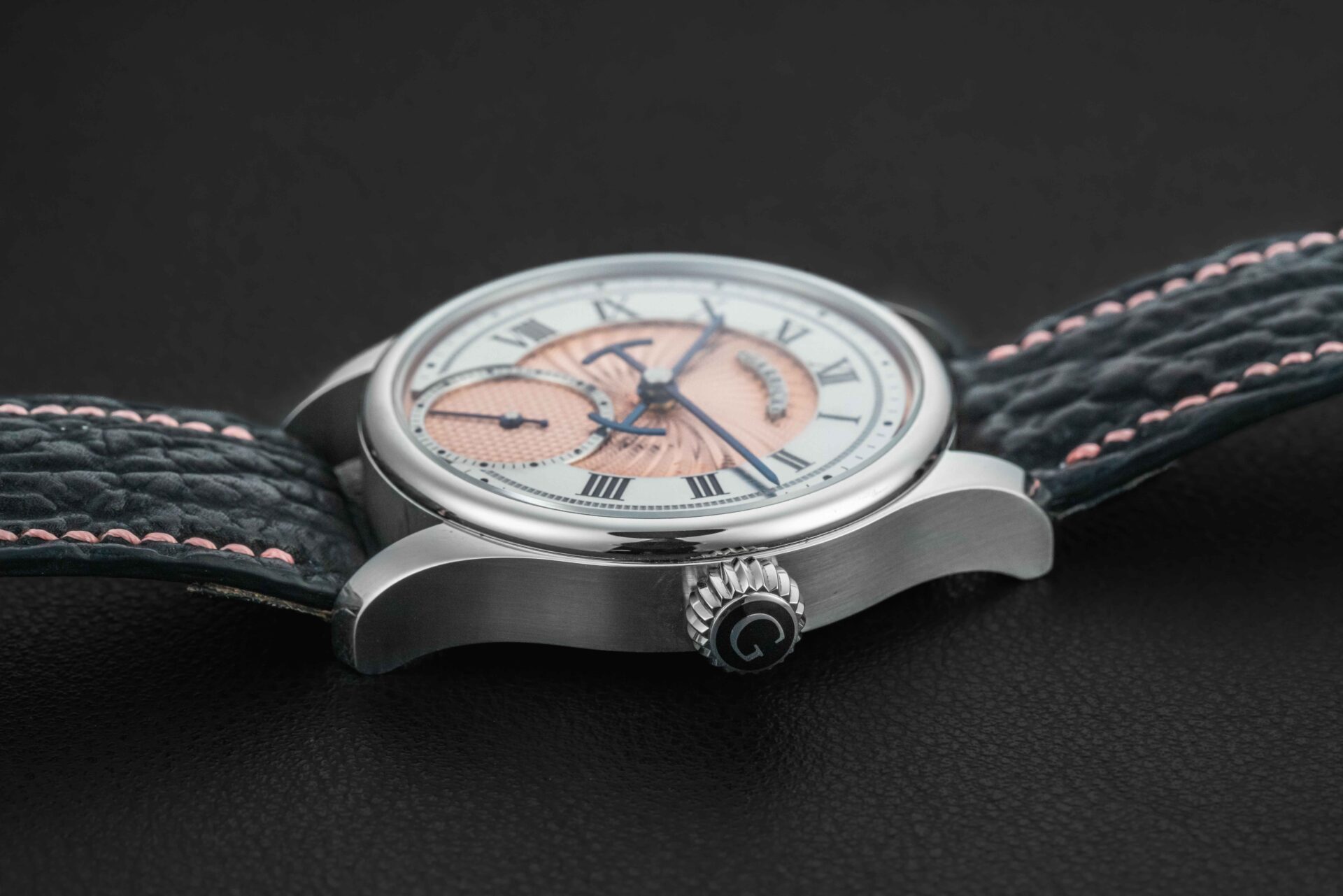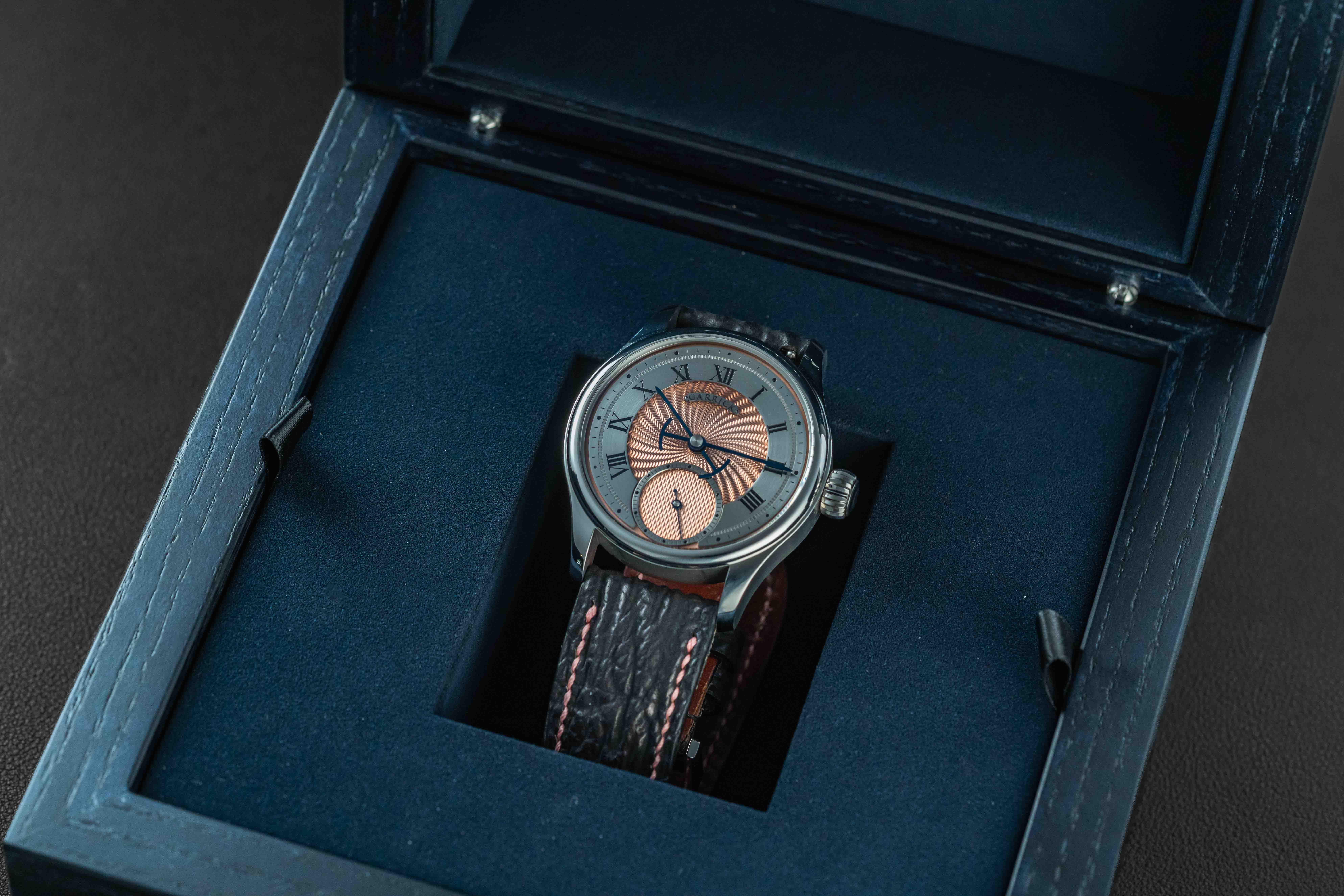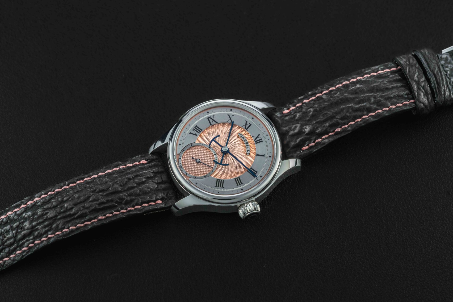 Offered here is a very rare and beautiful watch from the British independent outfit, Garrick. The S4 is a continuation in the S line, beautifully hand-crafted with a stunning engine-turned guilloche salmon dial. These watches are extremely desirable, and sell out upon release; and the S4 line is now discontinued. The watch is sold in like new condition, and complete with its original box and all accompanying paperwork/warranty card.
