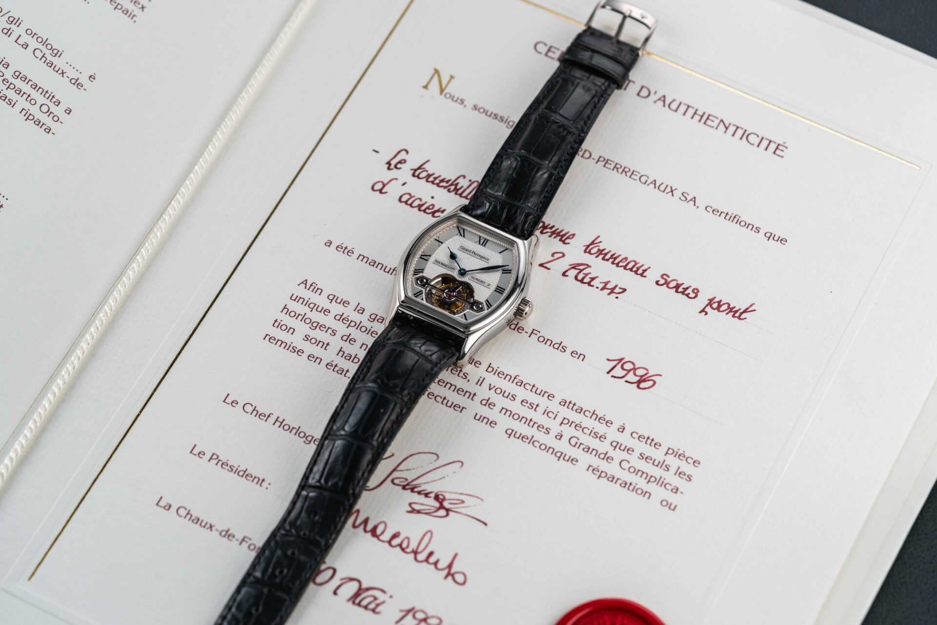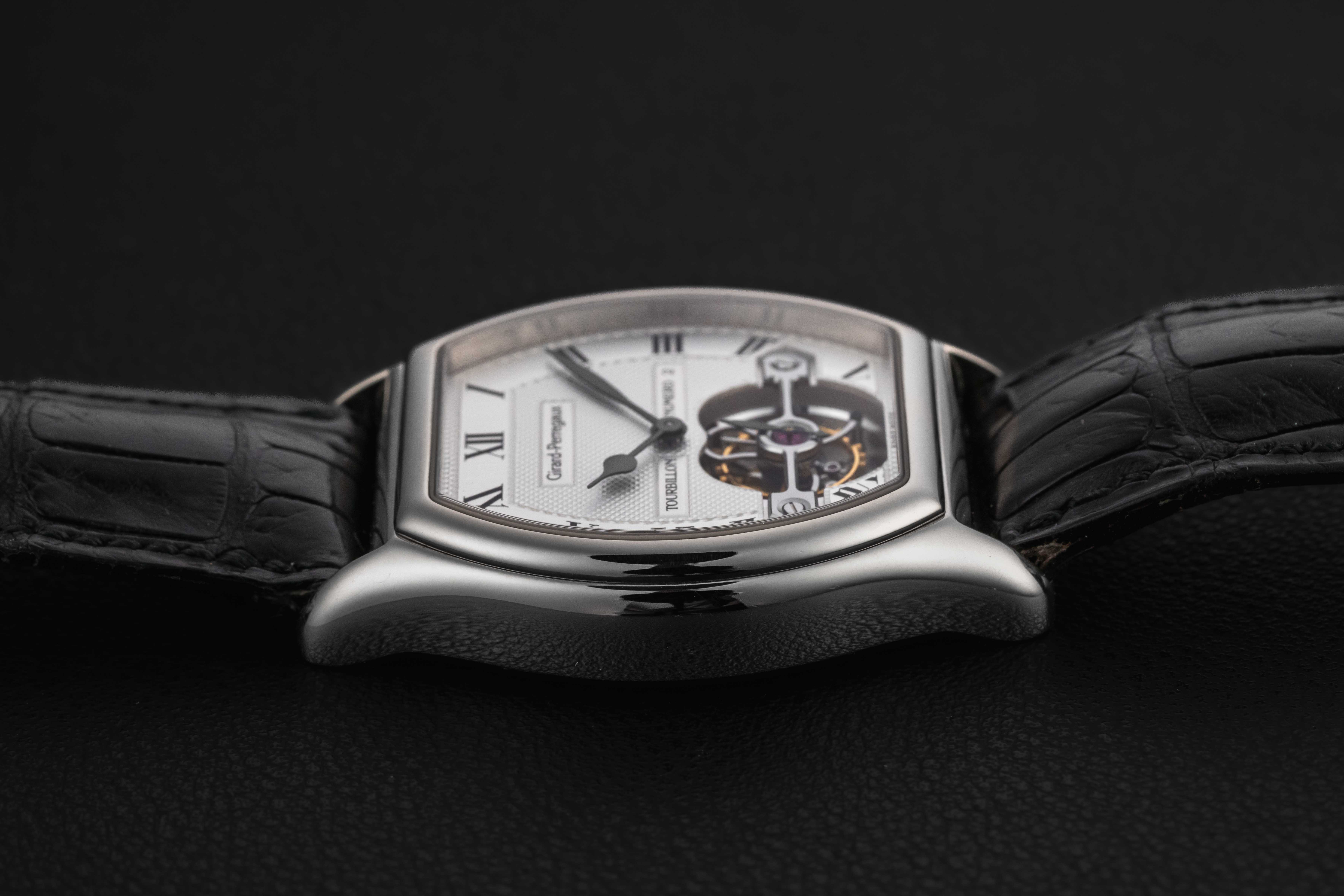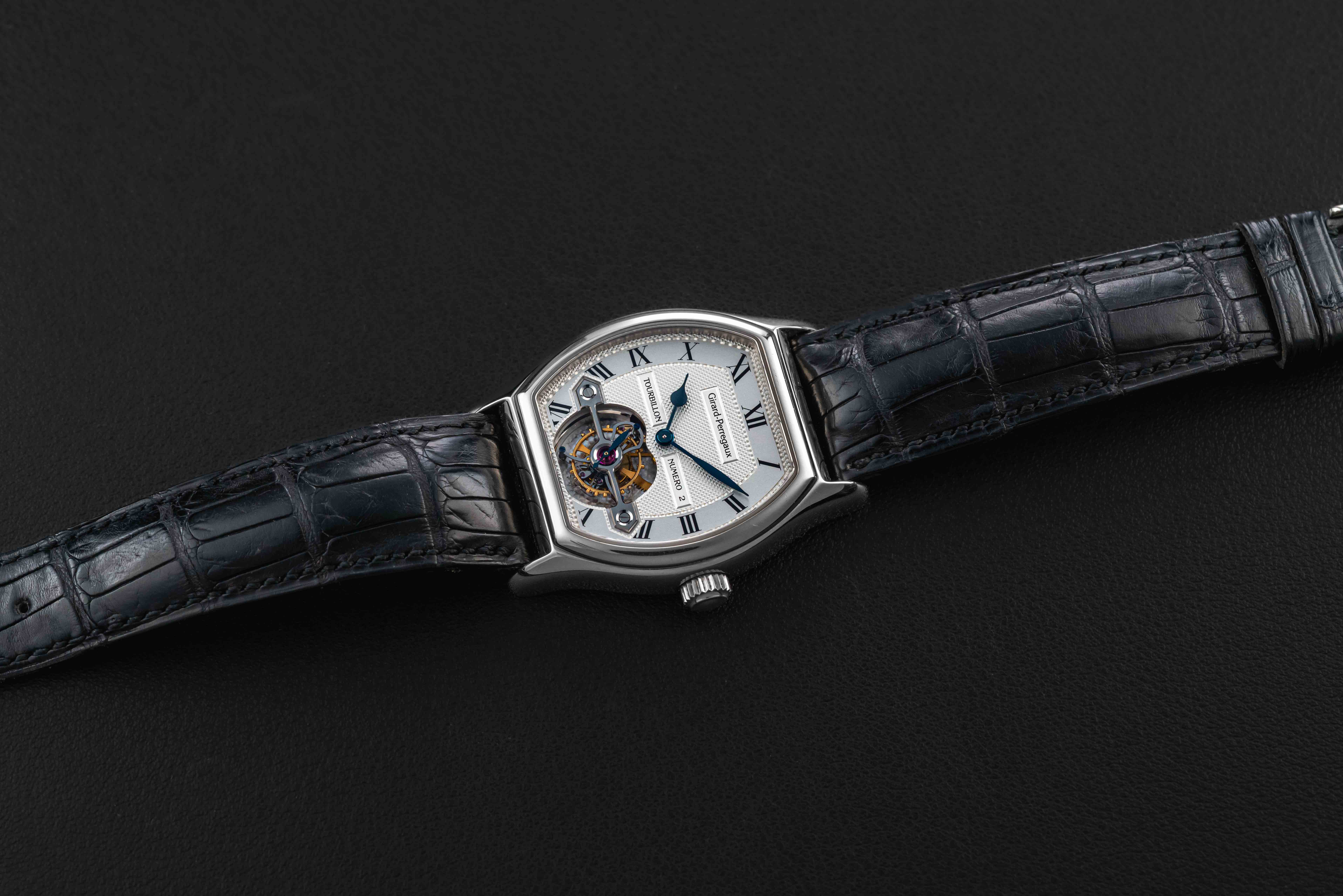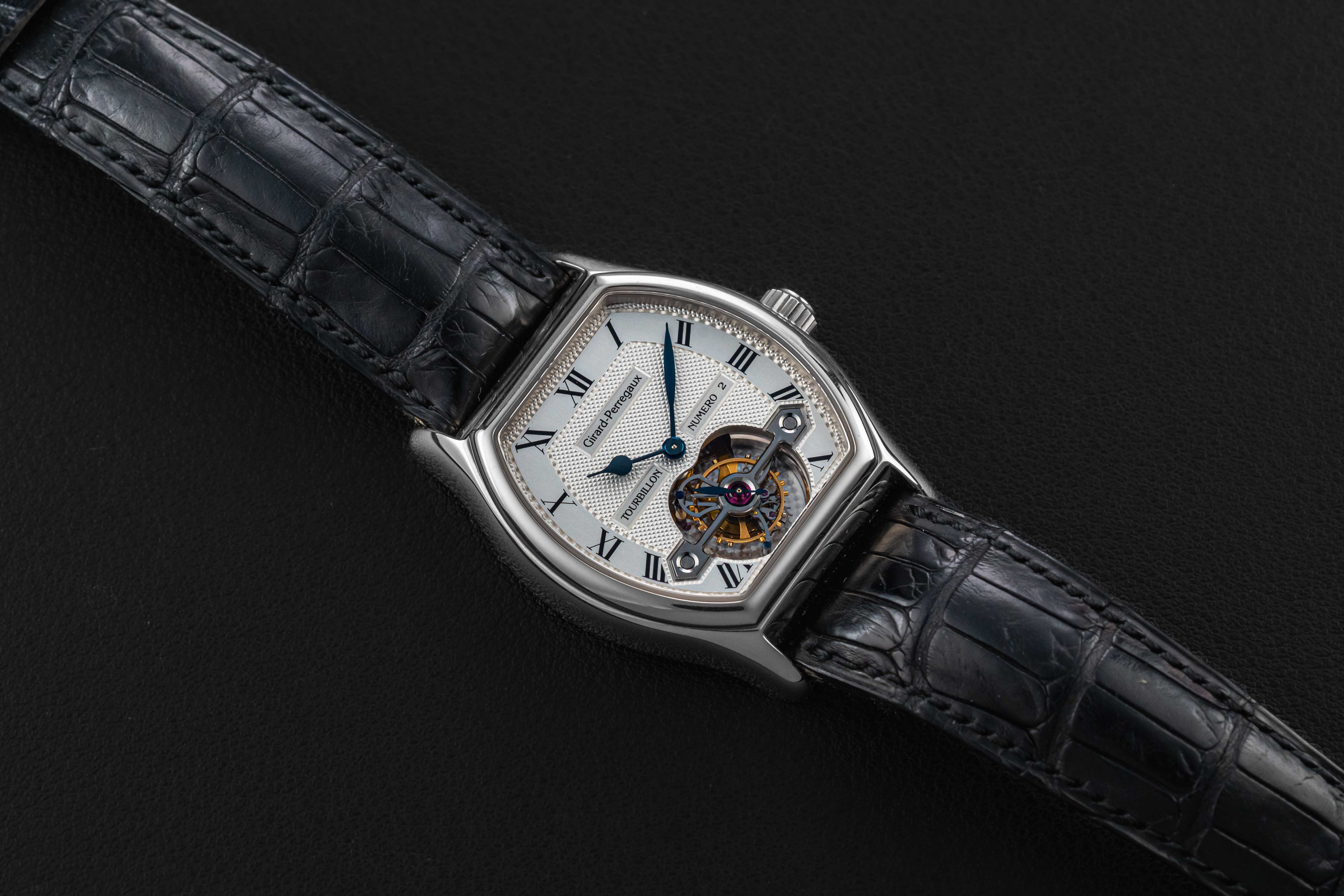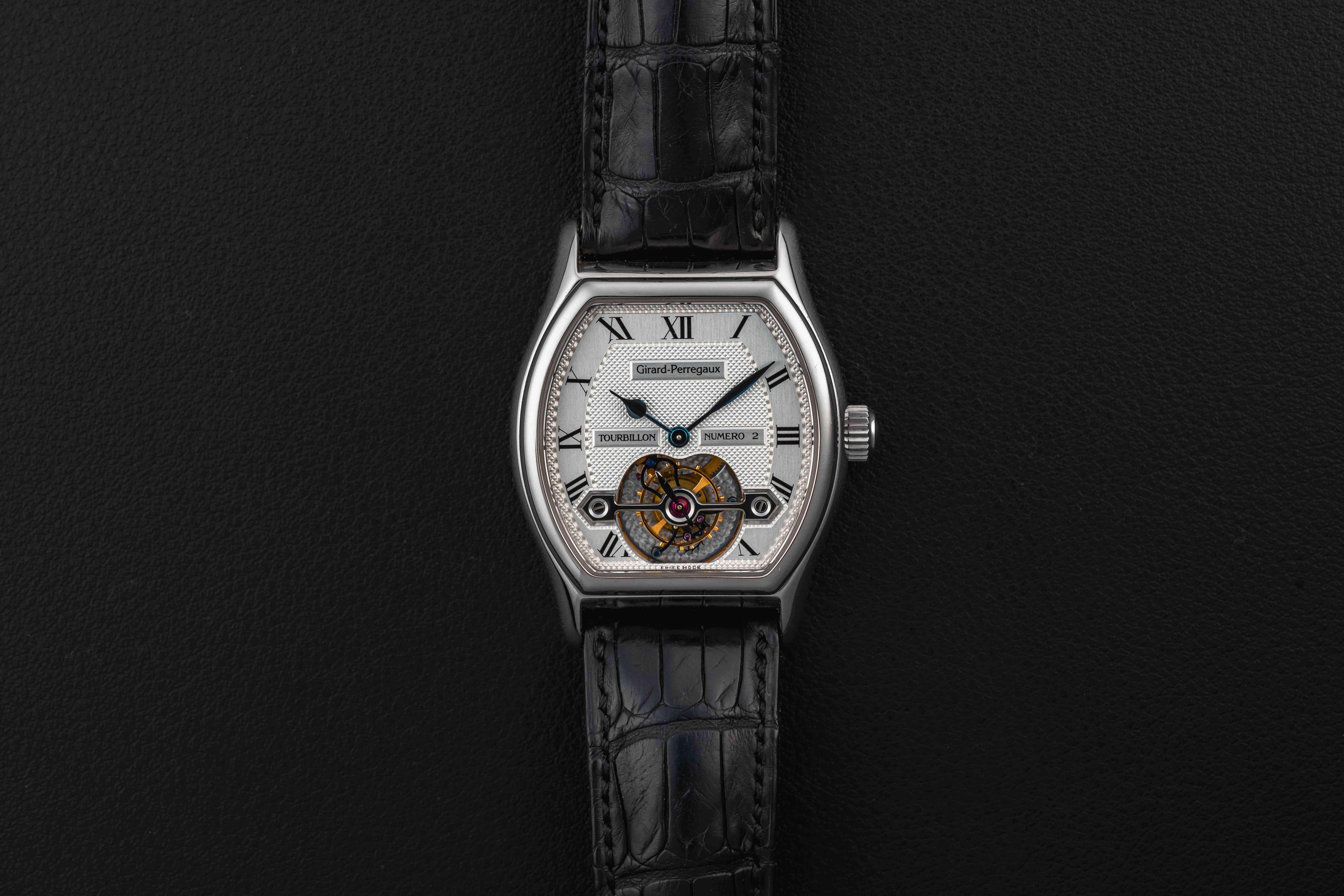 Up for grabs is a stunning tonneau-shaped tourbillon from Girard Perregaux. Girard Perregaux has been producing watches since 1791, and is well-regarded specifically for their tourbillon models. This particular model, the reference 9930, was produced in a very small quantity in the 1990s, and this particular example was housed in 18kt white gold. Further, this example comes with its original Certificate of Authenticity, showing the original sale in May of 1996. The watch itself remains in great condition, showing light wear over the years, and retains its original Girard Perregaux black leather strap and matching GP white gold tang buckle.
