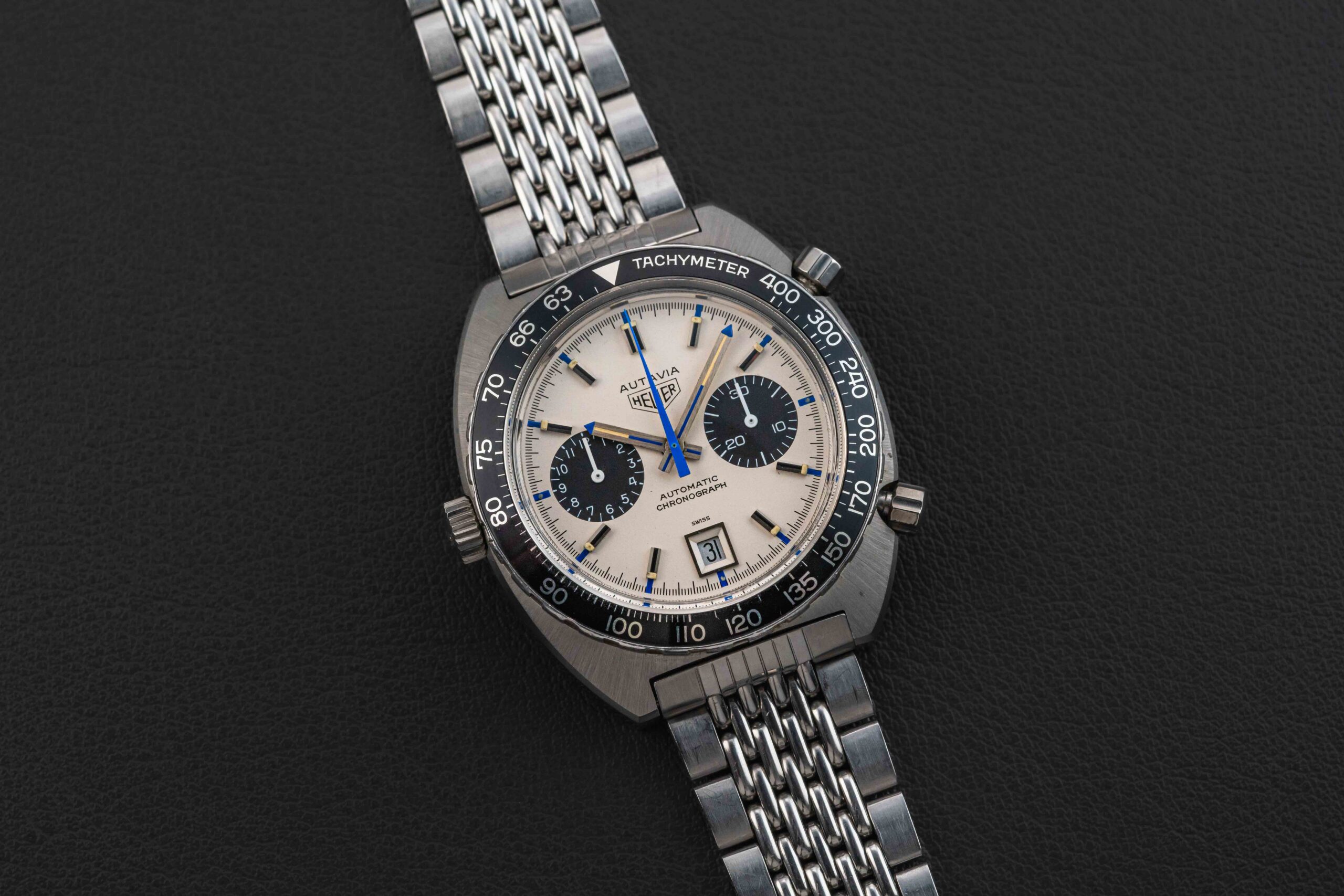 Offered here is an excellent example of a Heuer Autavia, nicknamed the “Jo Siffert”, as this model was worn by the famous race car driver in the 1970s. This example is a “Mark 6”, the final execution made by Heuer with this color scheme. For more information on the Siffert Autavias, visit On The Dash by clicking here.