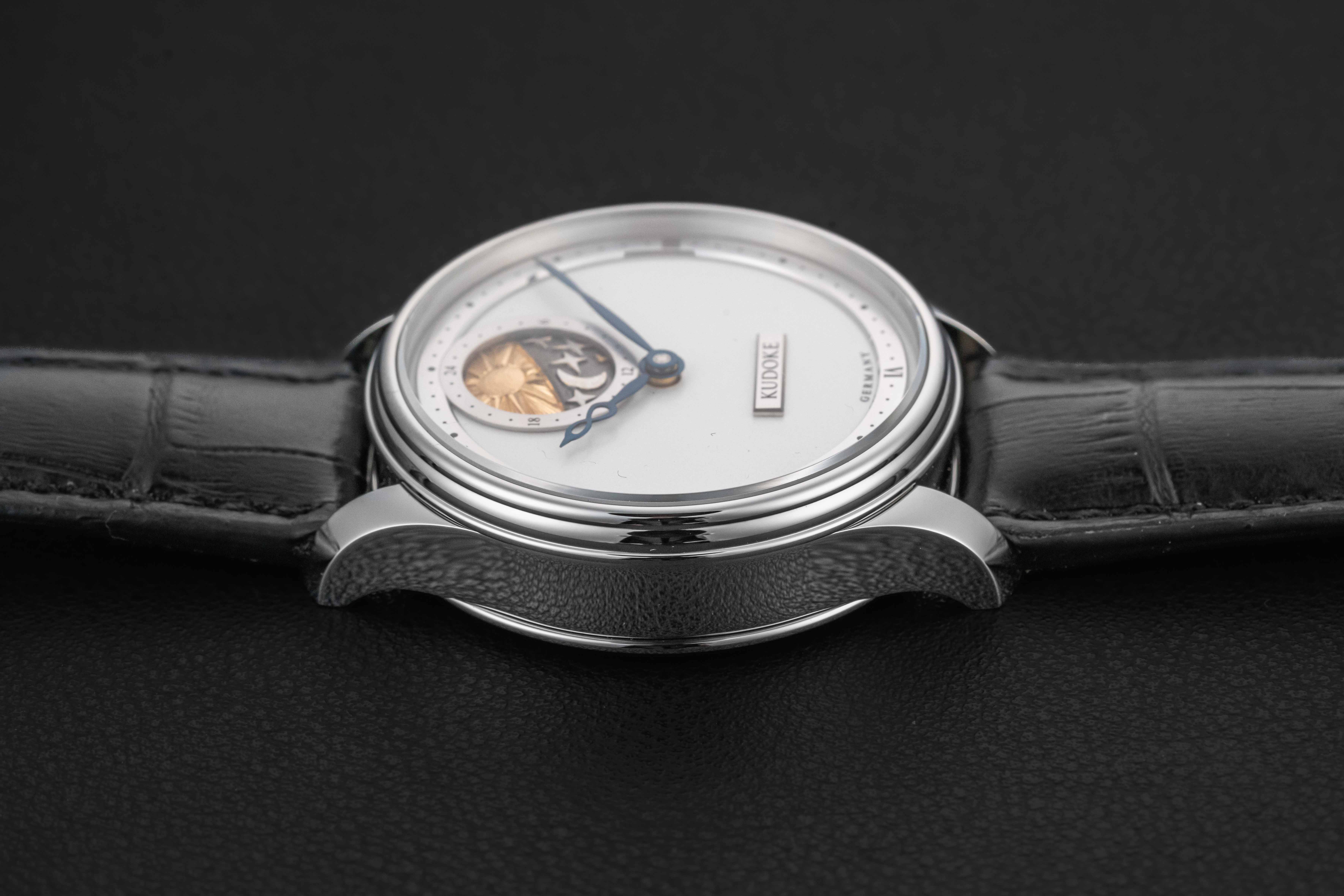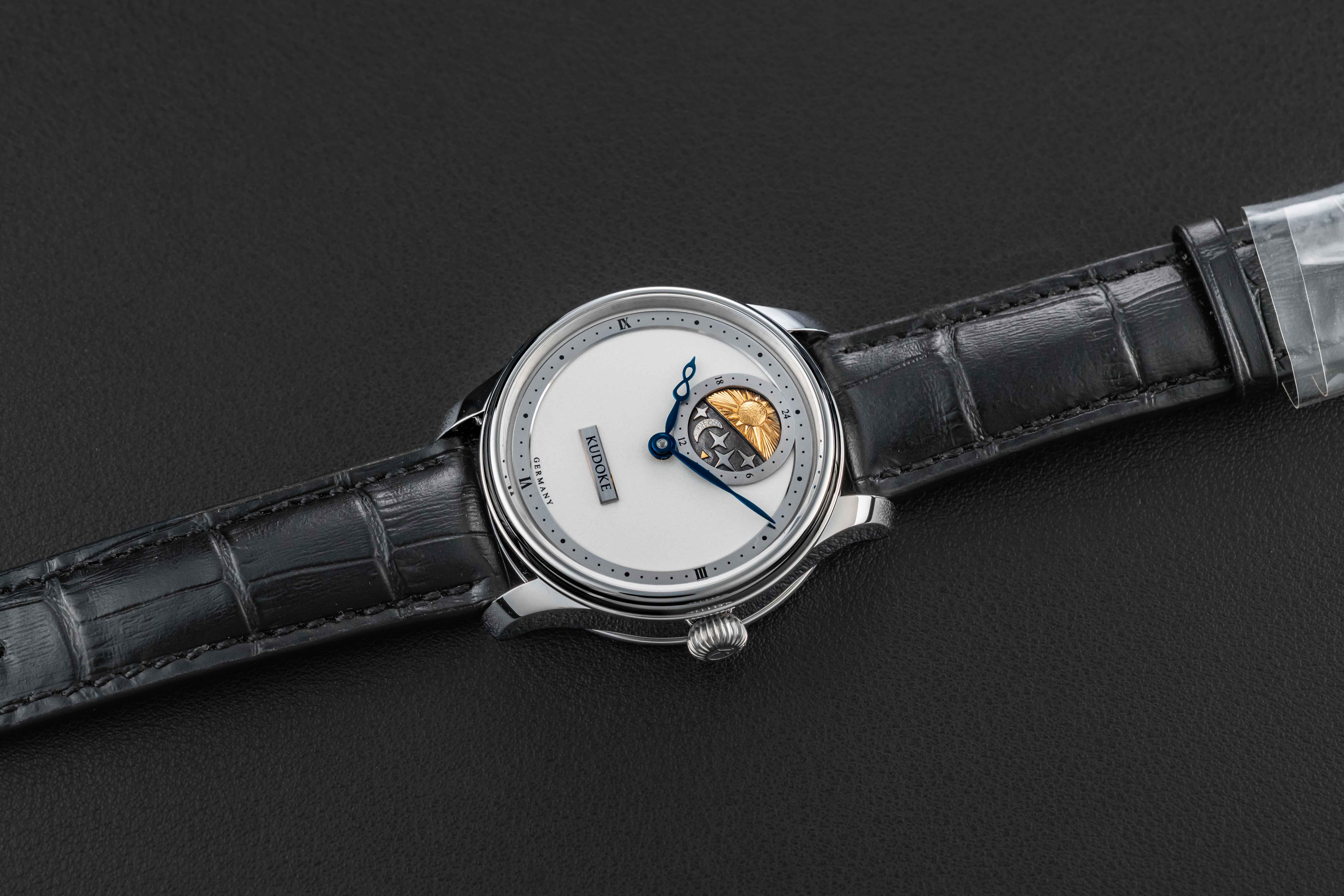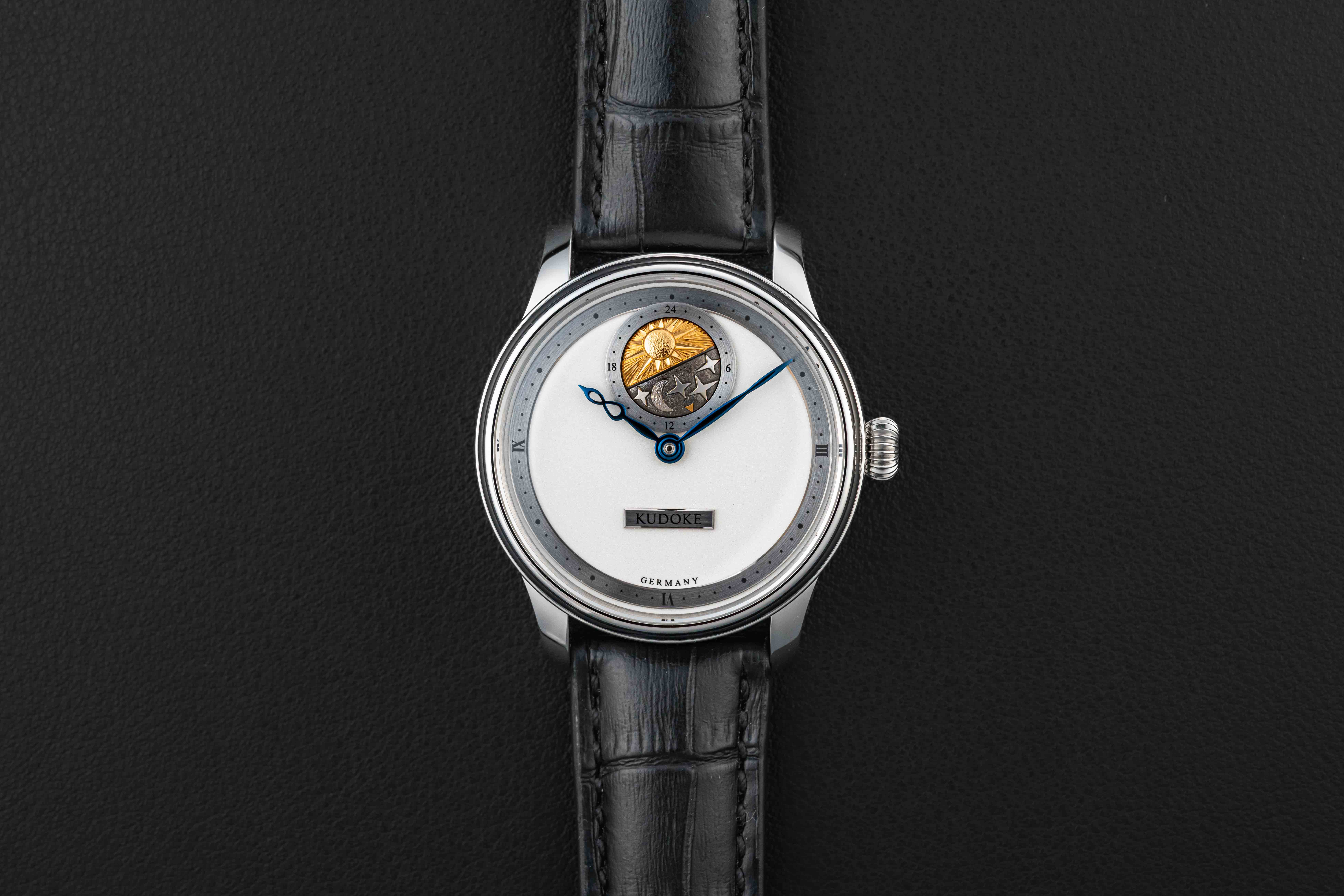 Offered here is a very rare and beautiful watch from the German independent outfit, Kudoke. The Kudoke 2 is a continuation of the first Kudoke 24-Hour model, beautifully hand-crafted with a stunning silver/white dial and day-date 24-hour indicator disk at 12 o’clock. These watches are extremely desirable, and sell out upon release; there is an alleged 12-month wait list just for the opportunity to be considered to purchase one. This Kudoke 2 remains unworn/new, and comes complete with its original Kudoke boxes and paperwork, as sold new.