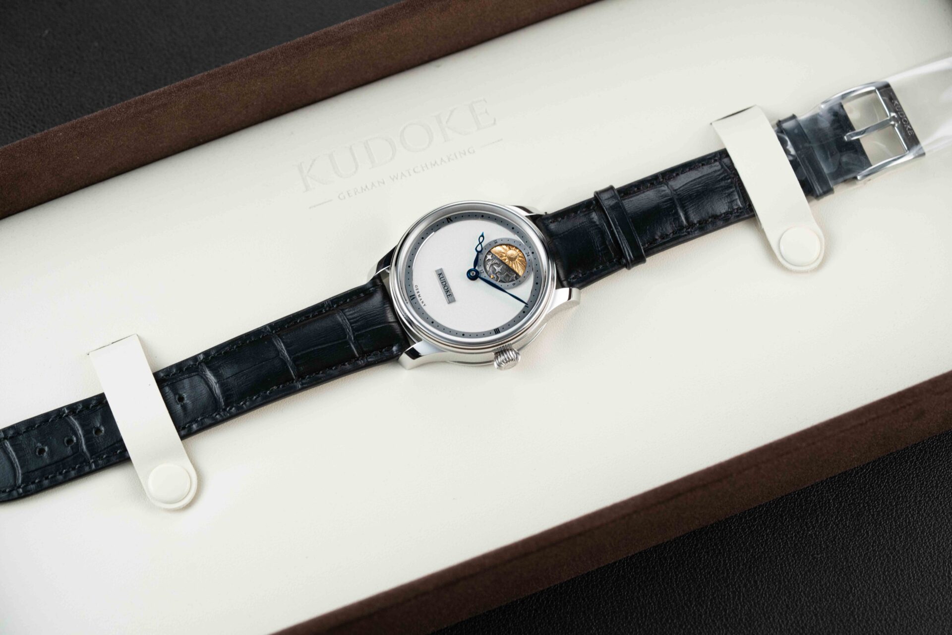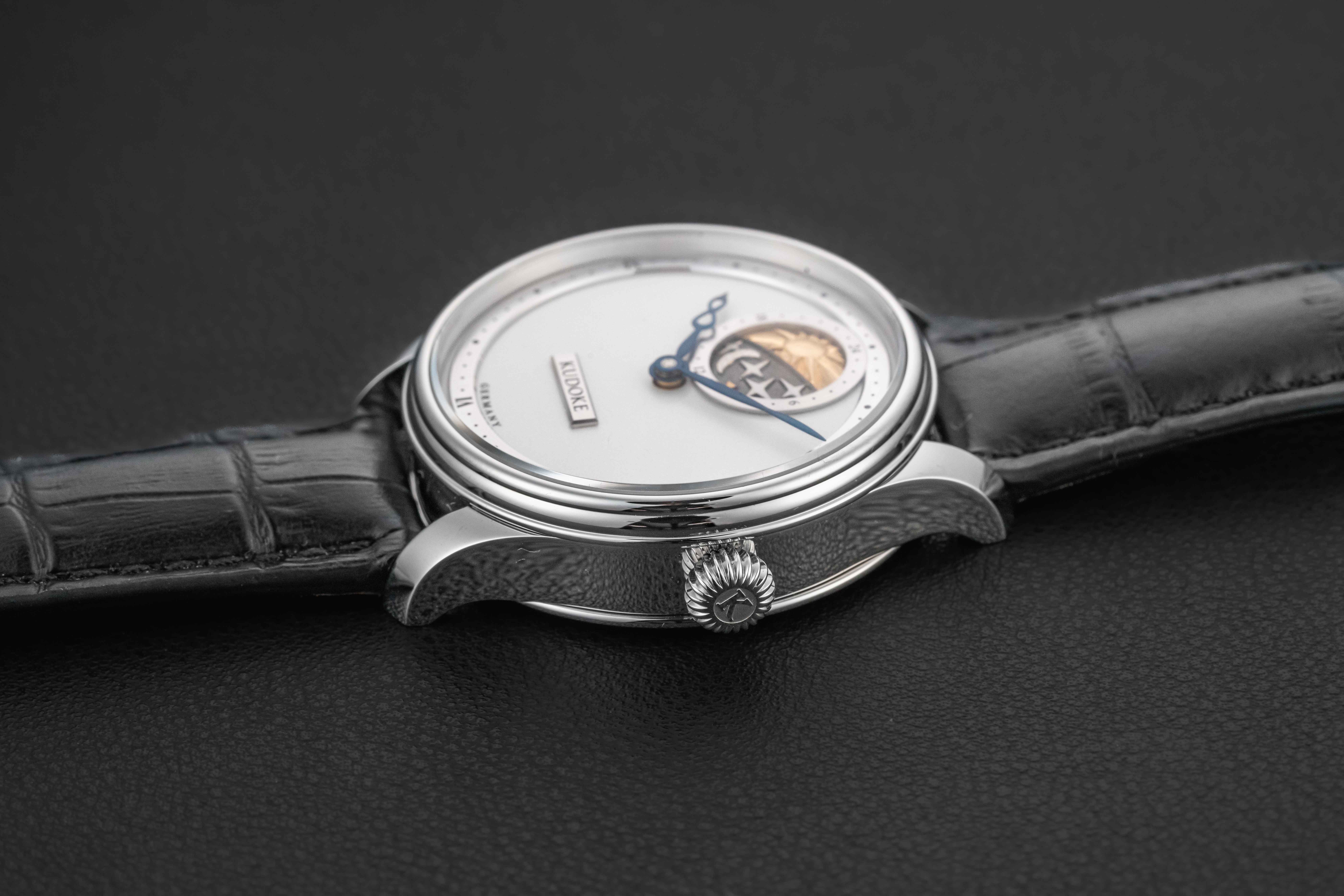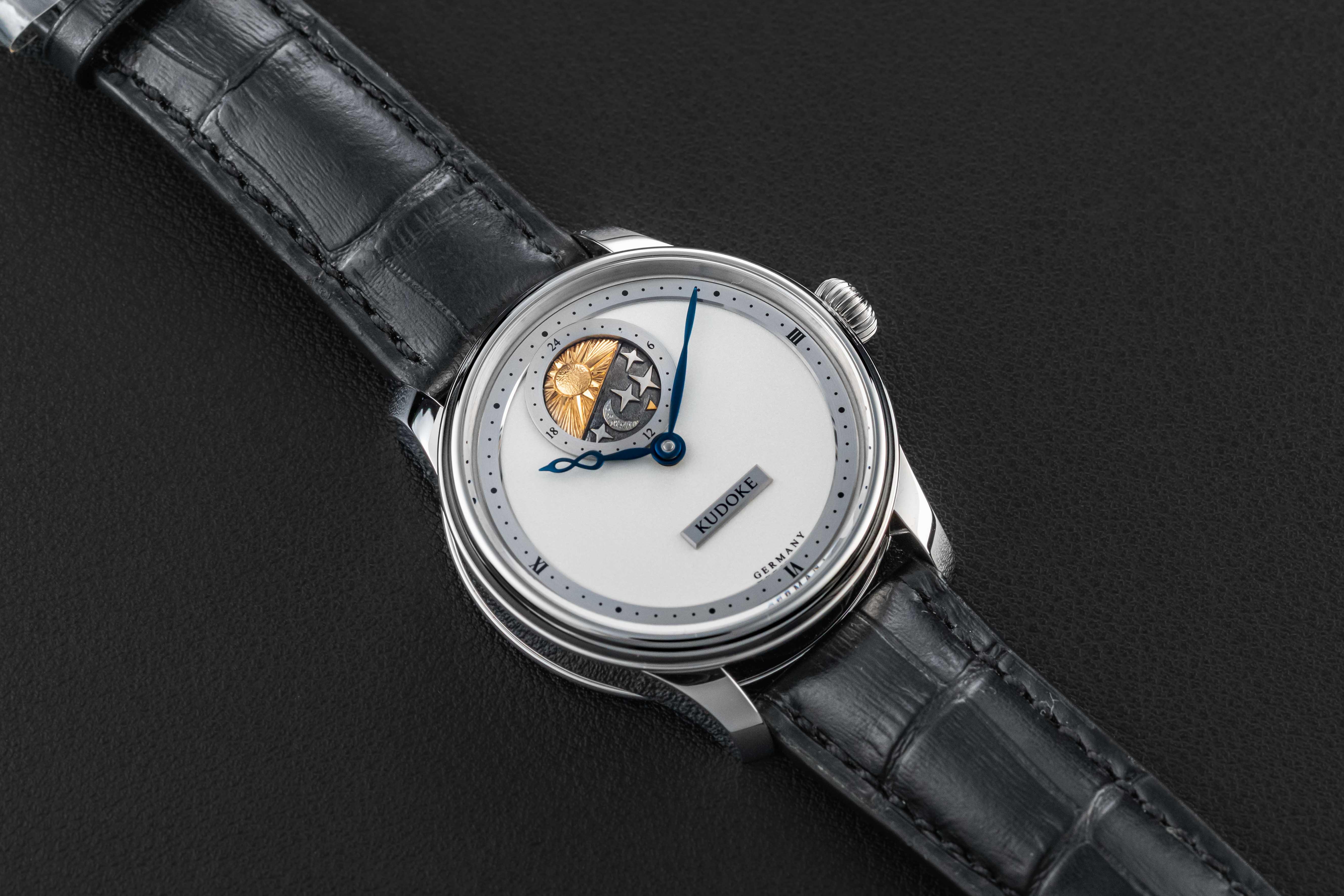 Offered here is a very rare and beautiful watch from the German independent outfit, Kudoke. The Kudoke 2 is a continuation of the first Kudoke 24-Hour model, beautifully hand-crafted with a stunning silver/white dial and day-date 24-hour indicator disk at 12 o’clock. These watches are extremely desirable, and sell out upon release; there is an alleged 12-month wait list just for the opportunity to be considered to purchase one. This Kudoke 2 remains unworn/new, and comes complete with its original Kudoke boxes and paperwork, as sold new.