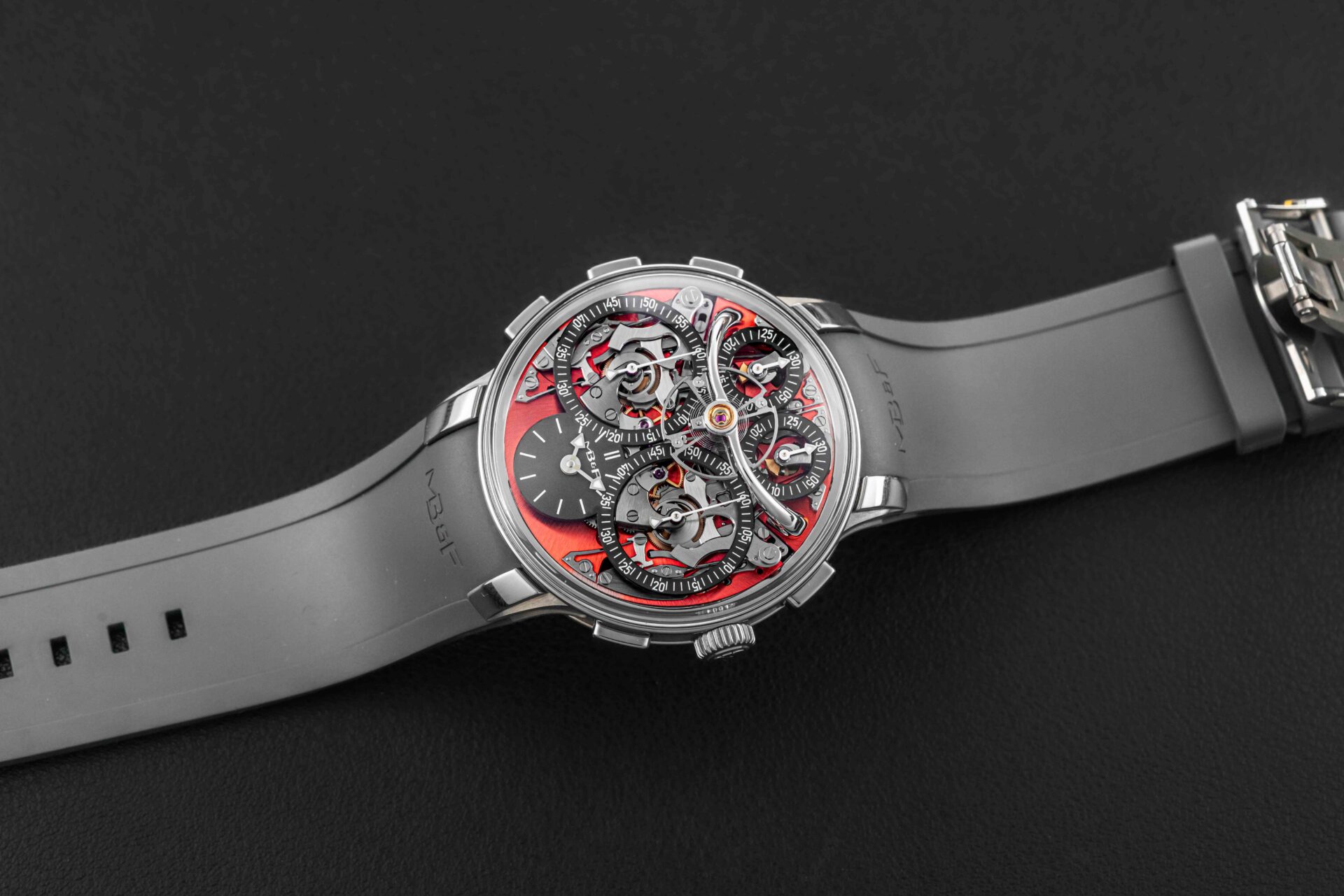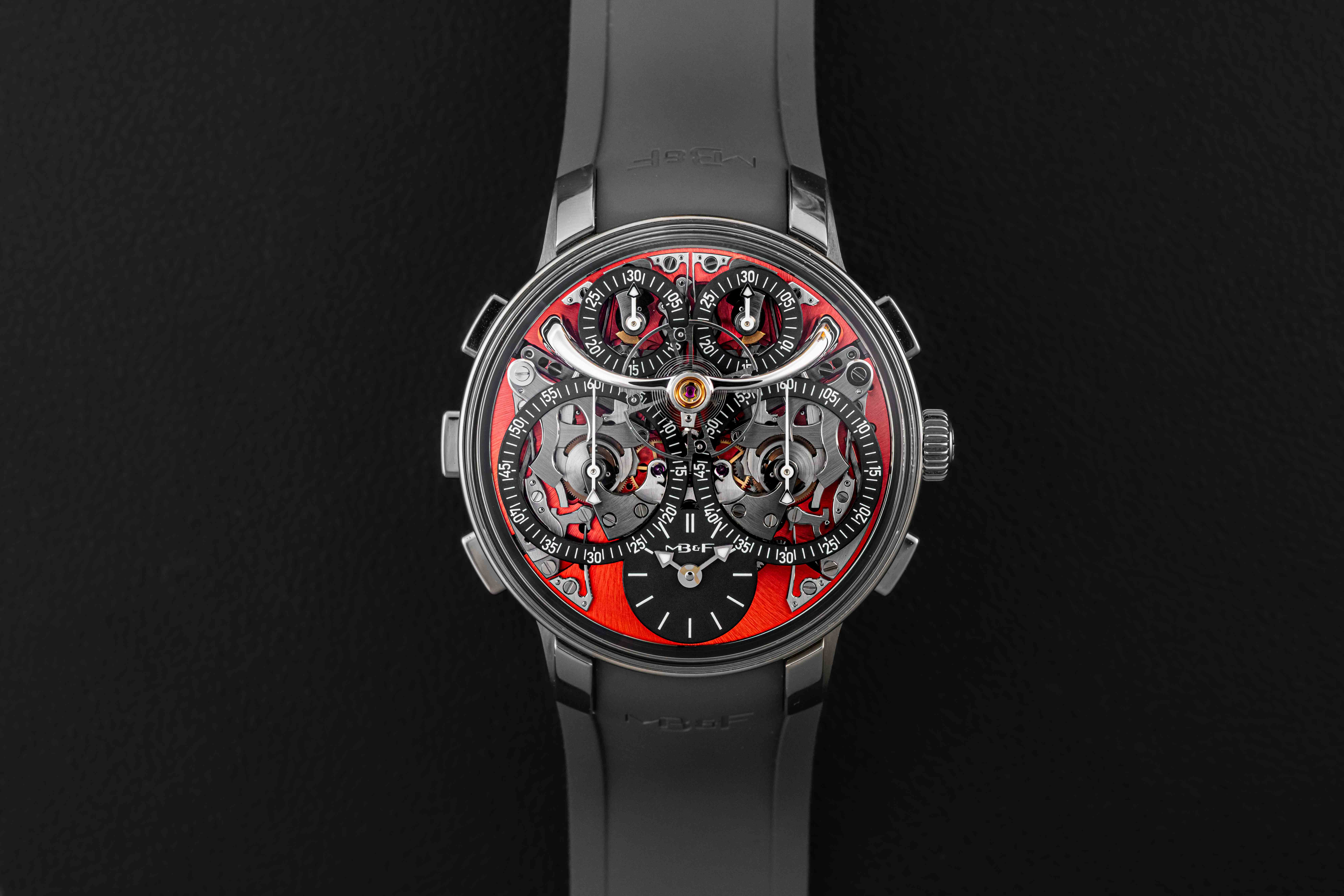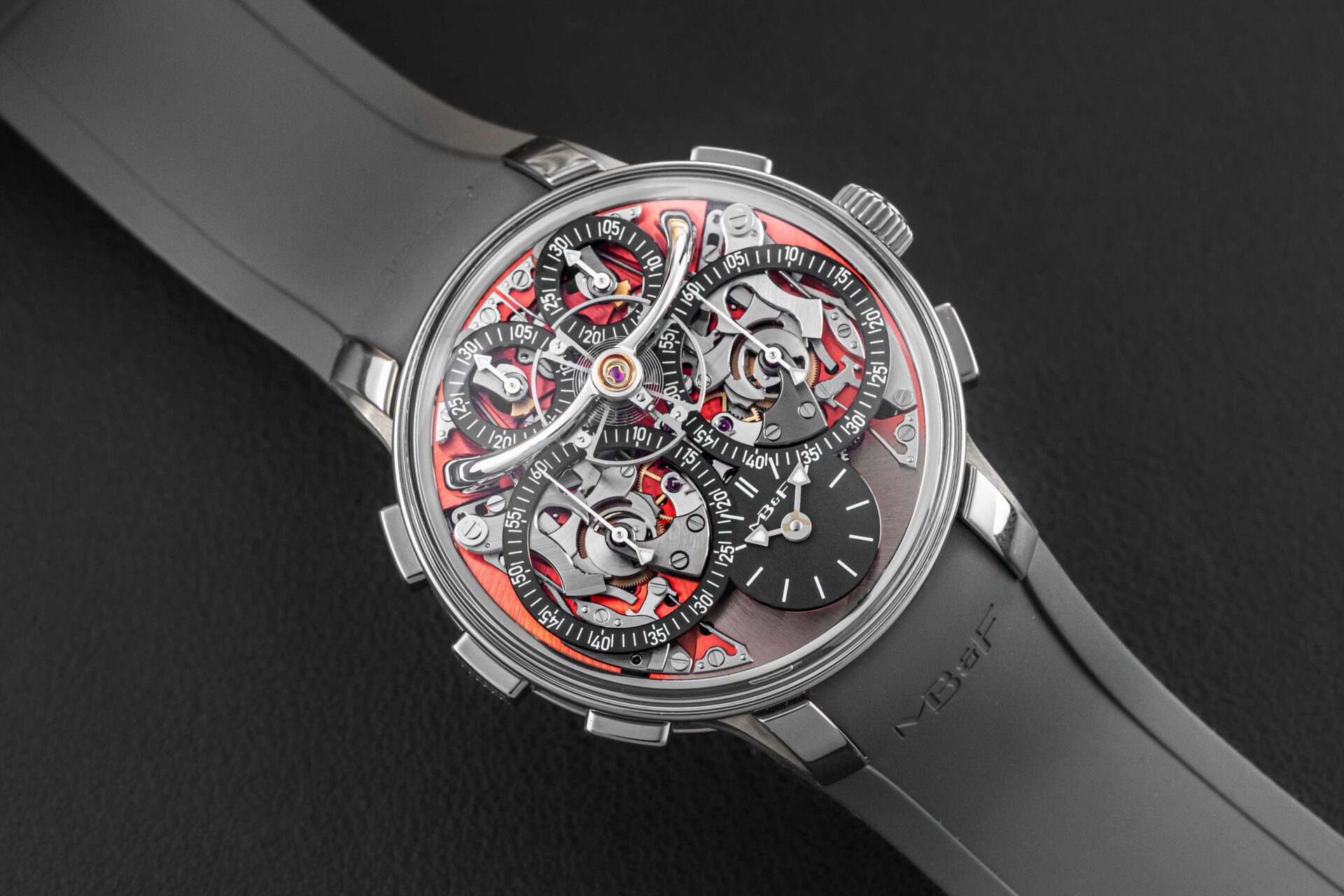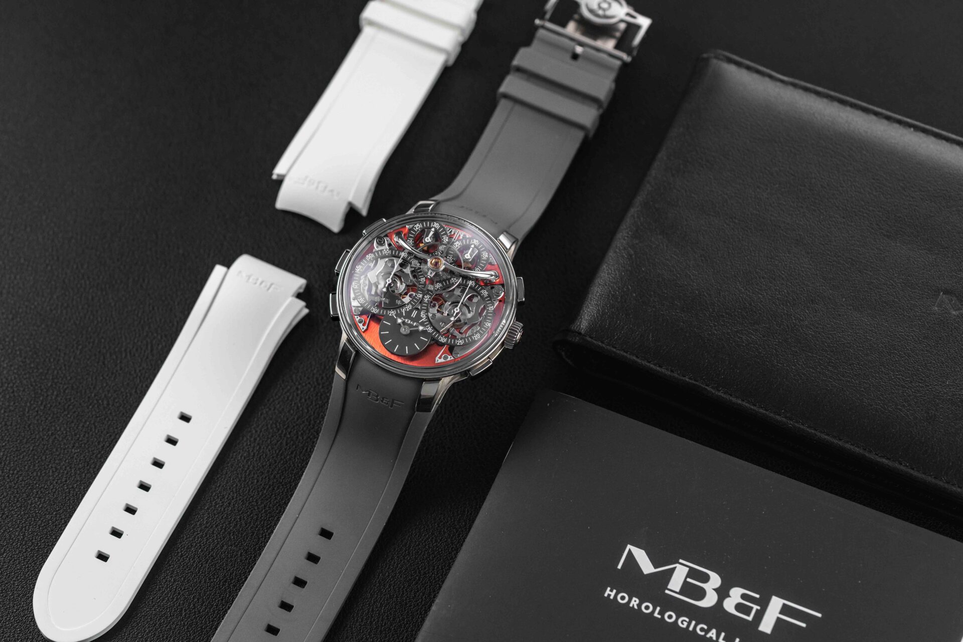 Offered here is MB&F’s first chronograph, the Legacy Machine Sequential EVO. The Sequential EVO introduces a revolutionary “Twinverter” system that allows its dual chronographs to operate independently, simultaneously, or synchronized, something never before seen in mechanical watchmaking. This watch is crafted in zirconium, a silvery-grey metal that’s lighter than stainless steel and more durable than titanium. This particular example is very lightly worn, remaining in excellent condition, and comes complete with its original MB&F box and paperwork.