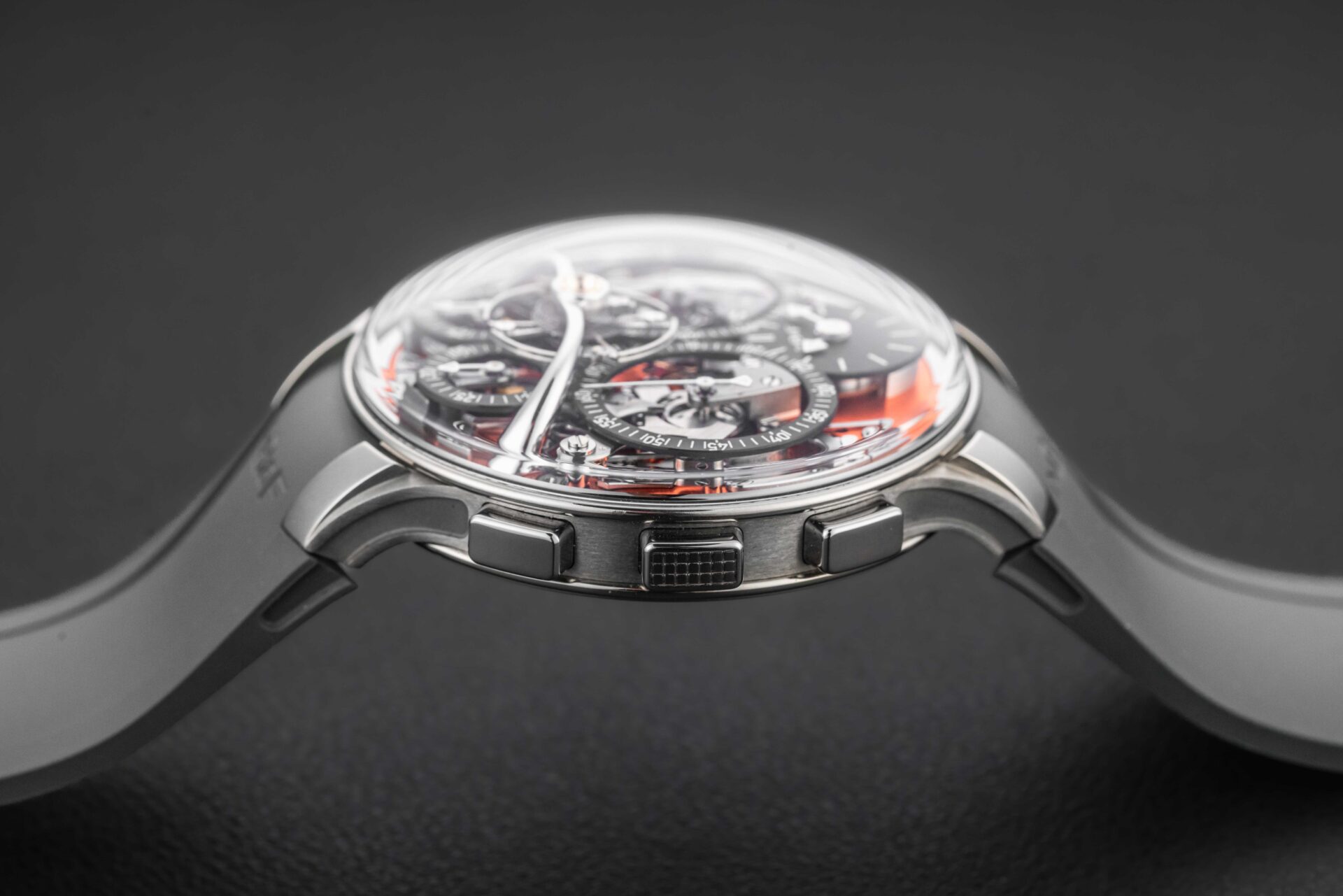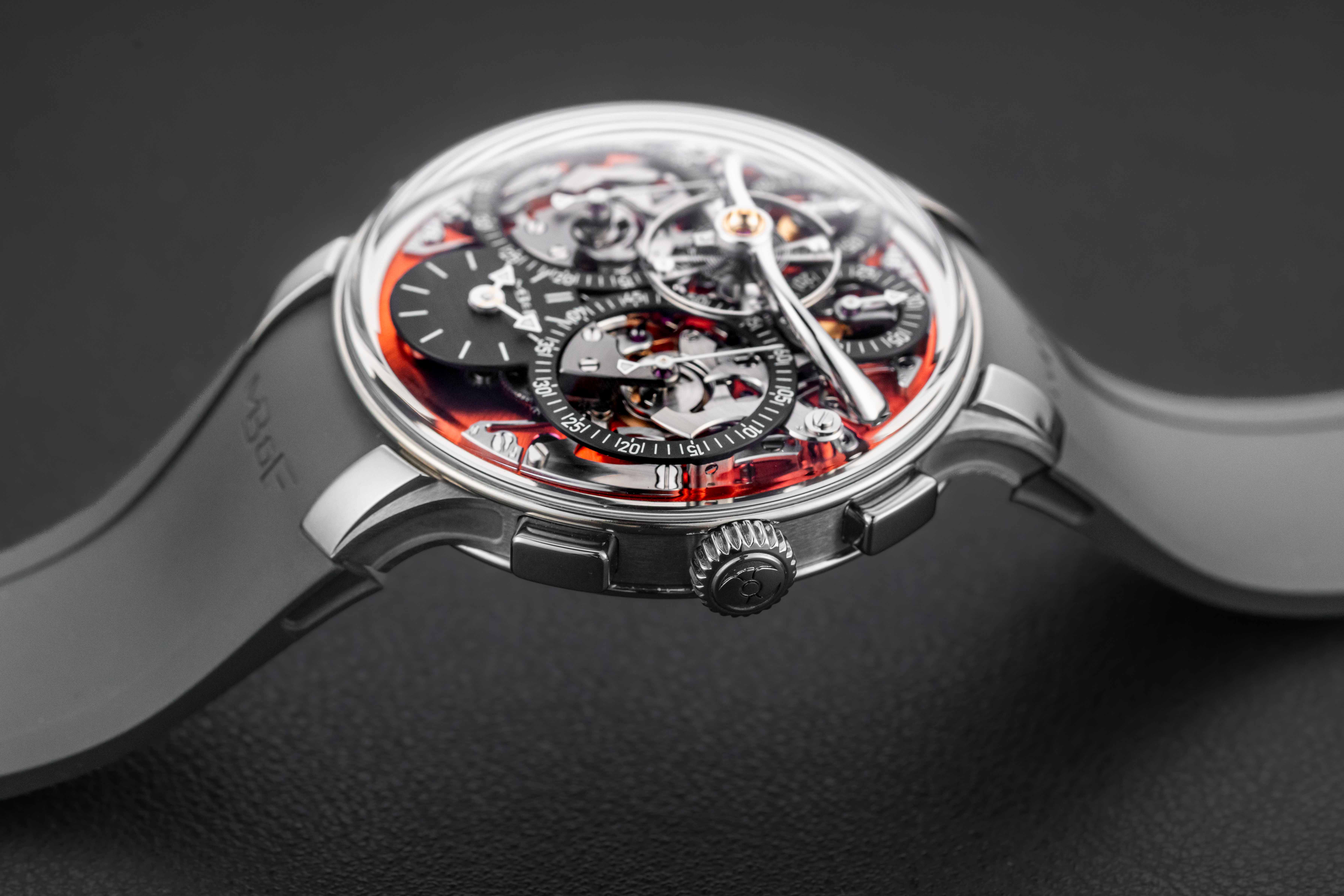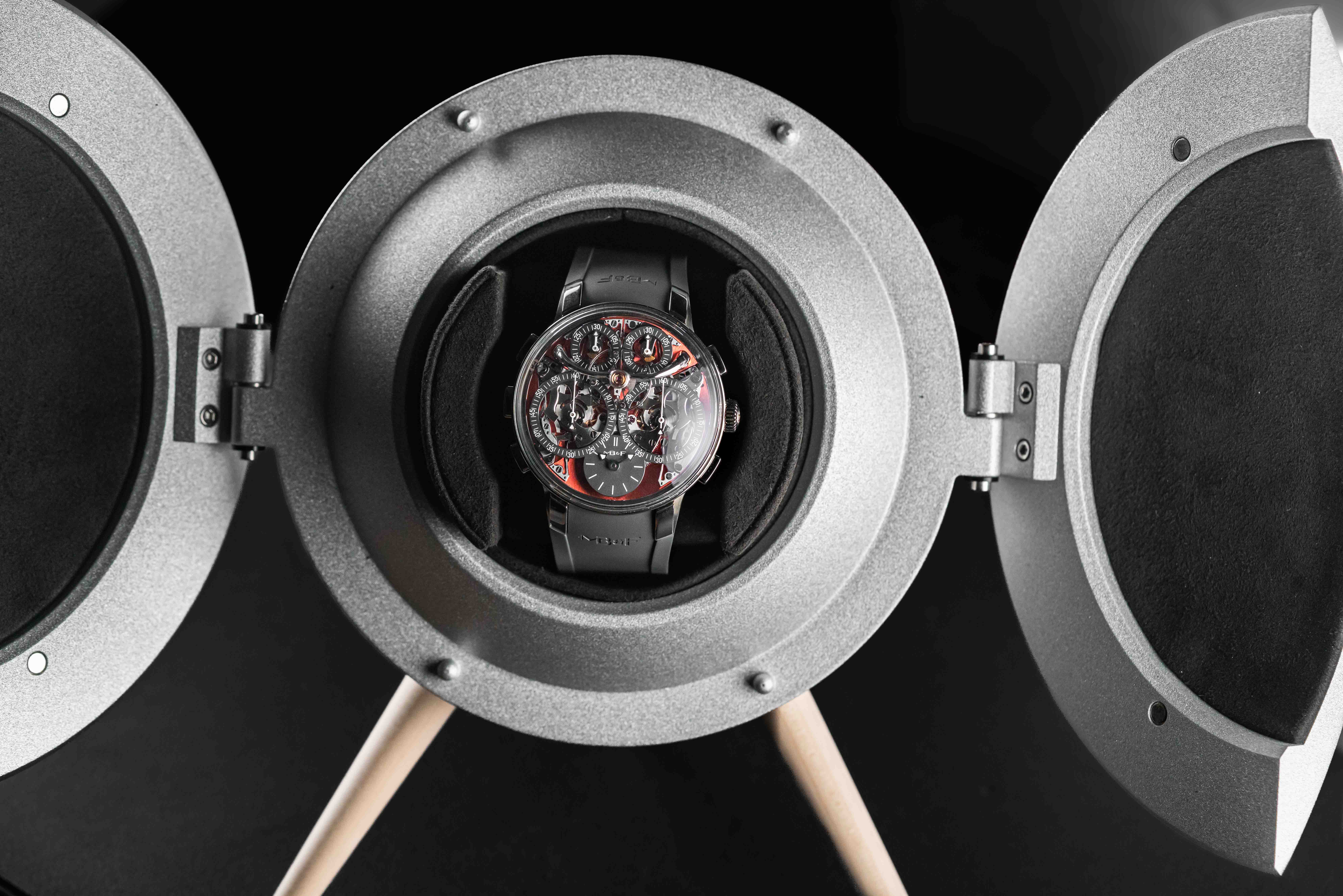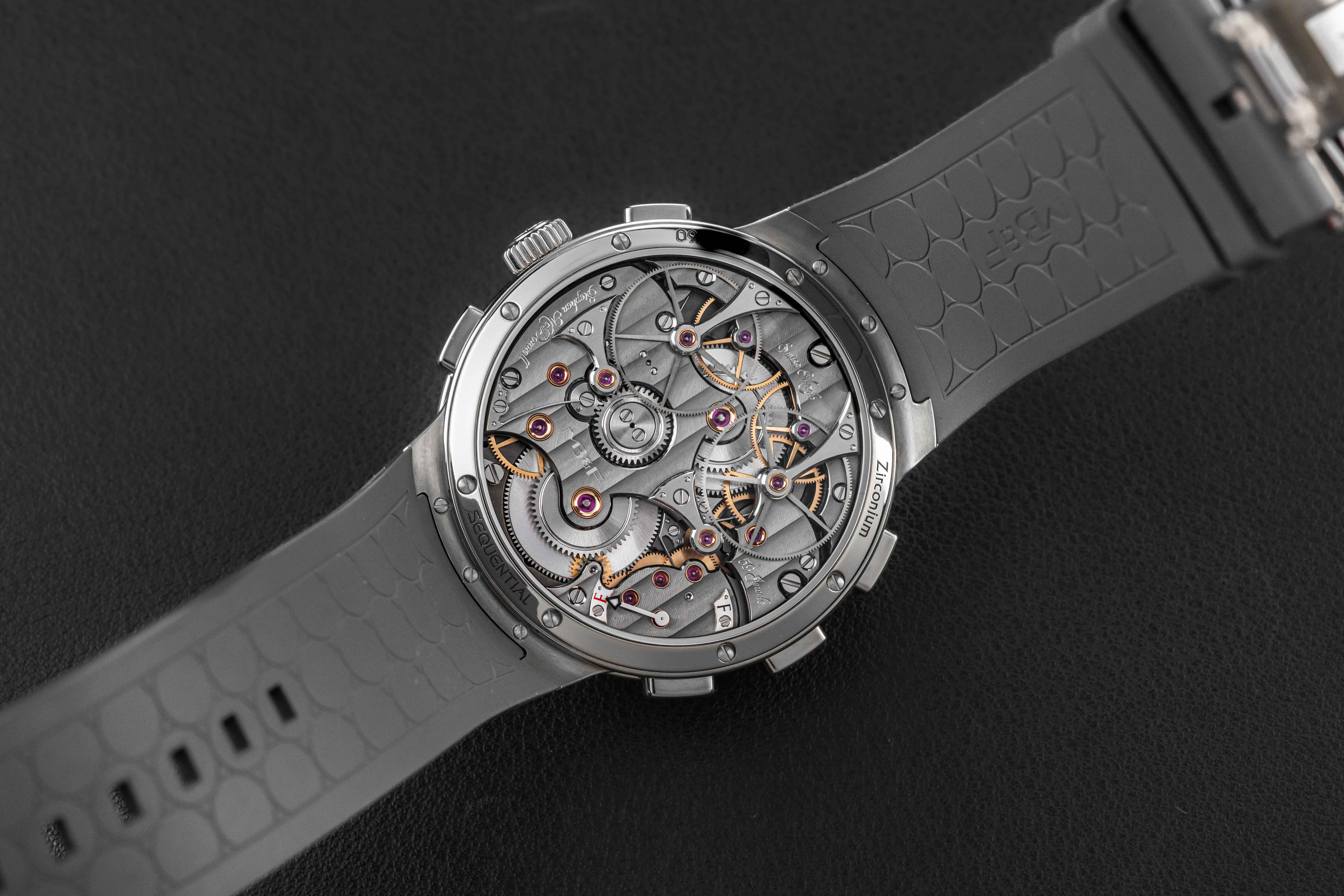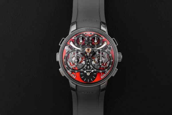 Offered here is MB&F’s first chronograph, the Legacy Machine Sequential EVO. The Sequential EVO introduces a revolutionary “Twinverter” system that allows its dual chronographs to operate independently, simultaneously, or synchronized, something never before seen in mechanical watchmaking. This watch is crafted in zirconium, a silvery-grey metal that’s lighter than stainless steel and more durable than titanium. This particular example is very lightly worn, remaining in excellent condition, and comes complete with its original MB&F box and paperwork.