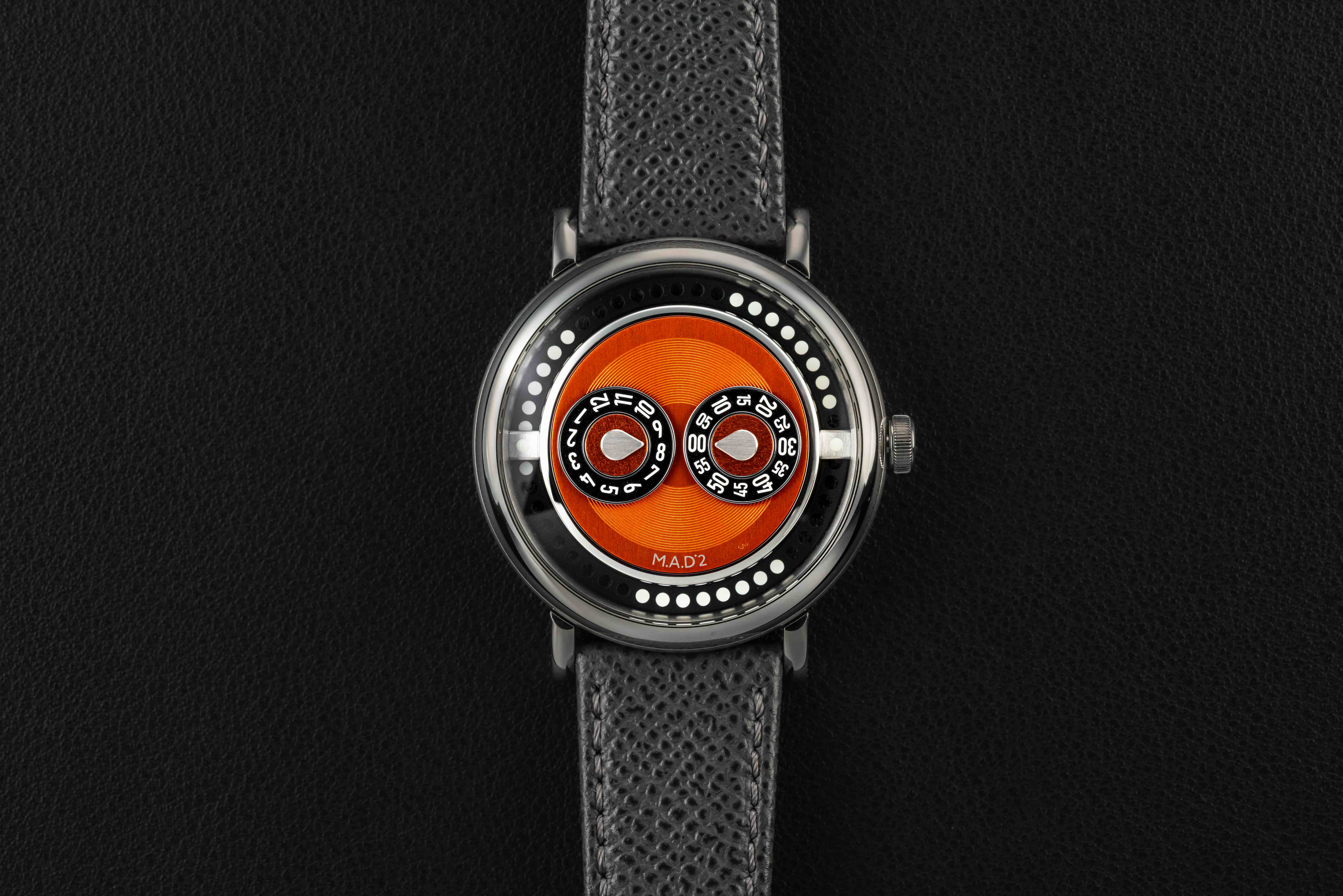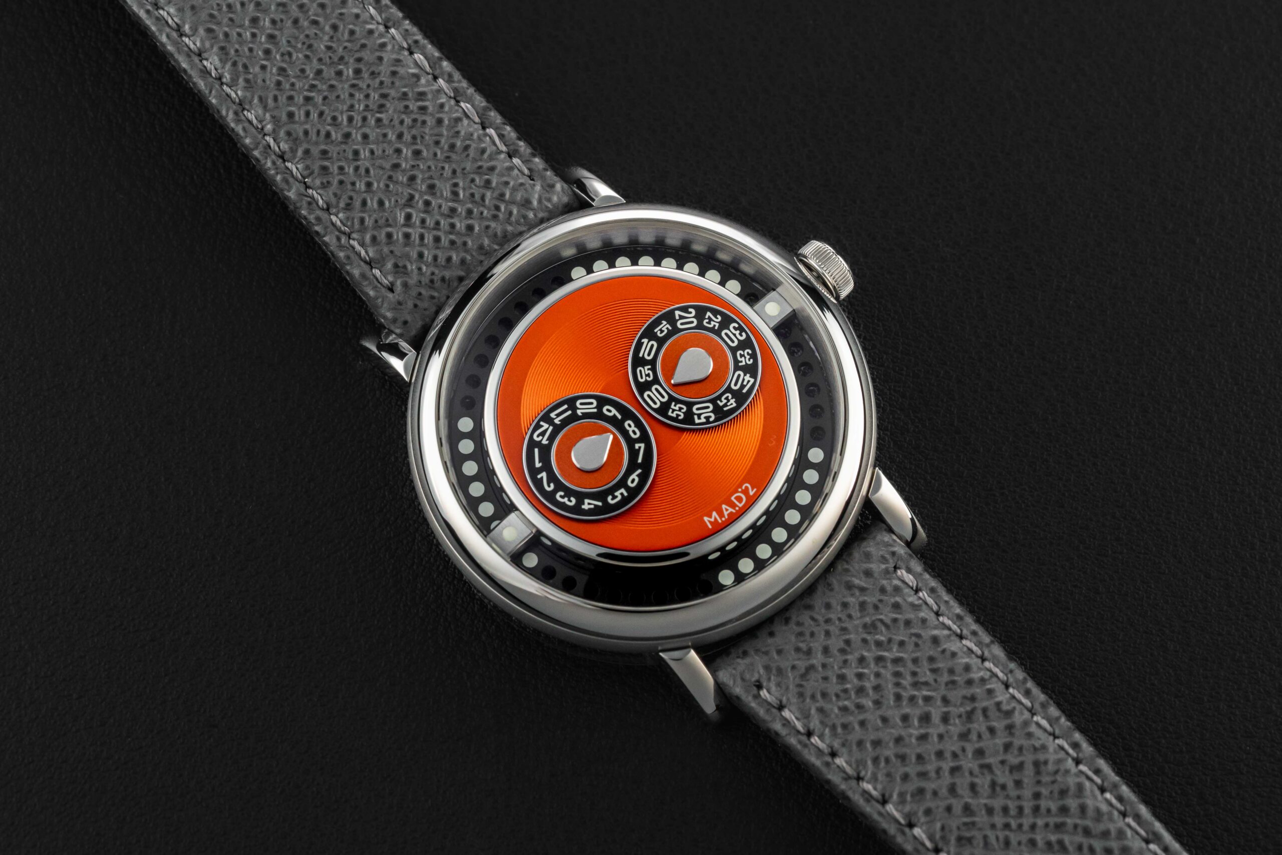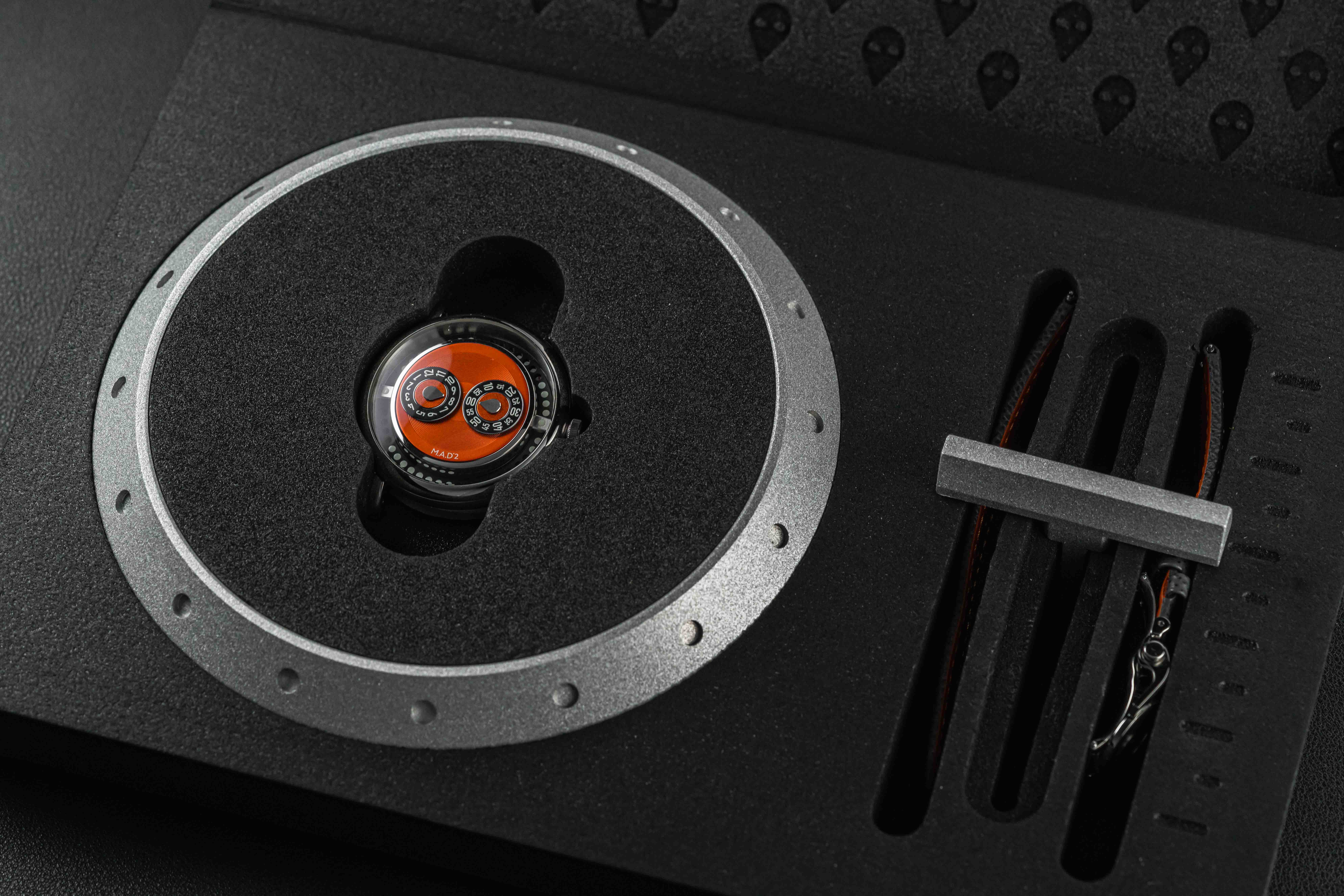 Up for grabs is the next evolution of MB&F’s entry level creation, the “M.A.D. 2”, in colloboration with their sister brand, the M.A.D. Gallery. The M.A.D Gallery, the brain child of Max Büsser of MB&F, known for their art clocks and horological machines, has introduced their second wrist watch, the M.A.D.2. Much Like the M.A.D 1, this new model features a fully visible rotor, like a fidget spinner for the wrist. On this iteration, the time is displayed by two raised subdials – one for hours and one for minutes – which resemble mixing decks over a vinyl-textured surface. This example is in new condition, and comes with the original box papers and accessories.