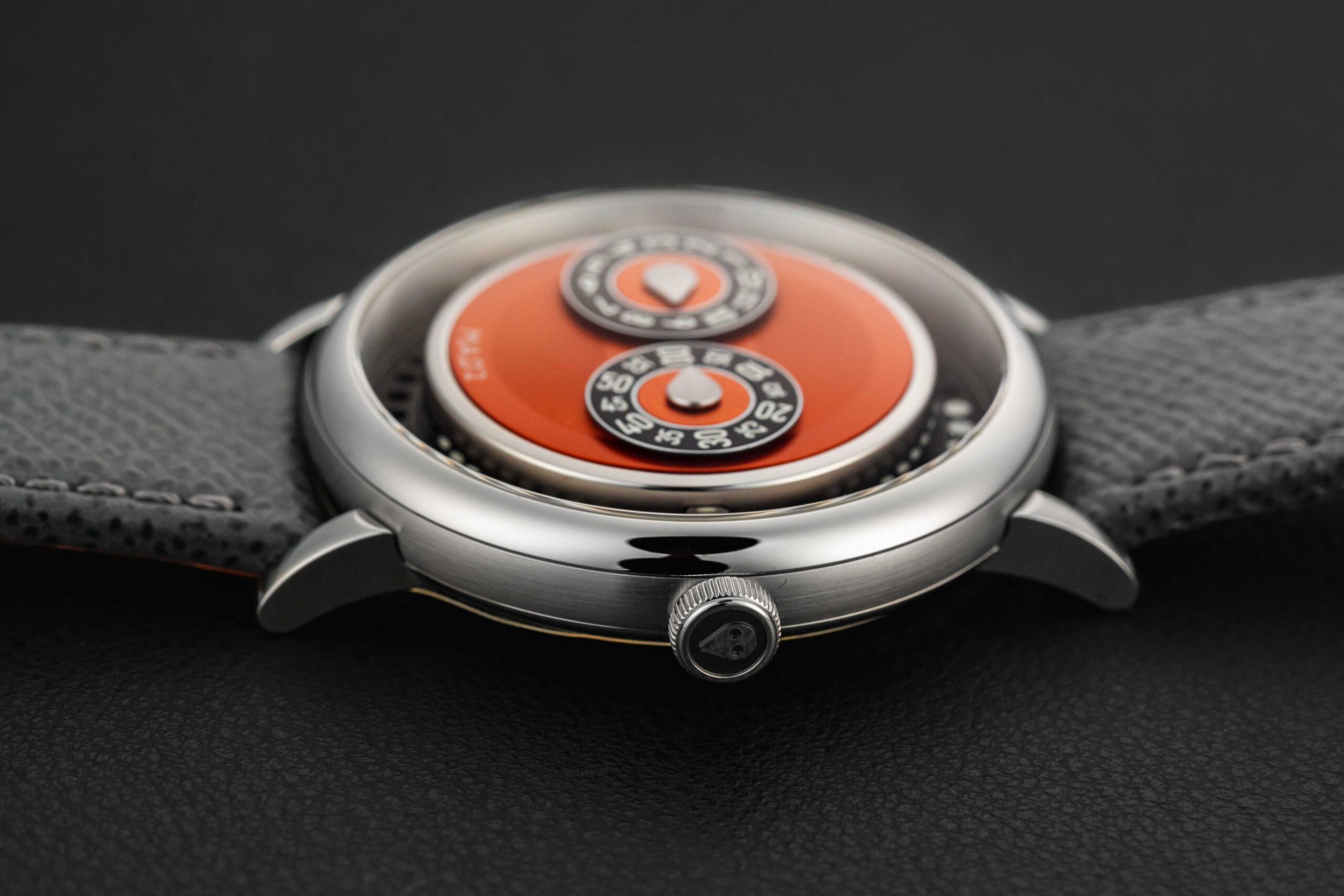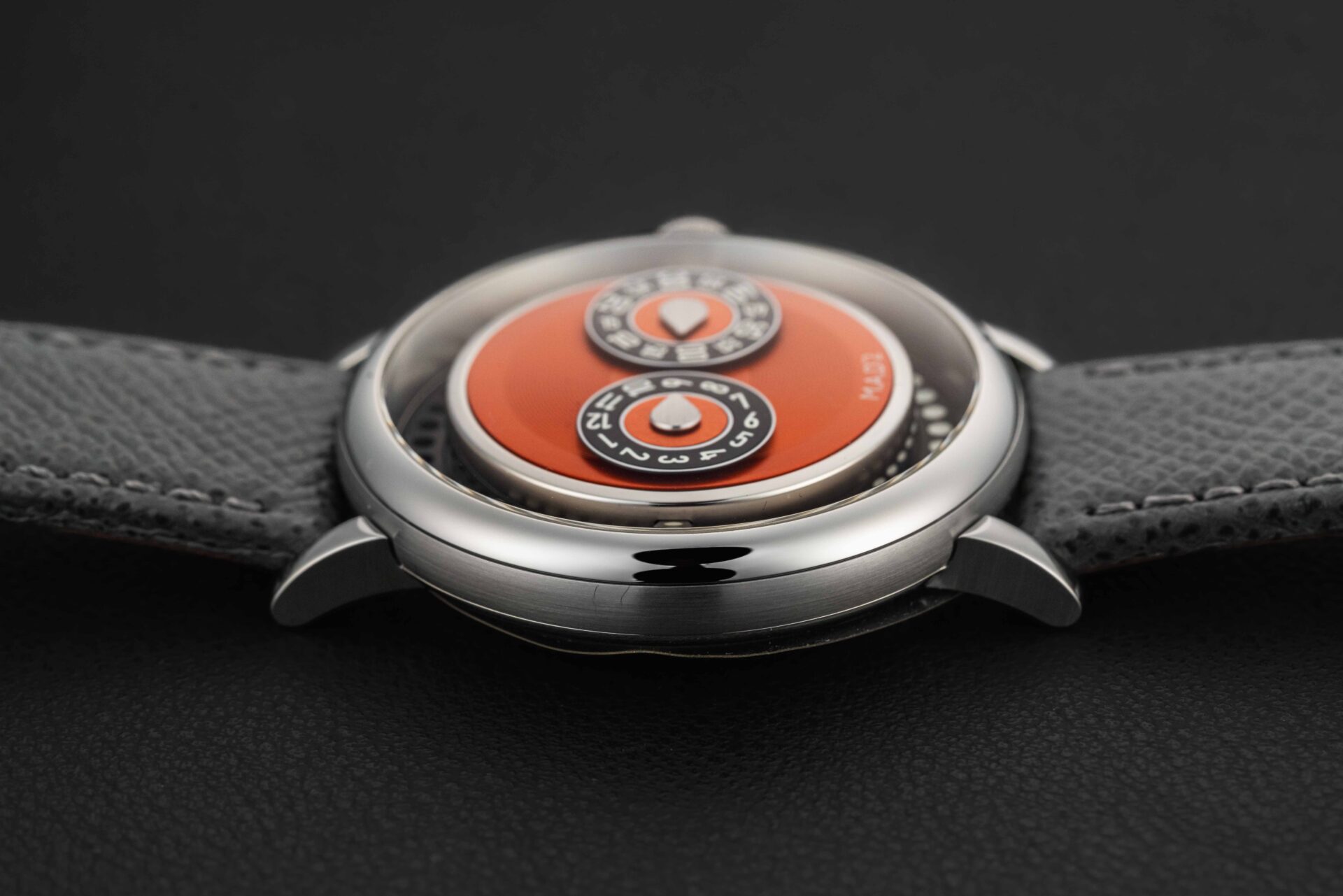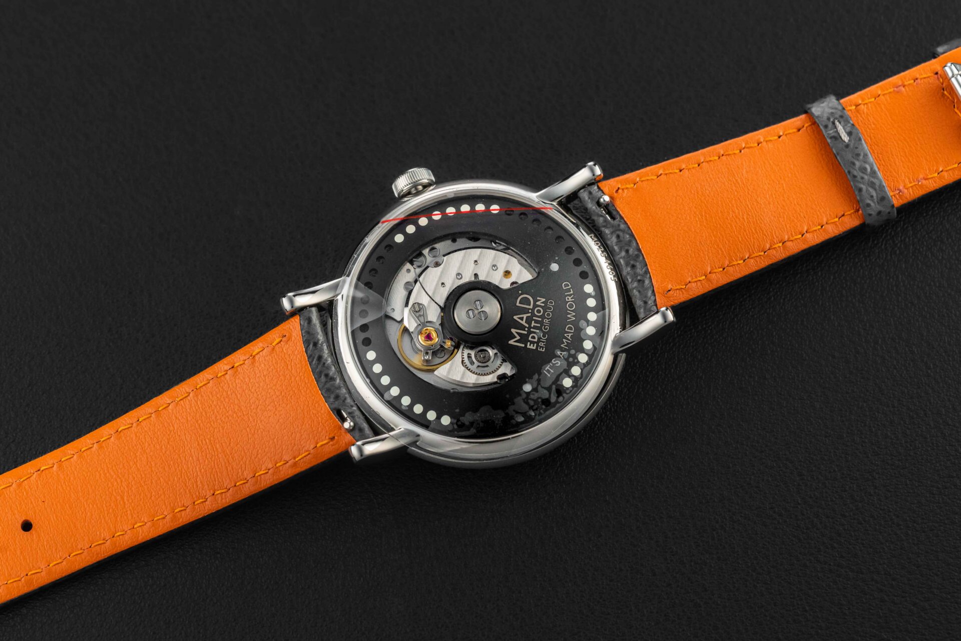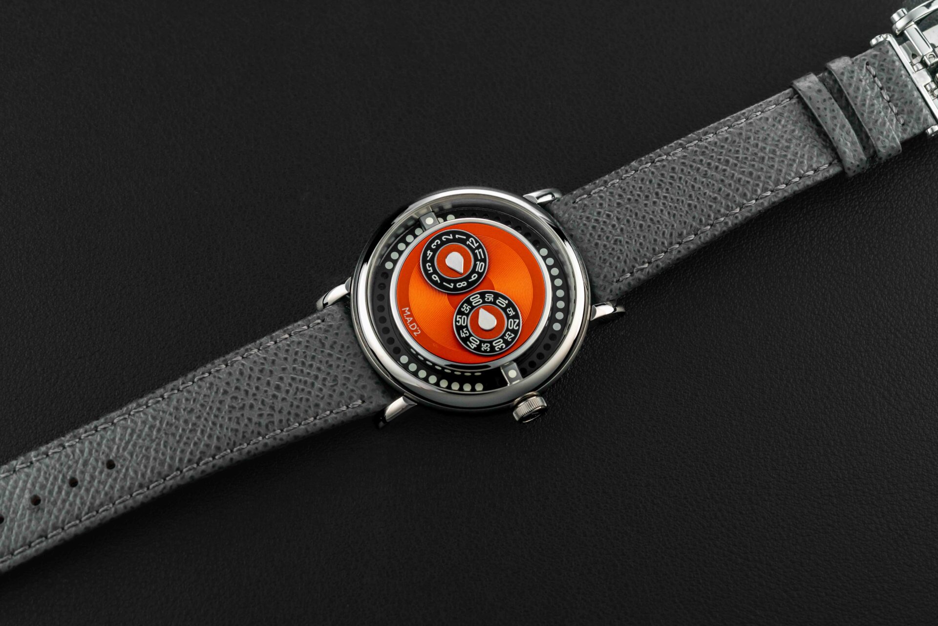 Up for grabs is the next evolution of MB&F’s entry level creation, the “M.A.D. 2”, in colloboration with their sister brand, the M.A.D. Gallery. The M.A.D Gallery, the brain child of Max Büsser of MB&F, known for their art clocks and horological machines, has introduced their second wrist watch, the M.A.D.2. Much Like the M.A.D 1, this new model features a fully visible rotor, like a fidget spinner for the wrist. On this iteration, the time is displayed by two raised subdials – one for hours and one for minutes – which resemble mixing decks over a vinyl-textured surface. This example is in new condition, and comes with the original box papers and accessories.