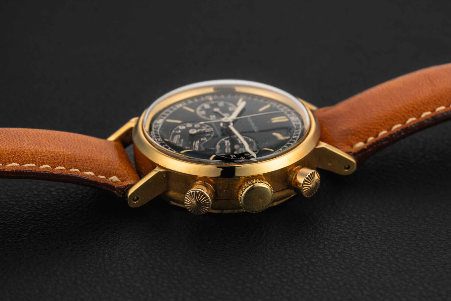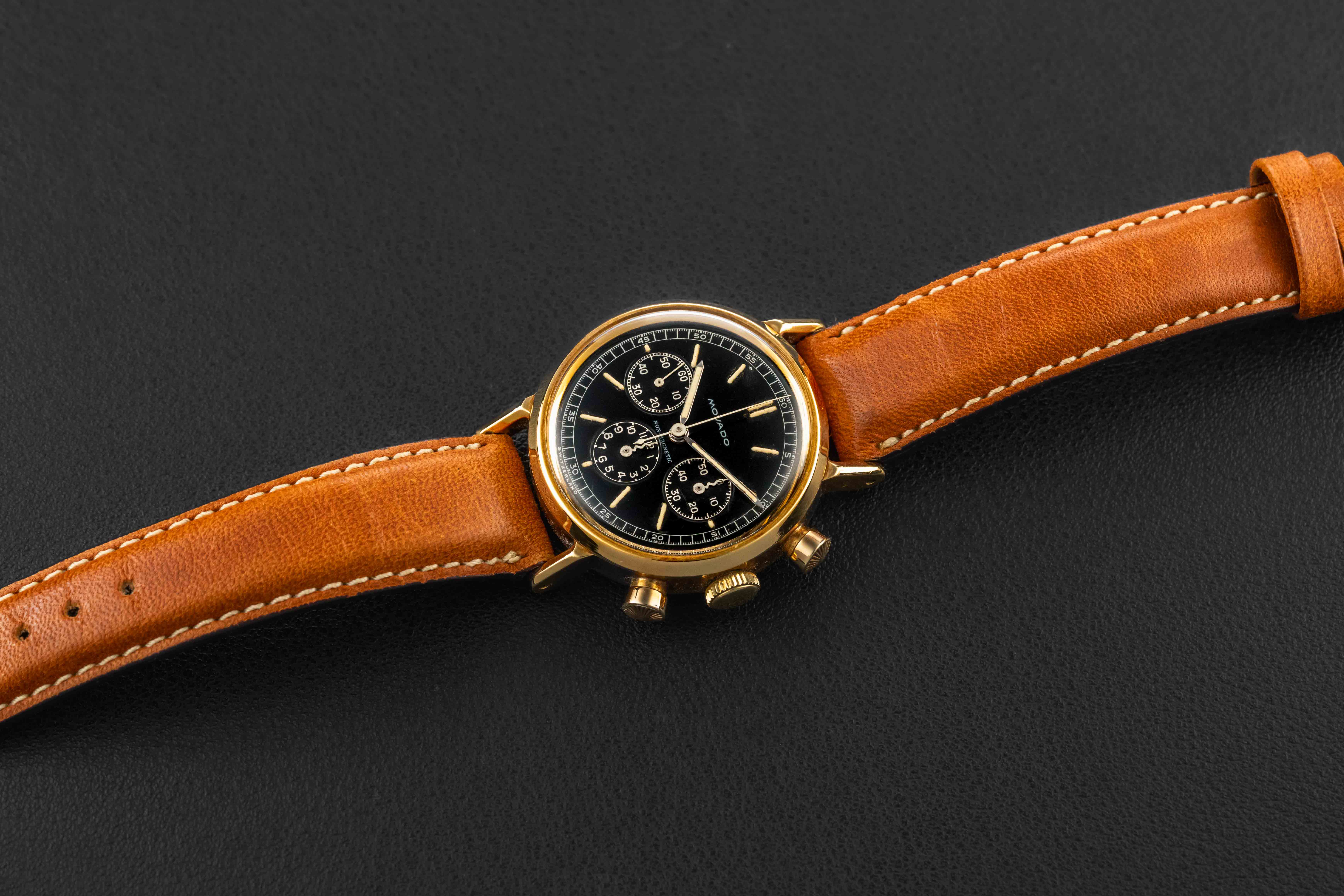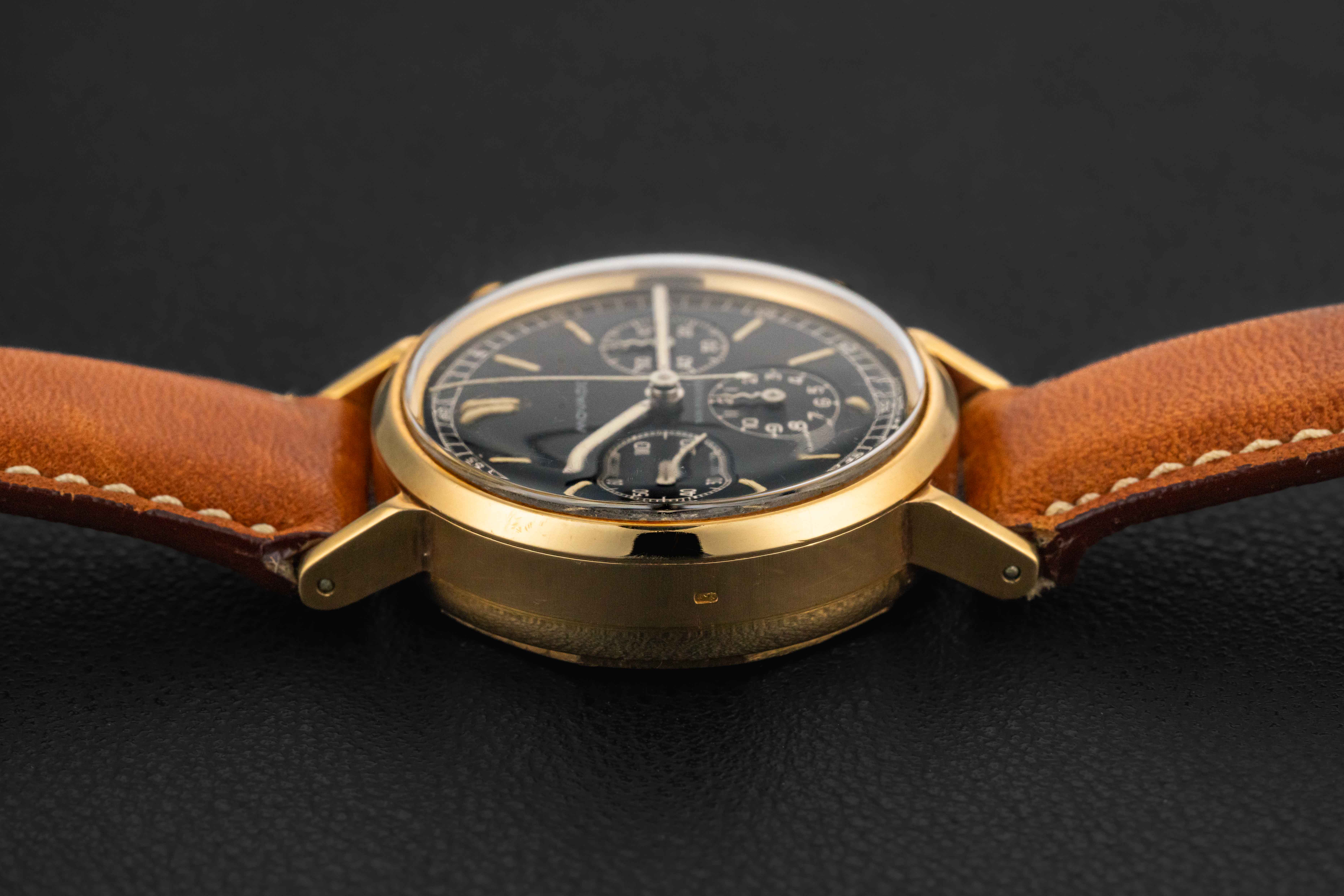 Up for grabs is a very rare early Movado chronograph, circa 1940s. This particular Movado chronograph is housed in an 18kt yellow gold case and fit with an extremely desirable and uncommon black, gilt dial. The condition of this early Movado chronograph is excellent. The case appears unpolished, showing normal wear from use, and strong and crisp hallmarks. The gilt dial still retains a nice glossy mirror finish, showing some wear around the markers due to radium burn. As such, the watch retains its original radium lume on both dial and hands.