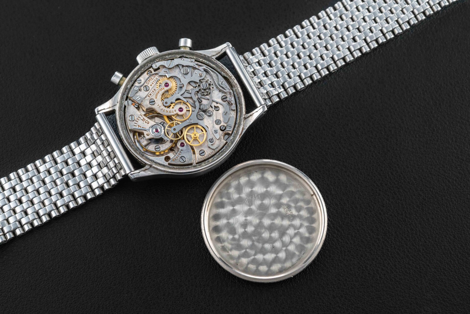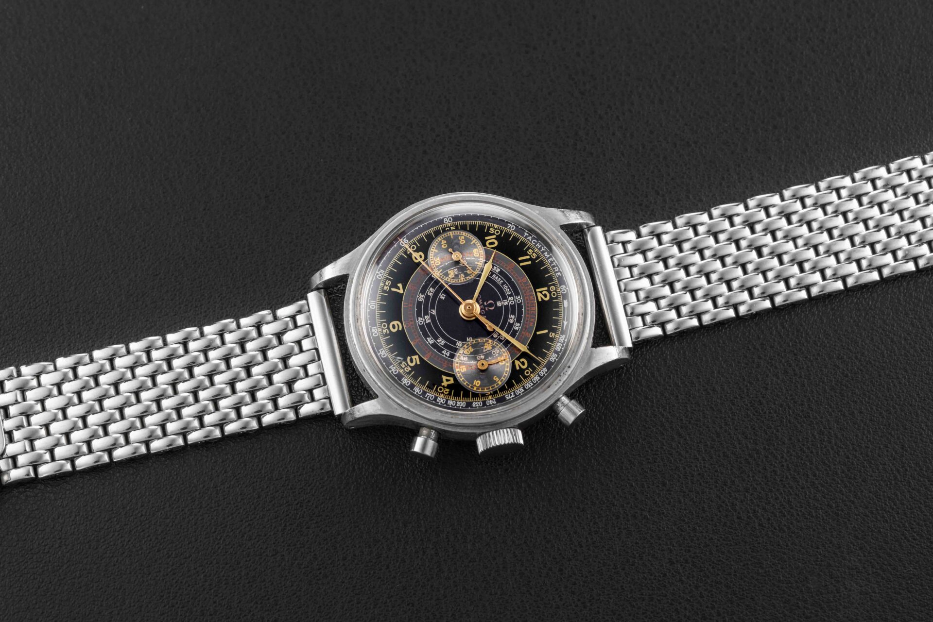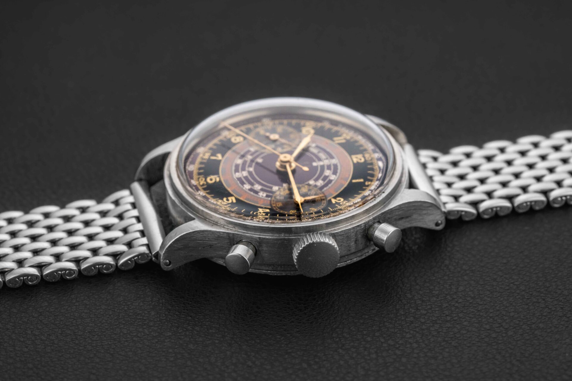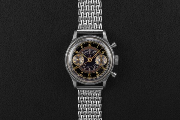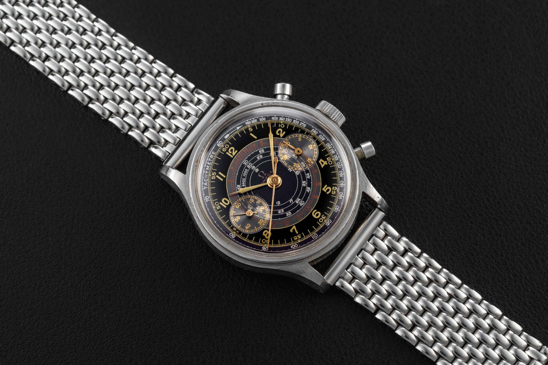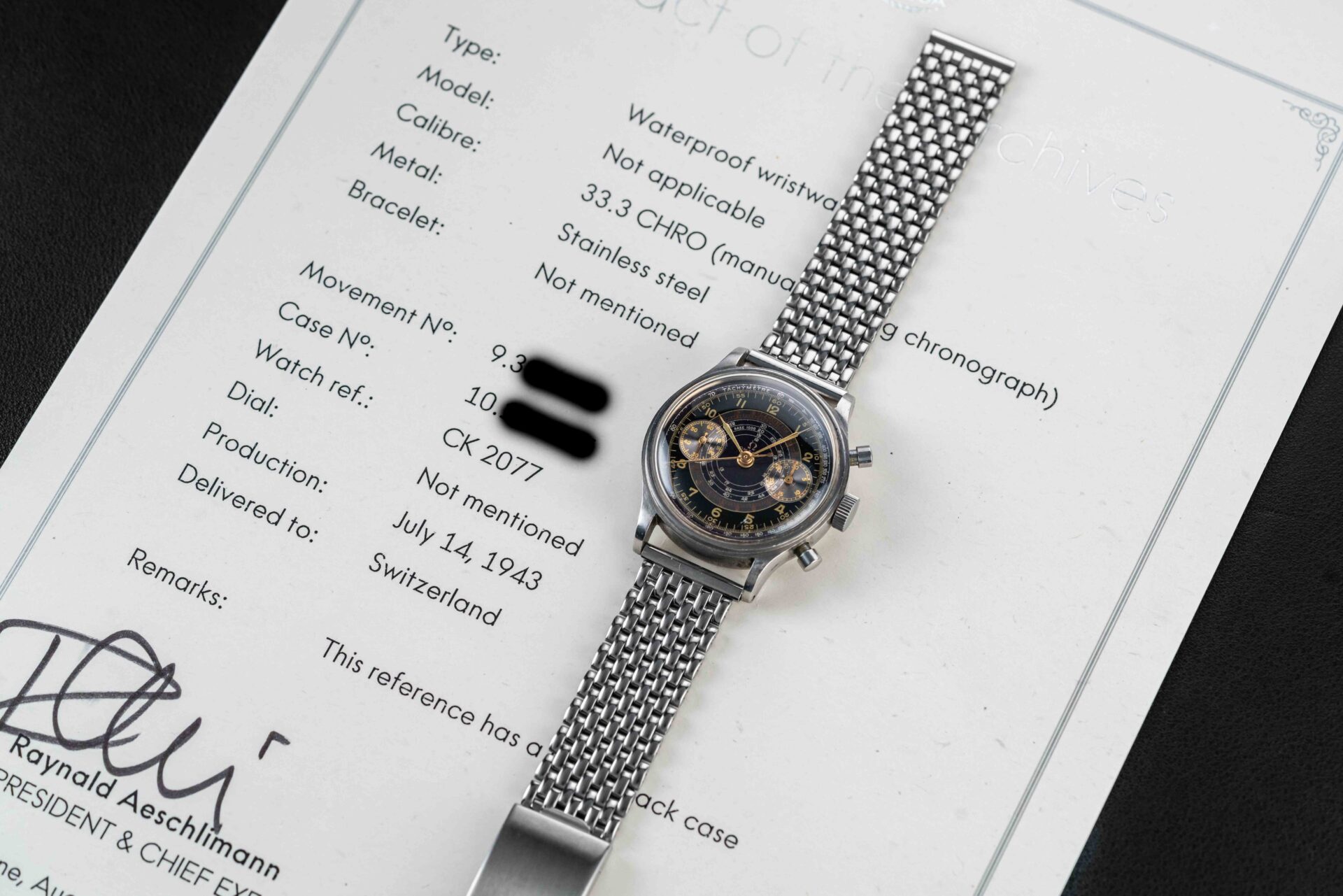 Up for grabs is an insanely rare and early chronograph from Omega, reference CK2077, circa 1943, powered by the legendary 33.3CHRO movement. The reference 2077 is adorned by collectors, as they were the first waterproof chronographs made by Omega, fitted in a large 38mm screwback case with pump pushers. This particular example was originally delivered to Switzerland, and is fitted with a black gilt tri-color dial (purple, silver and black) with both tachy and telemeter scales. This dial variant is so rare, that we only know of one other example in existence, in the hands of a prominent Hong Kong collector. This Omega chronograph is in great vintage condition, with an unpolished case, and a lovely dial with no major wear, scratches, etc, a true time capsule! Finally, included in the sale is an Extract of the Archives from Omega, confirming the sale of this watch to Switzerland in 1943.