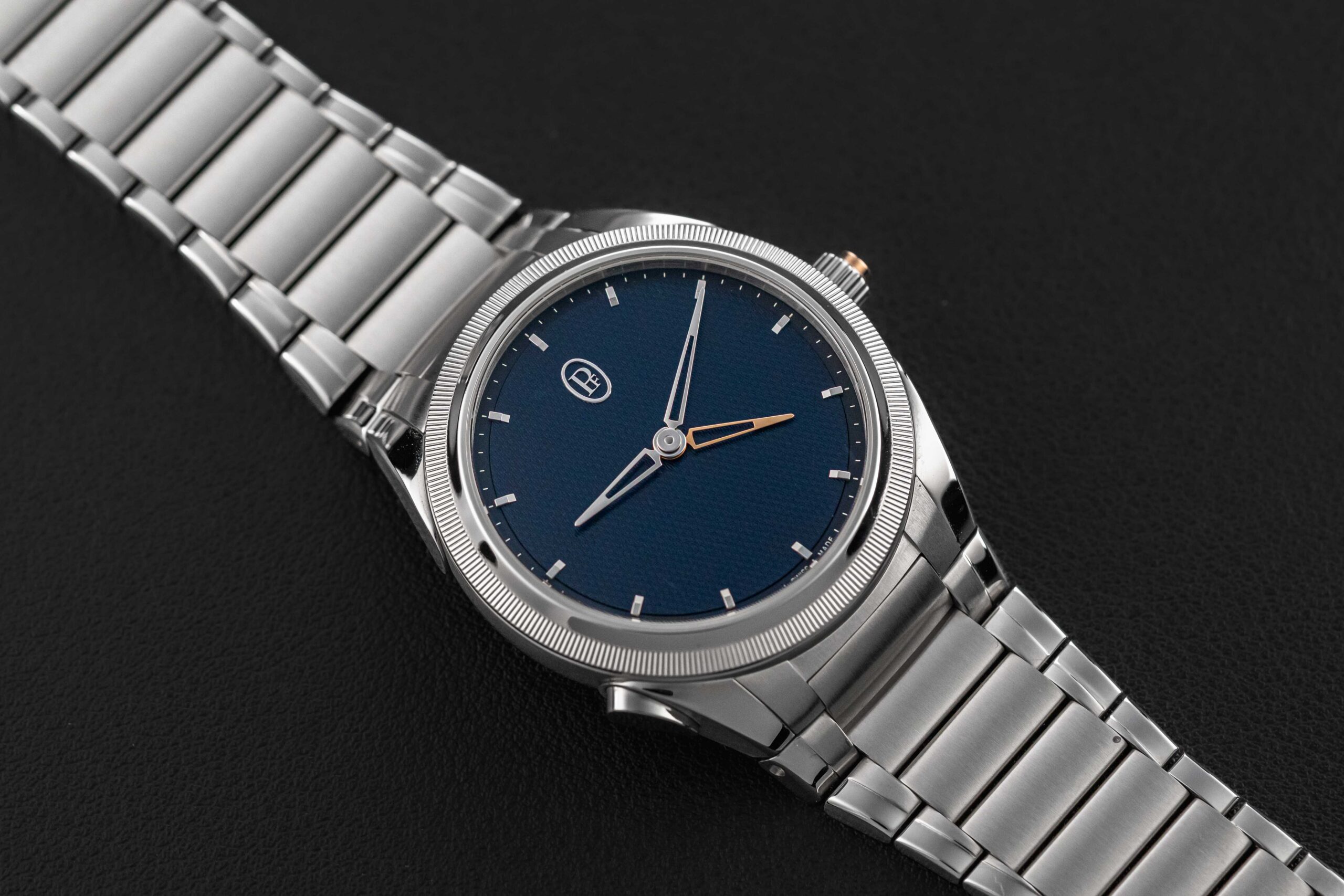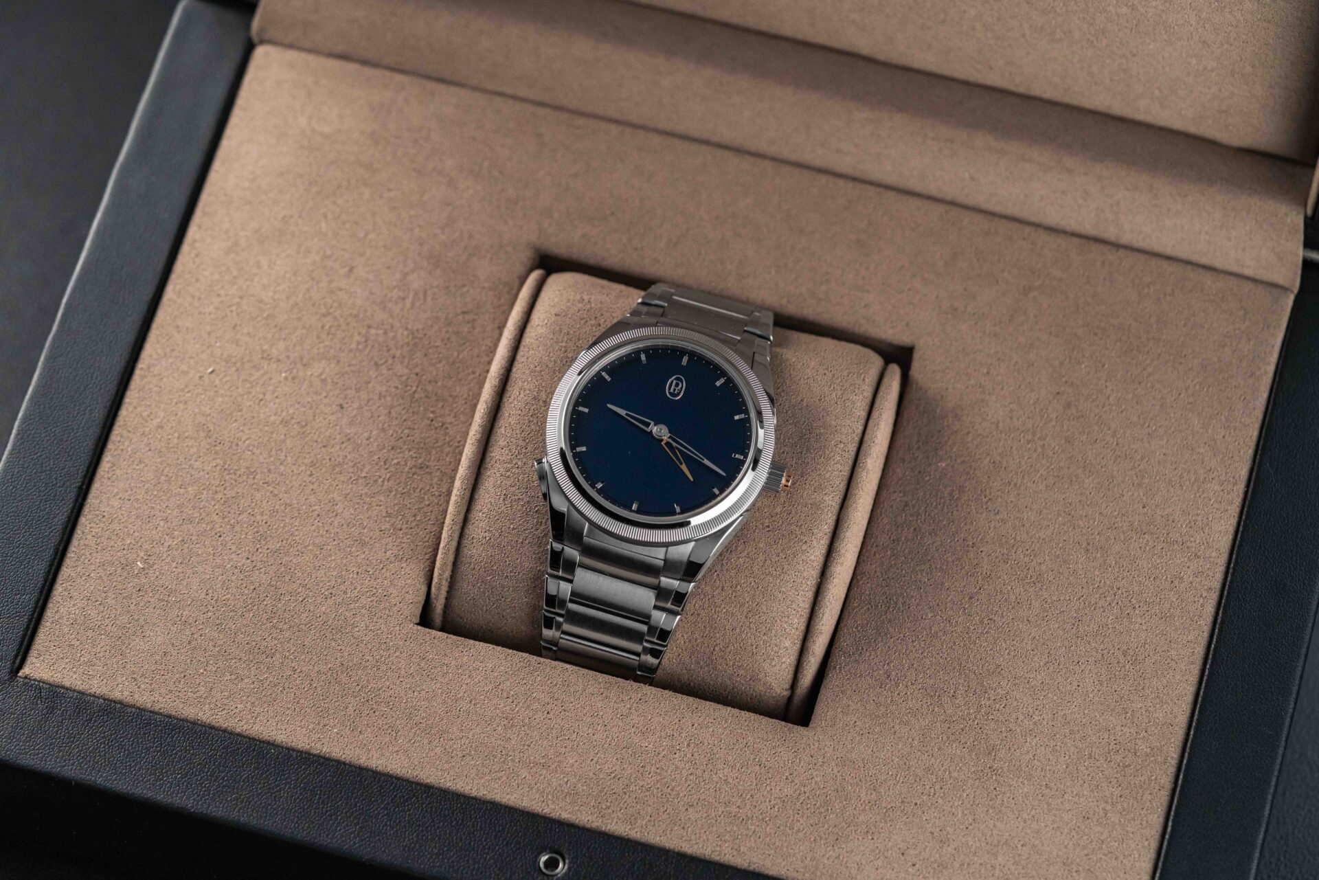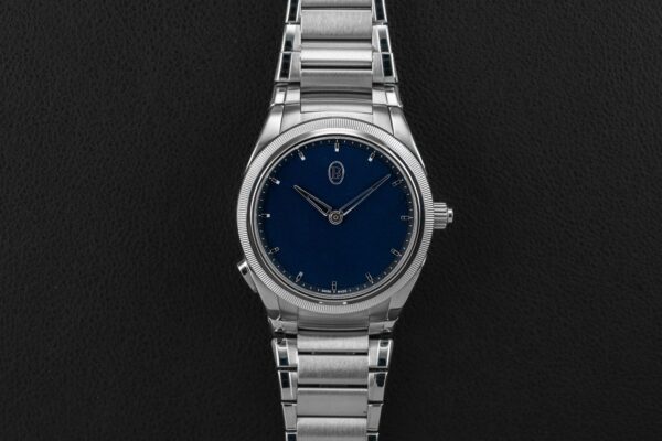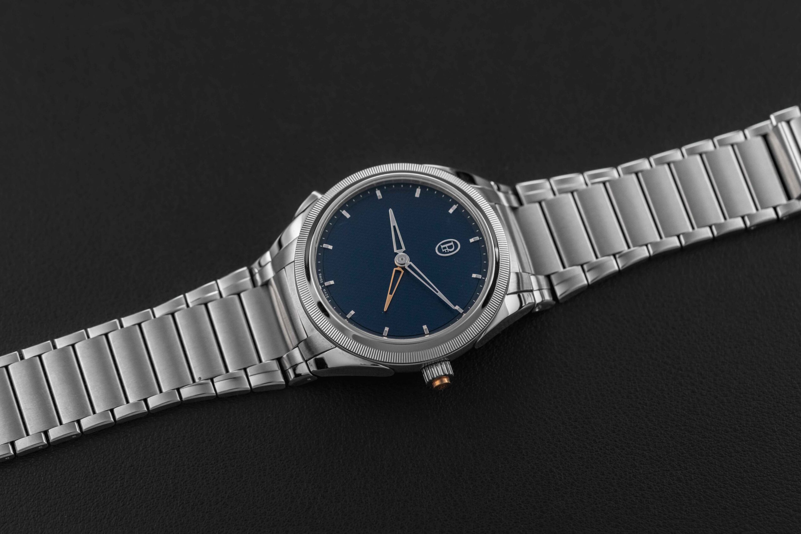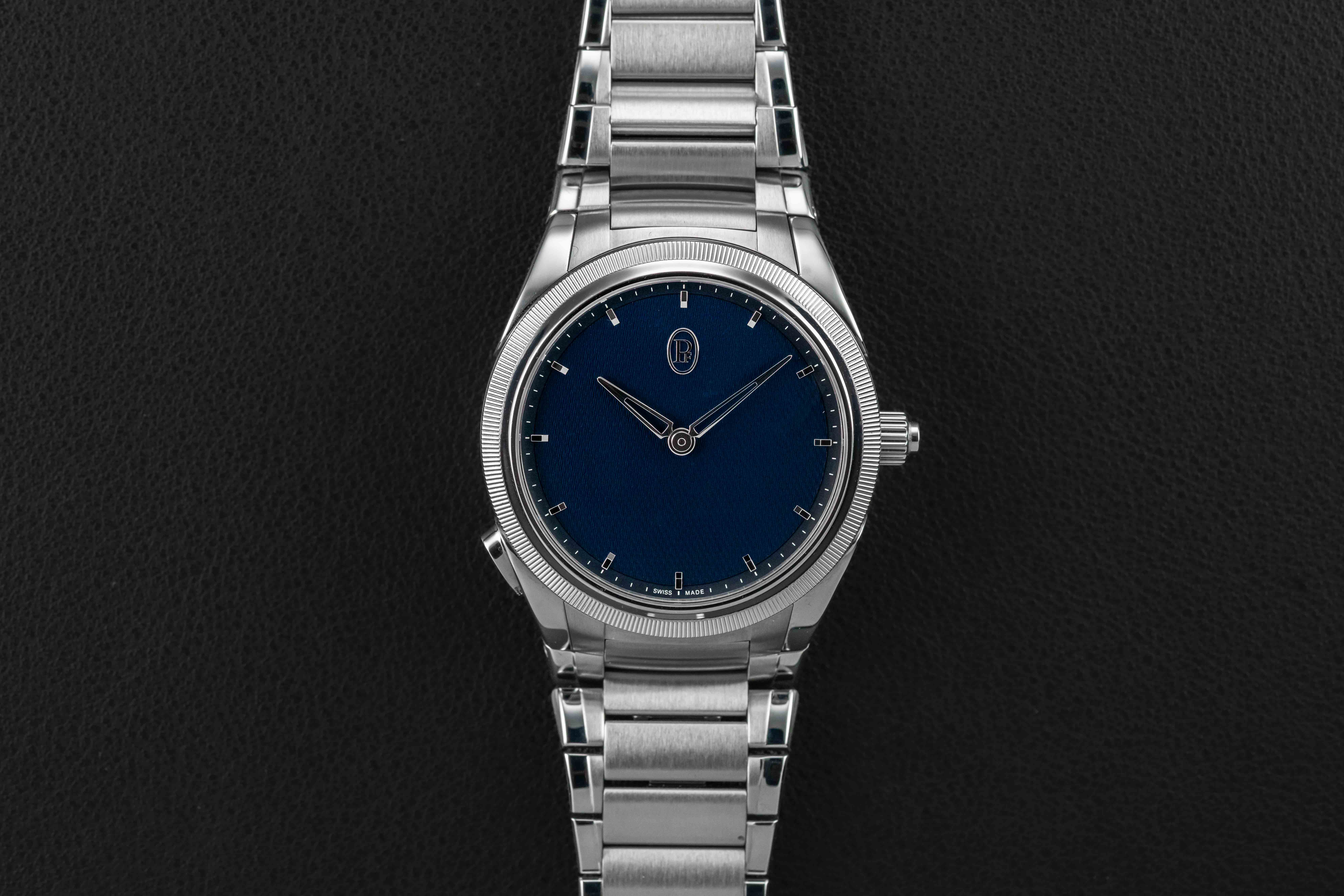 Offered here is a stunning example of the Parmigiani Fleurier Tonda PF GMT Rattrapante in stainless steel & platinum, featuring their gorgeous blue guilloché dial. With this new movement, Parmigiani applied rattrapante “split-seconds” technology to a dual-time hand for the very first time, and the result is one of the innovative travel-time complication in modern watch making. Two superimposed skeletonised hands sit on the dial — one white gold for local time, one rose gold for home time. A press of the pusher on the case advances the local hand by one-hour jumps; a press of the integrated rose gold pusher at the crown sends it flying back to reunite with the home hand, just like a rattrapante chrono hand. This Parmigiani Fleurier Tonda is in excellent pre-owned condition, only lightly worn by its original owner, and retains its original Parmigiani box, Warranty Card and Certificate, and booklet.