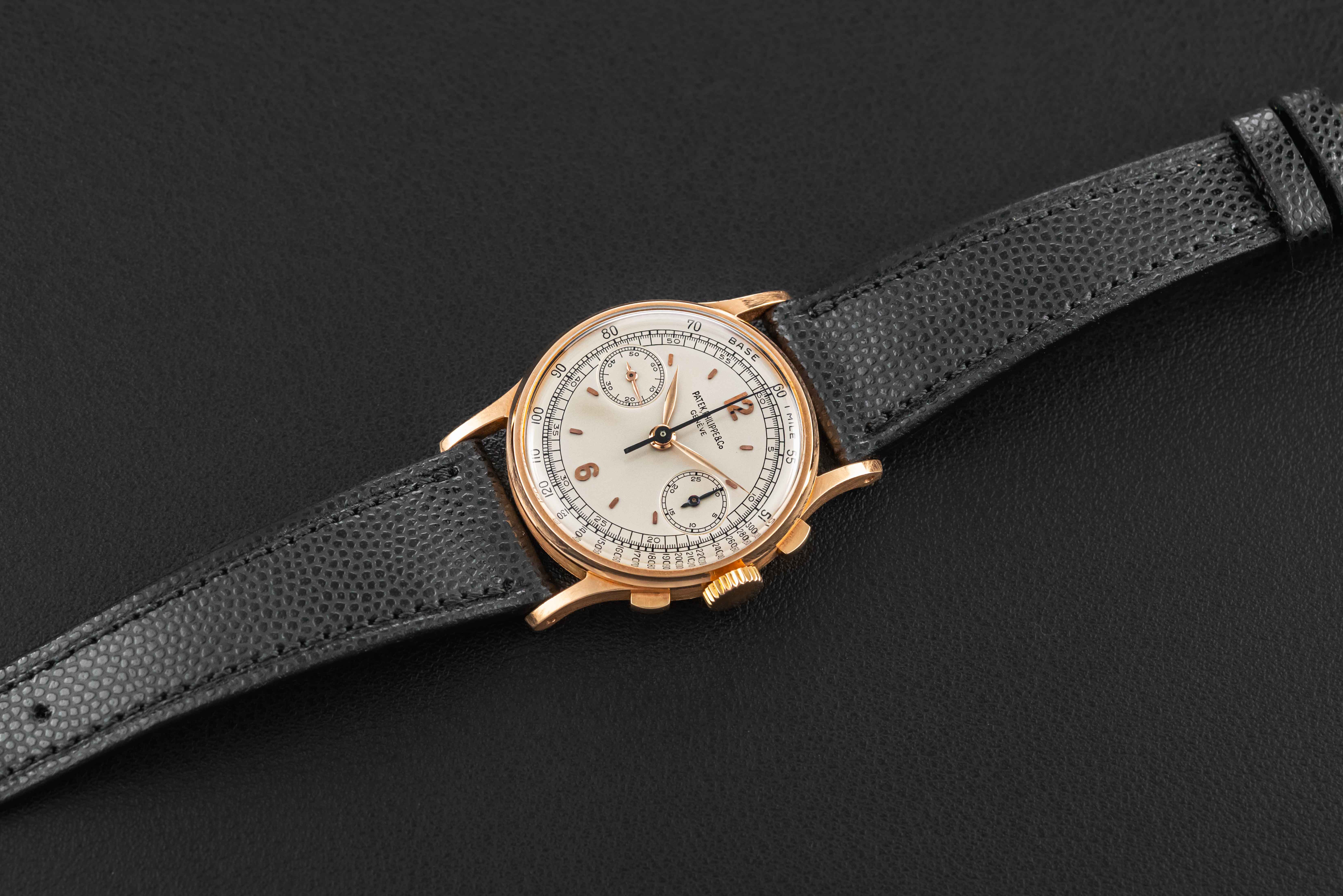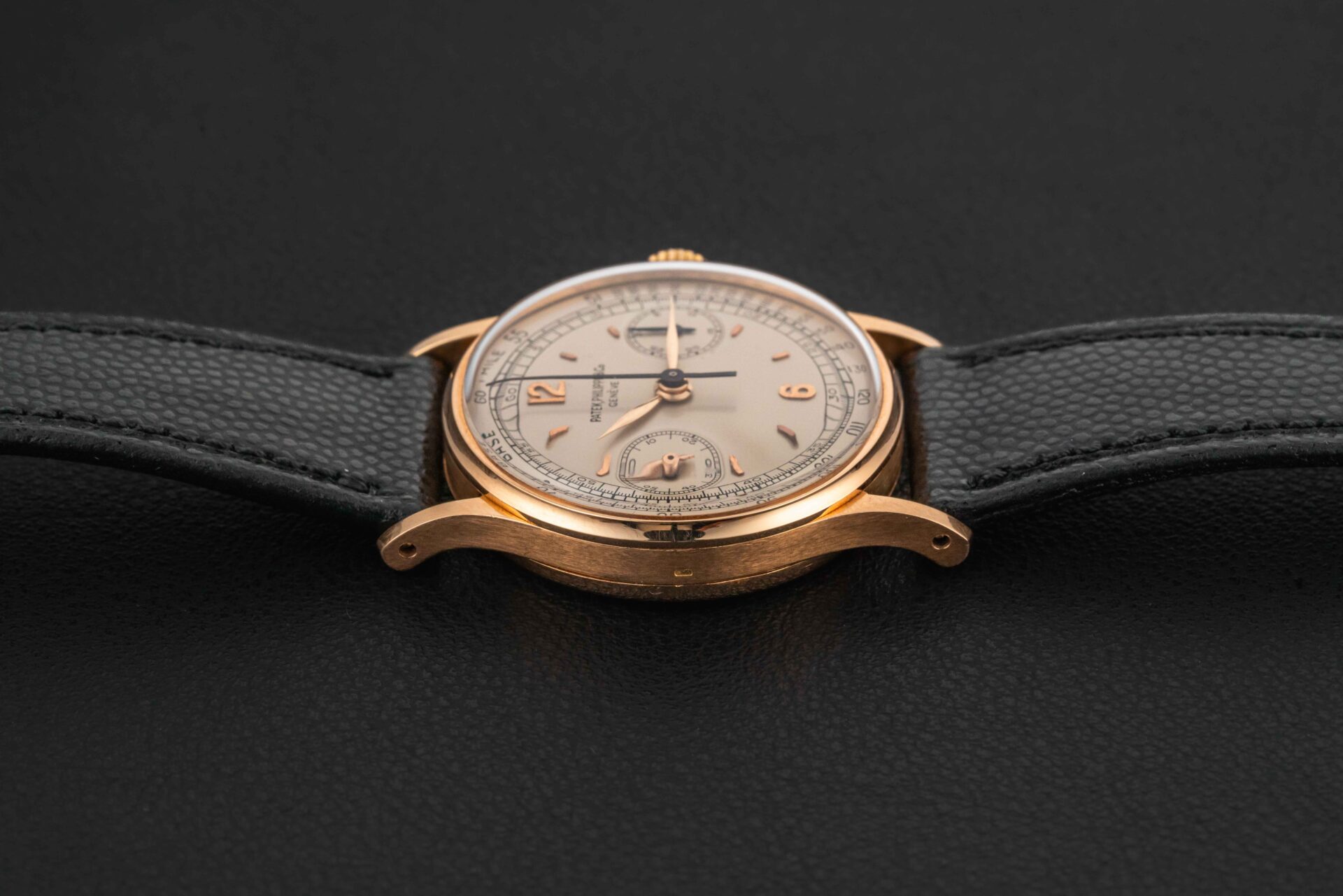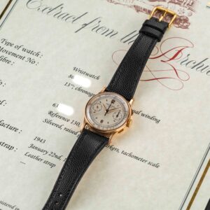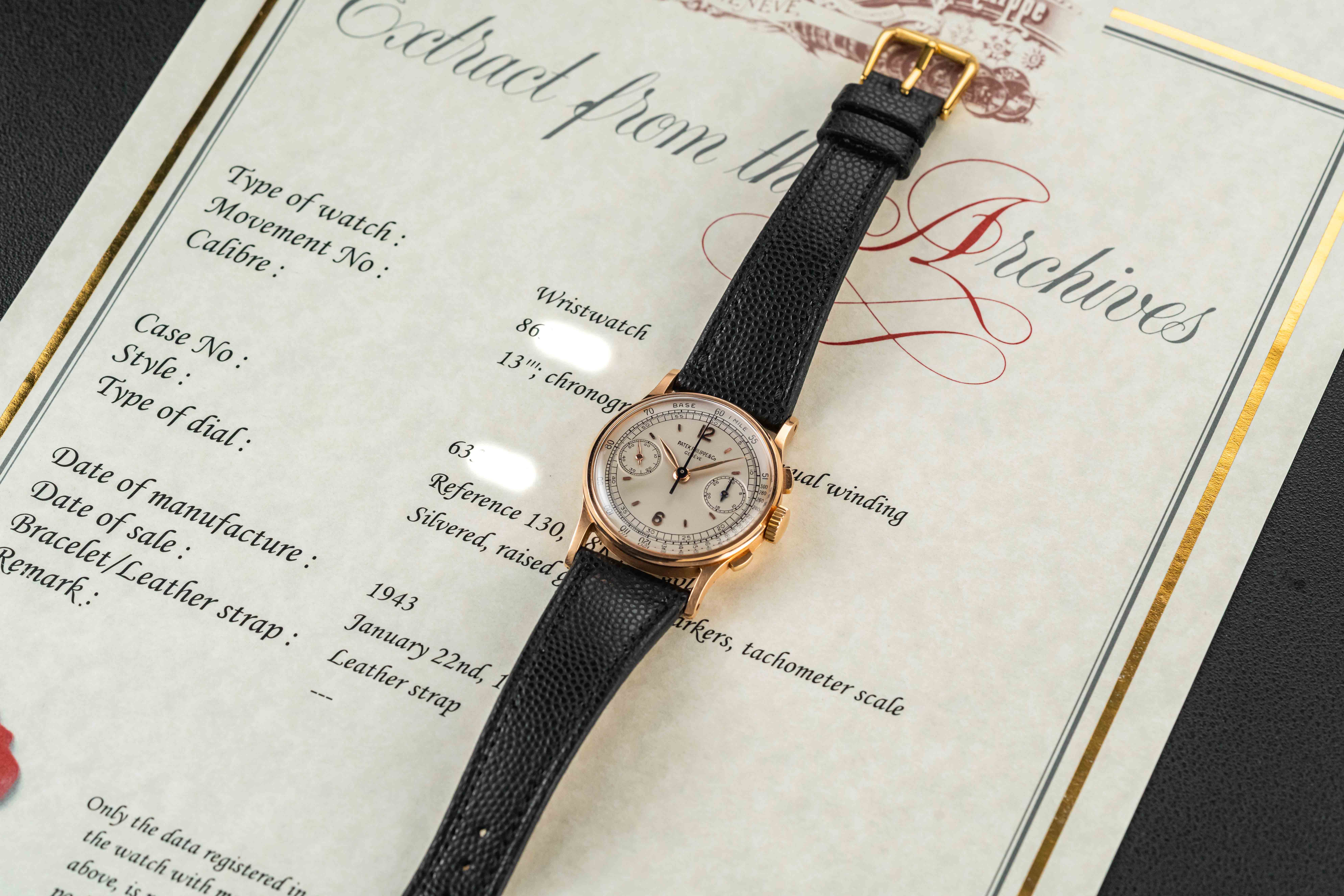 Up for grabs is an exceptional watch – the enigmatic Patek Philippe 130 chronograph, circa 1943, housed in 18kt rose gold. According to the Extract of the Archives, this watch was produced in 1943, and subsequently delivered in 1945.