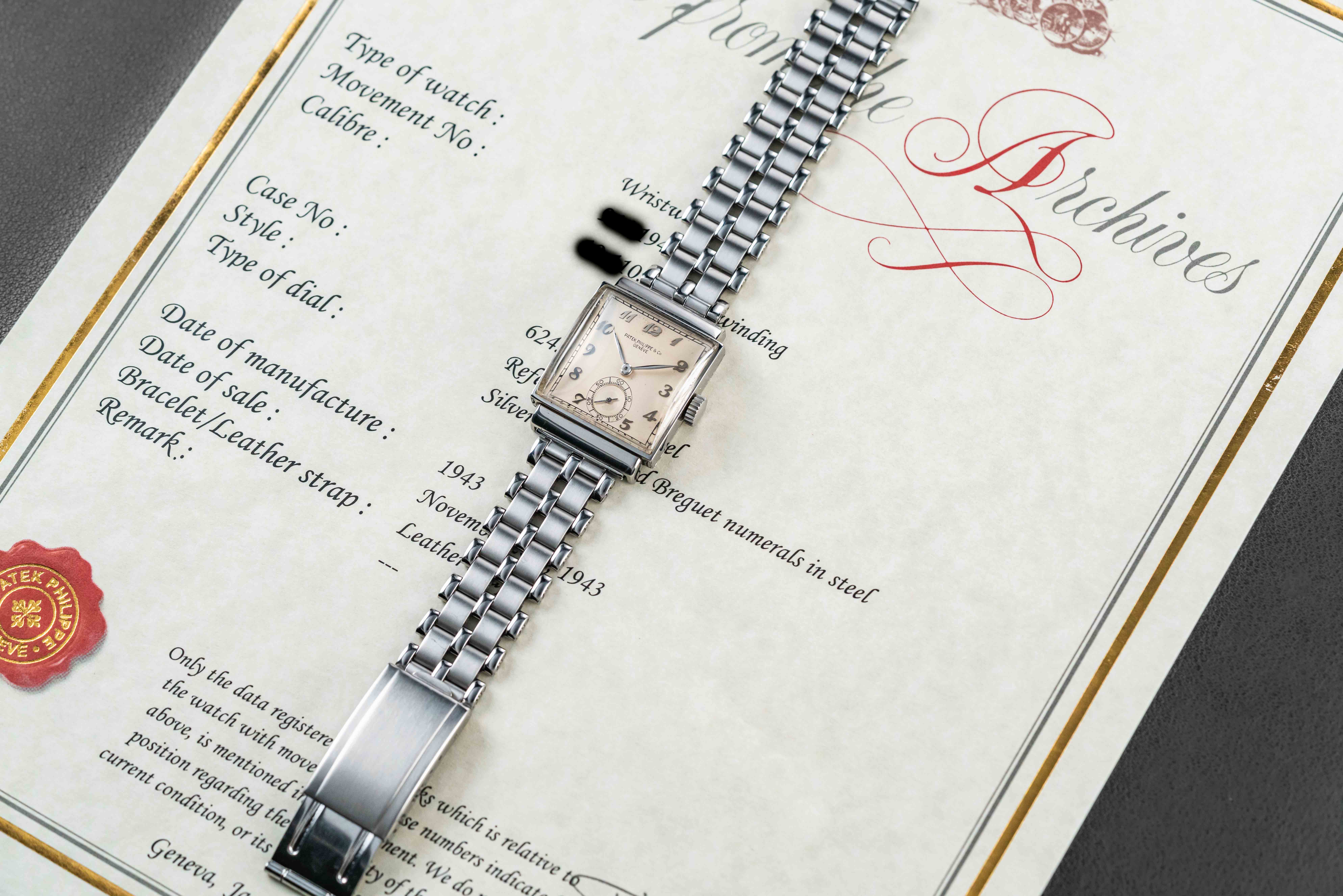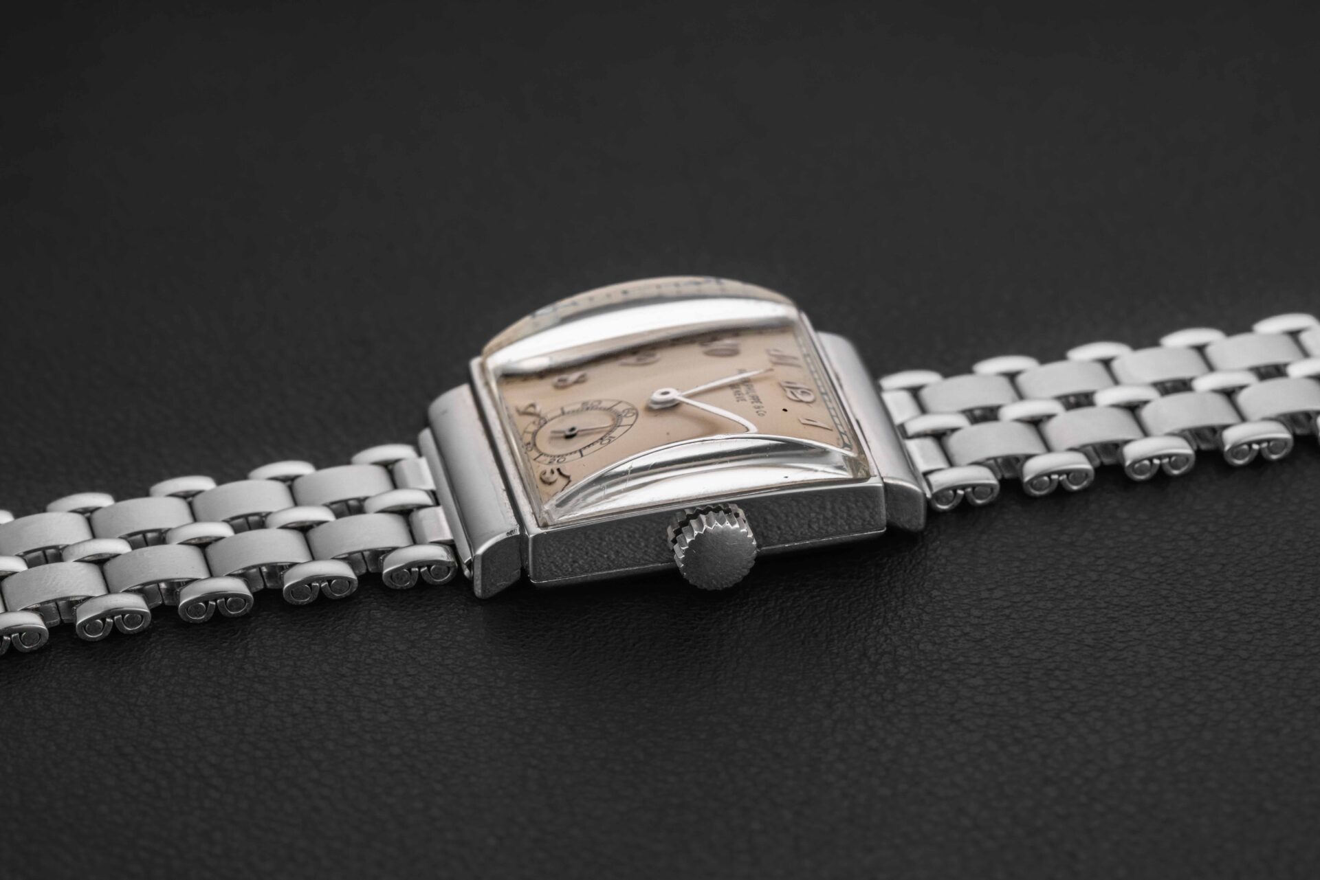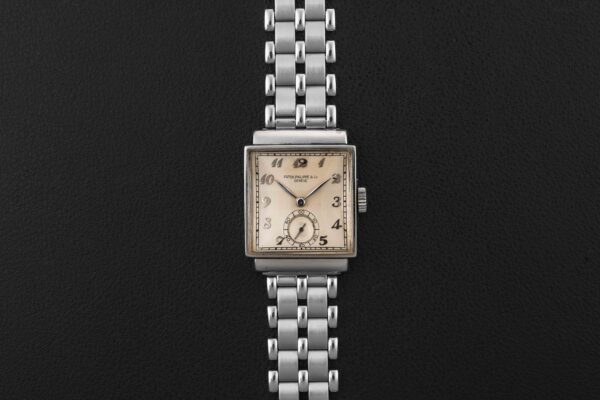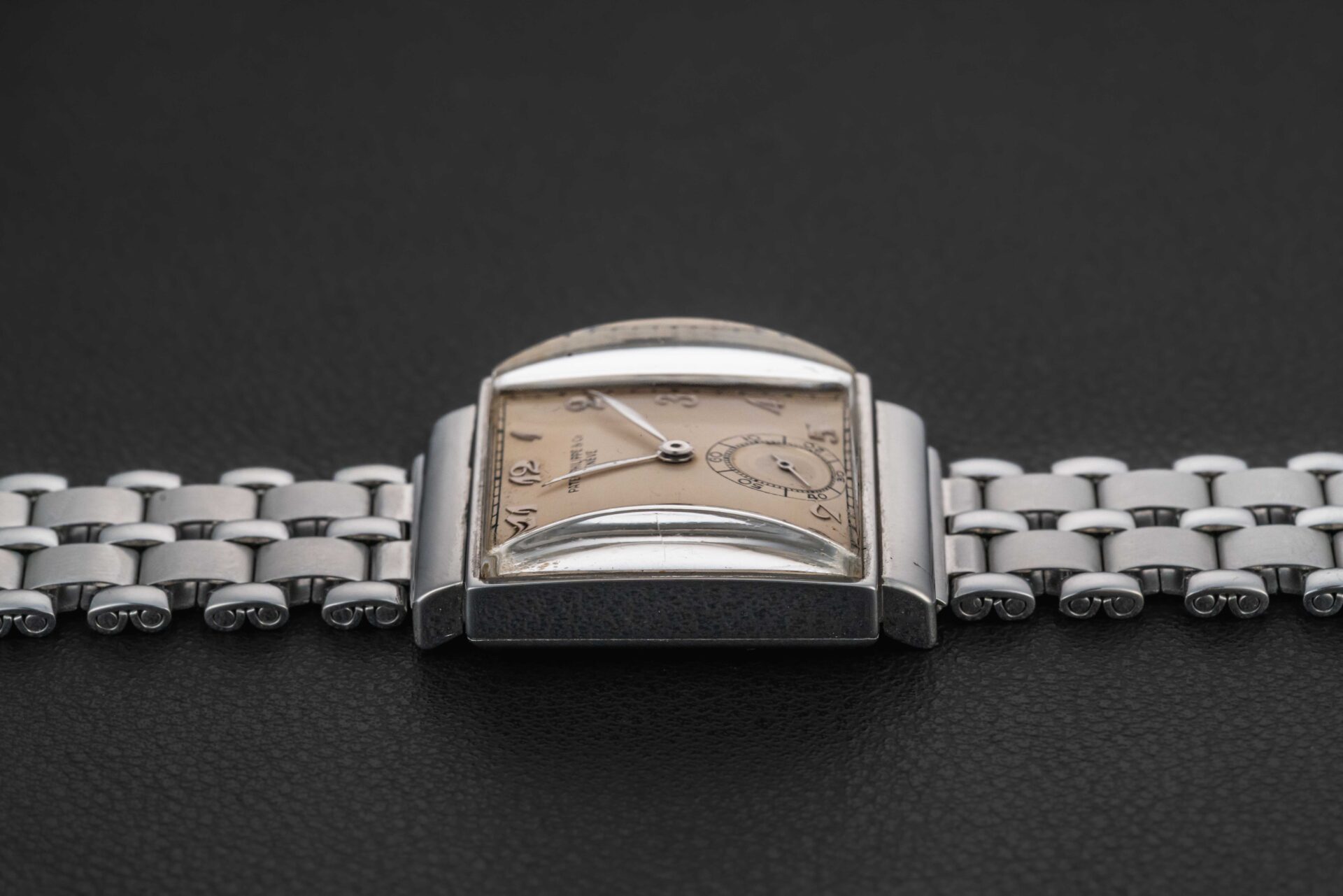 Offered here is an extremely rare and interesting 1940s Patek Philippe, given the reference 1408, and made in stainless steel. This particular reference was made in a square-shaped case with a squared-off lug style. The design of the crystal is extremely cool, with a curved and high-sitting presence, giving the watch a 3D effect. However, what sets this one apart is the dial, fit with ever-popular Breguet numerals. This watch is accompanied by an Extract of the Archives, confirming the production and delivery to 1943. The condition of this Patek Philippe is excellent, showing a strong case and lovely dial (with only very light patina from aging over the years), overall very well-preserved. This watch has been fit on a generic Private Eyes steel bracelet, and can be changed for a leather strap upon request.