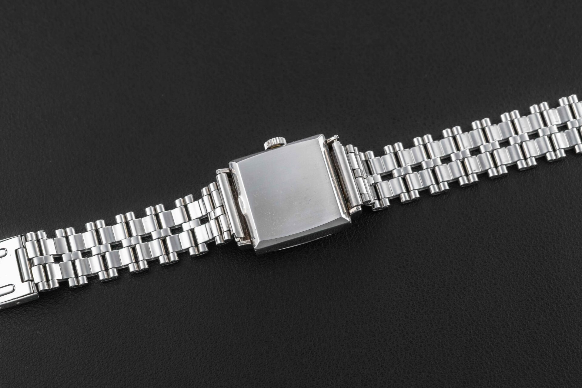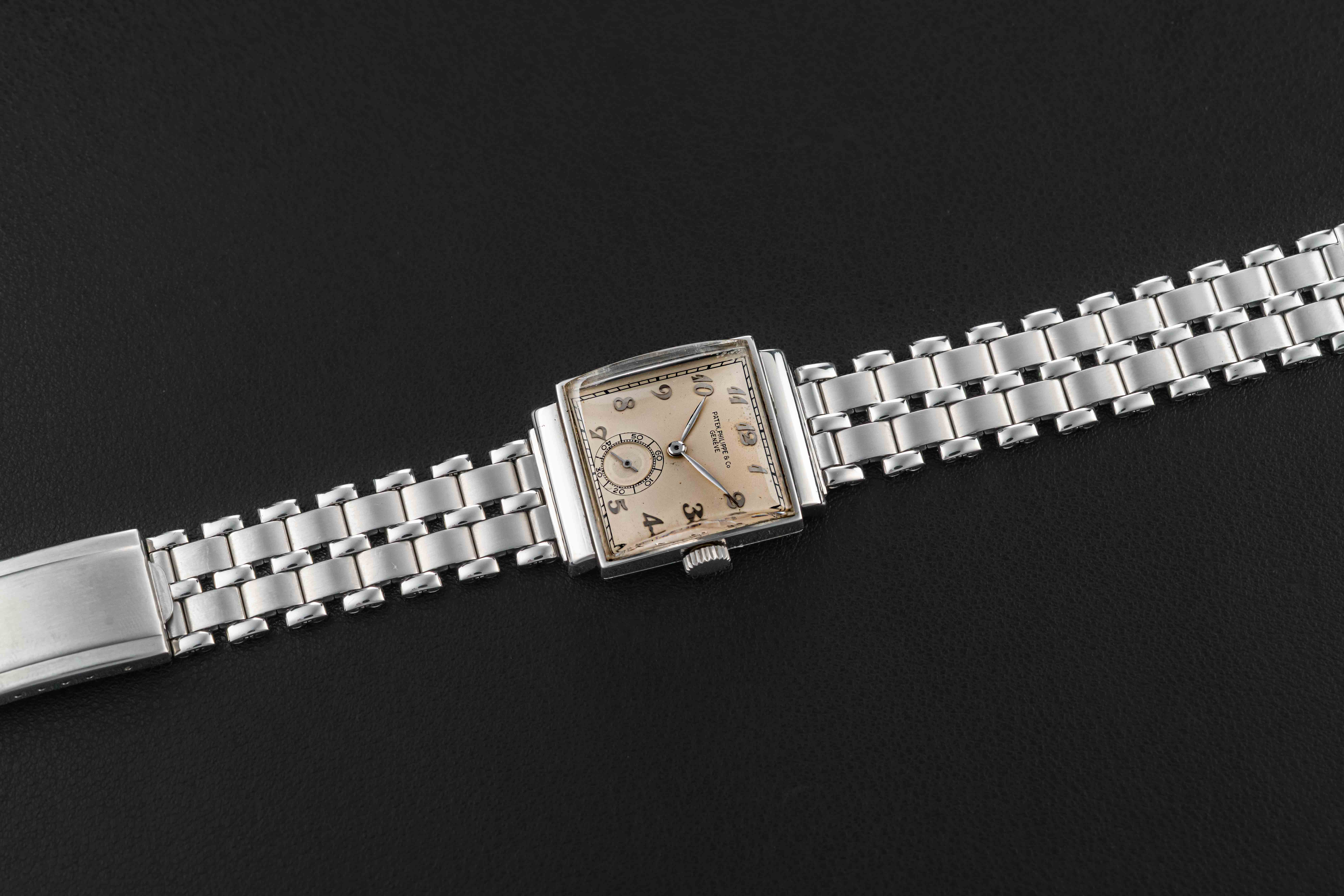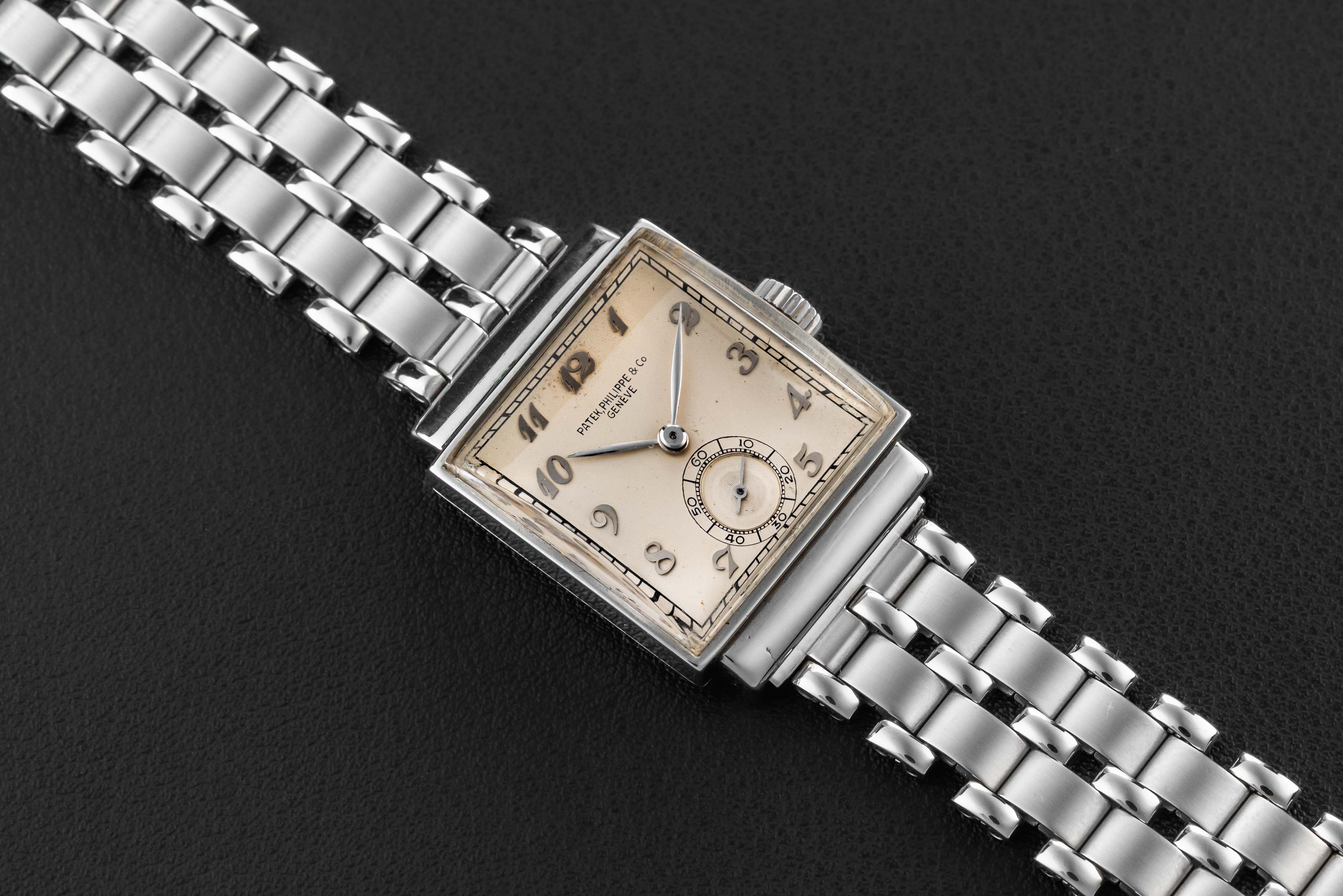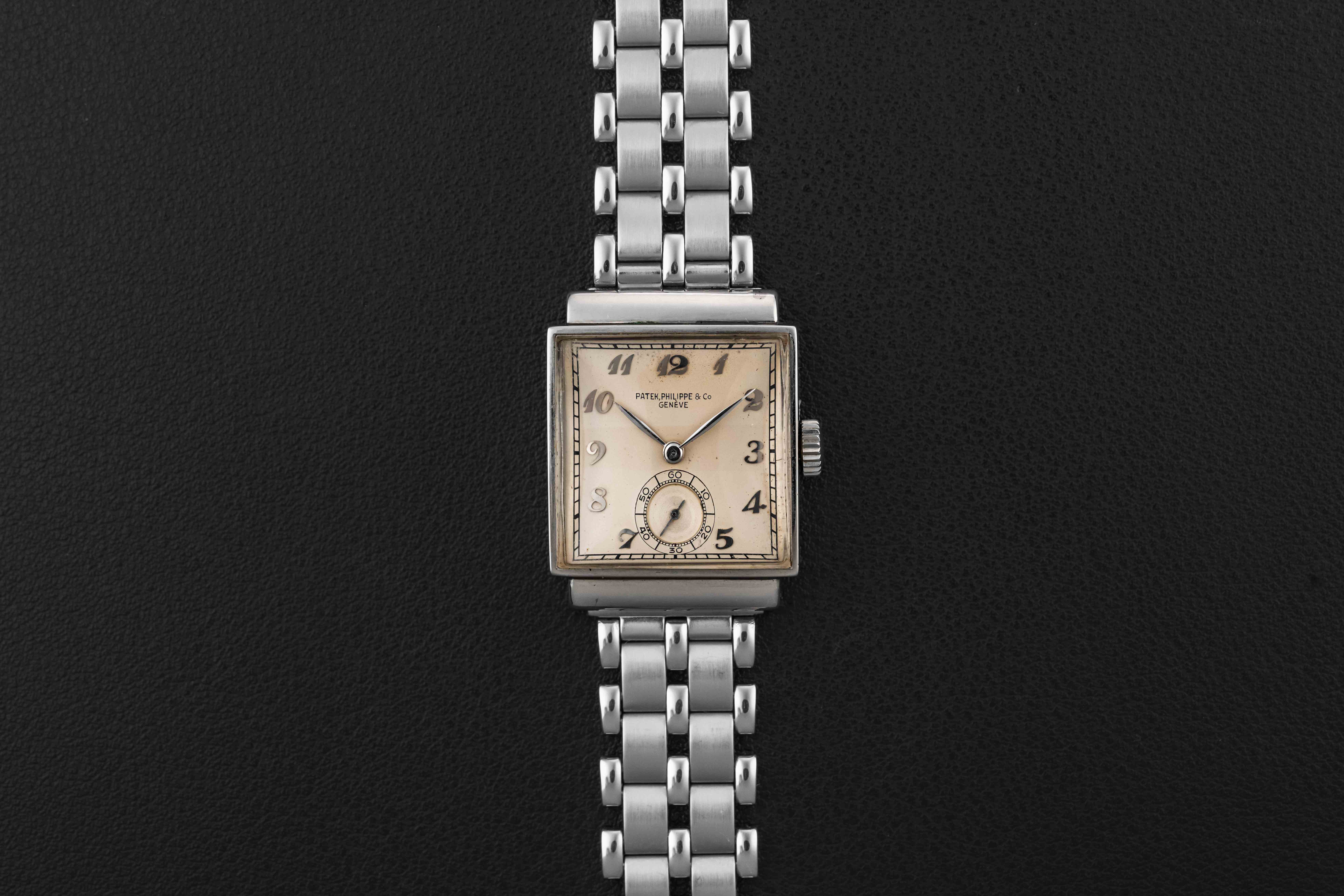 Offered here is an extremely rare and interesting 1940s Patek Philippe, given the reference 1408, and made in stainless steel. This particular reference was made in a square-shaped case with a squared-off lug style. The design of the crystal is extremely cool, with a curved and high-sitting presence, giving the watch a 3D effect. However, what sets this one apart is the dial, fit with ever-popular Breguet numerals. This watch is accompanied by an Extract of the Archives, confirming the production and delivery to 1943. The condition of this Patek Philippe is excellent, showing a strong case and lovely dial (with only very light patina from aging over the years), overall very well-preserved. This watch has been fit on a generic Private Eyes steel bracelet, and can be changed for a leather strap upon request.