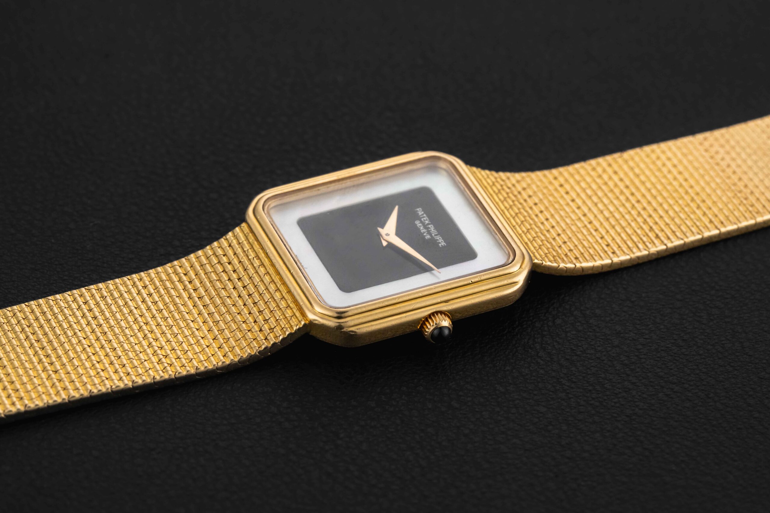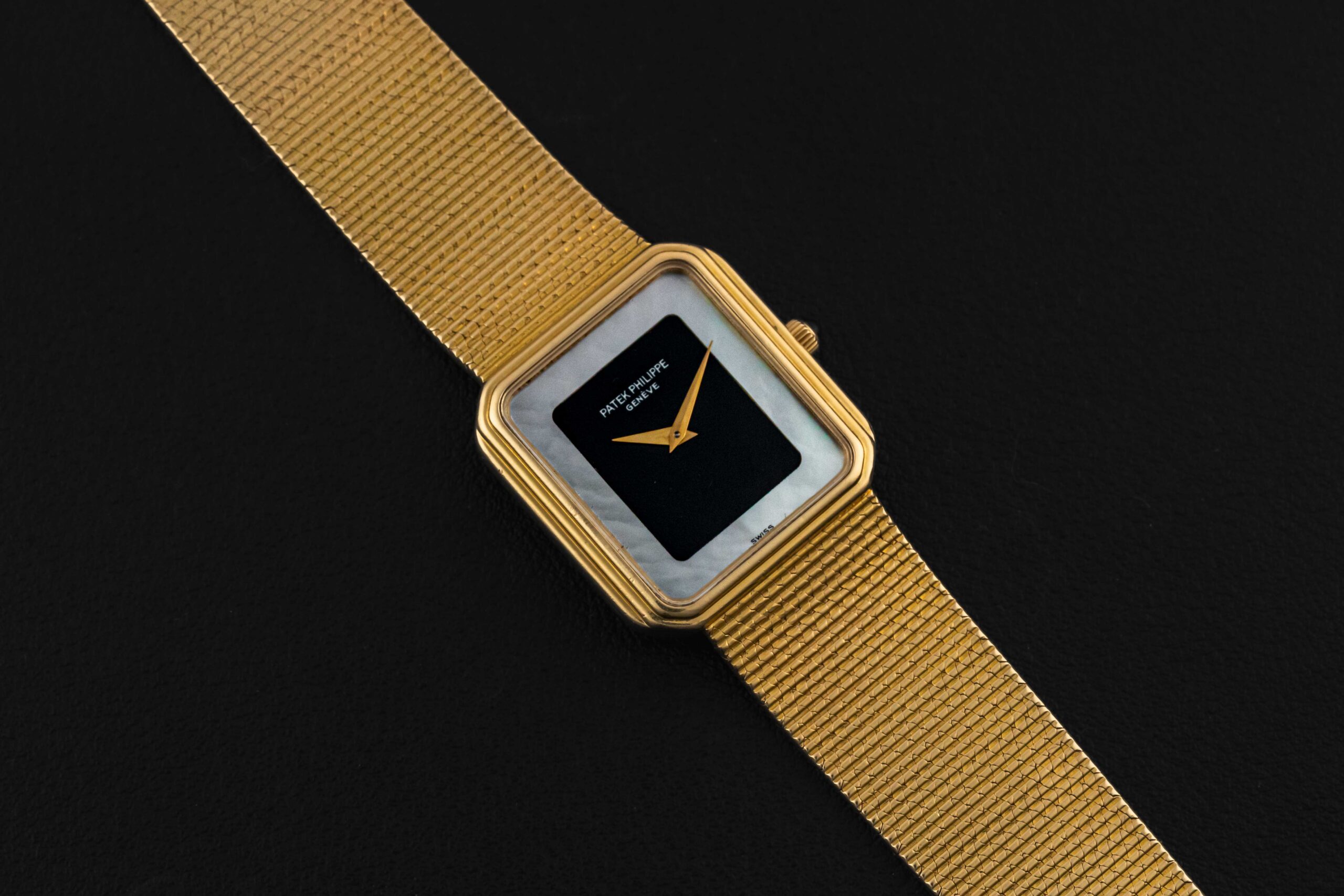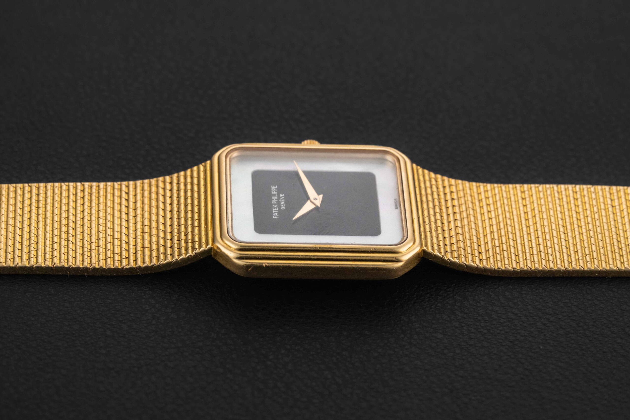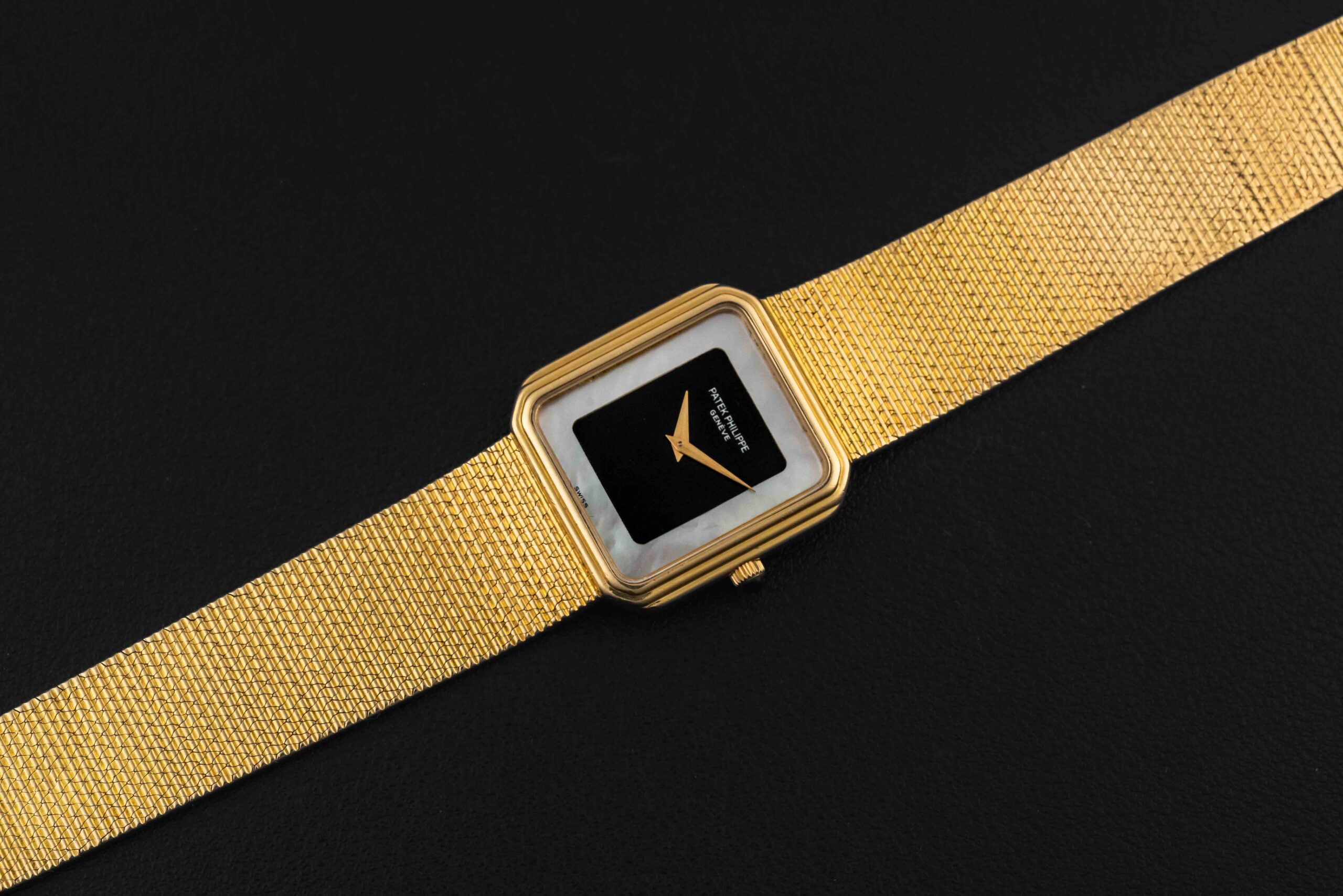 Up for grabs is a striking 1970s Patek Philippe rectangular watch, given the reference 3859/1. This particular watch was fit in a Gondolo-style rectangular 18kt yellow gold case, with stepped bezel and matching integrated bracelet. However, what sets this reference apart is the fitment of a stunning mother-of-pearl and onyx dial. This particular example is in excellent vintage condition, seemingly unpolished, and with a blemish and crack-free dial. The bracelet appears unsized and will fit a large wrist.
