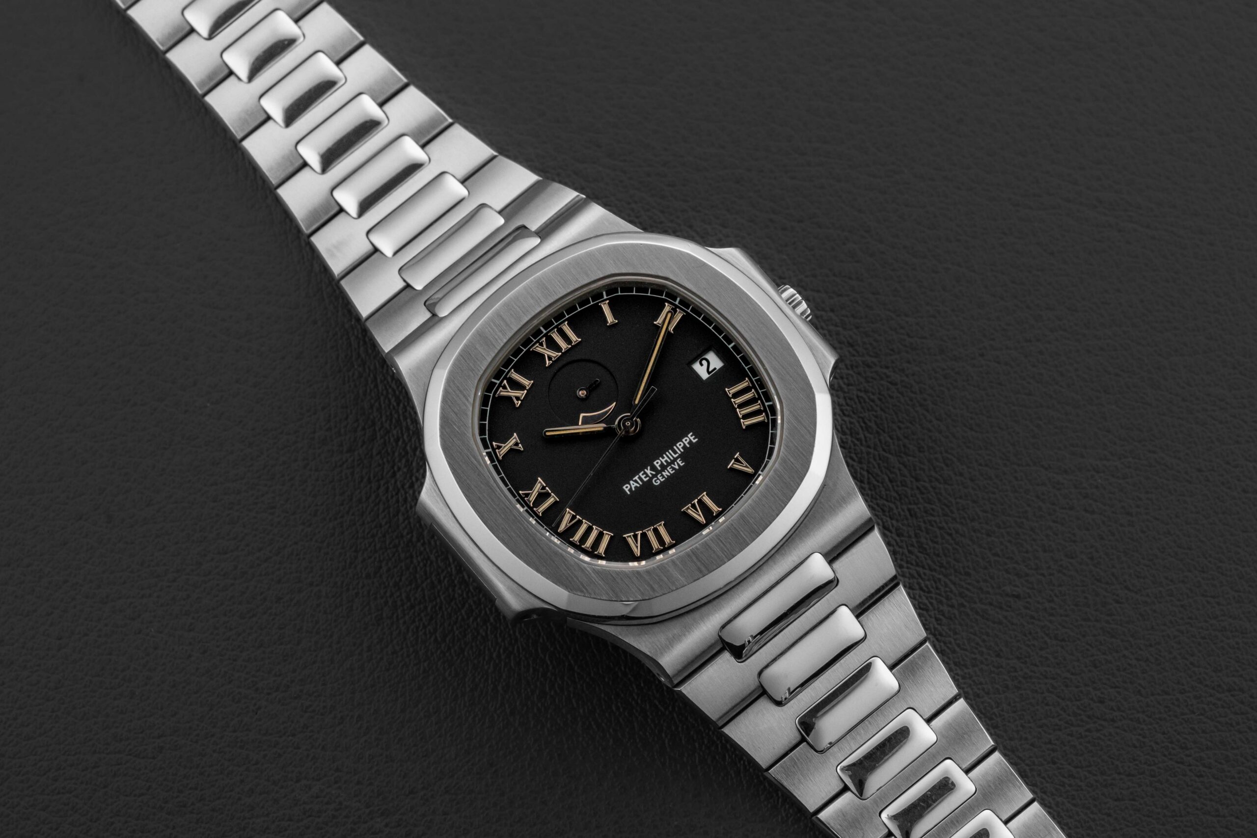 Offered here is a very nice example of a Patek Phillipe “Jumbo” Nautilus, the Reference 3710/1A, originally sold in 1999. These jumbo Nautilus have exploded in popularity as of late, and are considered by many to be the best design of Gerald Genta. The 3710, in particular, was an interesting deviation from the standard dial, showing a sleek black finish, paired against steel roman numeral indices and a power reserve indicator at the top of the dial; the 3710 was the first Nautilus to feature a complication (beyond just a date function). This Patek Phillipe Nautilus is in great condition. The case appears maybe lightly polished once in the past, and the dial is without flaws.