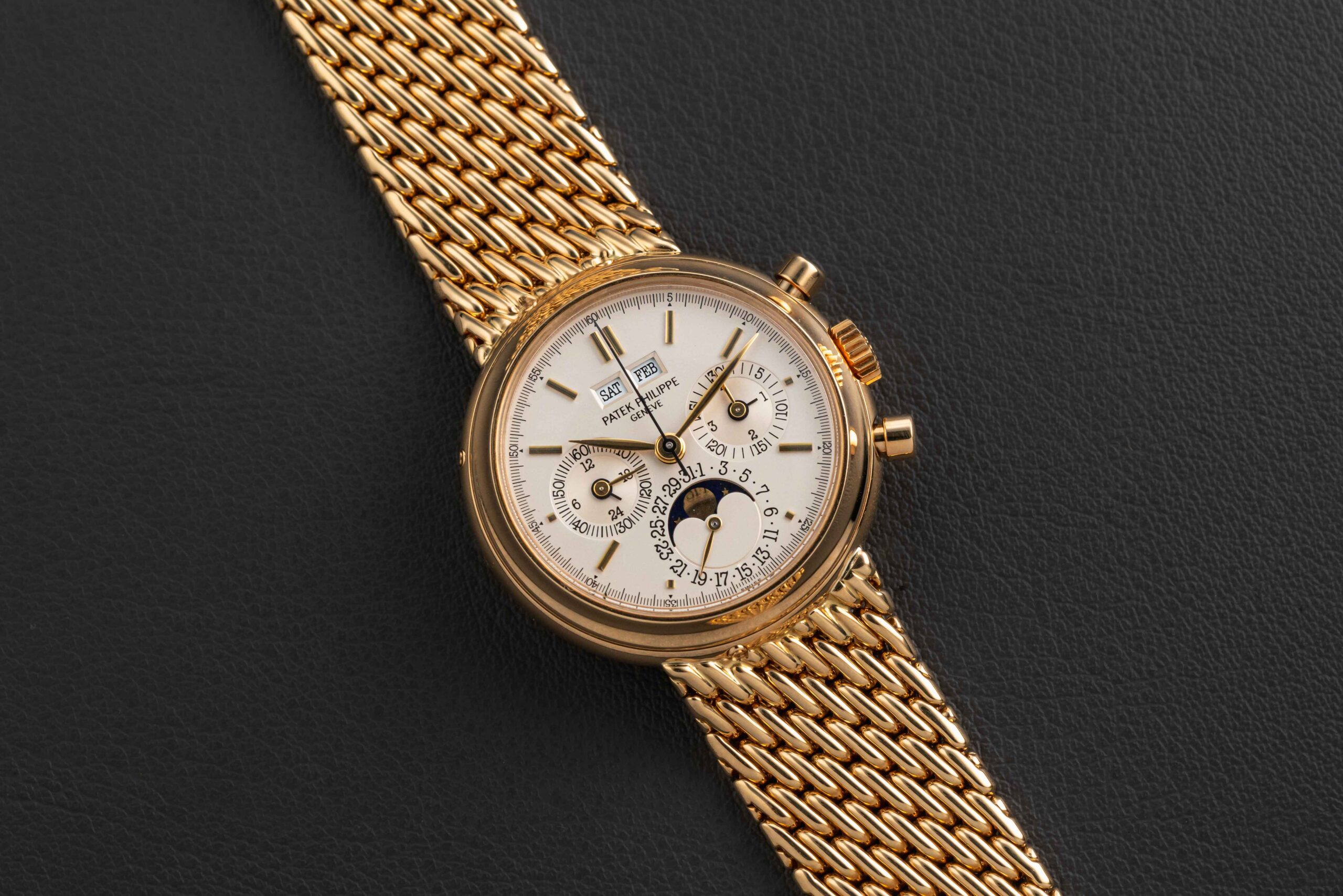 This Patek Philippe Perpetual Calendar Chronograph is in excellent vintage condition. The case – if it was ever polished – was done very lightly, with crisp hallmarks. Likewise, the dial is immaculate, with no flaws. Further, the bracelet will fit an approximate 7.5″ wrist.