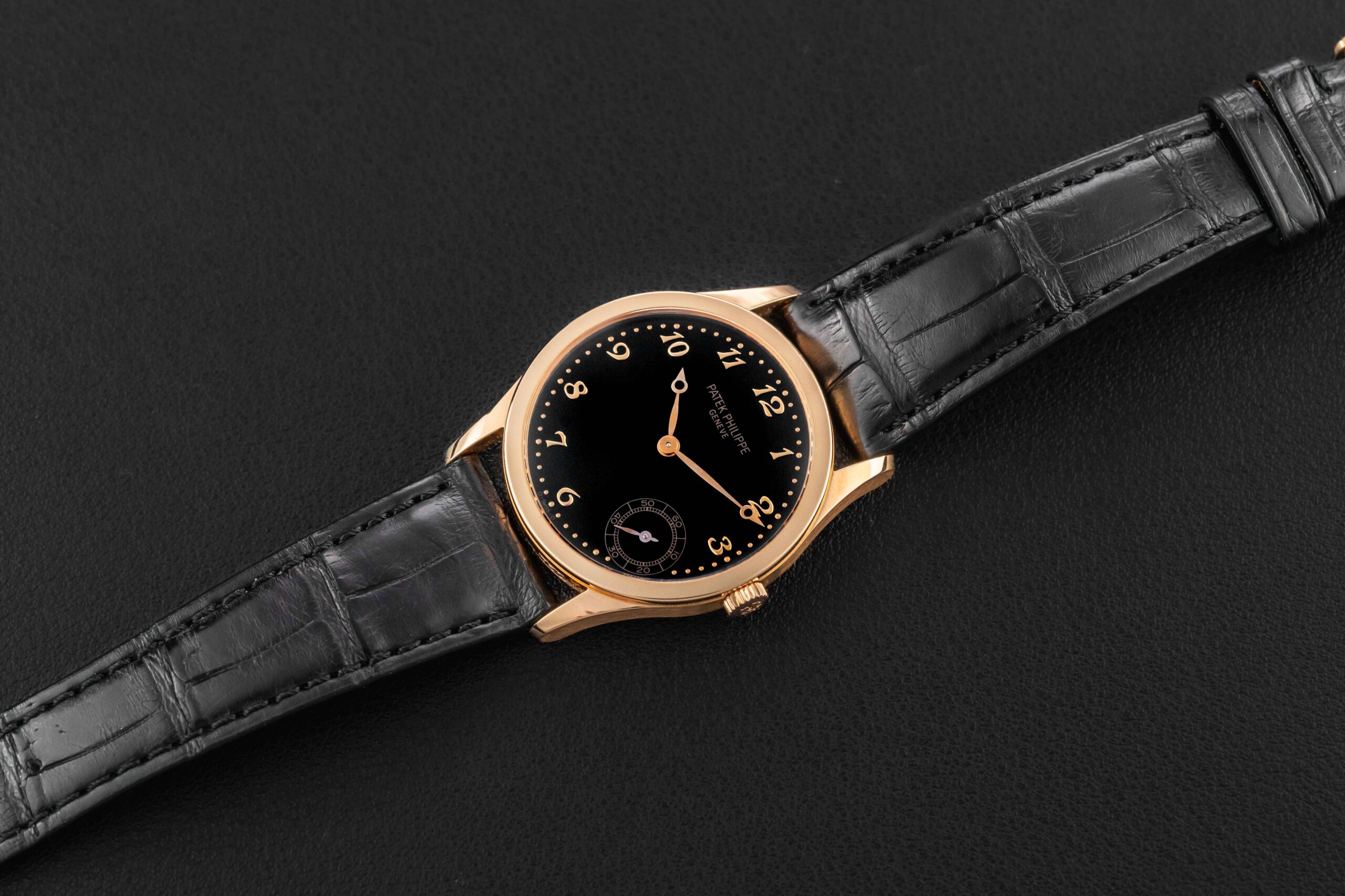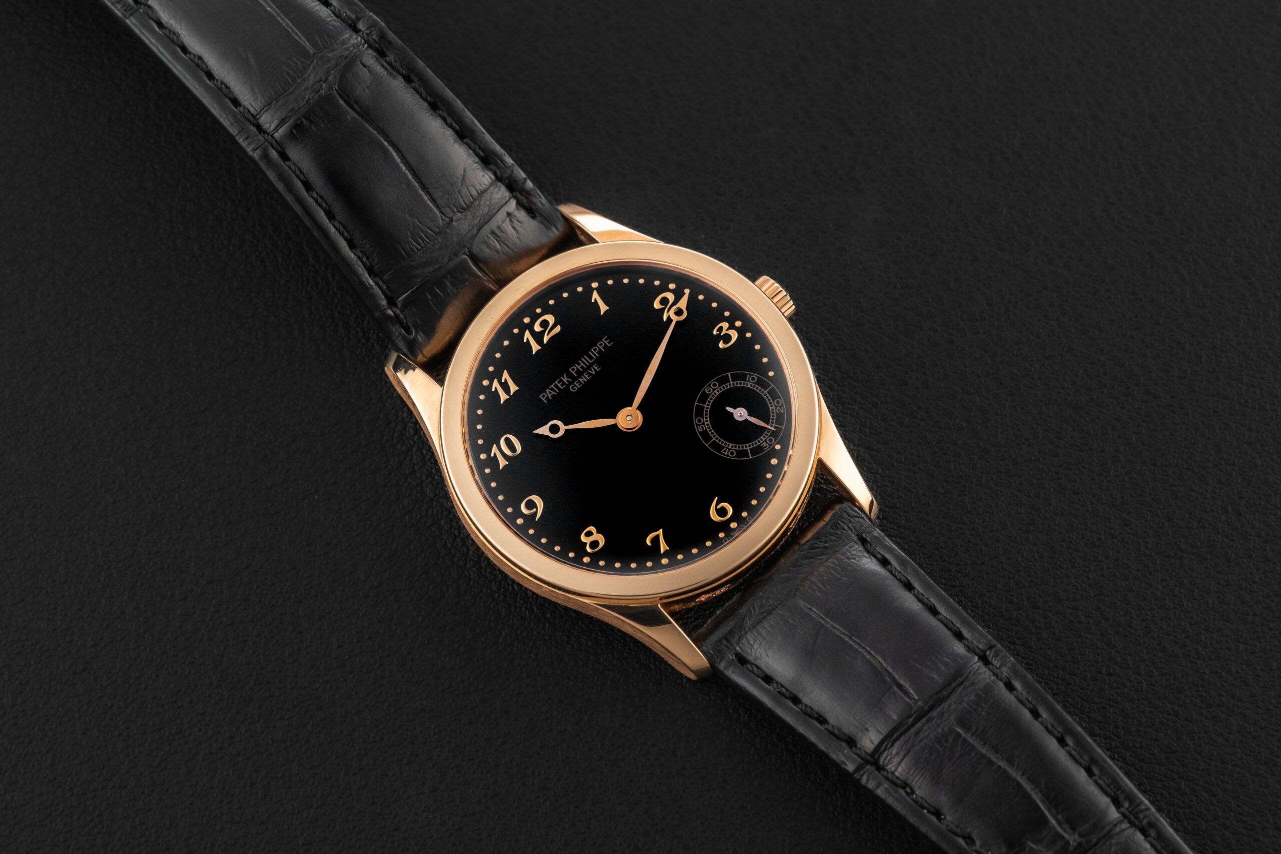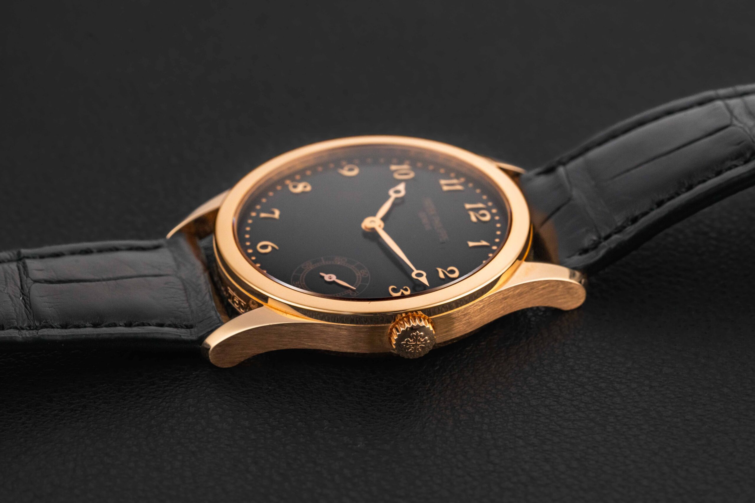Up for grabs is a lovely Patek Philippe Calatrava, given the reference 5026, produced in 18kt rose gold. The reference 5026 comes in 34mm and began production around 1997 until 2002; this watch features Breguet-style numerals and hands alongside a striking black dial. The watch itself remains in superb condition, remaining unpolished with strong hallmarks. Further, the watch remains with its original Patek Philippe rose gold tang buckle. This particular example comes with an Extract from the Archives of Patek Philippe, confirming production of the watch in 1999.