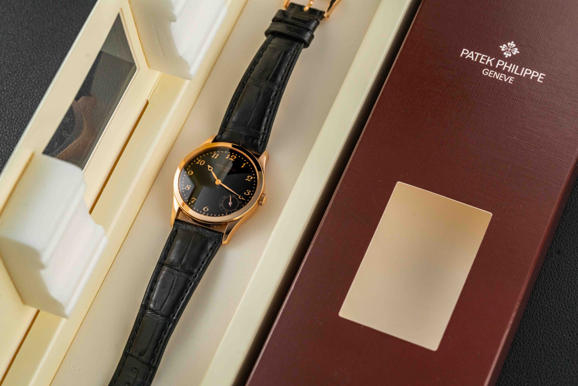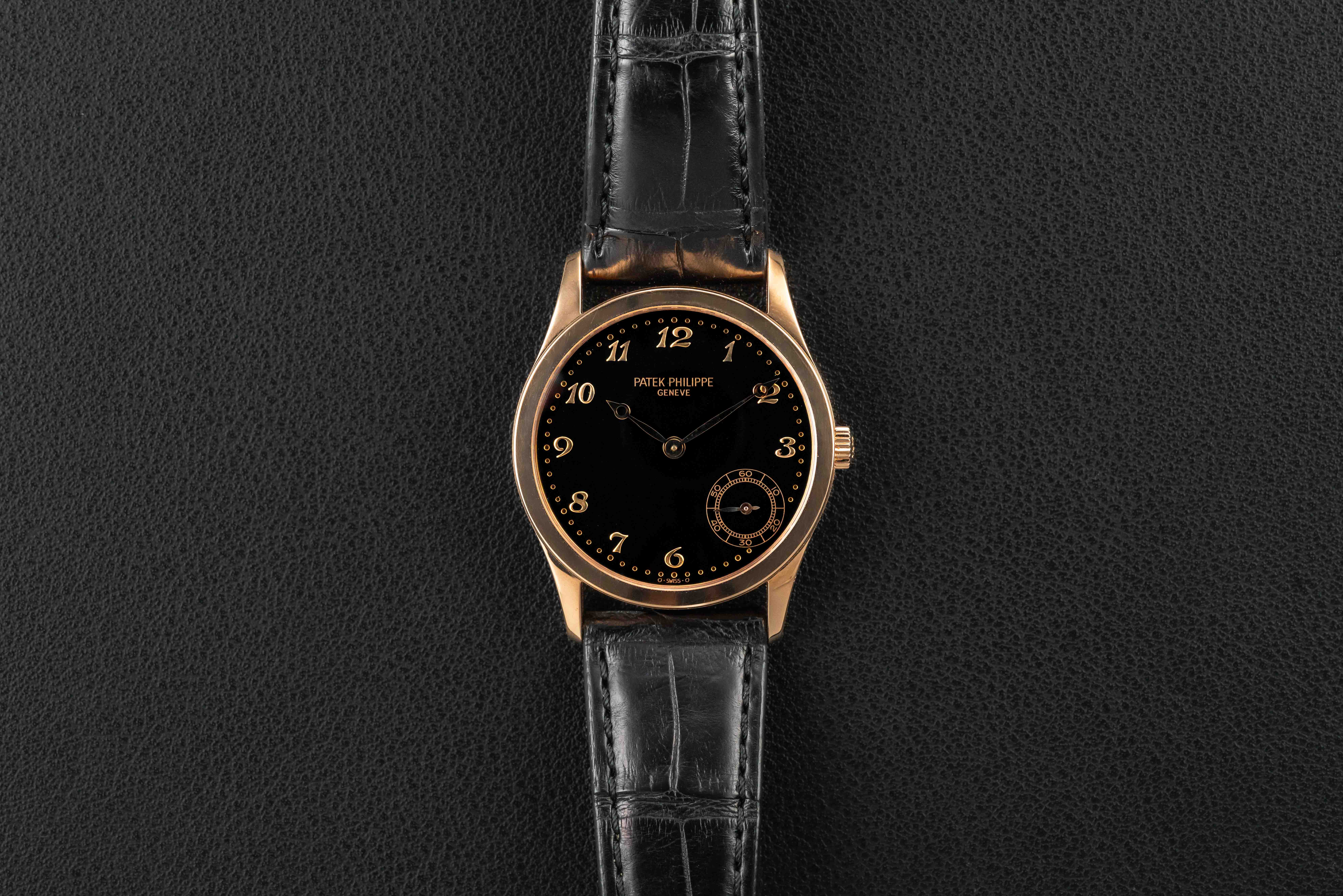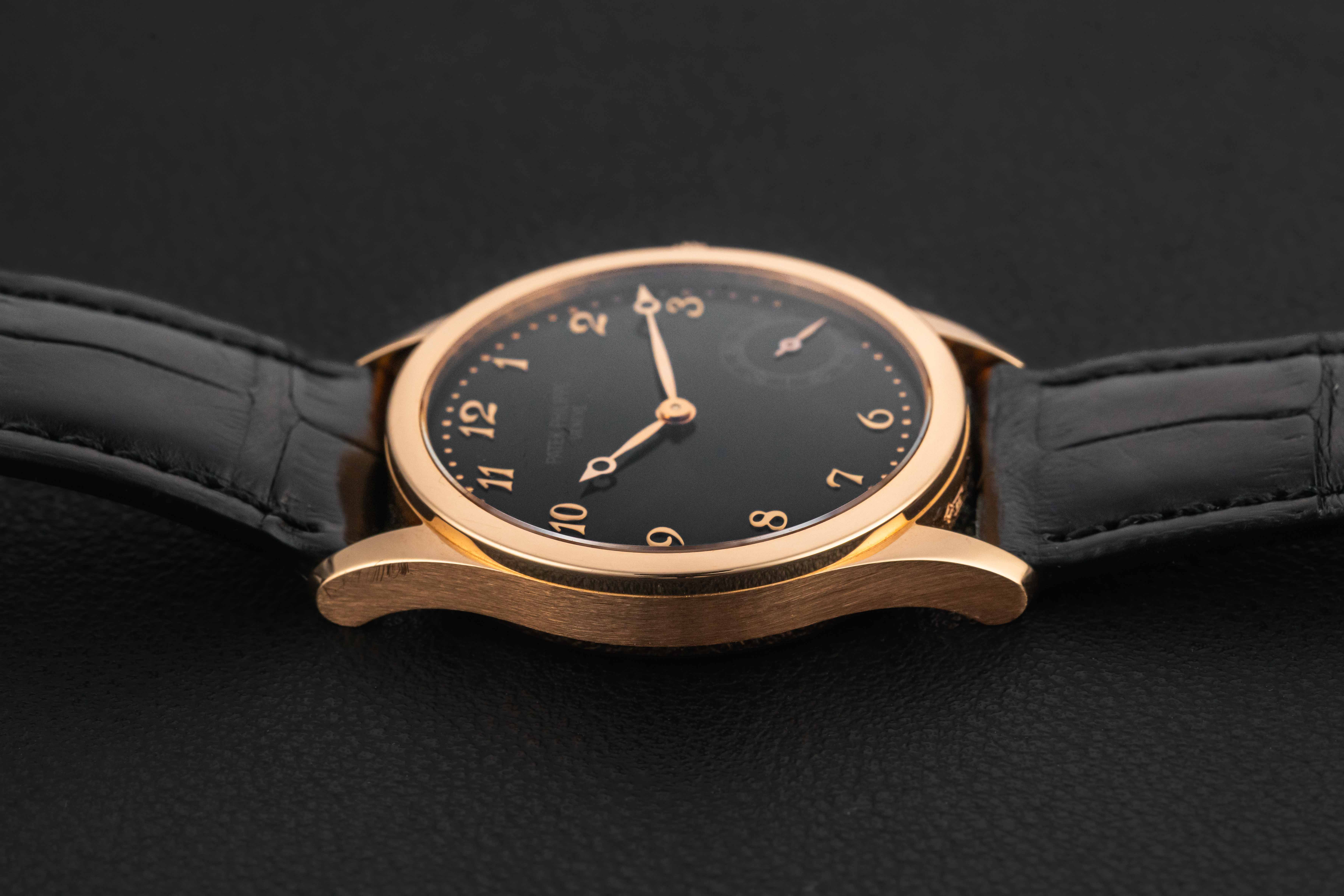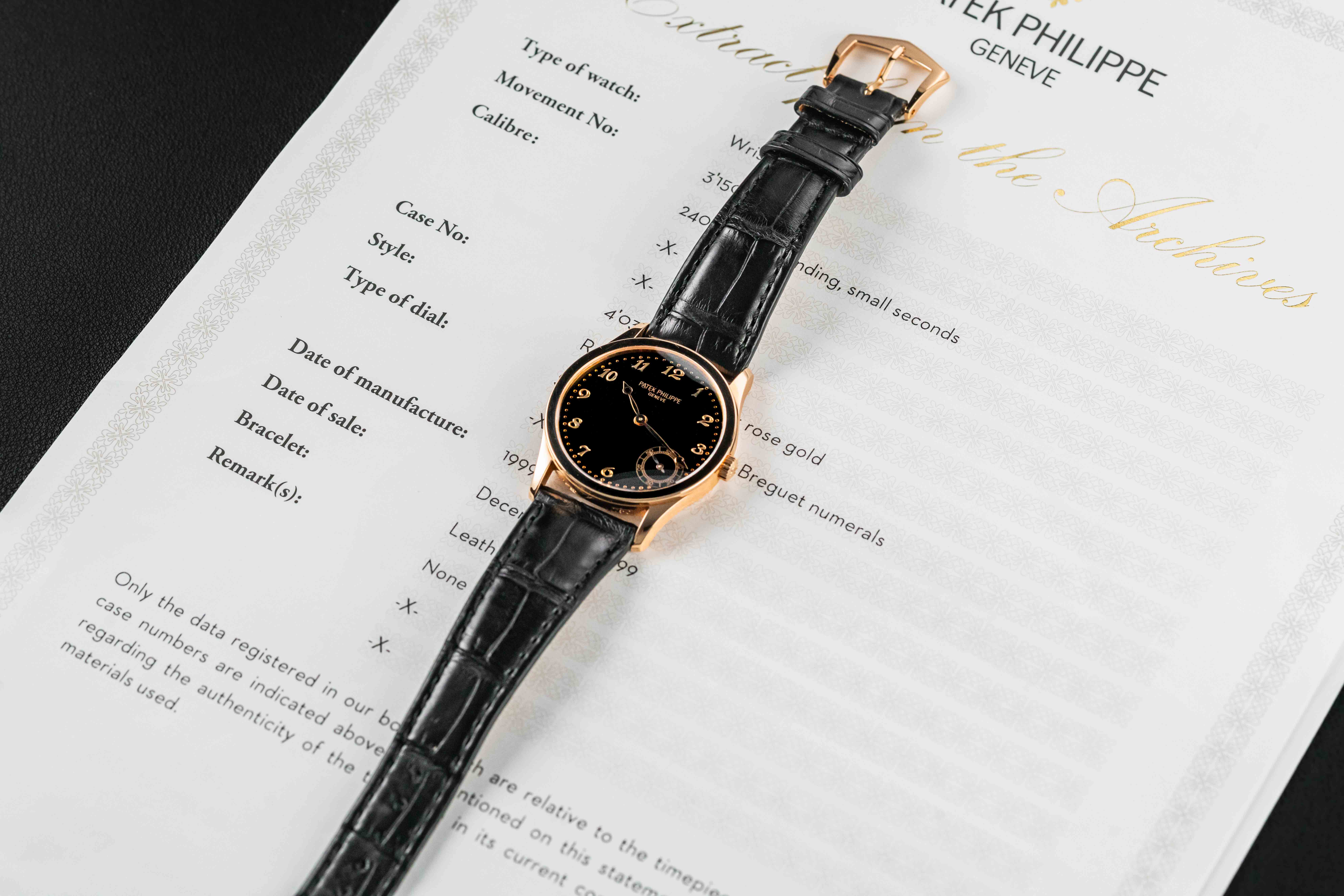 Up for grabs is a lovely Patek Philippe Calatrava, given the reference 5026, produced in 18kt rose gold. The reference 5026 comes in 34mm and began production around 1997 until 2002; this watch features Breguet-style numerals and hands alongside a striking black dial. The watch itself remains in superb condition, remaining unpolished with strong hallmarks. Further, the watch remains with its original Patek Philippe rose gold tang buckle. This particular example comes with an Extract from the Archives of Patek Philippe, confirming production of the watch in 1999.