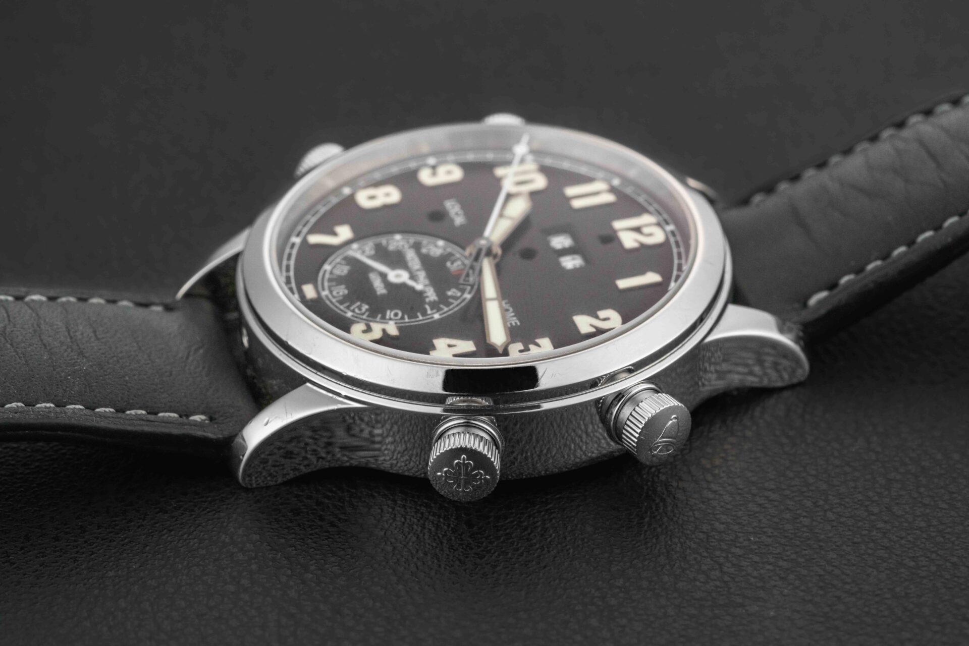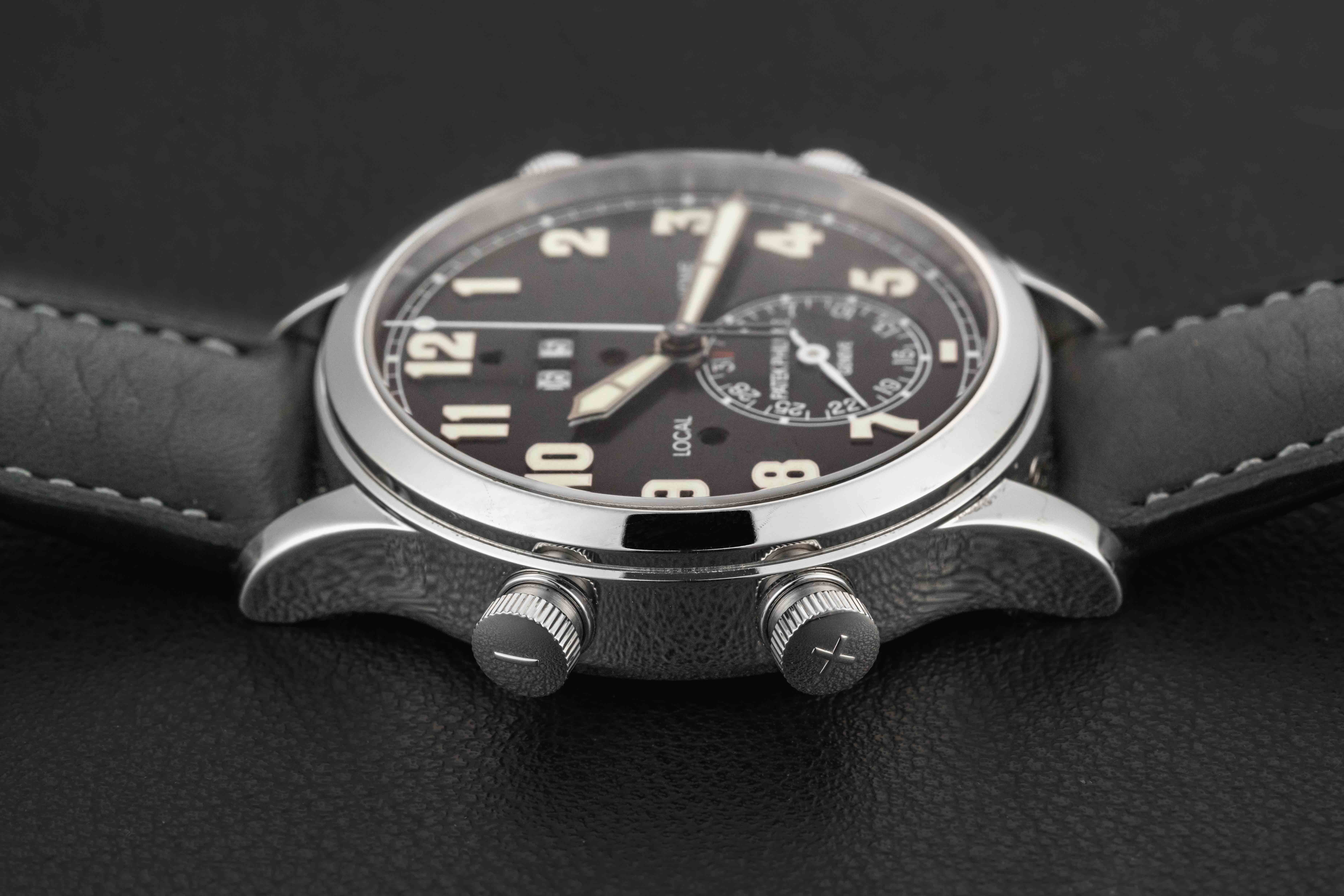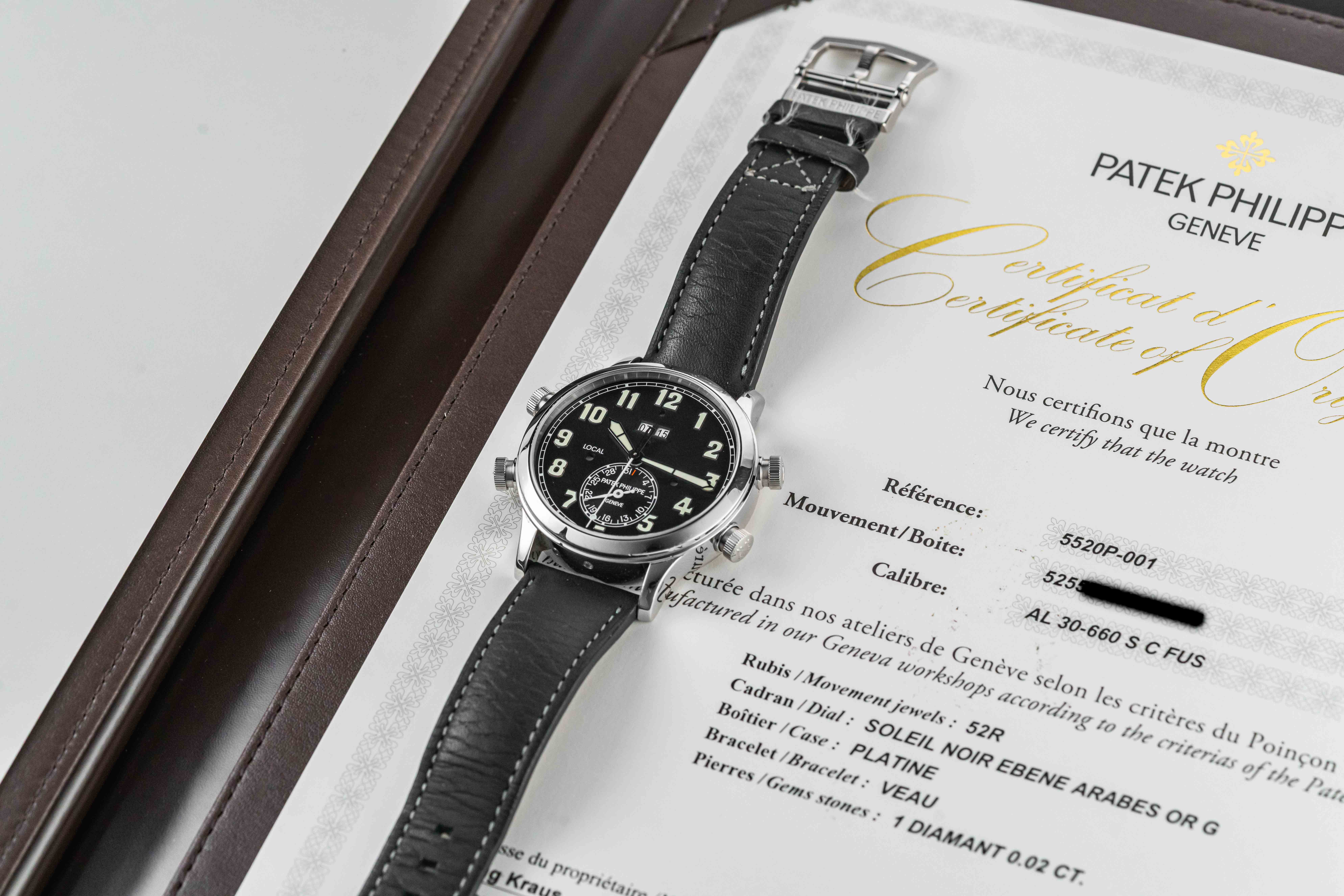 Up for grabs is a newer release from Patek Philippe, the reference 5520P, a “Calatrava-style Pilots’ watch” made in platinum. This model features a minute repeater-style alarm and a dual-time complication – local and home time indication, with day/night indication – making it a “grand complication” watch from the maker. This particular Patek Philippe is slightly used with little signs of wear and comes with its original Patek Philippe large display book, Certificate of Origin, booklets (as pictured), and solid extra caseback.