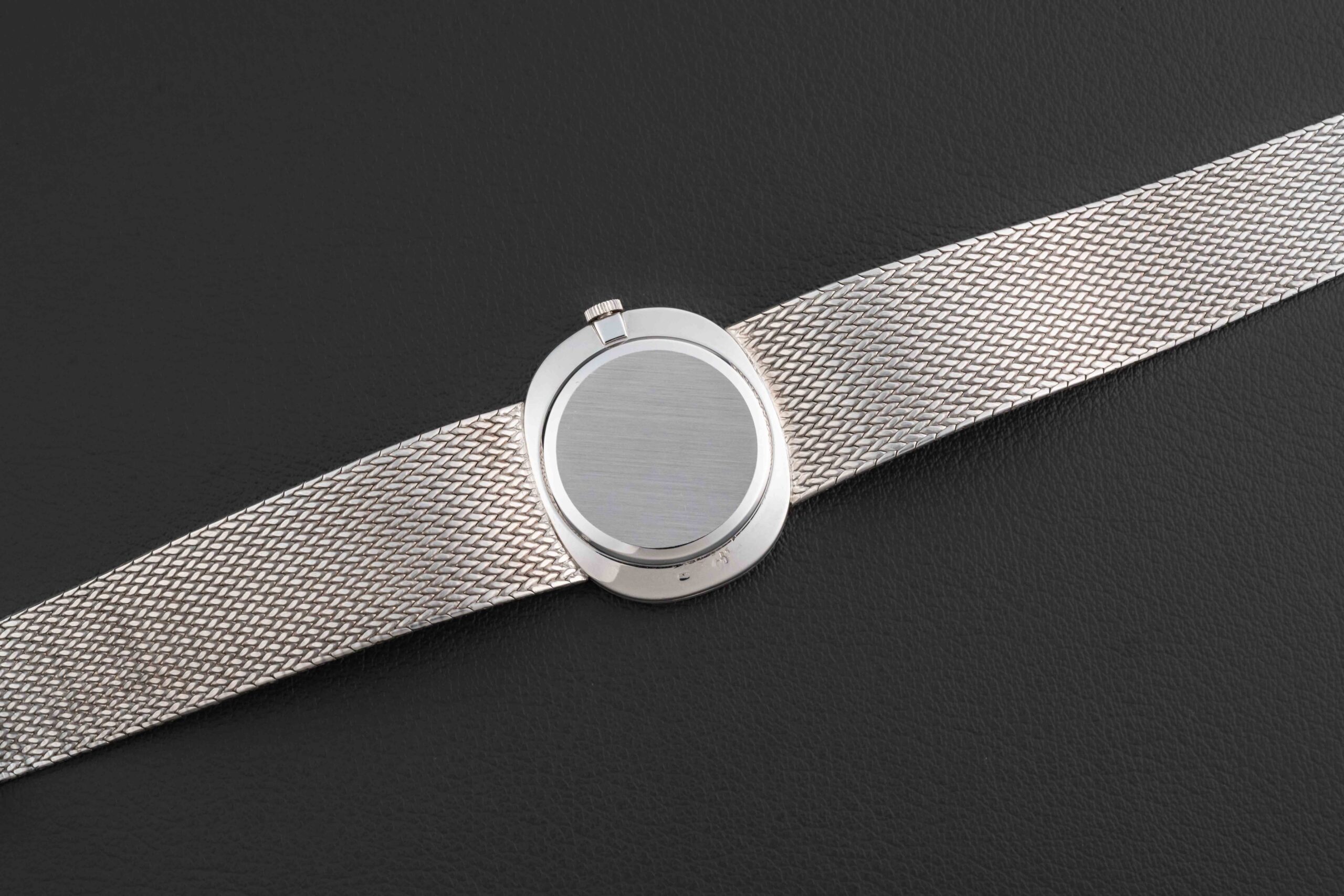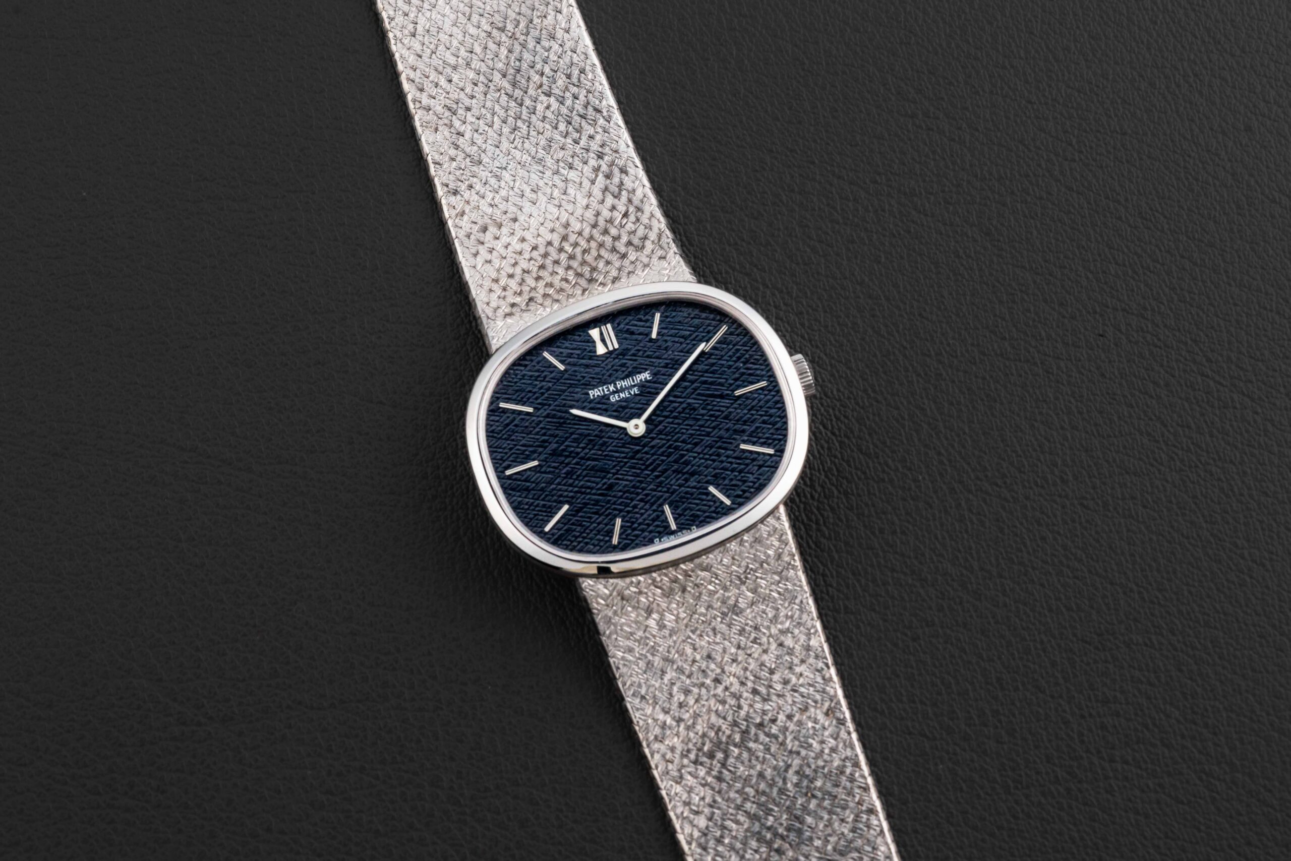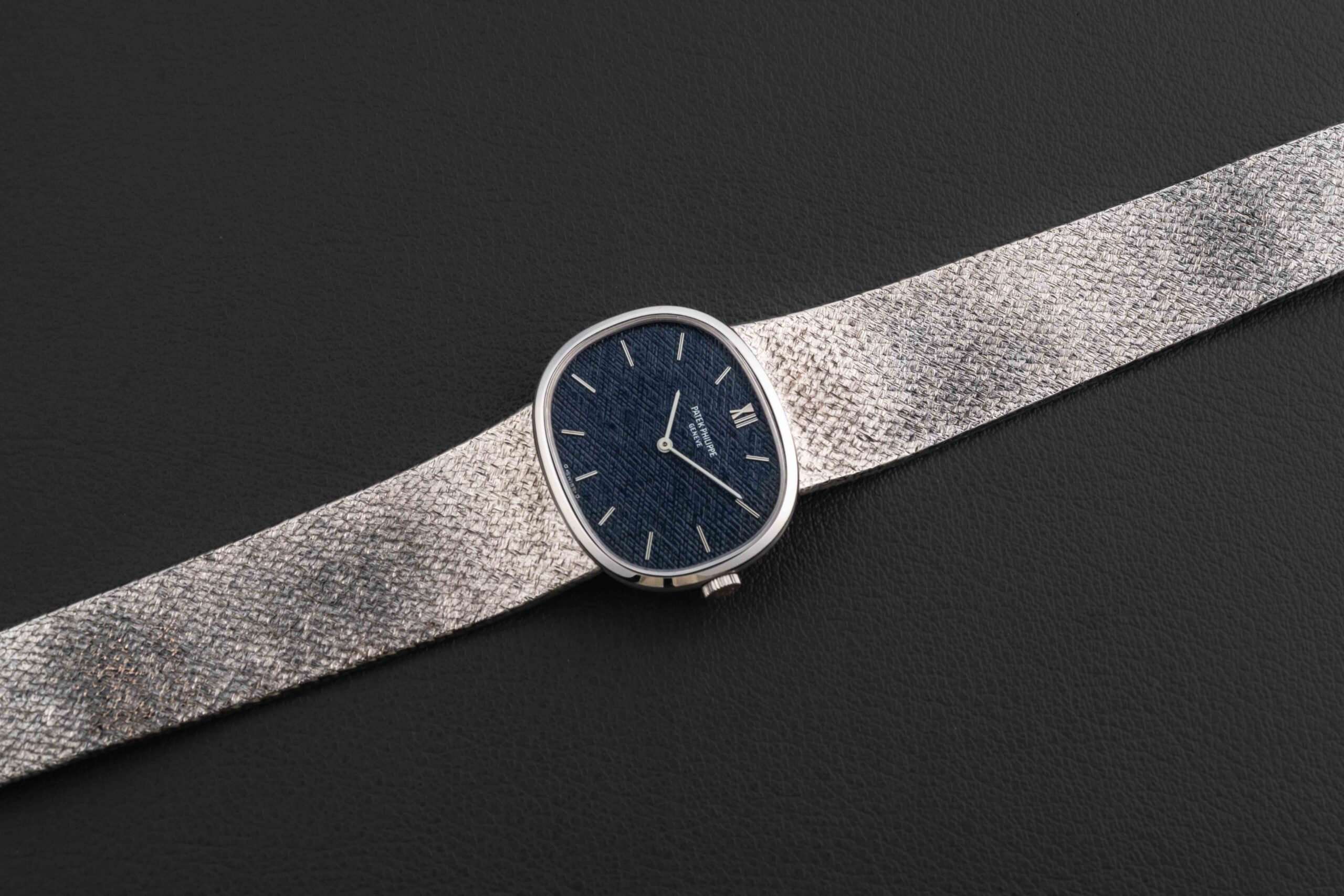 Offered here is a stunning and uncommon Patek Philippe Ellipse, circa 1970s, reference 3745/2. This particular Ellipse was made in 18kt whitegold with a matching whitegold integrated bracelet, and fit with a ribbed dark blue/grey dial. The condition of this Patek Philippe Ellipse is excellent, with no major wear to the case or dial; the bracelet appears unsized.