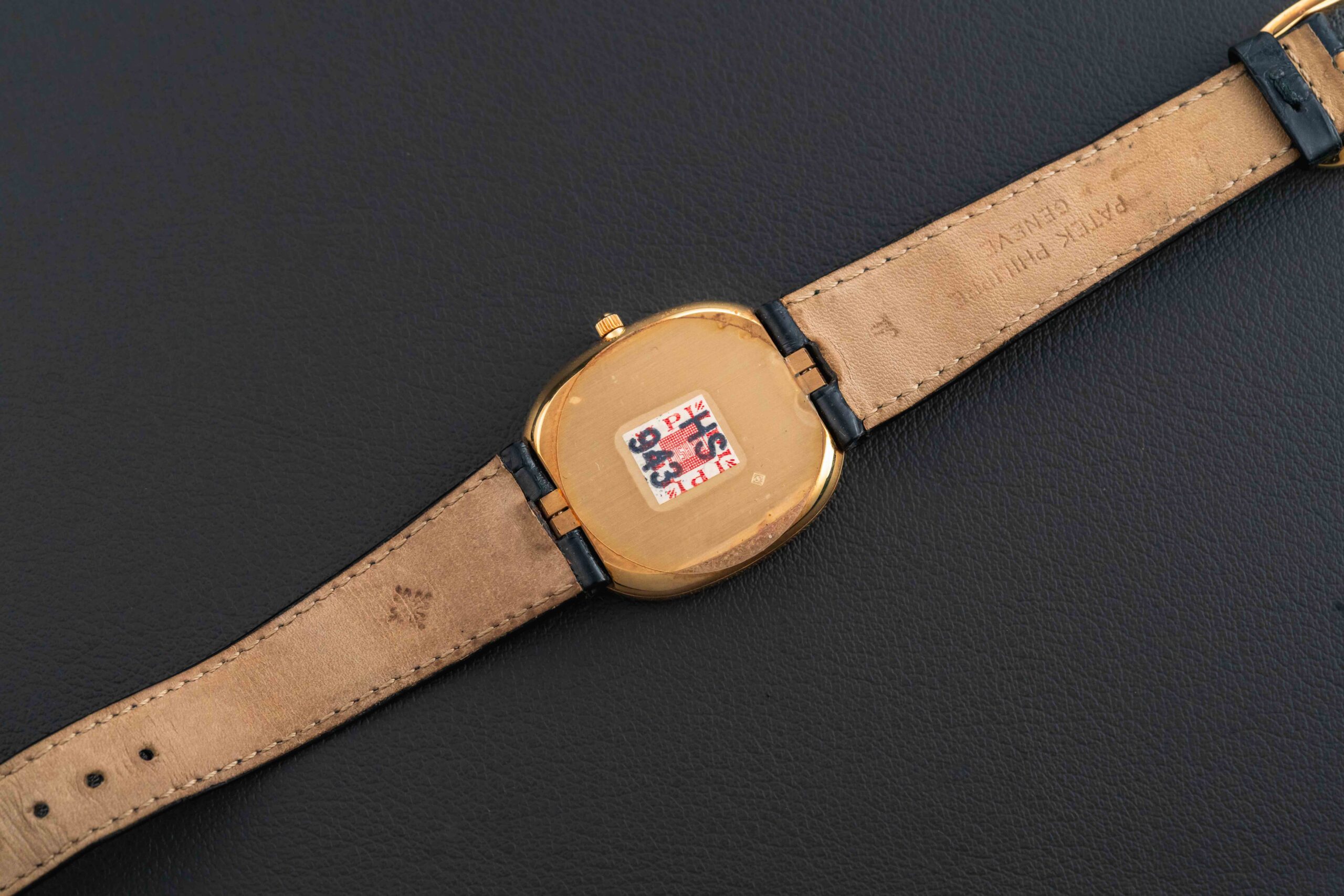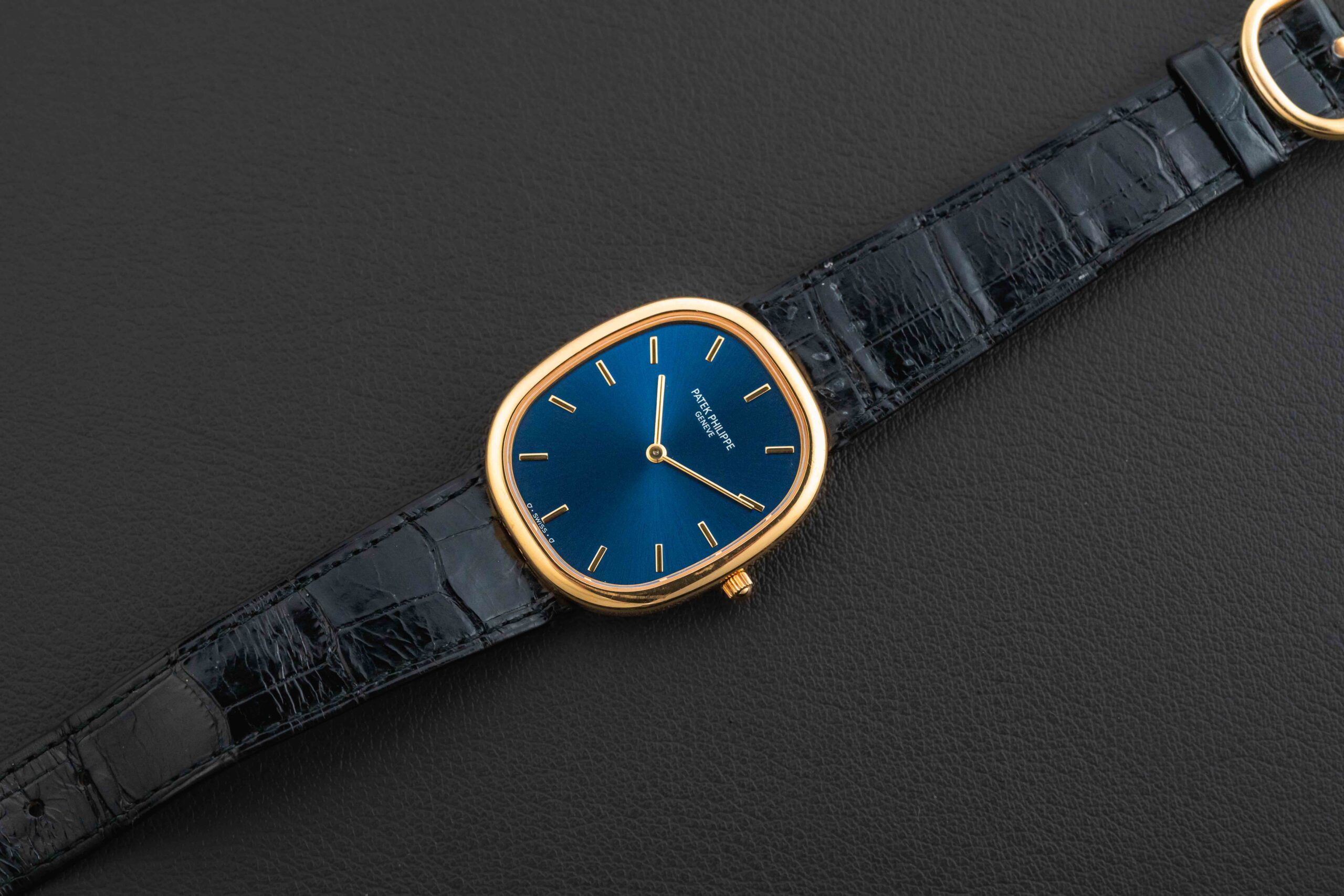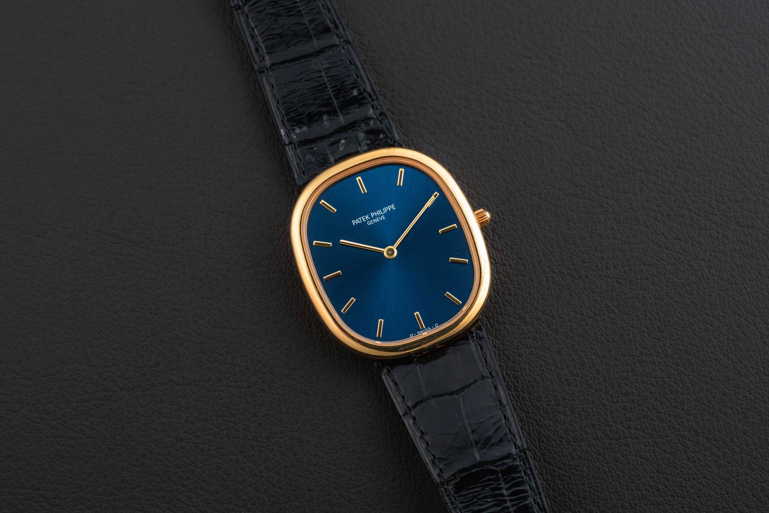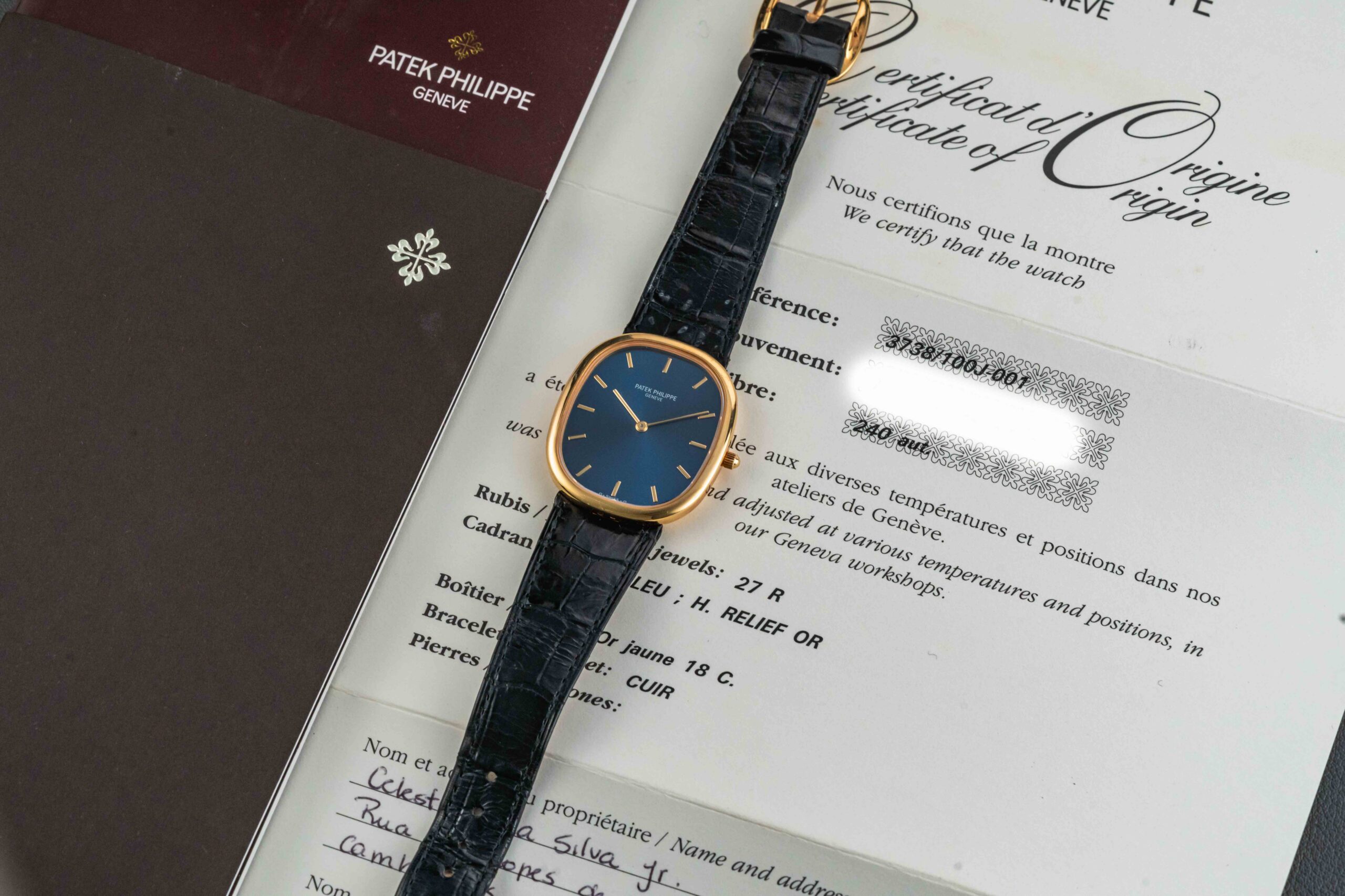 Up for grabs is a “jumbo”-sized Patek Philippe Ellipse, reference 3738J, in 18kt yellow gold. This watch was produced circa 2004, and sold in January of 2005. The watch was fit with a popular blue sunburst dial, and retains its original black Patek leather strap, gold Patek buckle, and is complete with its original Patek box, Certificate of Origin, and booklets. Further, the watch remains in nice condition, showing light wear to the case from sparse use over the years.