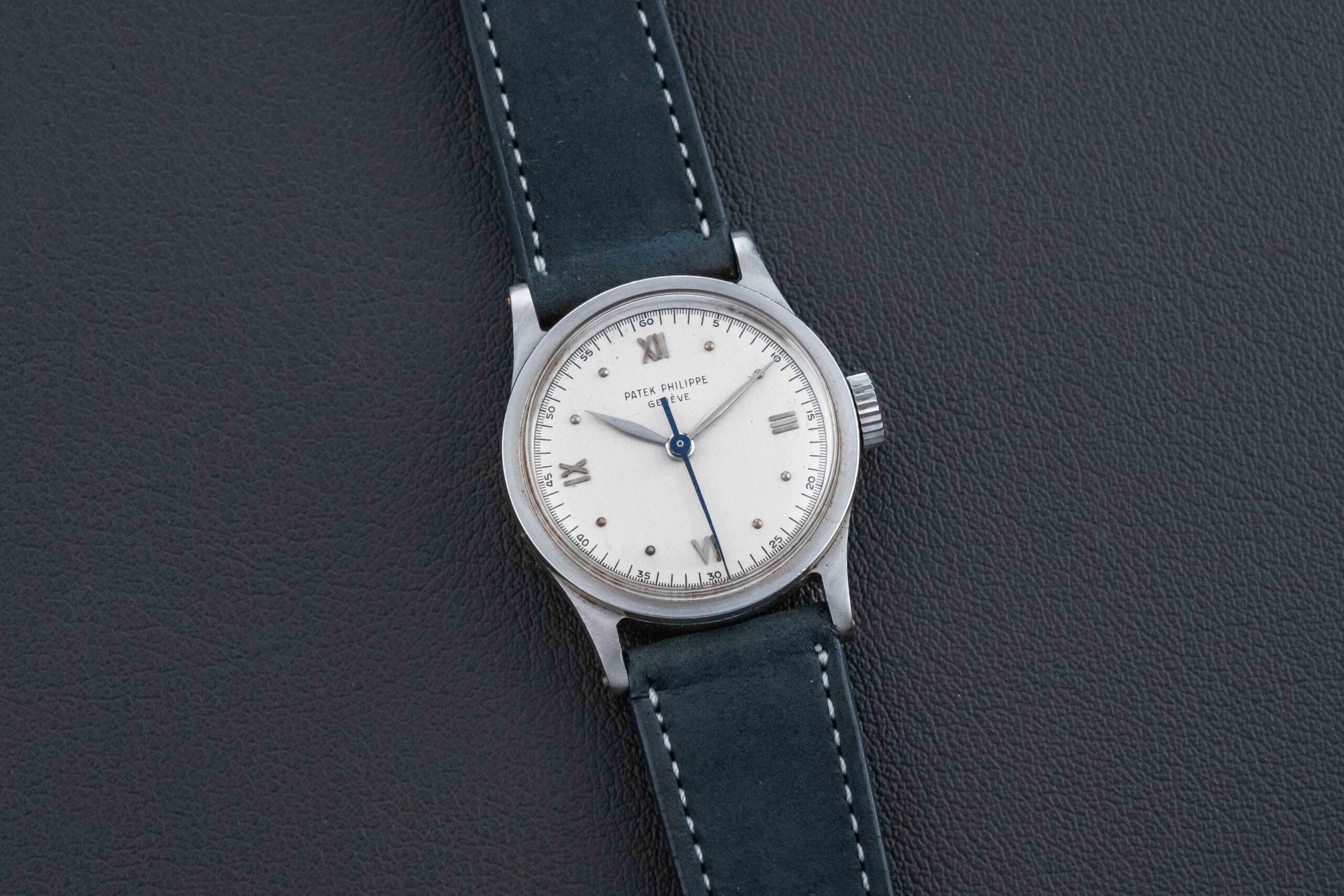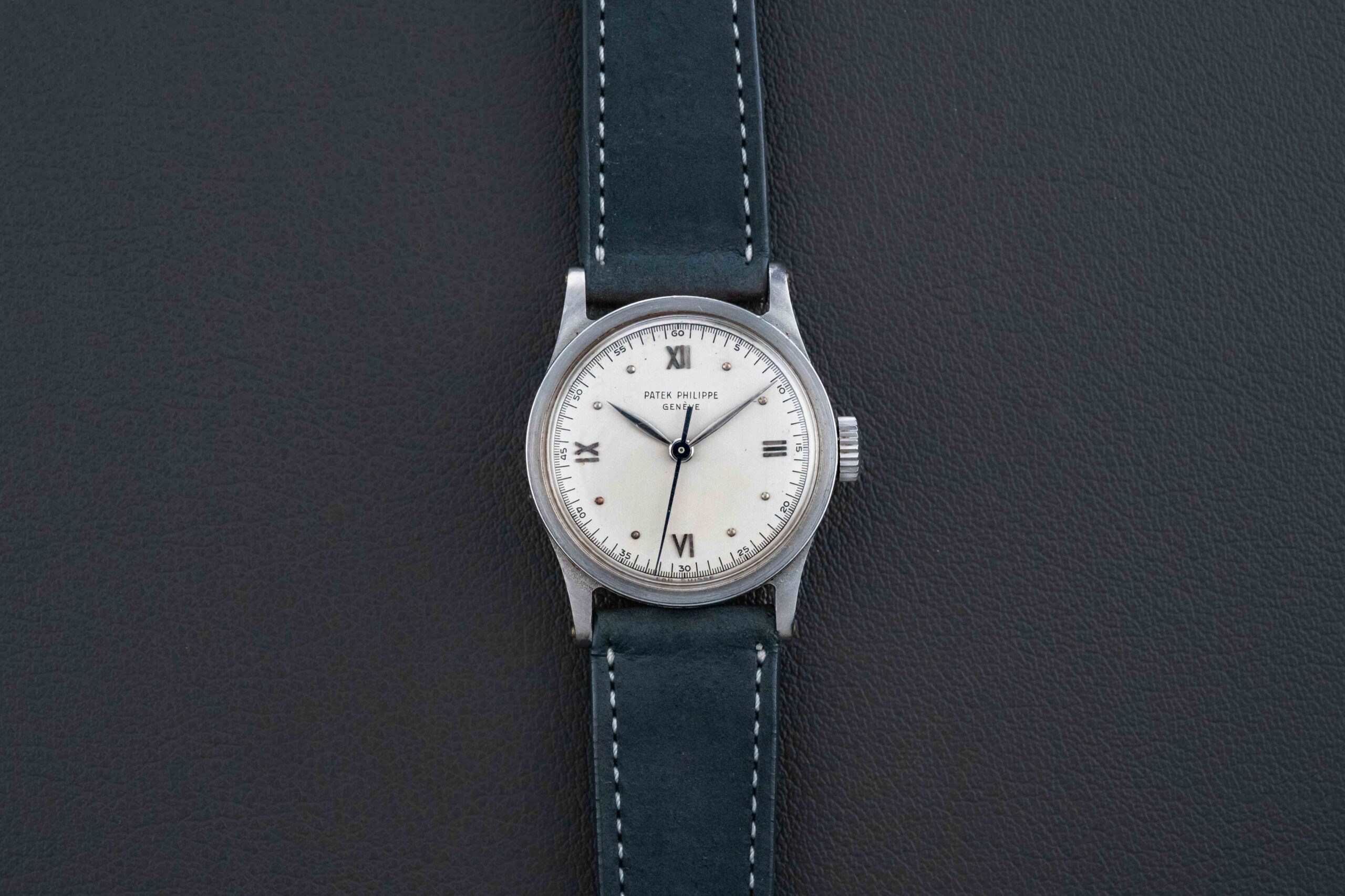 Offered here is a beautiful and rare Patek Philippe Calatrava, Ref. 96. The Reference 96 was on of Patek’s most successful models, having been produced by them for over 40 years, in a variety of case metals and dial layouts. This particular example was housed in one of the most scarce metals that they produced watches in – stainless steel! It also features a very rare applied Roman-numeral dial with center seconds. According to a Patek Philippe Extract of the Archives (included in the sale), this particular Calatrava was manufactured in 1947, and subsequently sold in 1948.