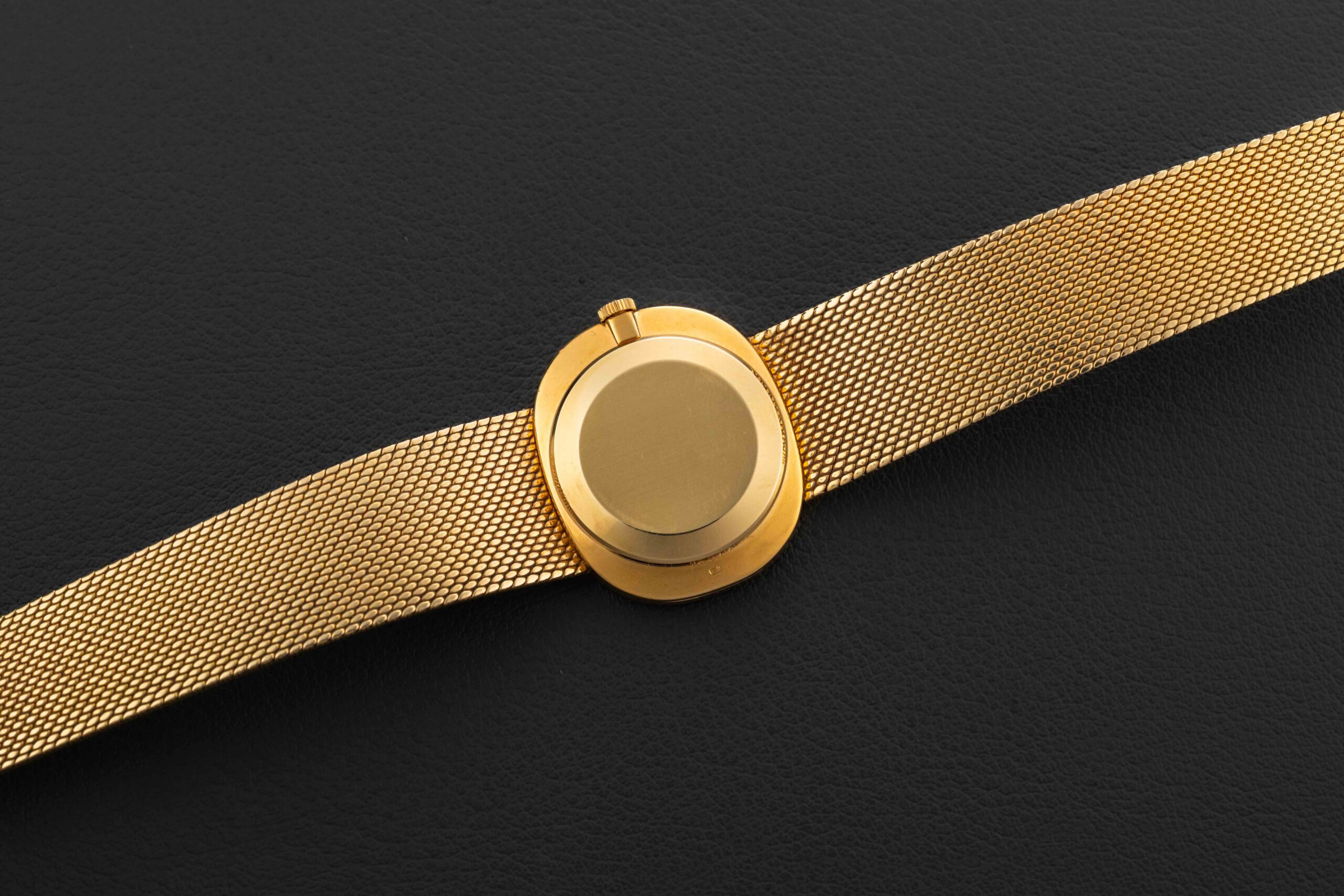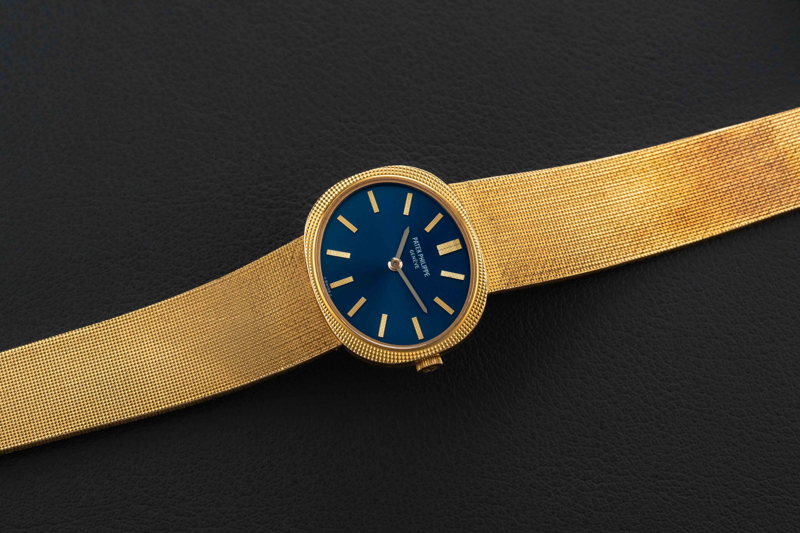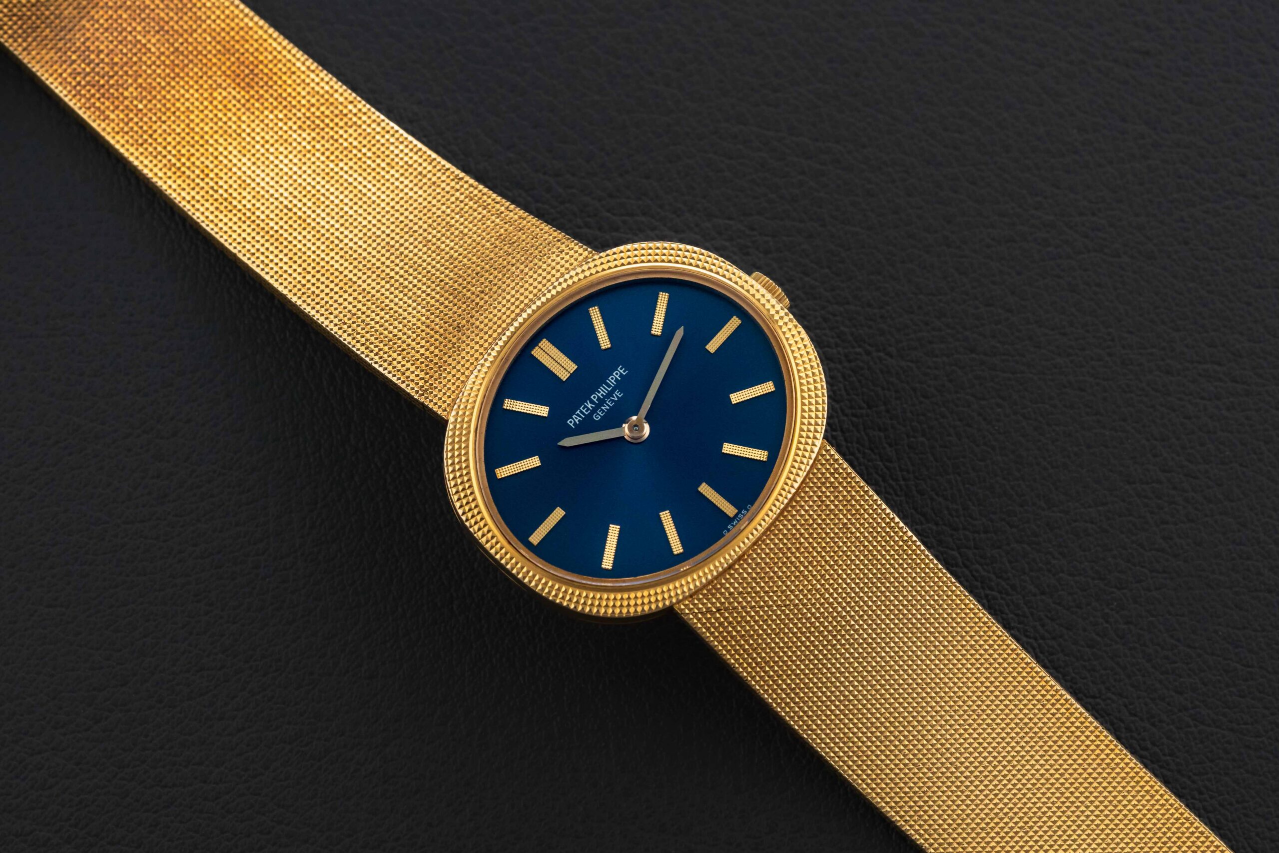 Up for grabs is a stunning 1970s Patek Phillipe Ellipse, reference 3581J. This particular watch was born with a radiant sunburst blue dial, accented by ribbed gold applied markers, which match the ribbing on the bezel and bracelet. The reference 3581 is an integrated bracelet reference. Further, this Patek Philippe Ellipse remains in excellent condition, clearly never polished, and with a perfect, damage-free dial. The bracelet does not appear to have ever been sized, accommodating a large wrist