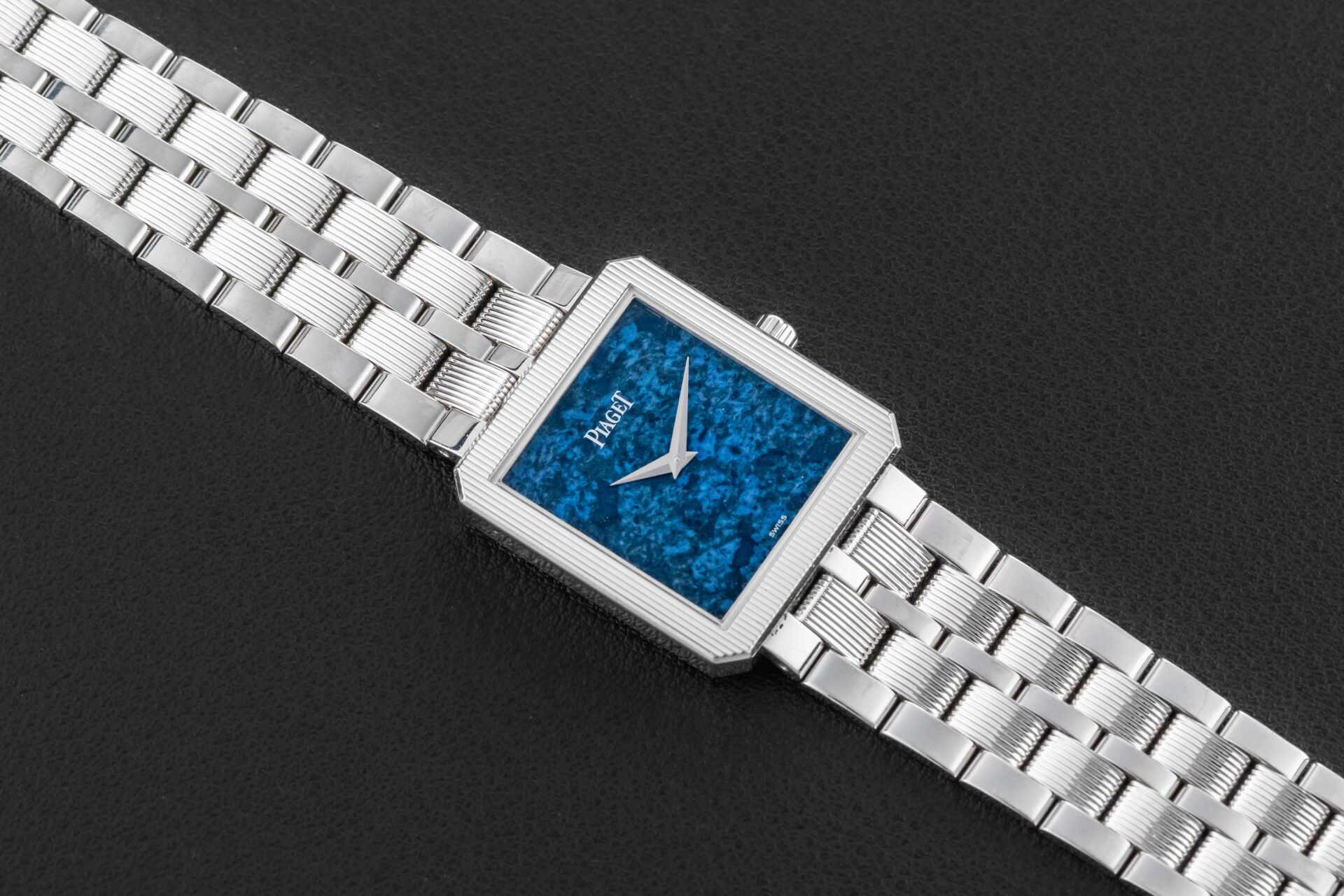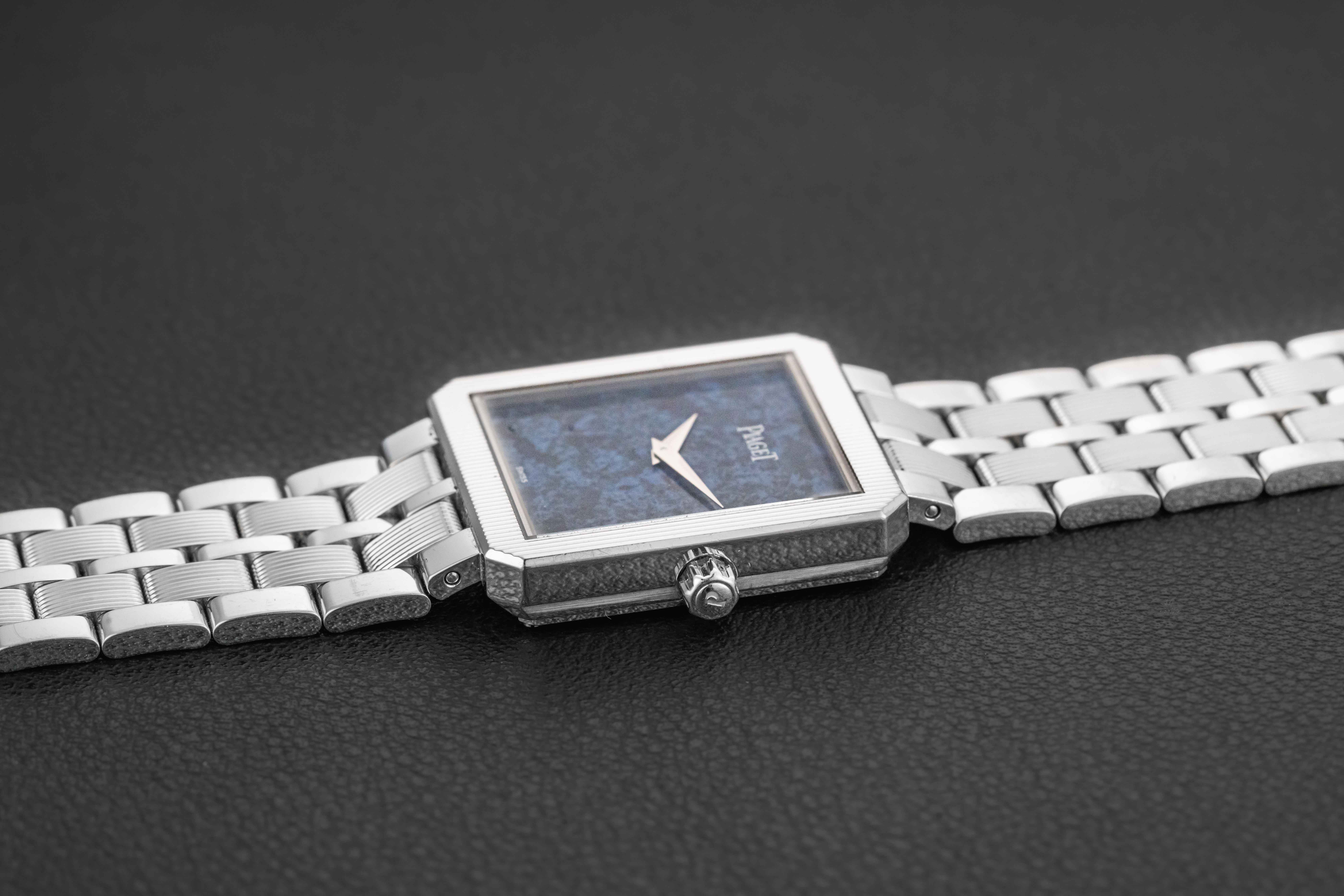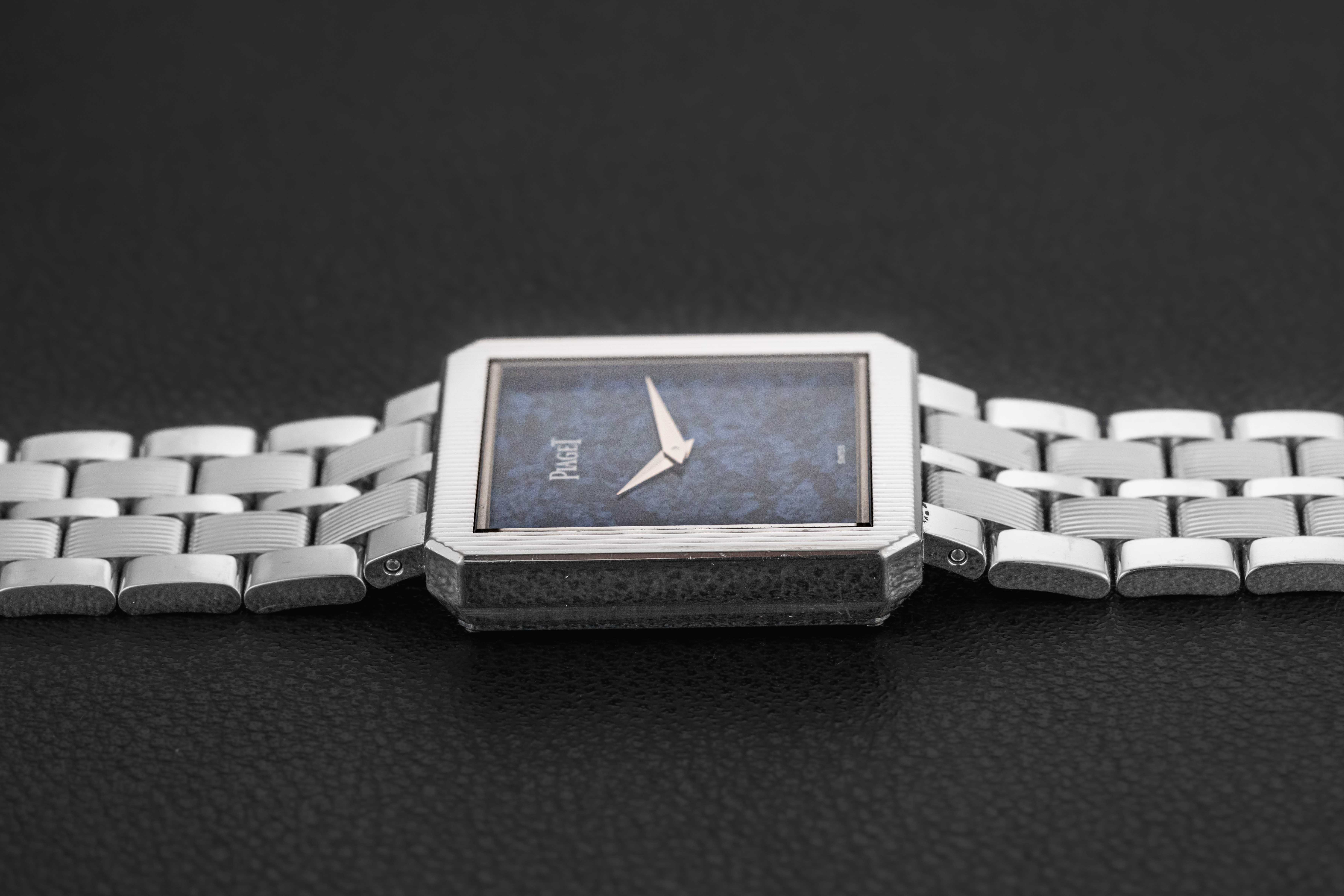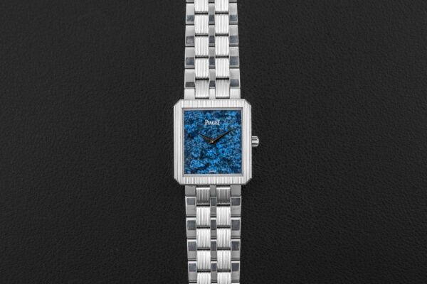 Up for grabs is a striking Piaget Protocole from the early 2000s. This particular reference 94154 was housed in 18kt white gold and with a matching white gold Piaget bracelet, fit with a stunning sodalite stone dial. Piaget has mastered the funky stone dial watch, and this example is at the top of the list. As to condition, this Piaget Protocole remains excellent, seemingly unpolished and with a blemish free dial. Further, the bracelet remains long, and likely fully linked from factory.