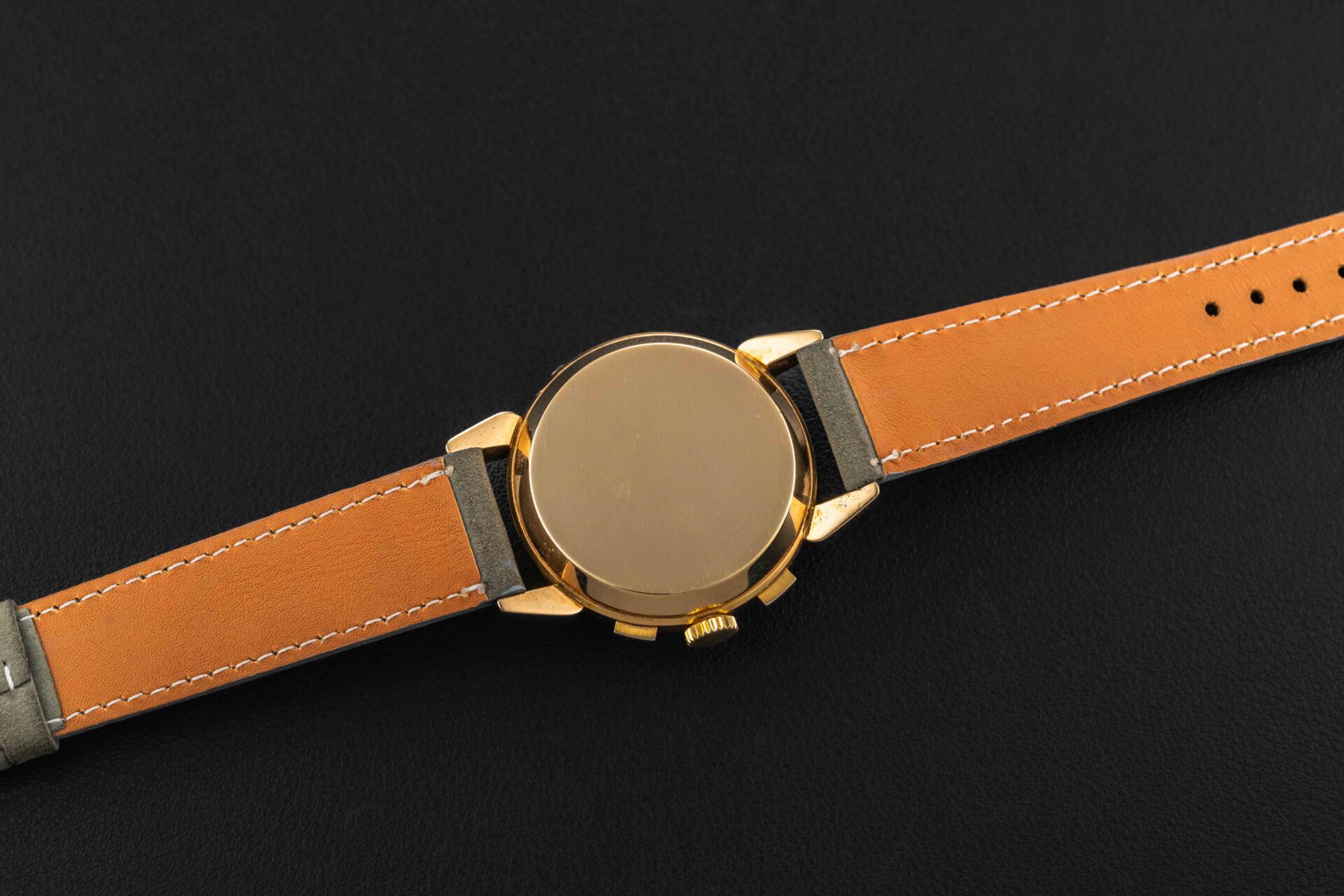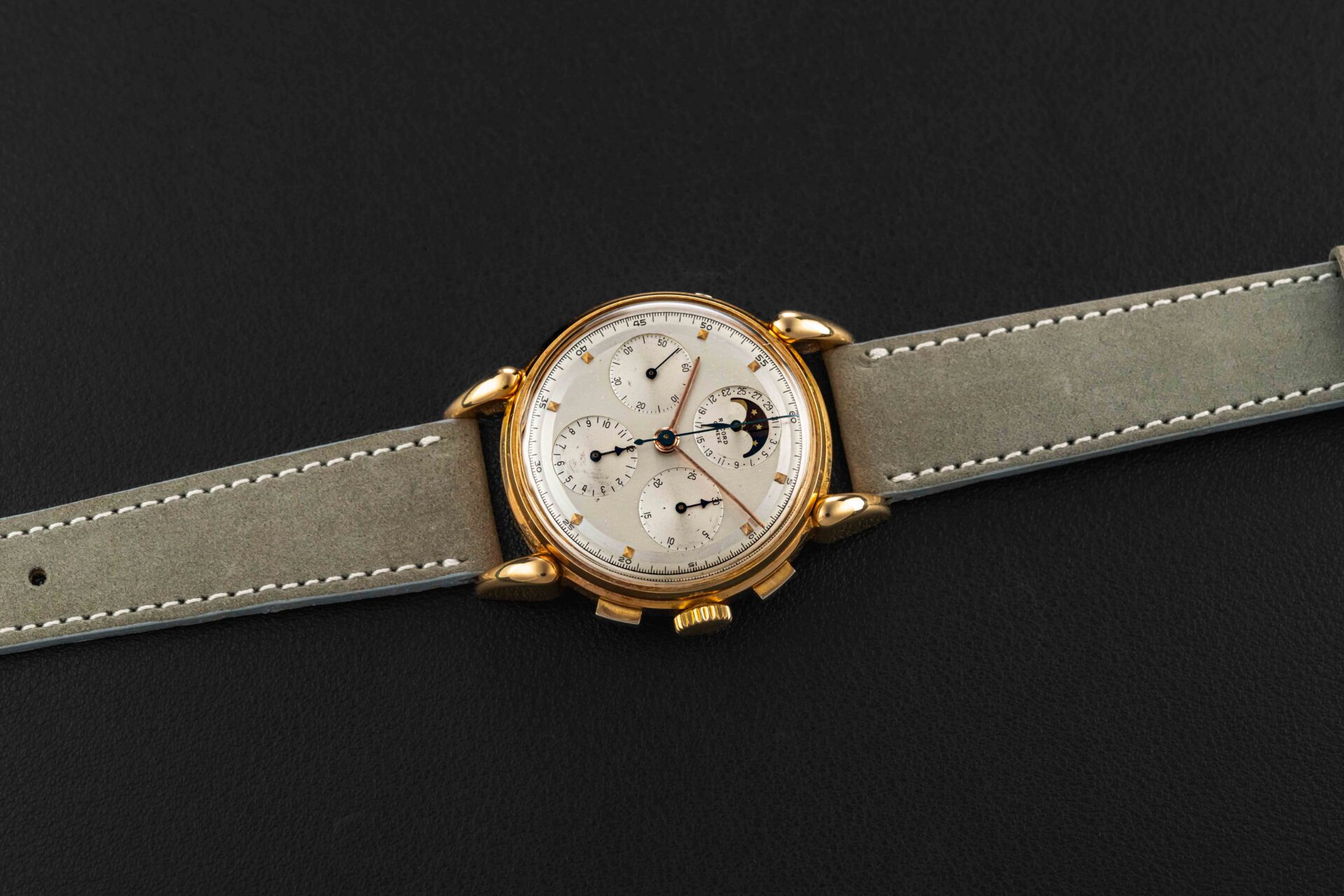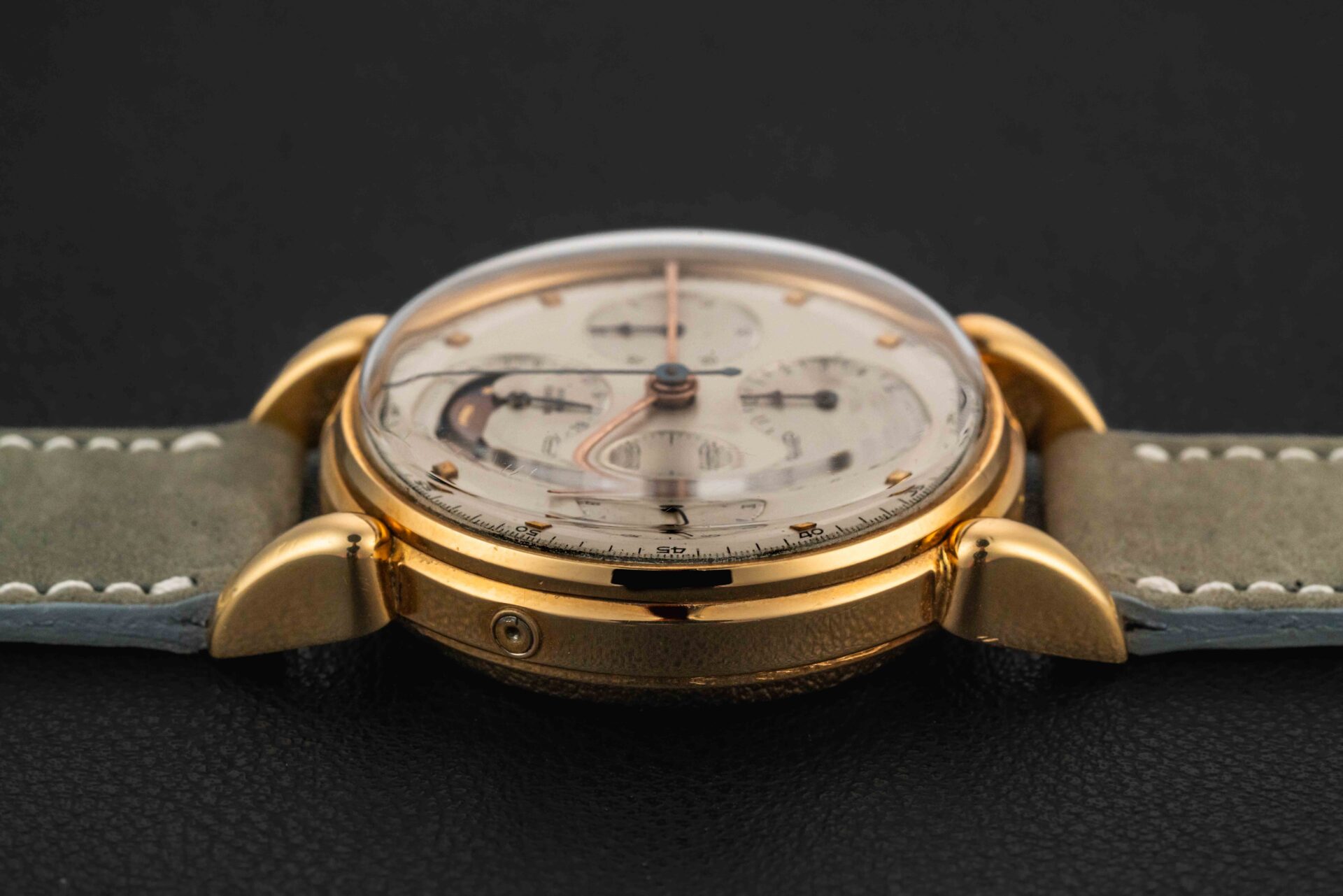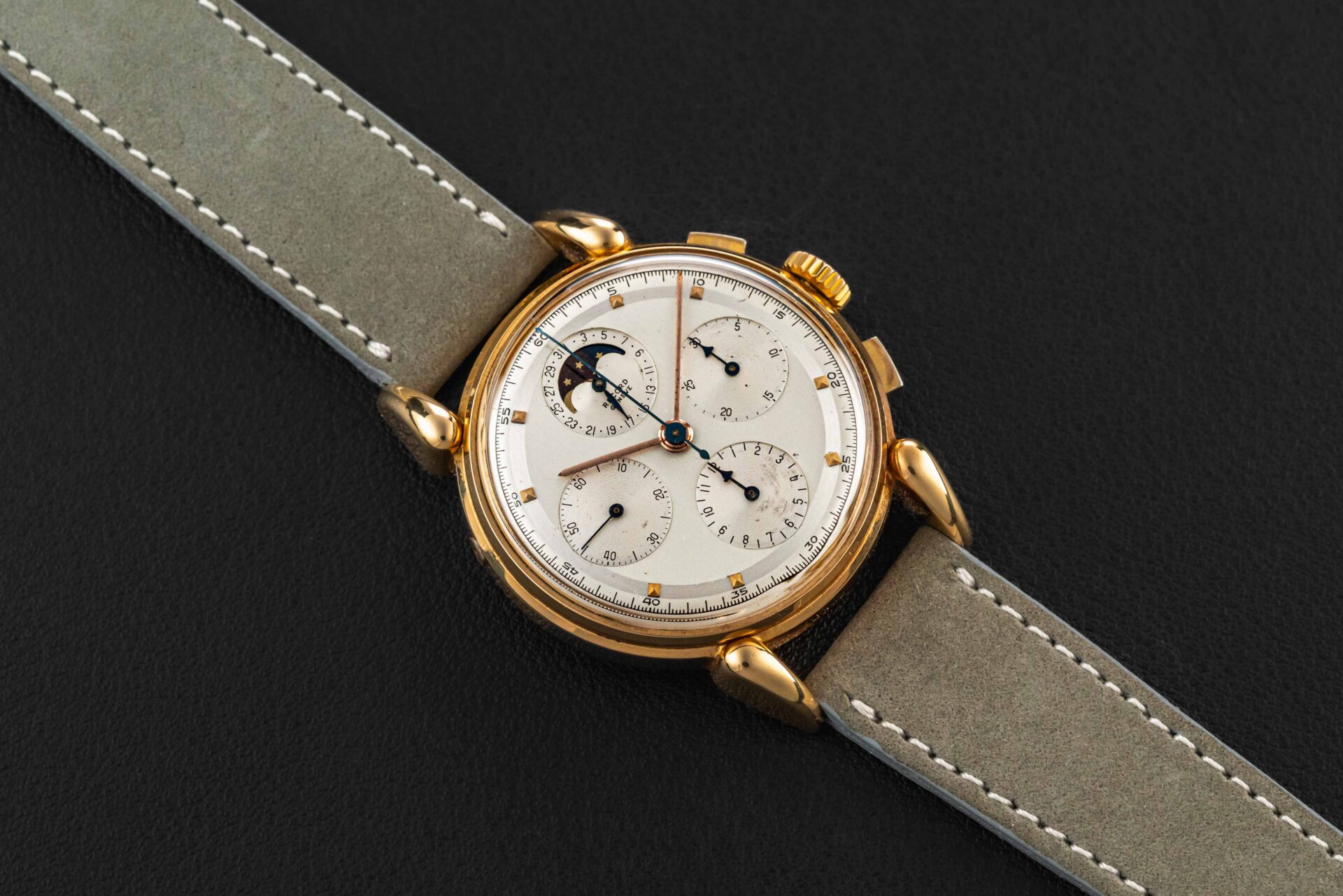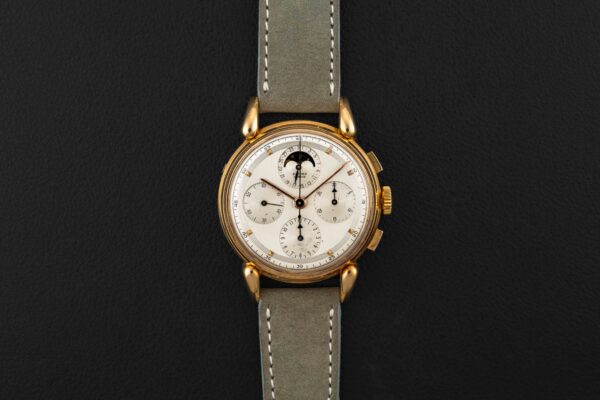 Up for grabs is an incredibly rare Record Geneve chronograph, circa 1950s. This particular chronograph was built in a 37mm rose gold case, and powered by a Venus 184 movement. However, what sets this watch apart is the fact that it features both date and moonphase complications, paired with main chronograph, fit in a stunning horned-lugs case. The watch itself is in superb condition, remaining unpolished, and likewise, the original two-toned silver dial remains extremely well-preserved, with no major wear or aging.